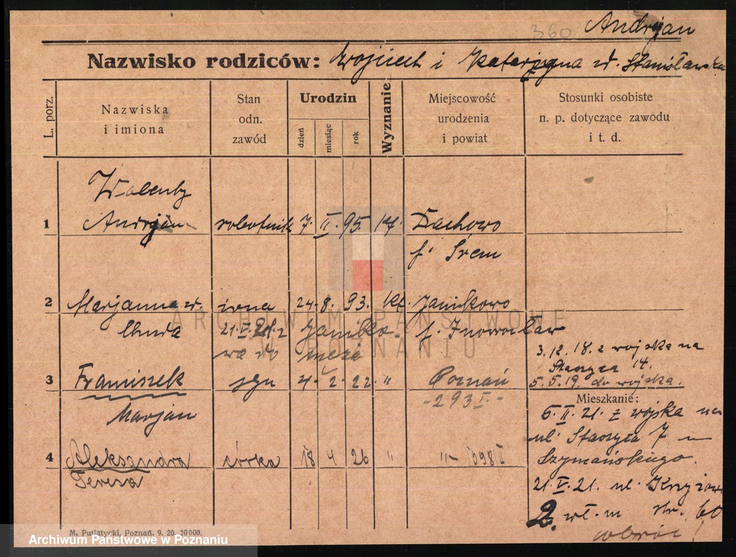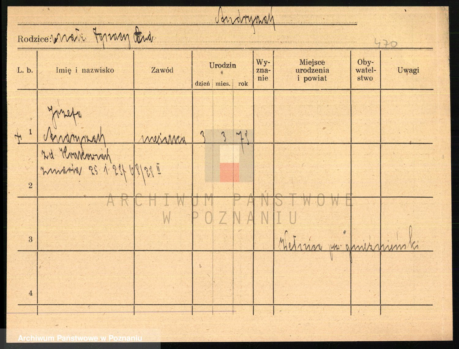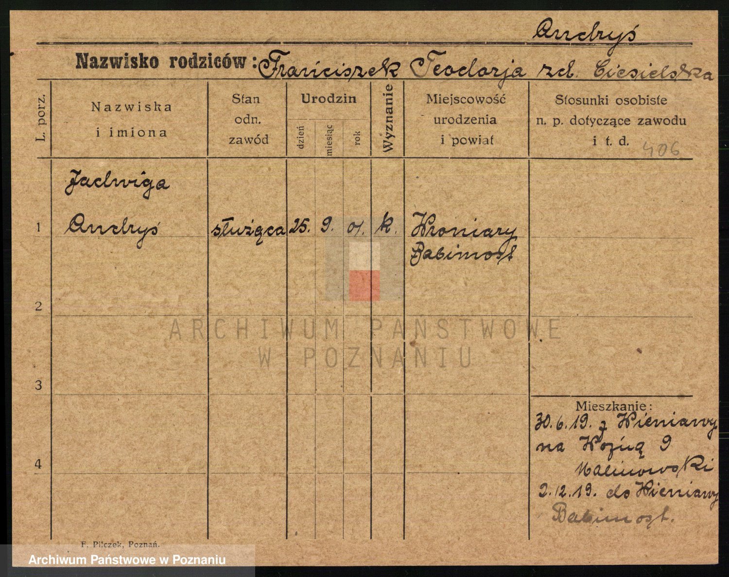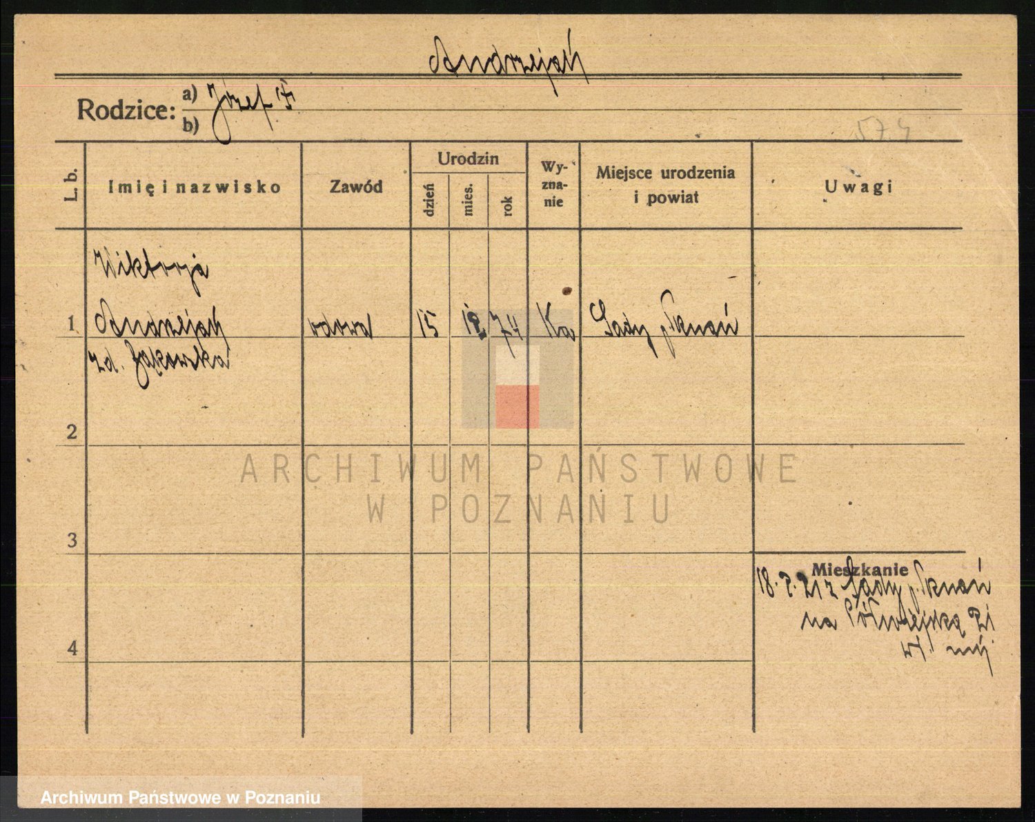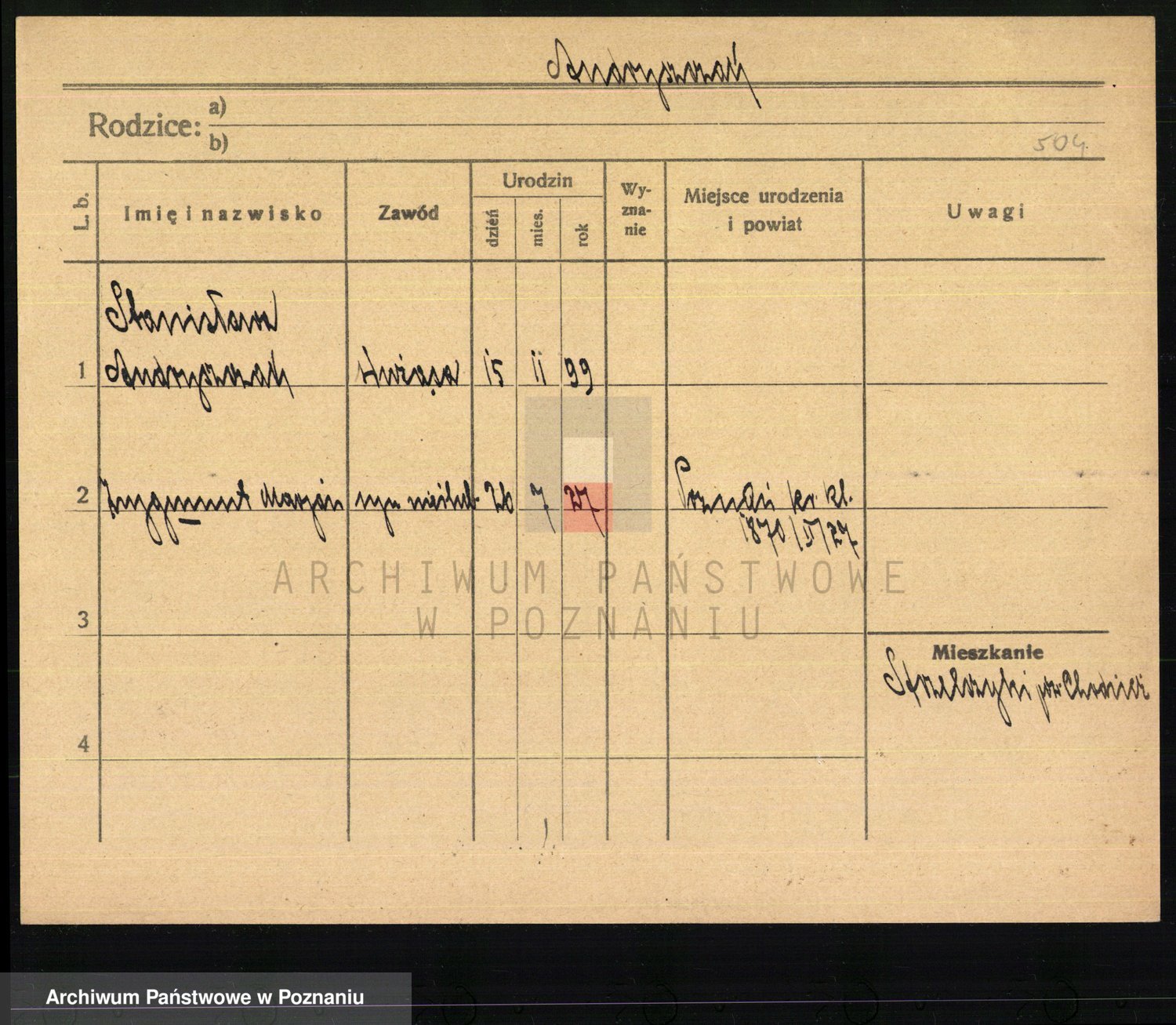 Podgląd karty osobowej dostępny jest po kliknięciu na nazwisko lub ikonkę karty. Można dokonywać powiększenia (ikony na górze) lub przechodzić między kolejnymi skanami (strzałki po bokach).