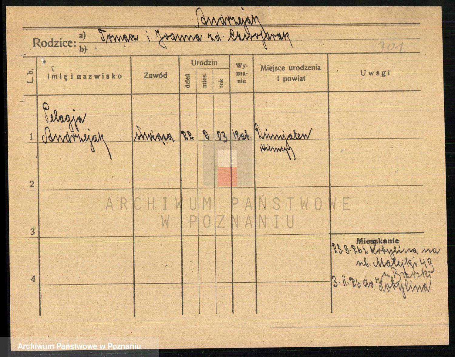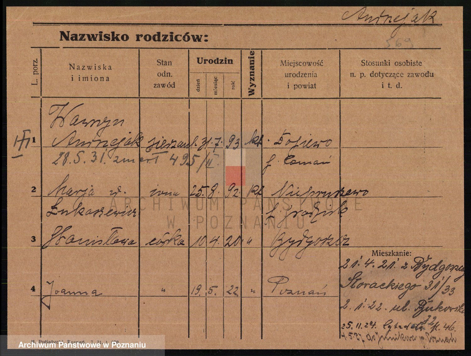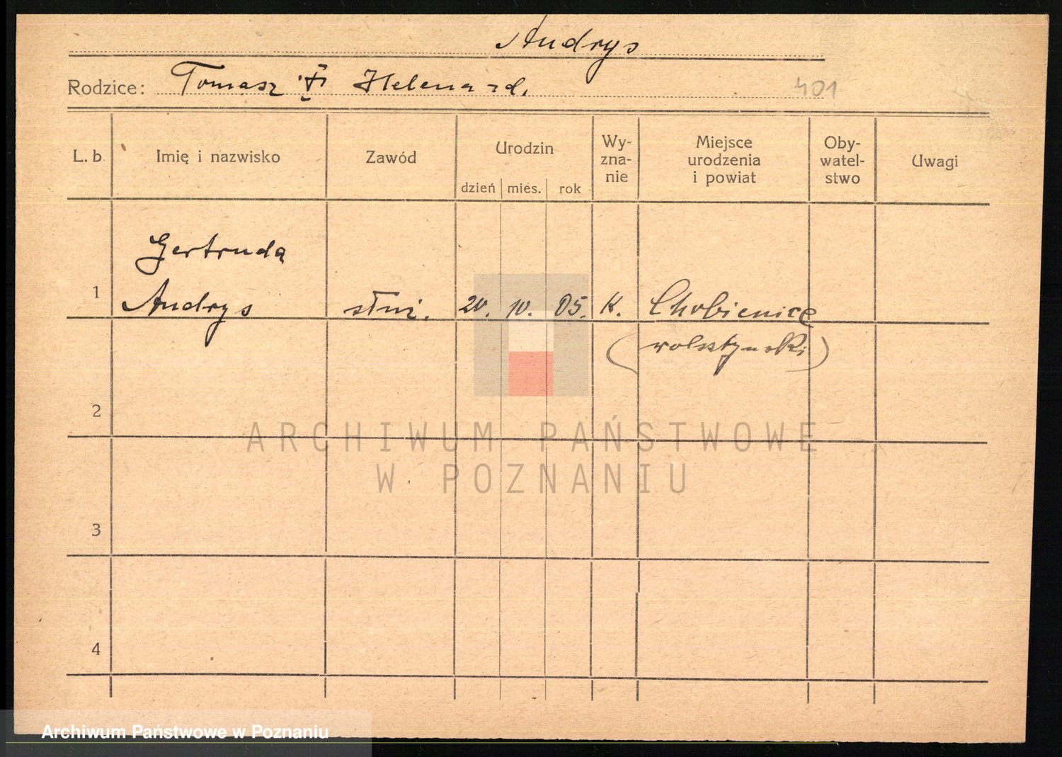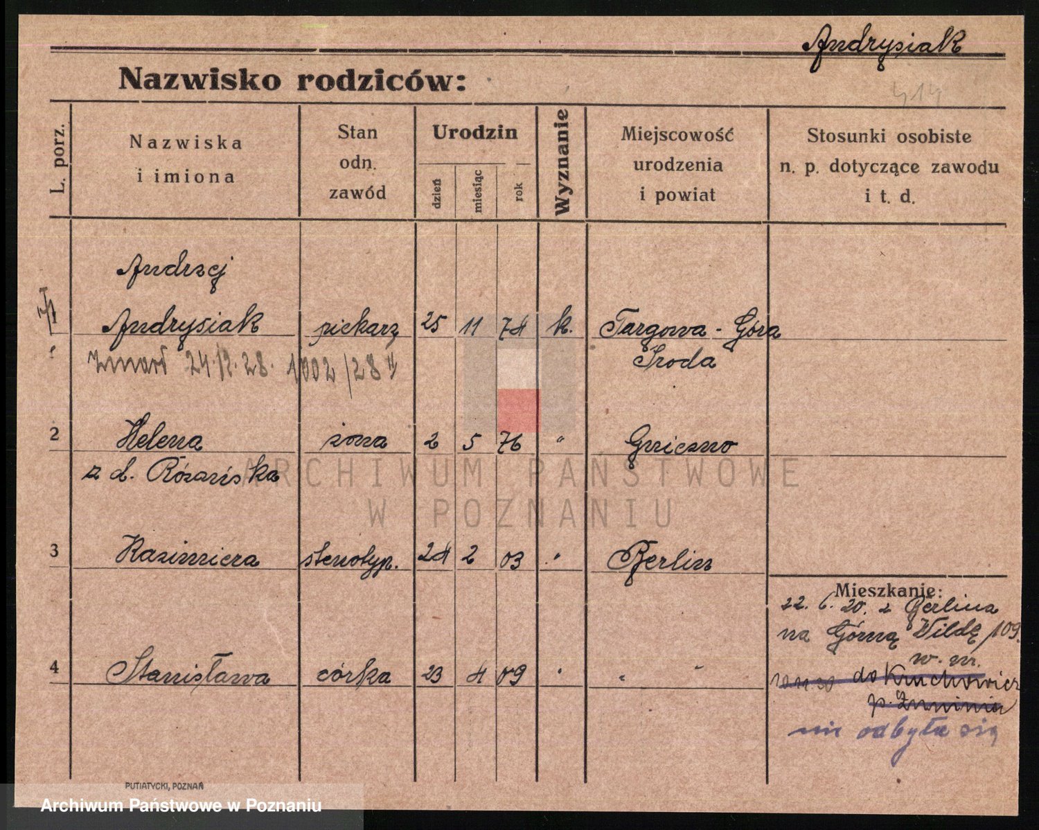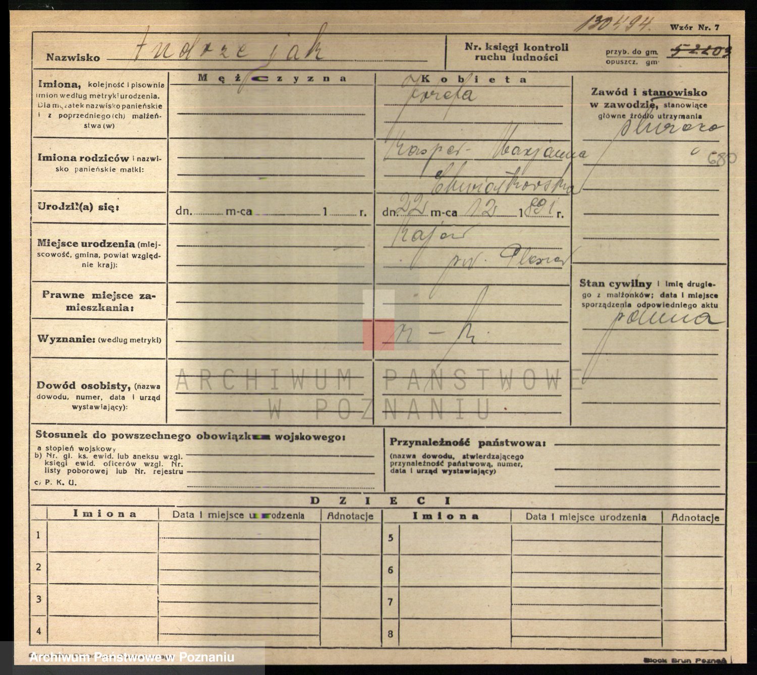 Podgląd karty osobowej dostępny jest po kliknięciu na nazwisko lub ikonkę karty. Można dokonywać powiększenia (ikony na górze) lub przechodzić między kolejnymi skanami (strzałki po bokach).