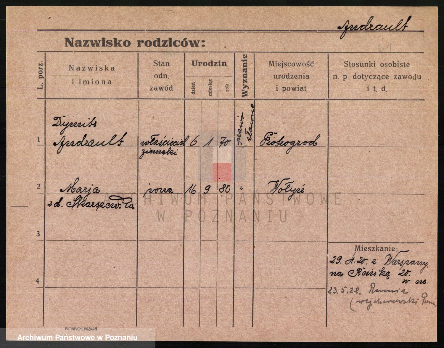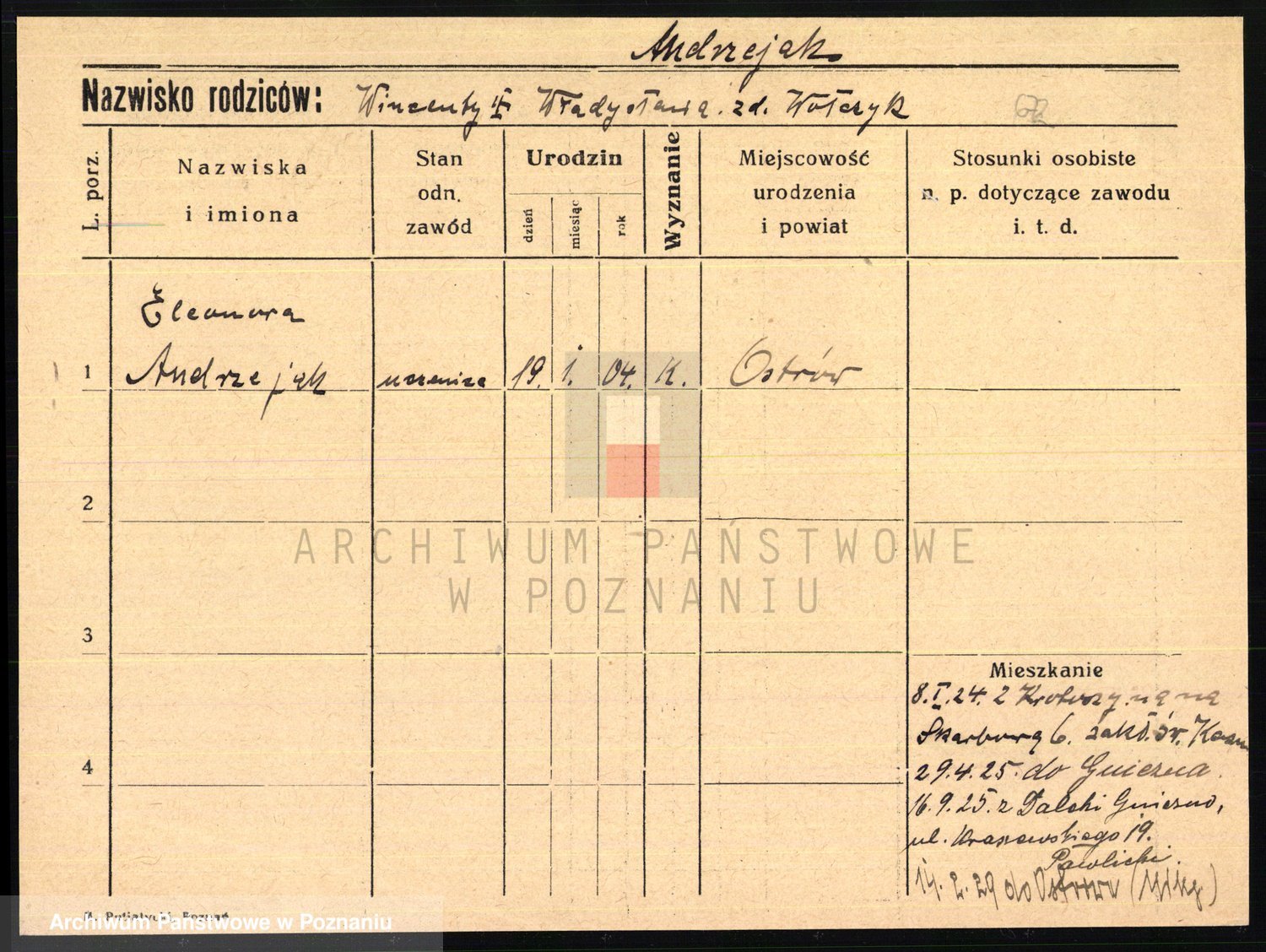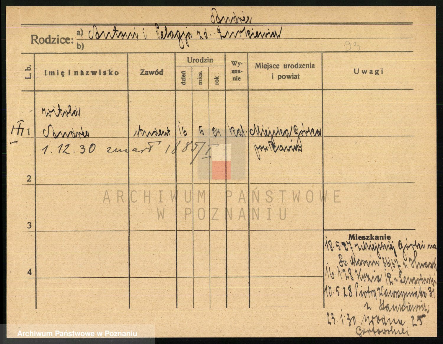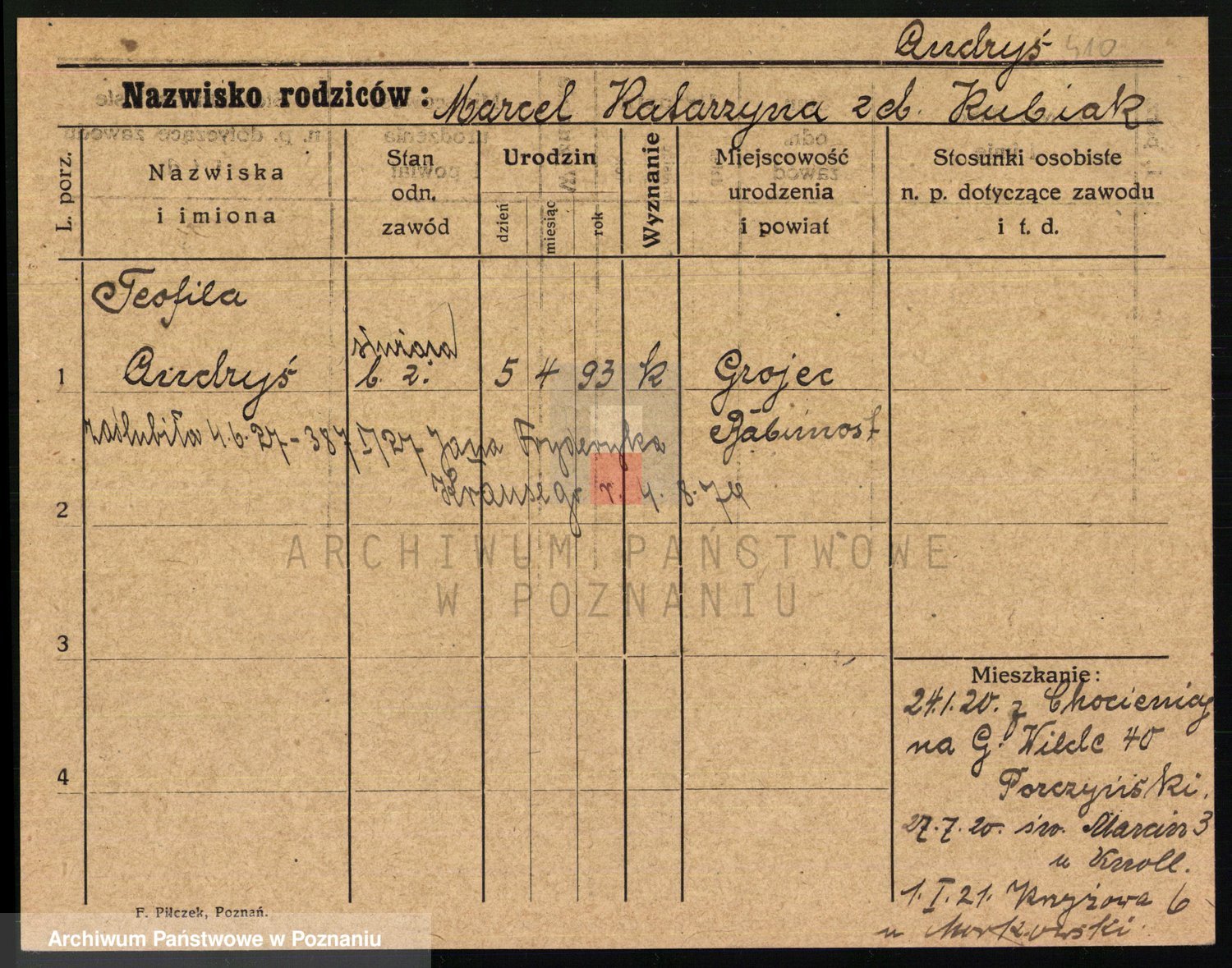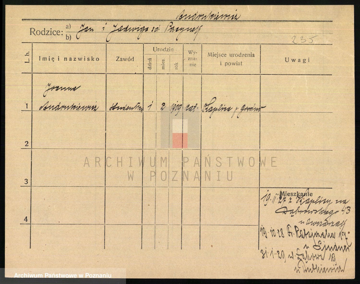 Podgląd karty osobowej dostępny jest po kliknięciu na nazwisko lub ikonkę karty. Można dokonywać powiększenia (ikony na górze) lub przechodzić między kolejnymi skanami (strzałki po bokach).