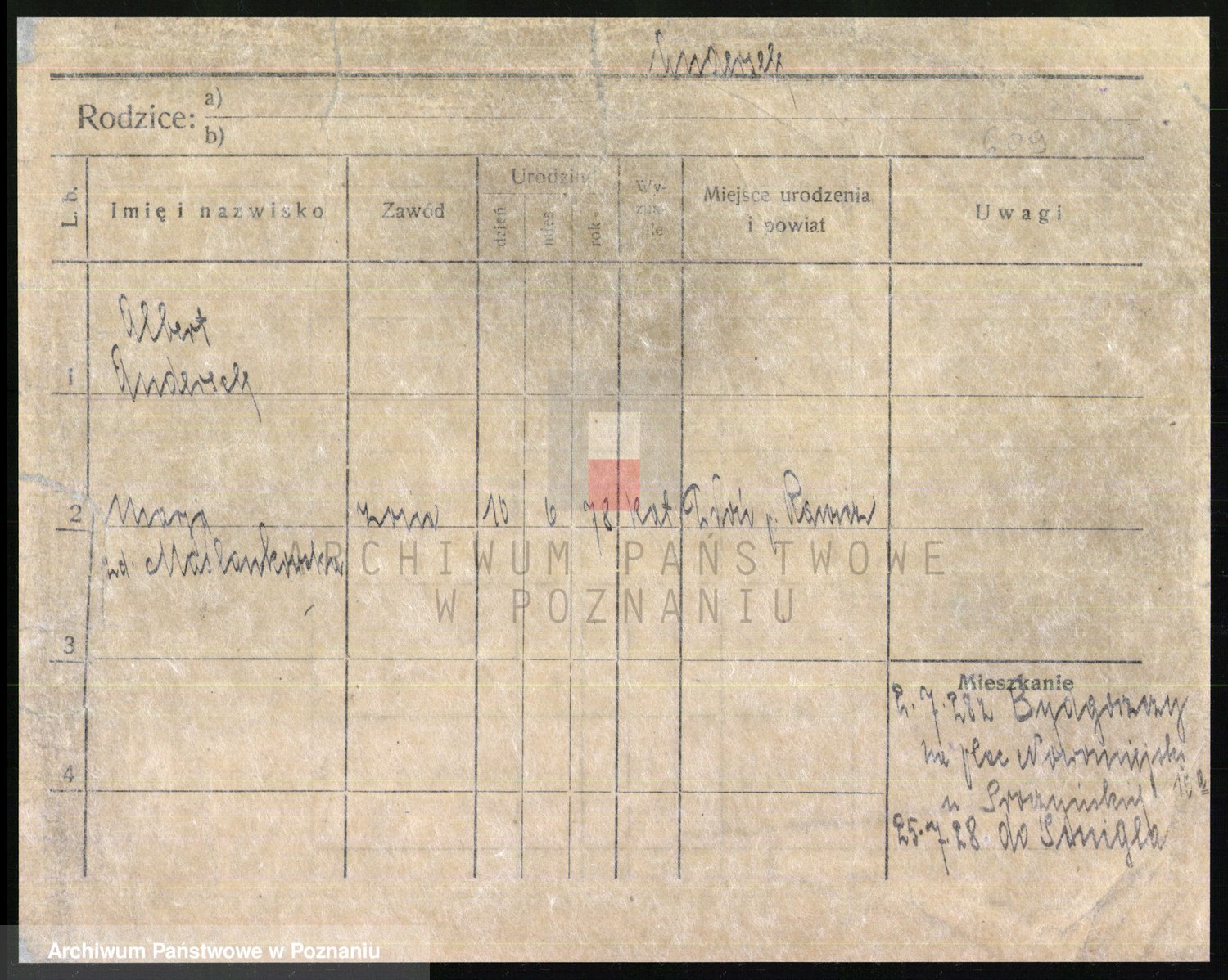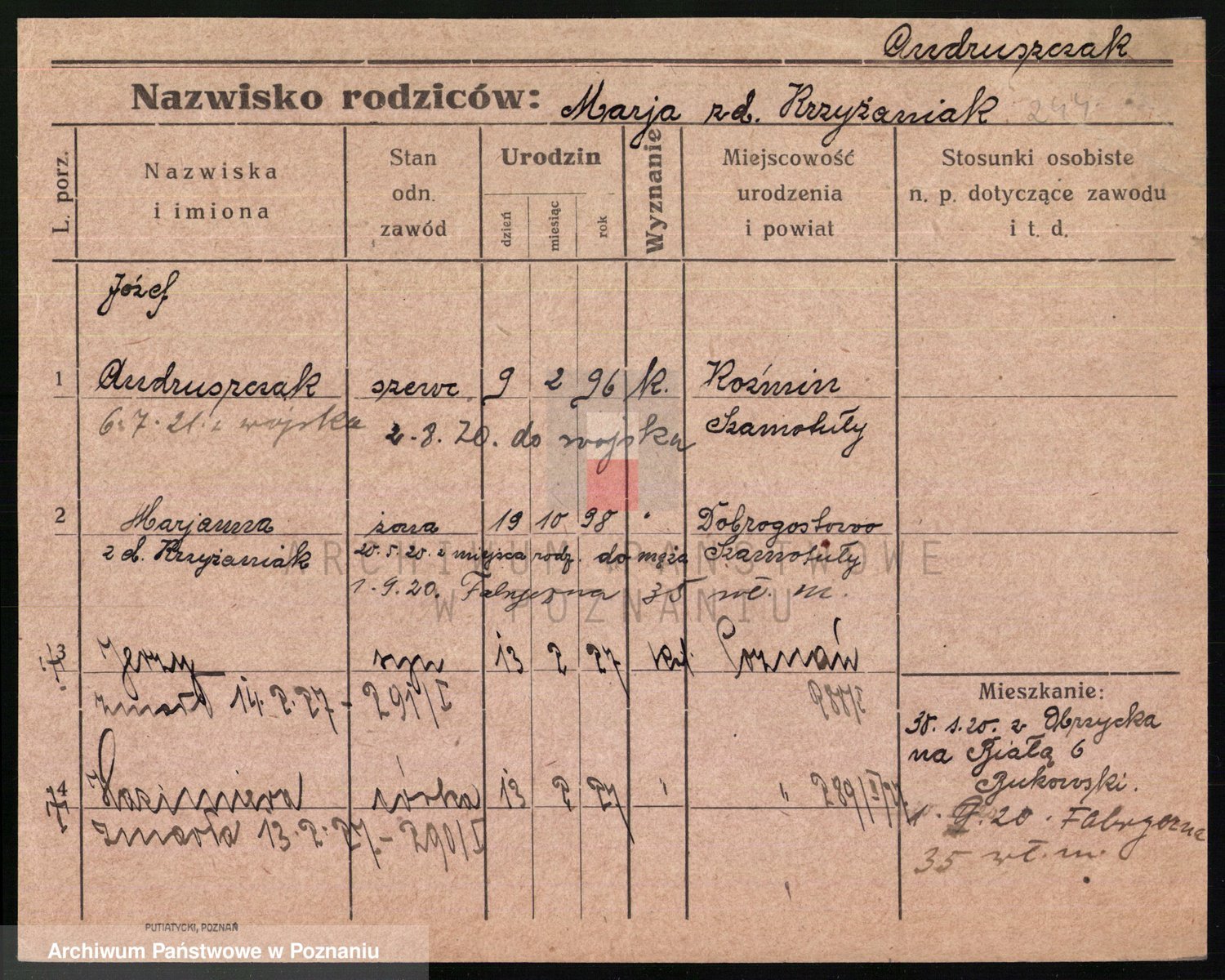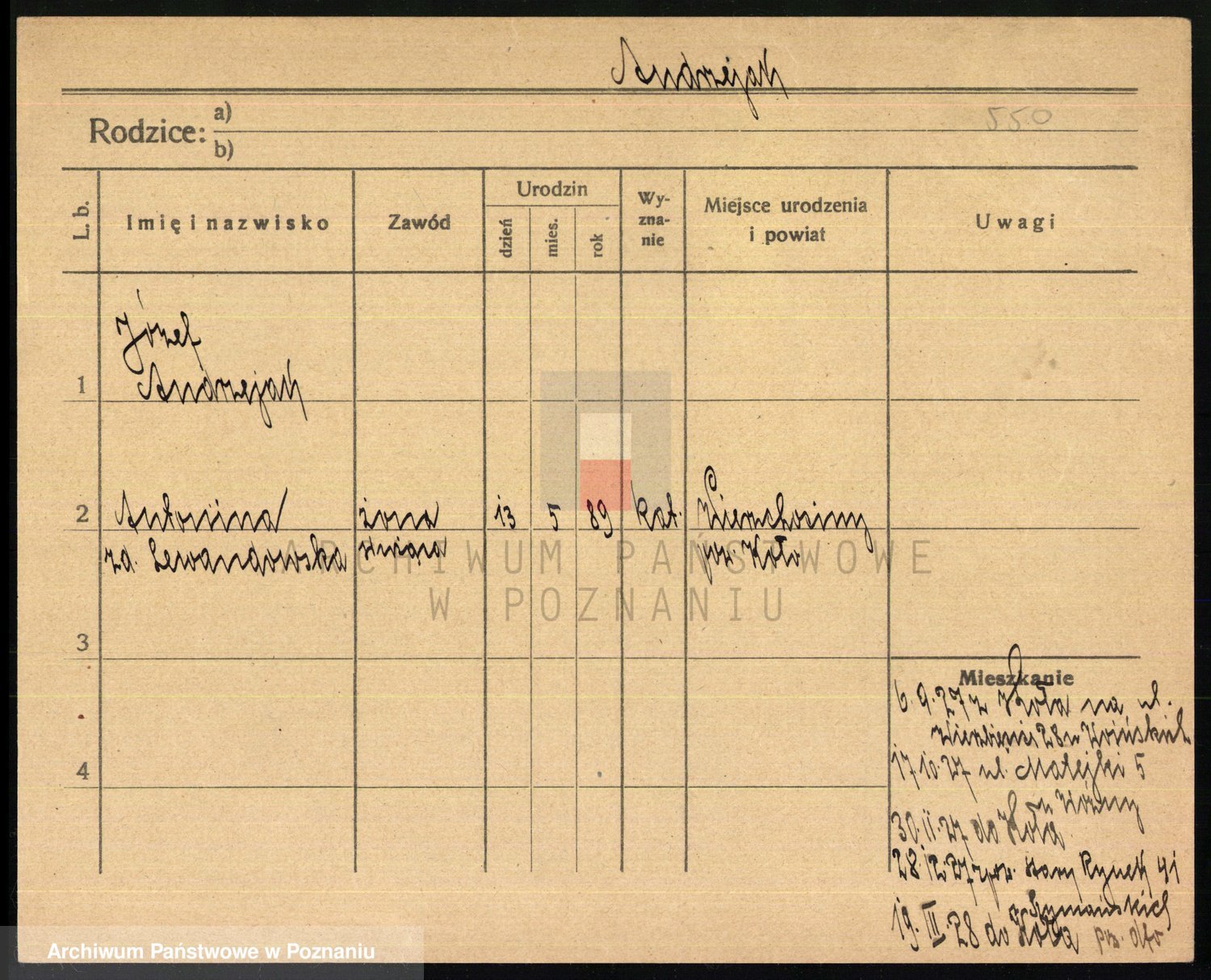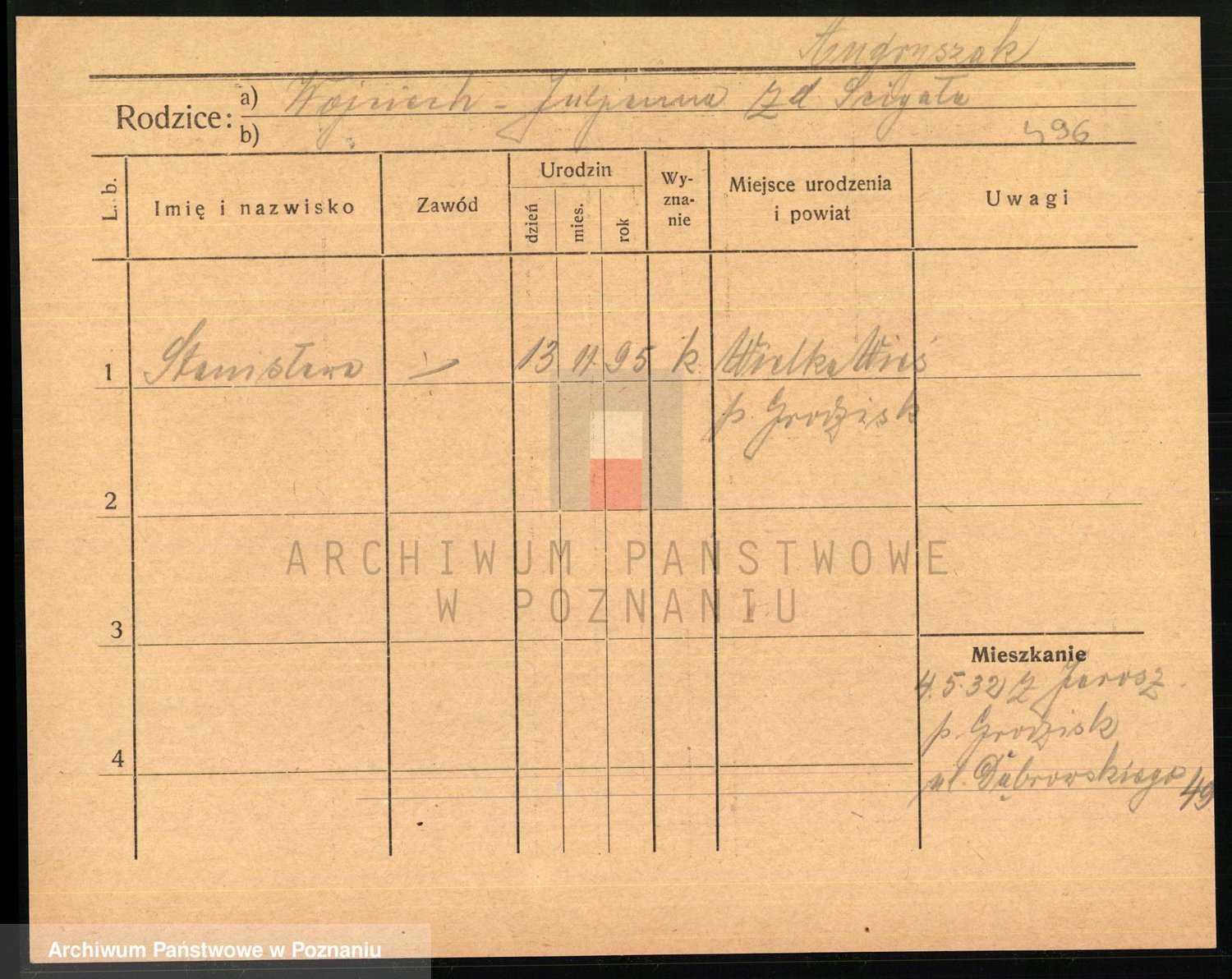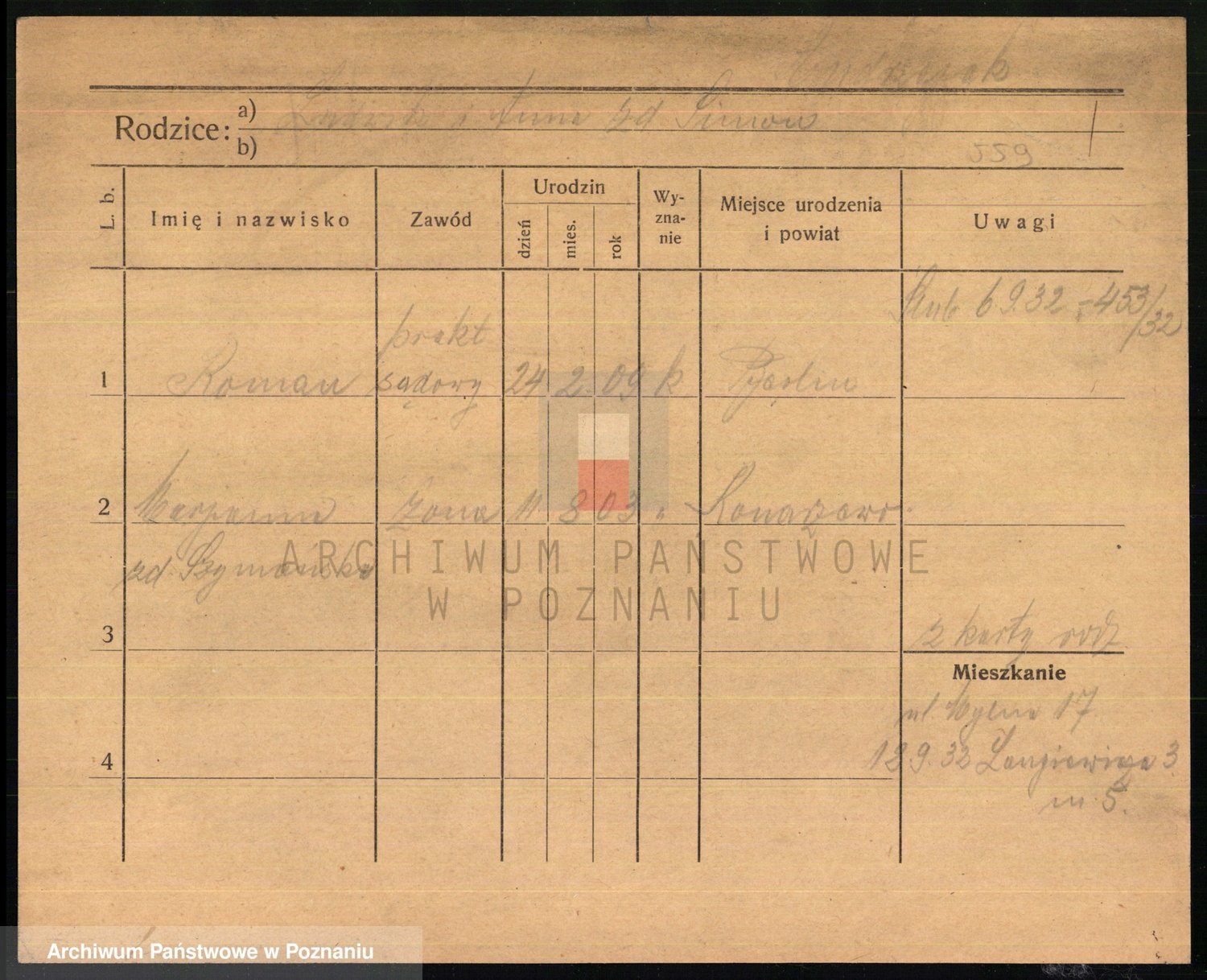 Podgląd karty osobowej dostępny jest po kliknięciu na nazwisko lub ikonkę karty. Można dokonywać powiększenia (ikony na górze) lub przechodzić między kolejnymi skanami (strzałki po bokach).
