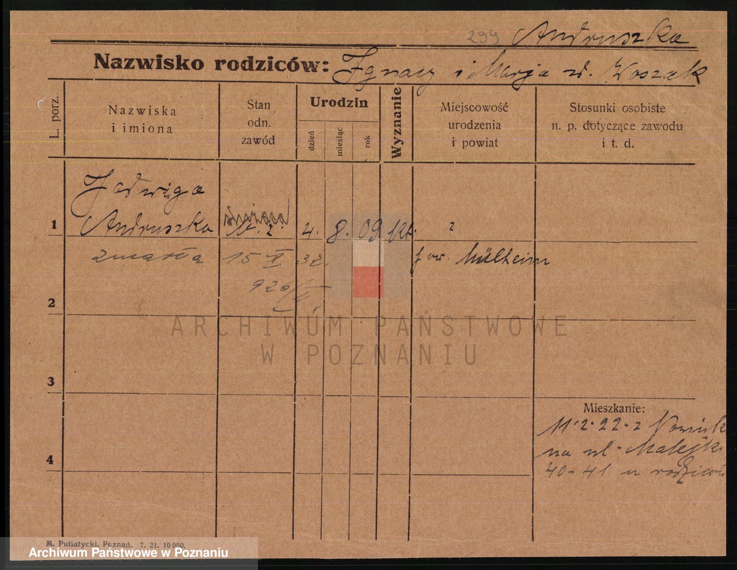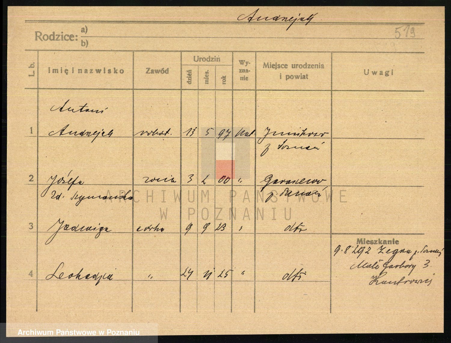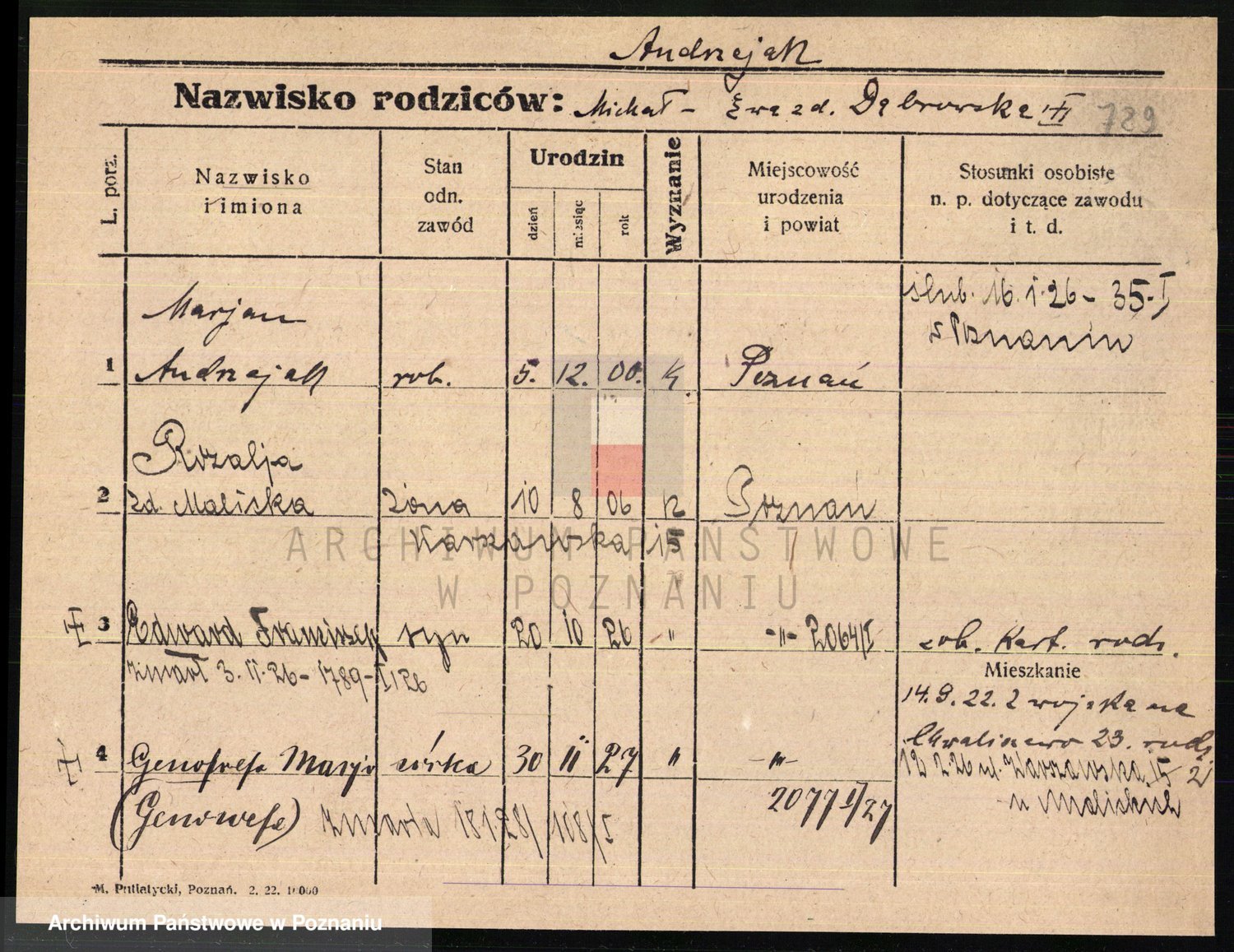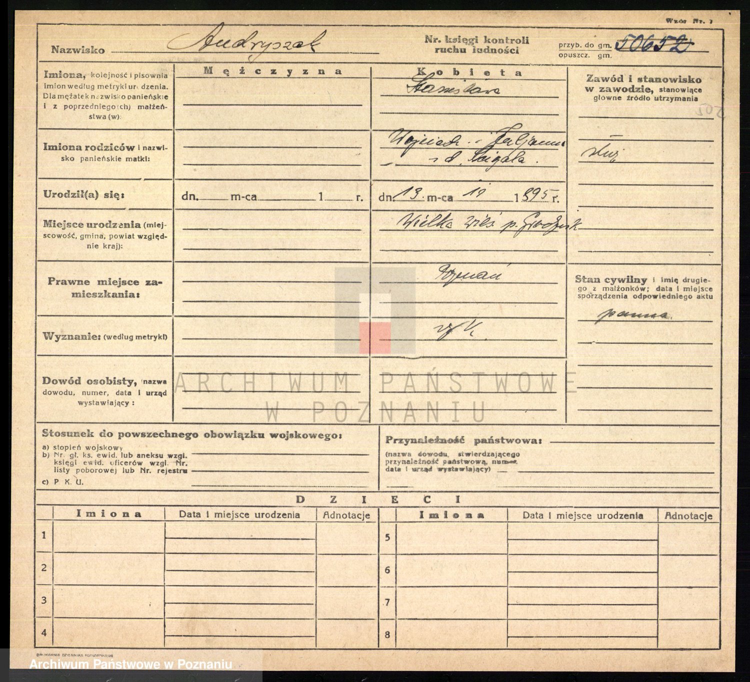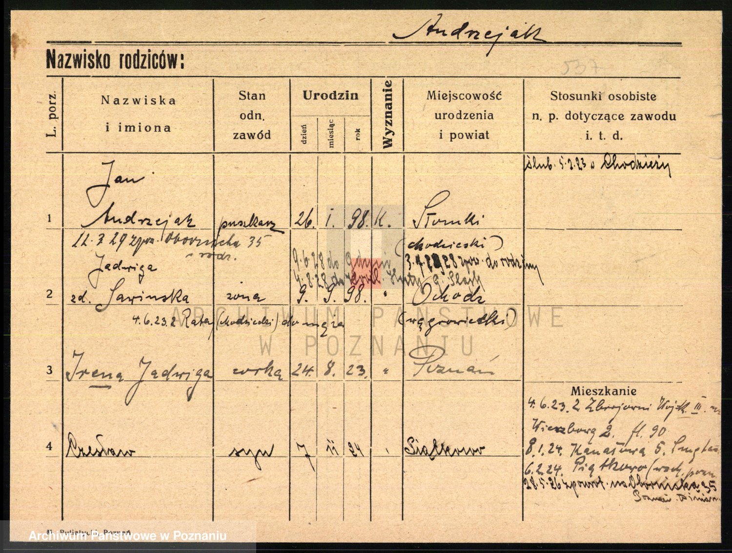 Podgląd karty osobowej dostępny jest po kliknięciu na nazwisko lub ikonkę karty. Można dokonywać powiększenia (ikony na górze) lub przechodzić między kolejnymi skanami (strzałki po bokach).