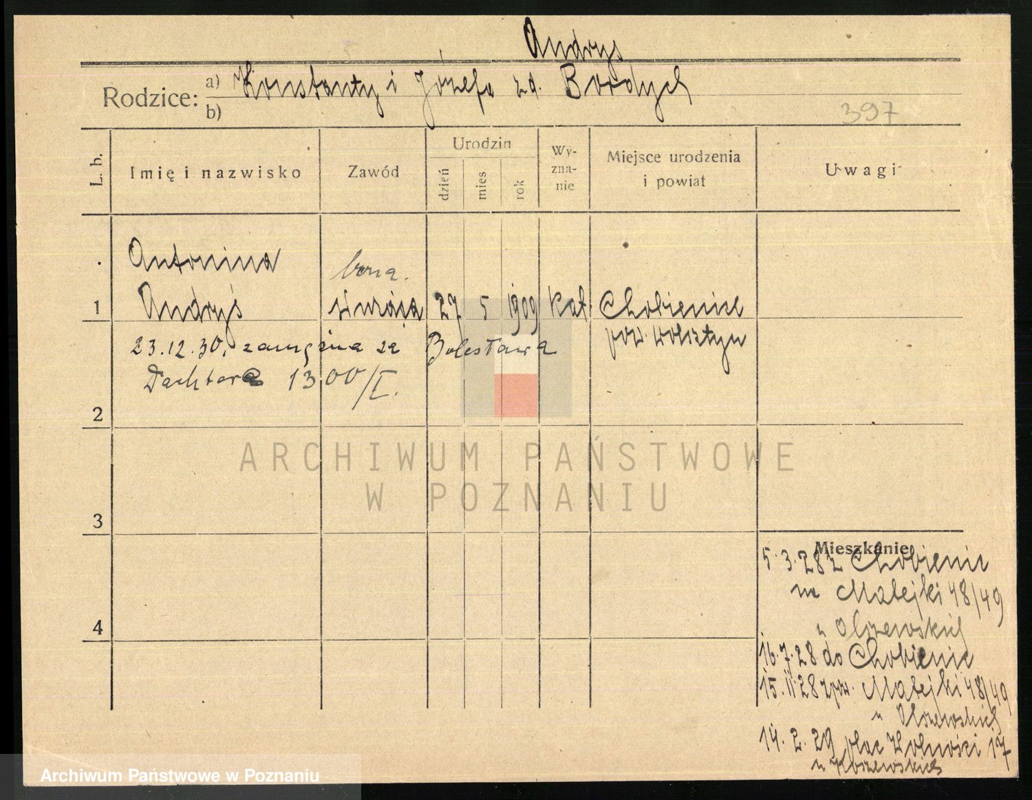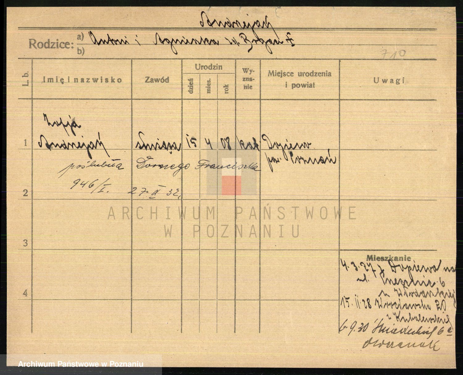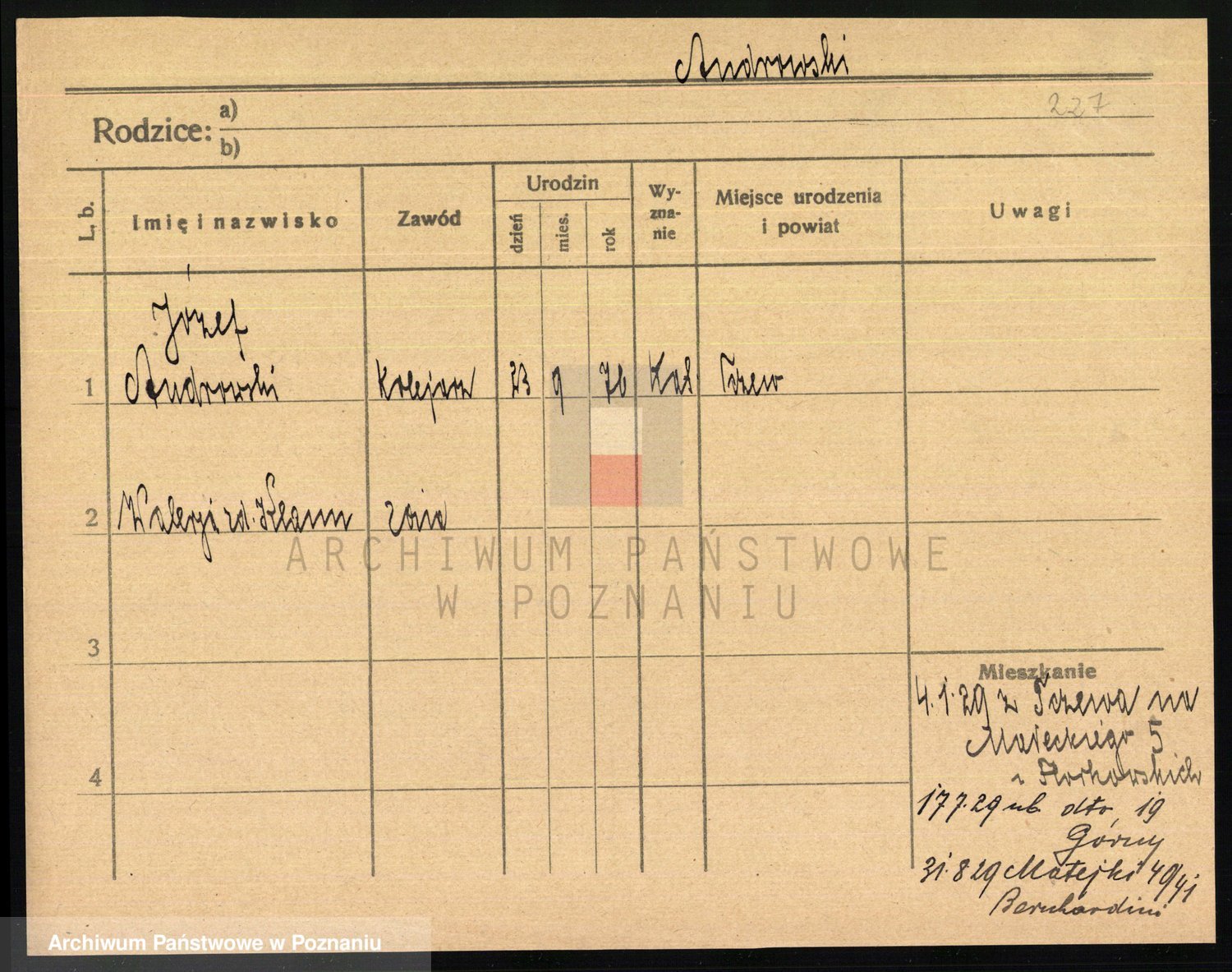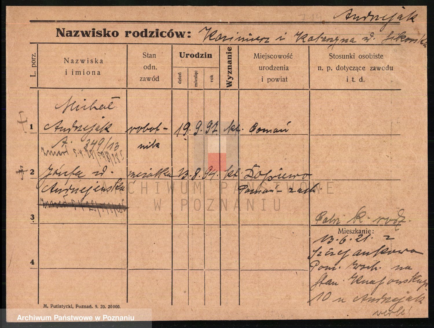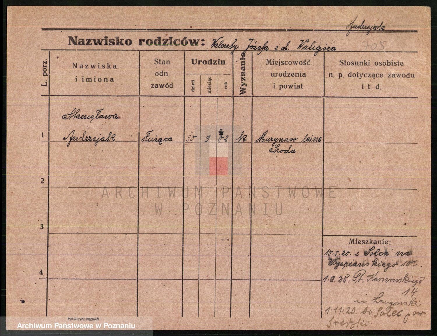 Podgląd karty osobowej dostępny jest po kliknięciu na nazwisko lub ikonkę karty. Można dokonywać powiększenia (ikony na górze) lub przechodzić między kolejnymi skanami (strzałki po bokach).