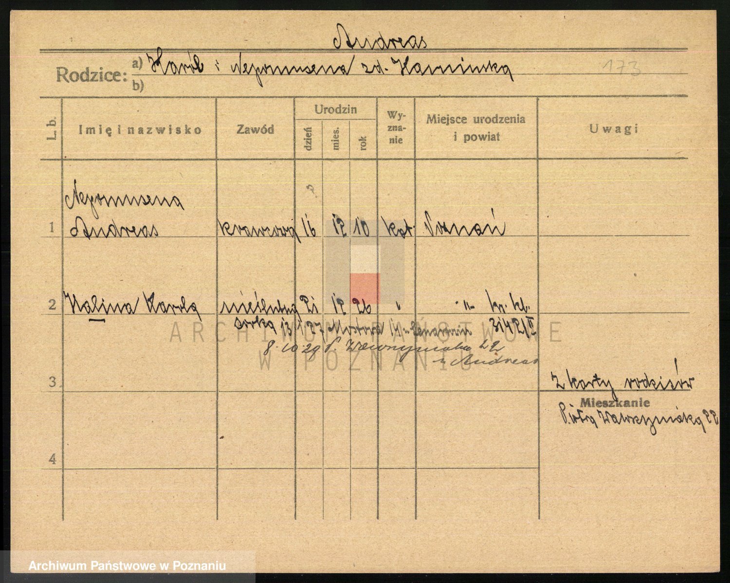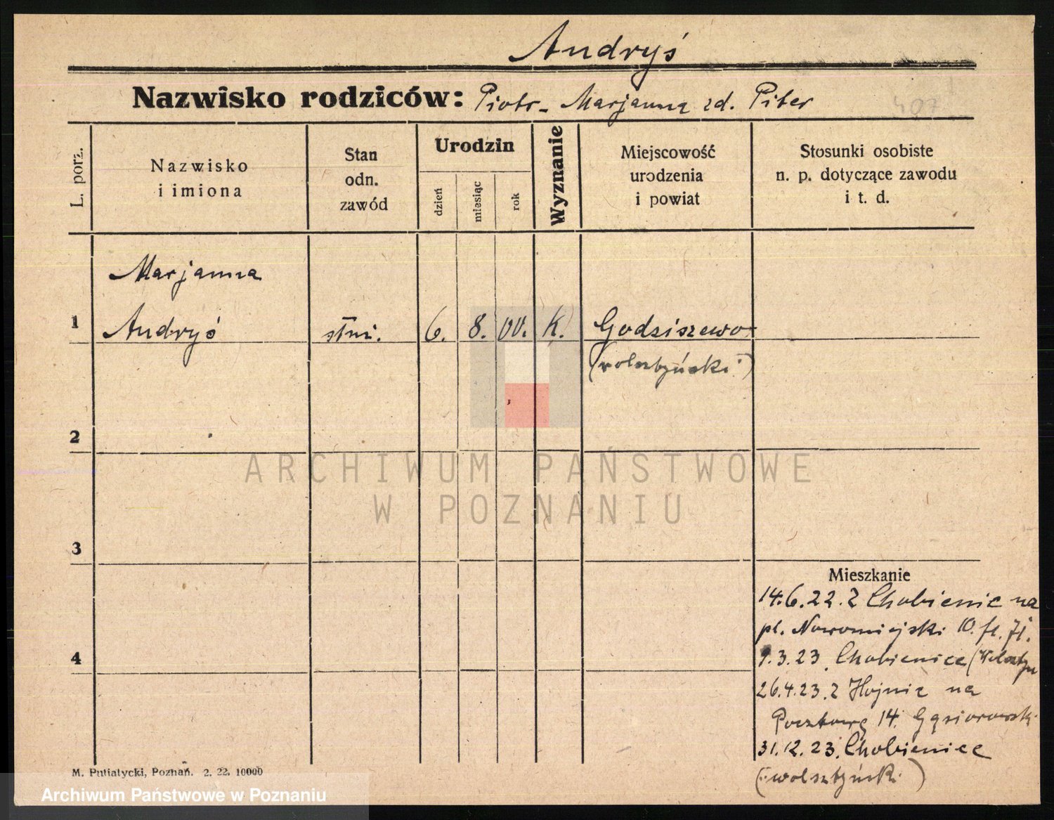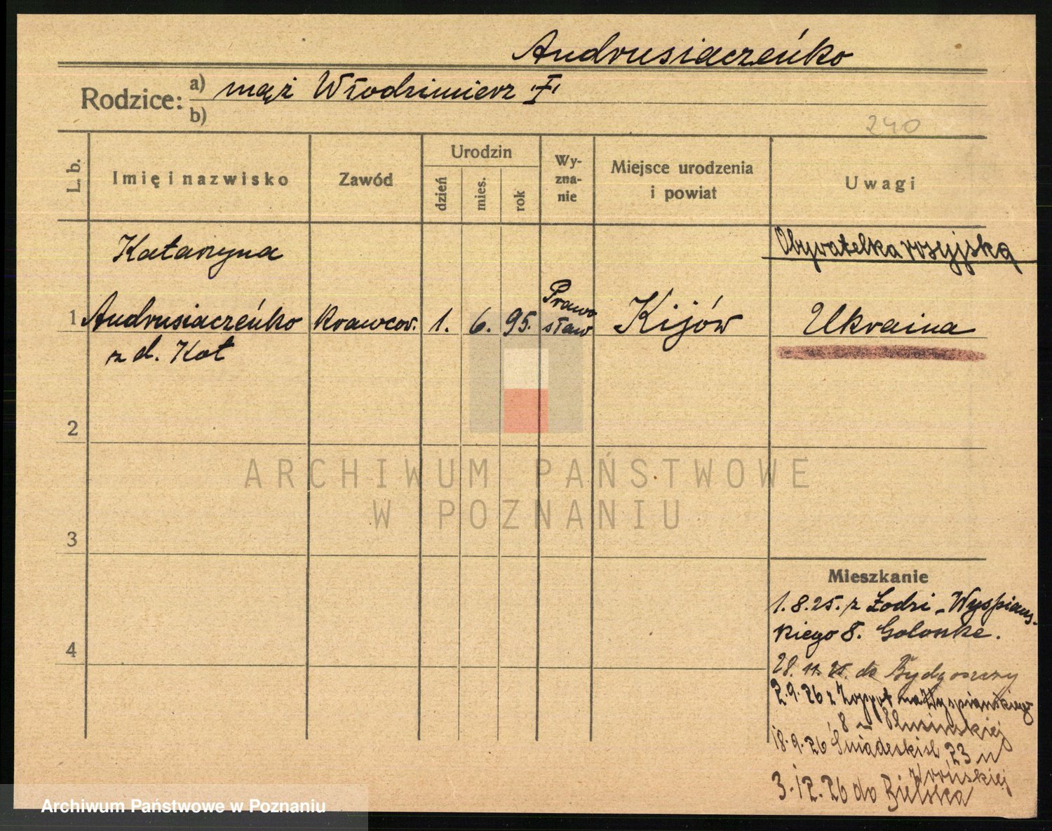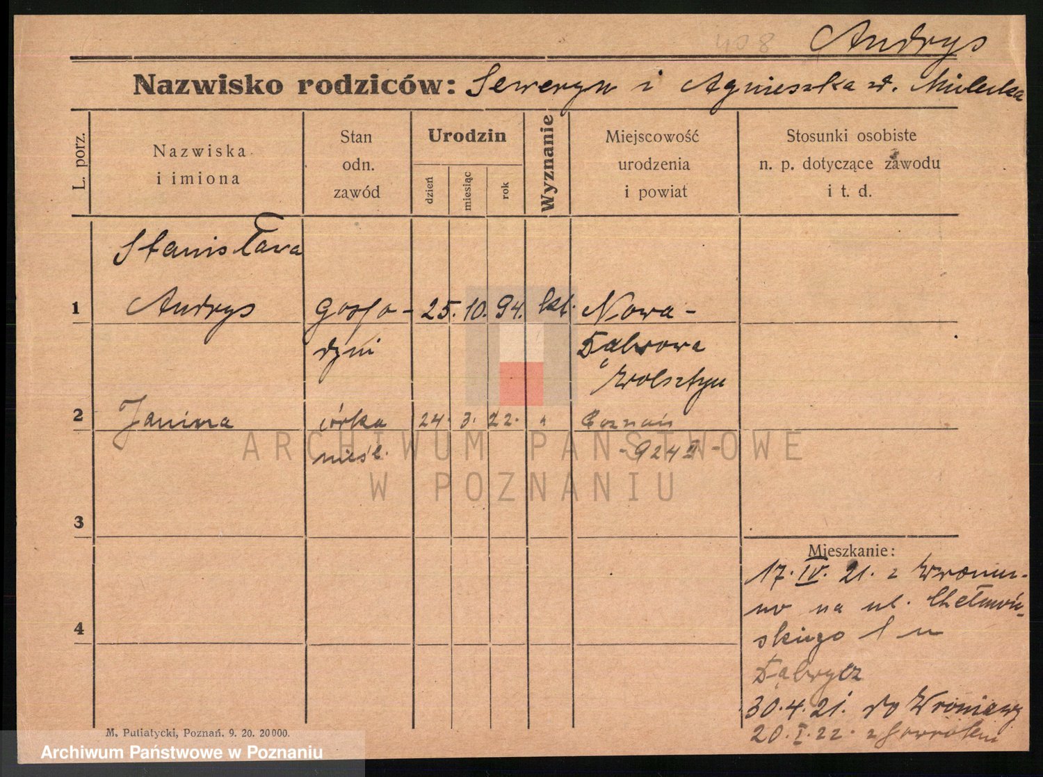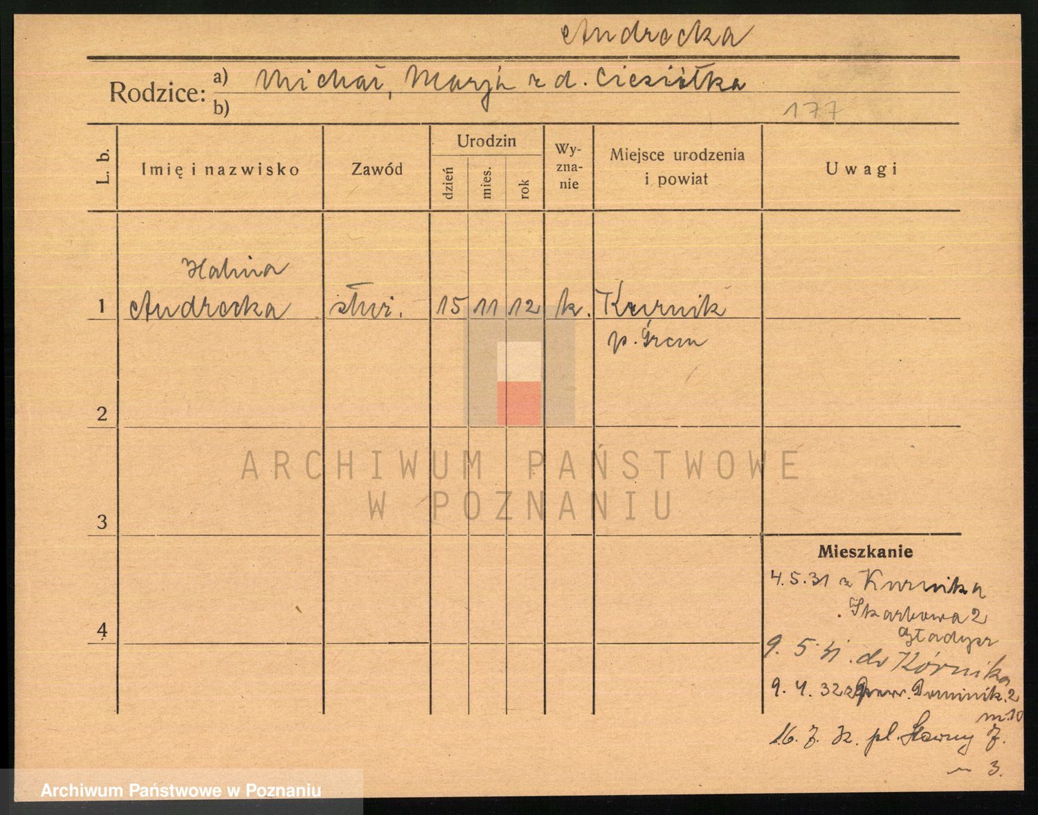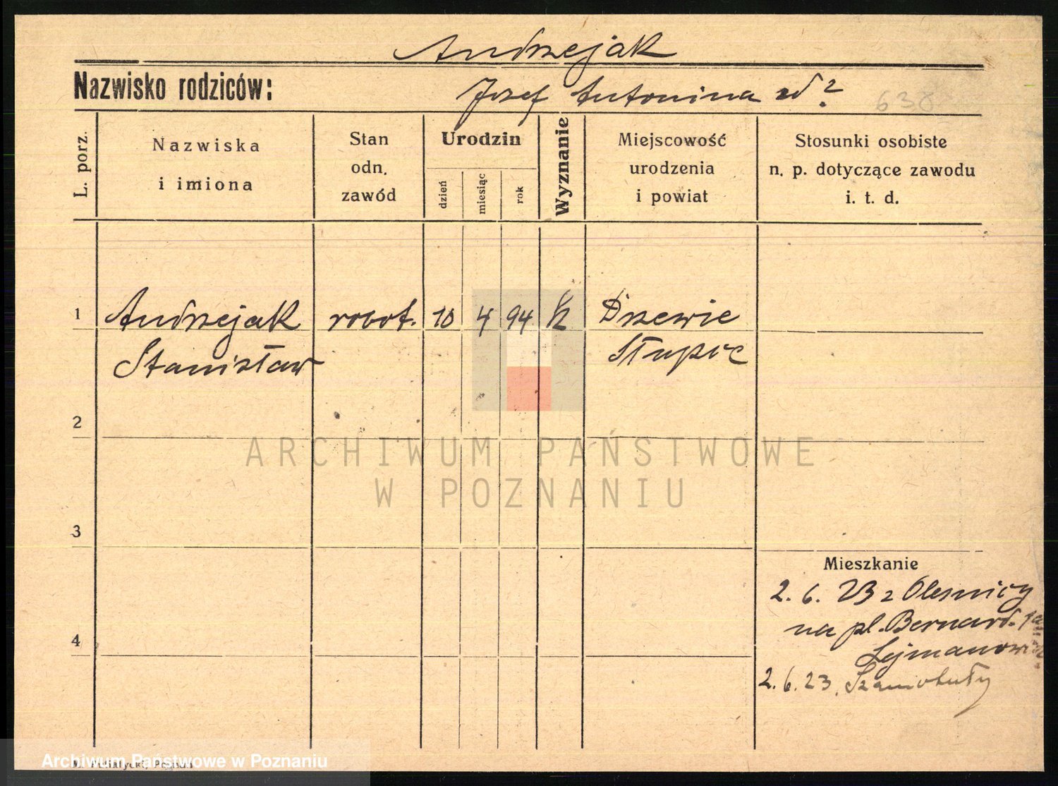 Podgląd karty osobowej dostępny jest po kliknięciu na nazwisko lub ikonkę karty. Można dokonywać powiększenia (ikony na górze) lub przechodzić między kolejnymi skanami (strzałki po bokach).