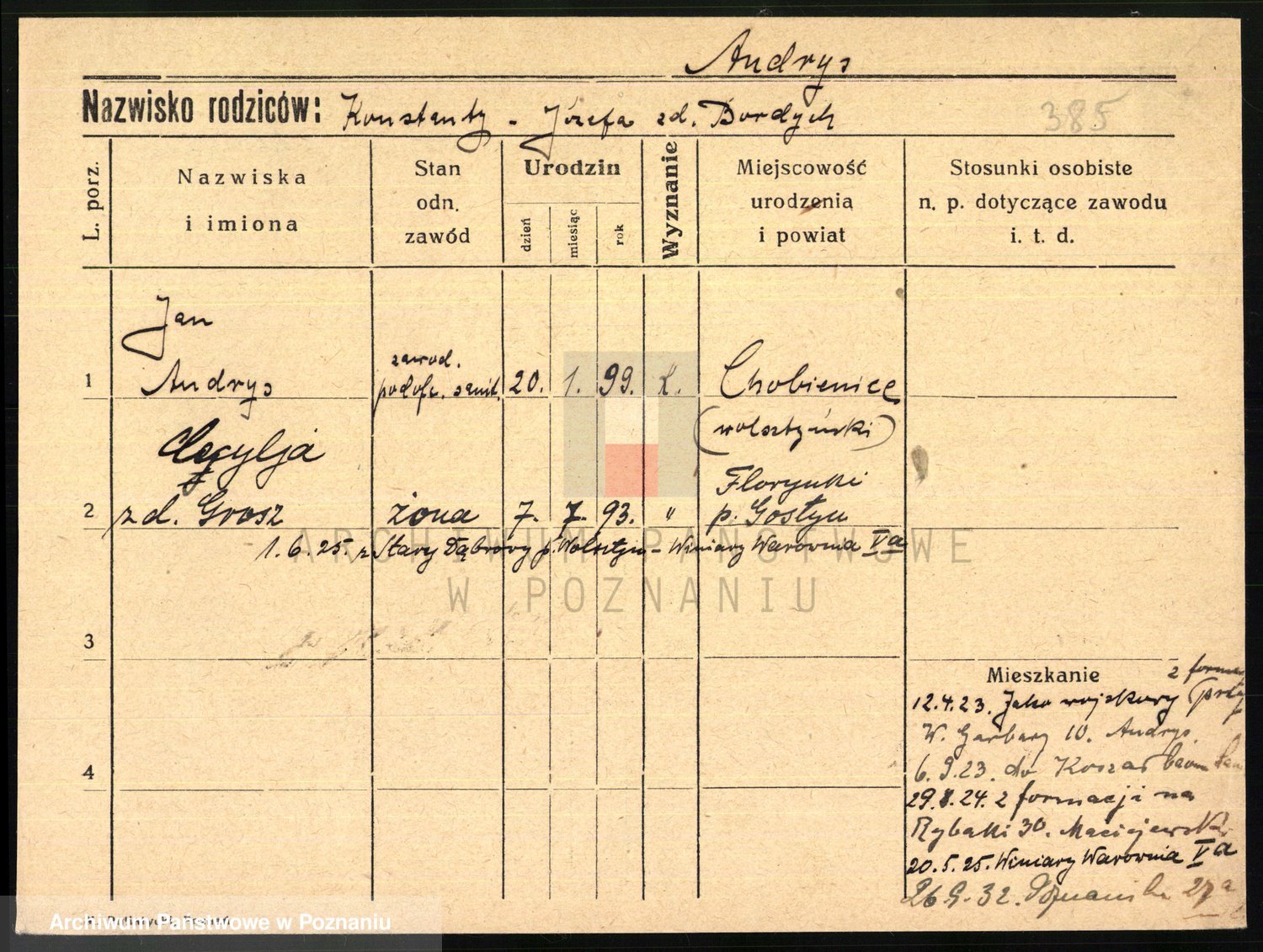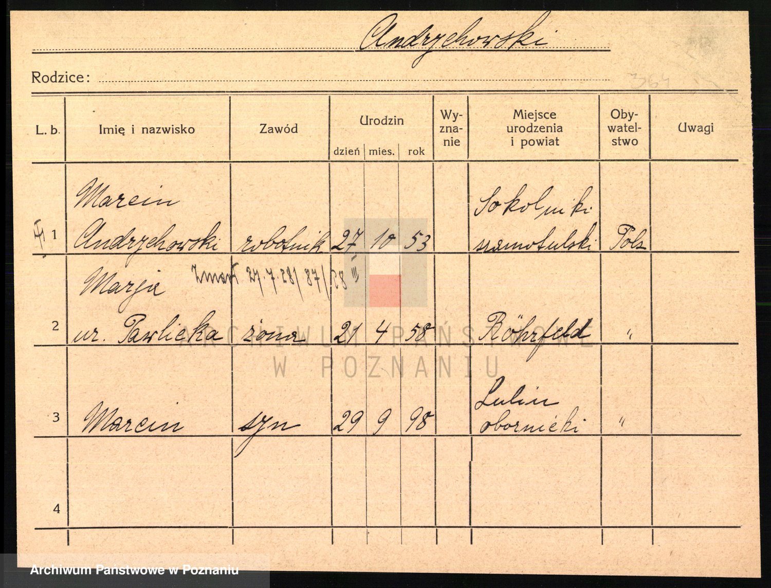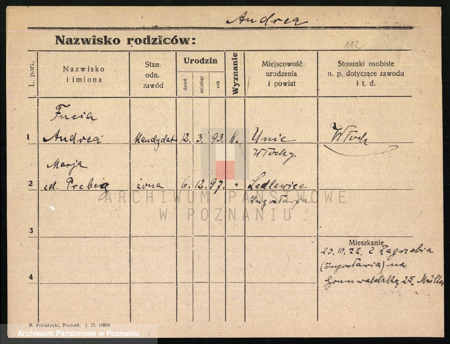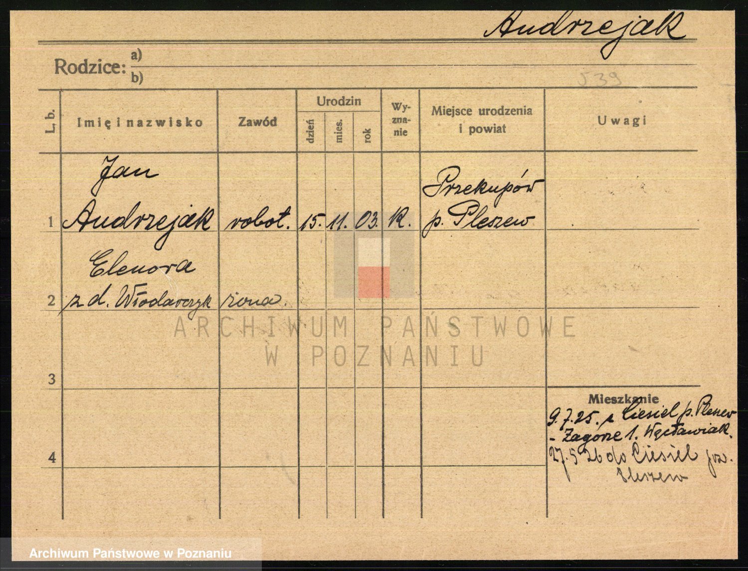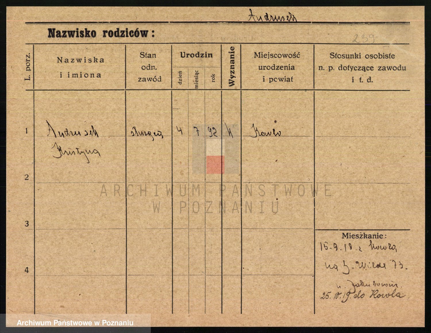 Podgląd karty osobowej dostępny jest po kliknięciu na nazwisko lub ikonkę karty. Można dokonywać powiększenia (ikony na górze) lub przechodzić między kolejnymi skanami (strzałki po bokach).