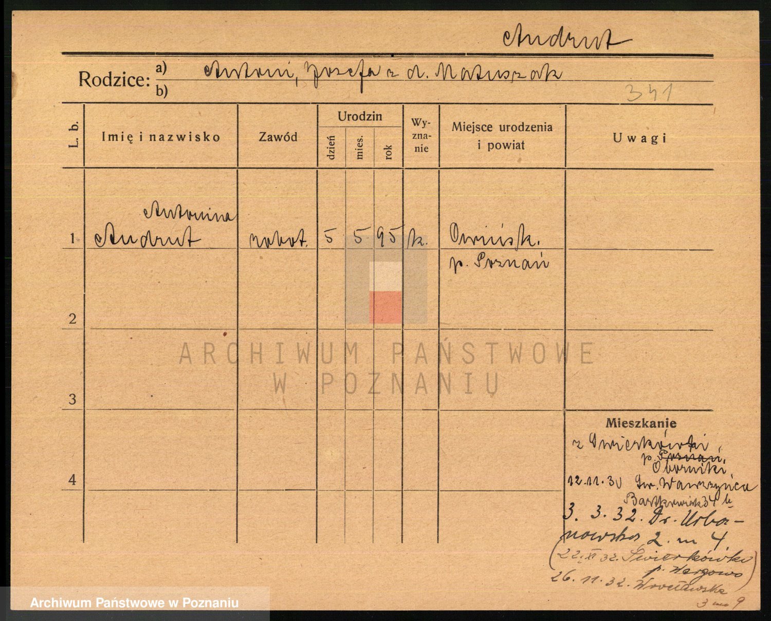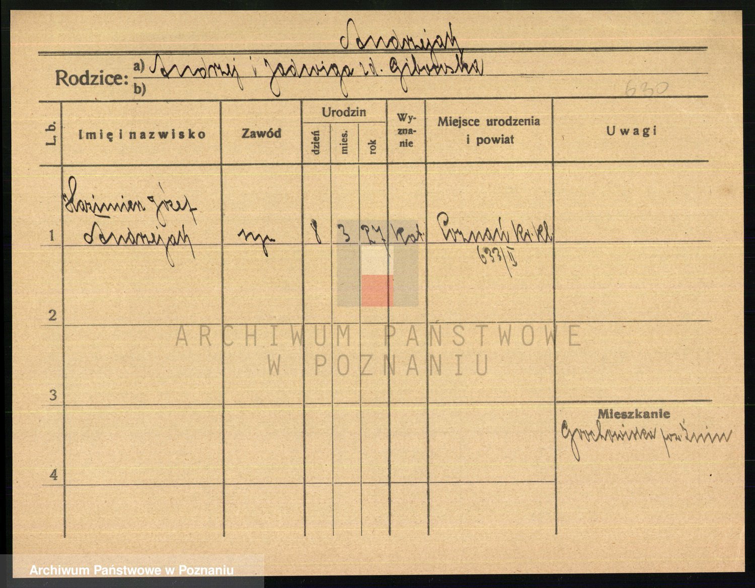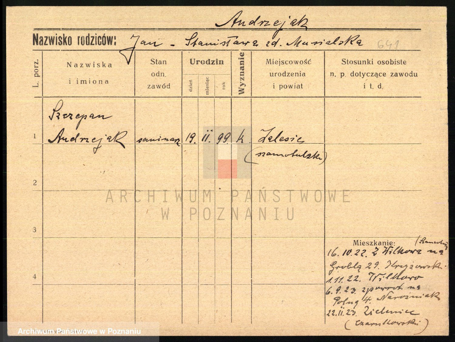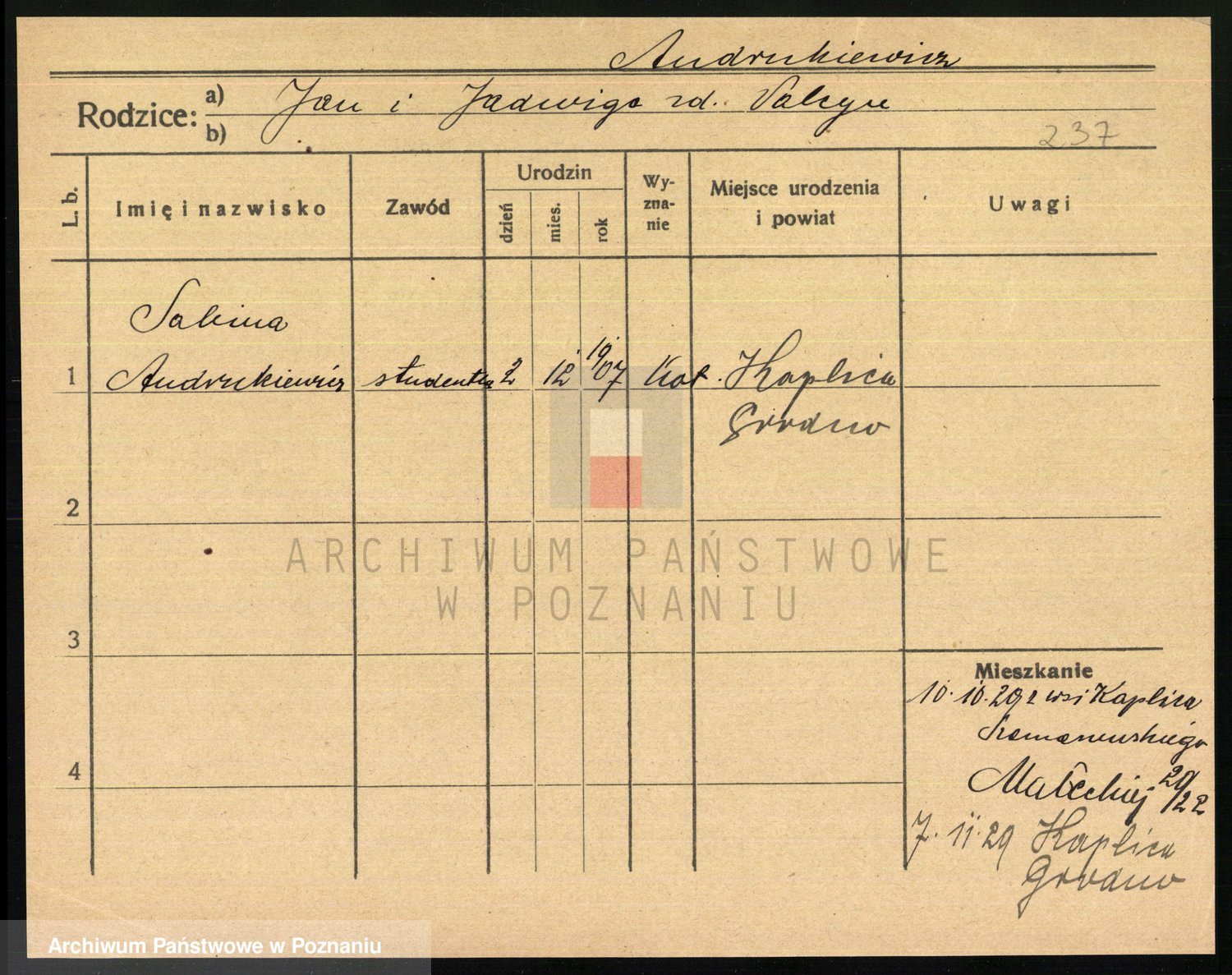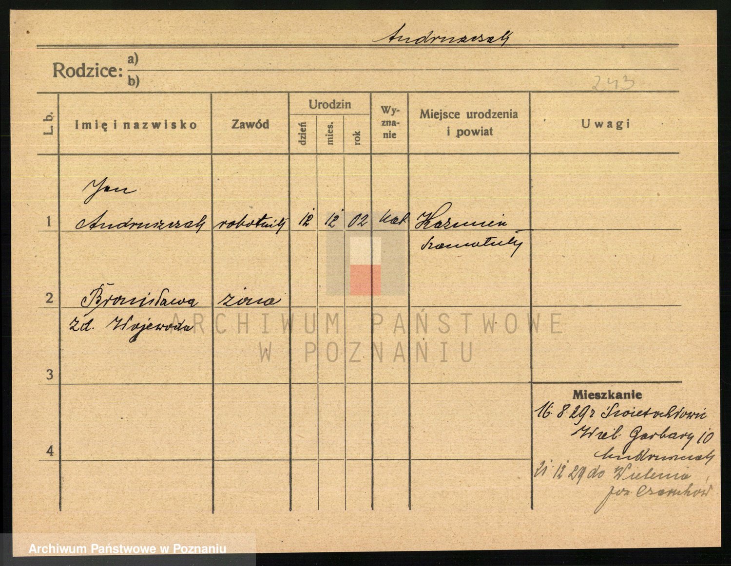 Podgląd karty osobowej dostępny jest po kliknięciu na nazwisko lub ikonkę karty. Można dokonywać powiększenia (ikony na górze) lub przechodzić między kolejnymi skanami (strzałki po bokach).