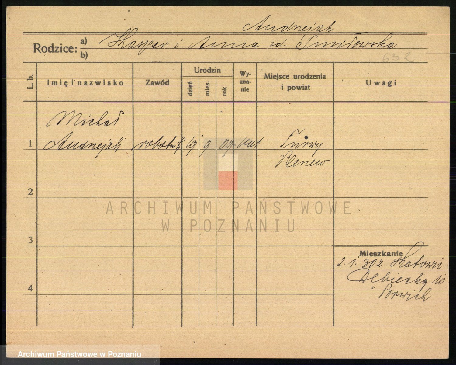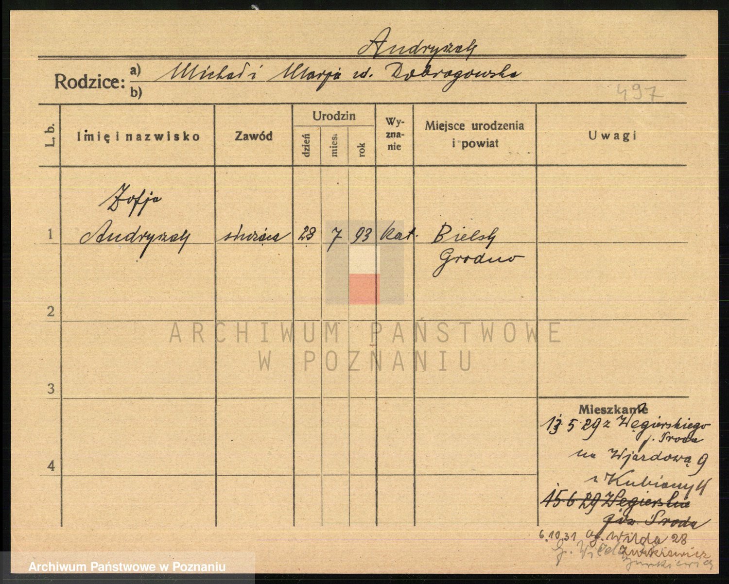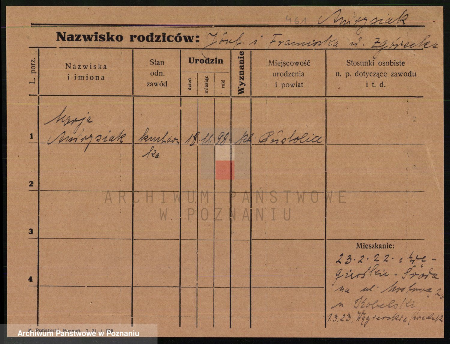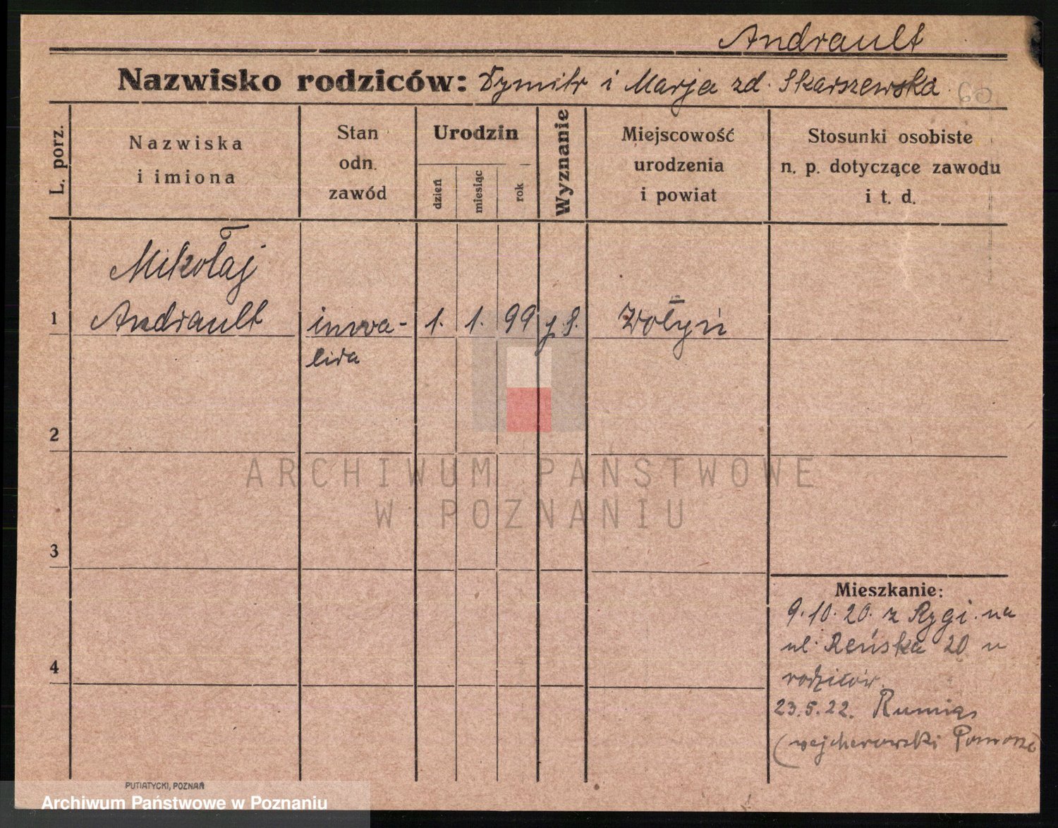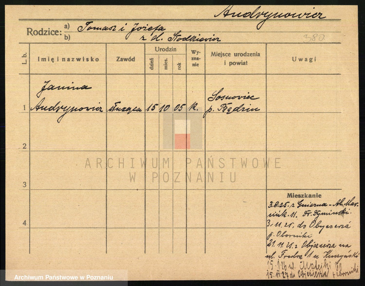 Podgląd karty osobowej dostępny jest po kliknięciu na nazwisko lub ikonkę karty. Można dokonywać powiększenia (ikony na górze) lub przechodzić między kolejnymi skanami (strzałki po bokach).