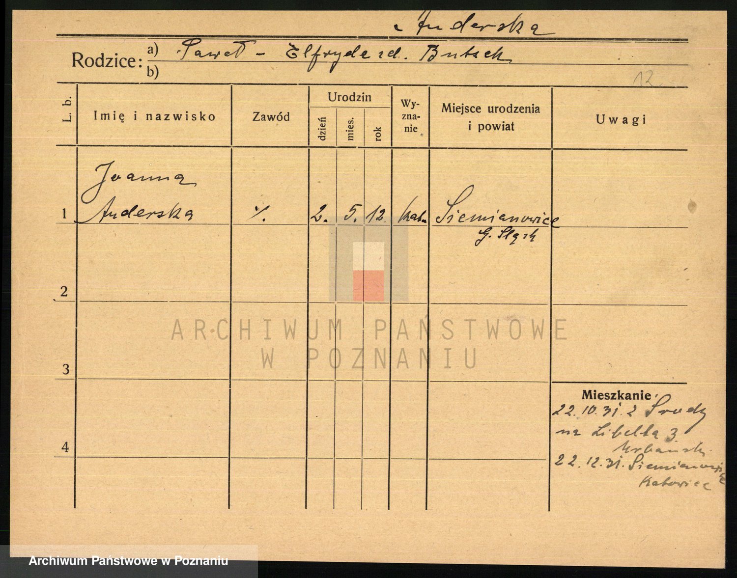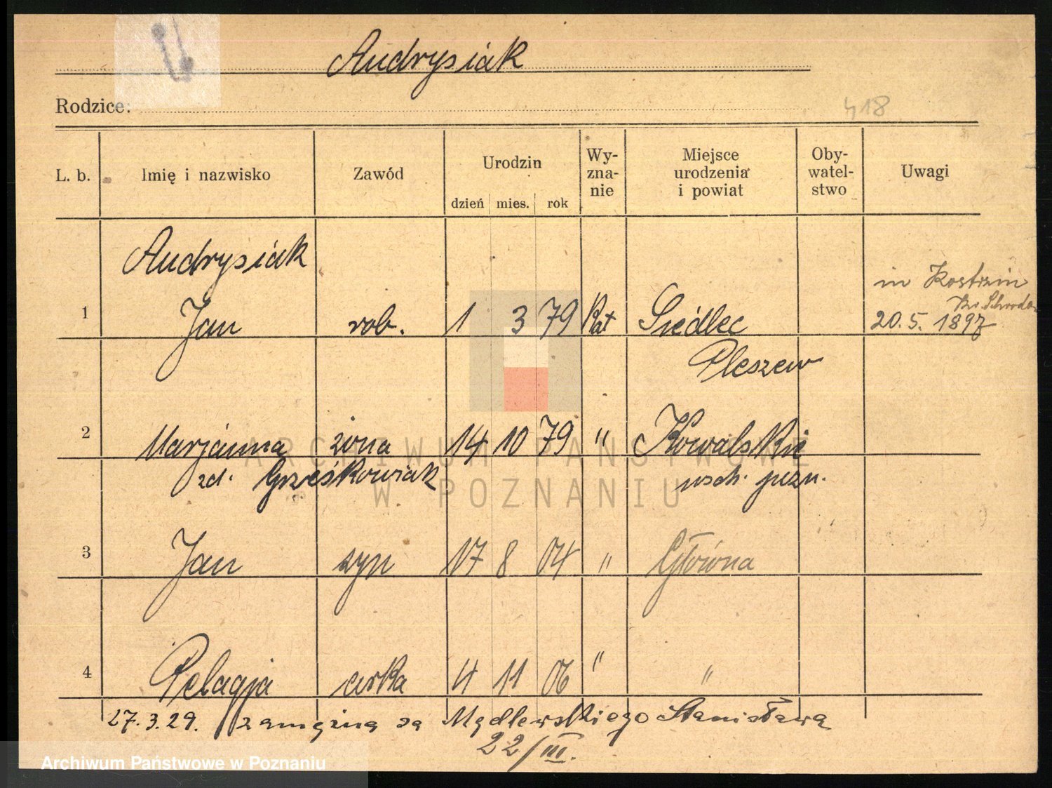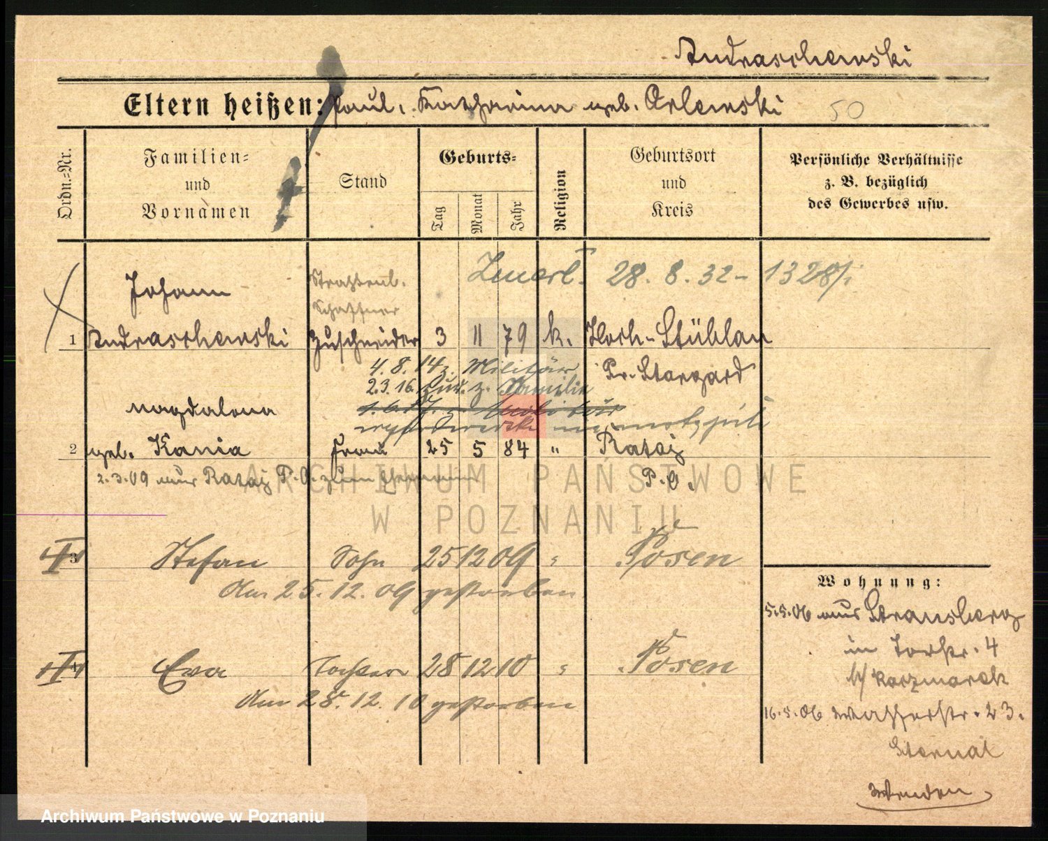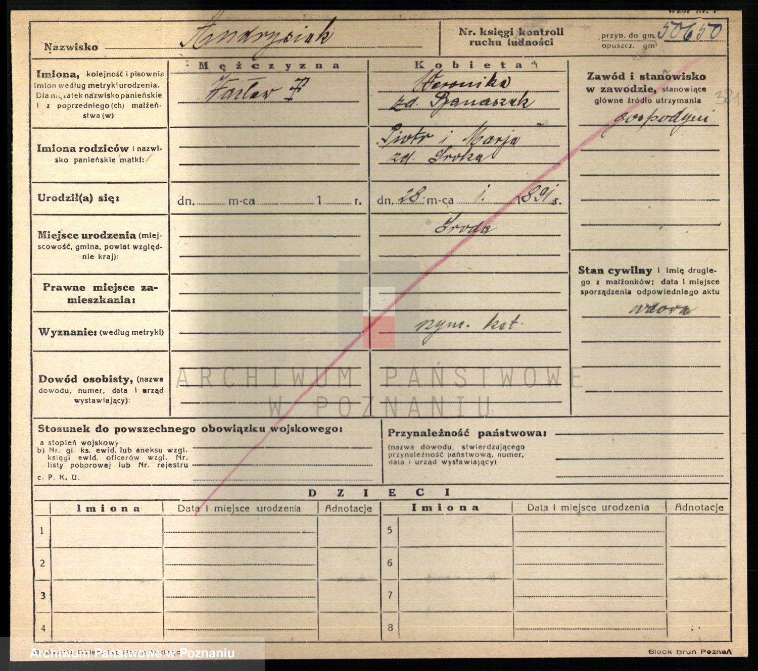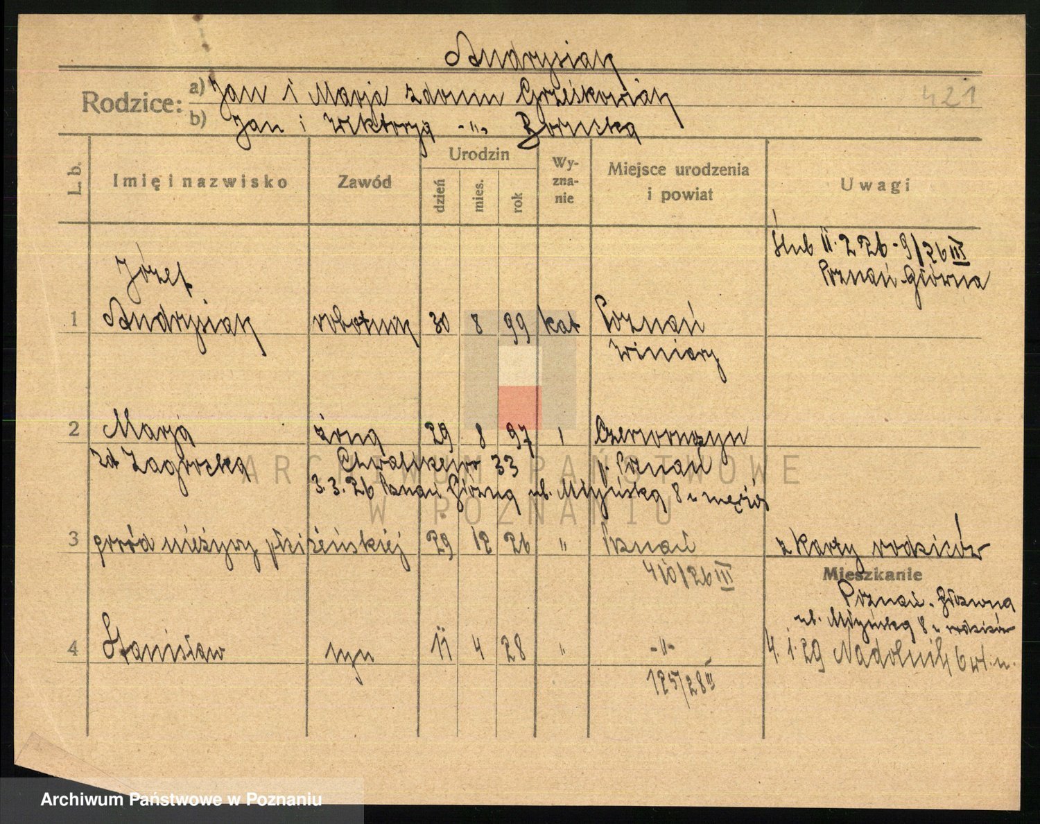 Podgląd karty osobowej dostępny jest po kliknięciu na nazwisko lub ikonkę karty. Można dokonywać powiększenia (ikony na górze) lub przechodzić między kolejnymi skanami (strzałki po bokach).