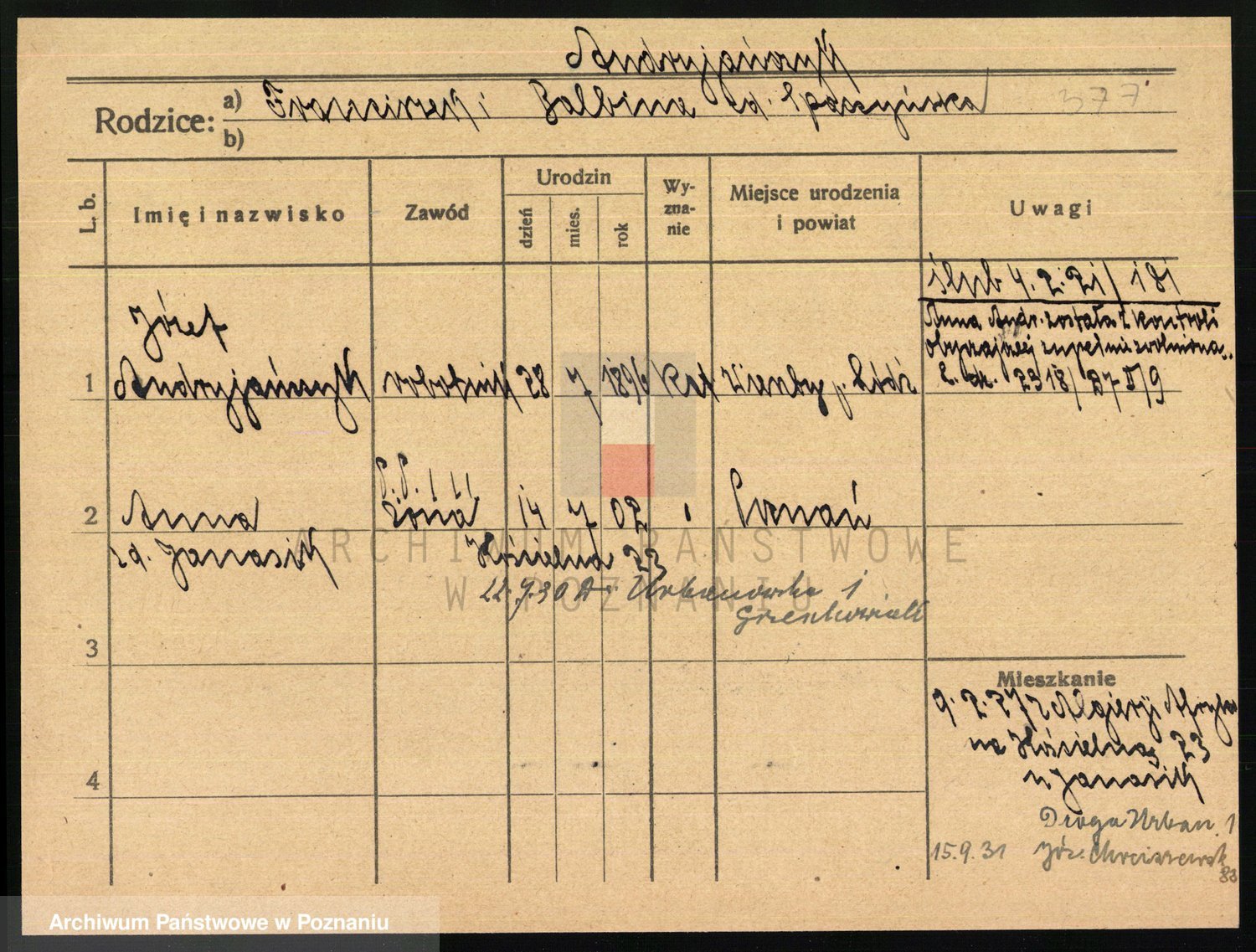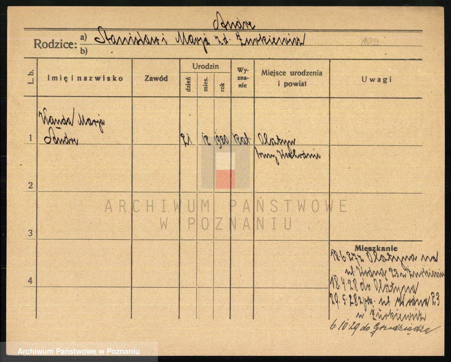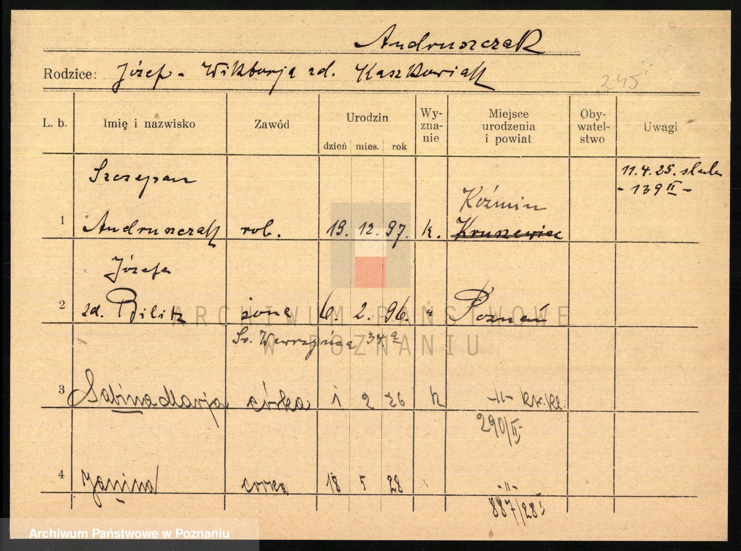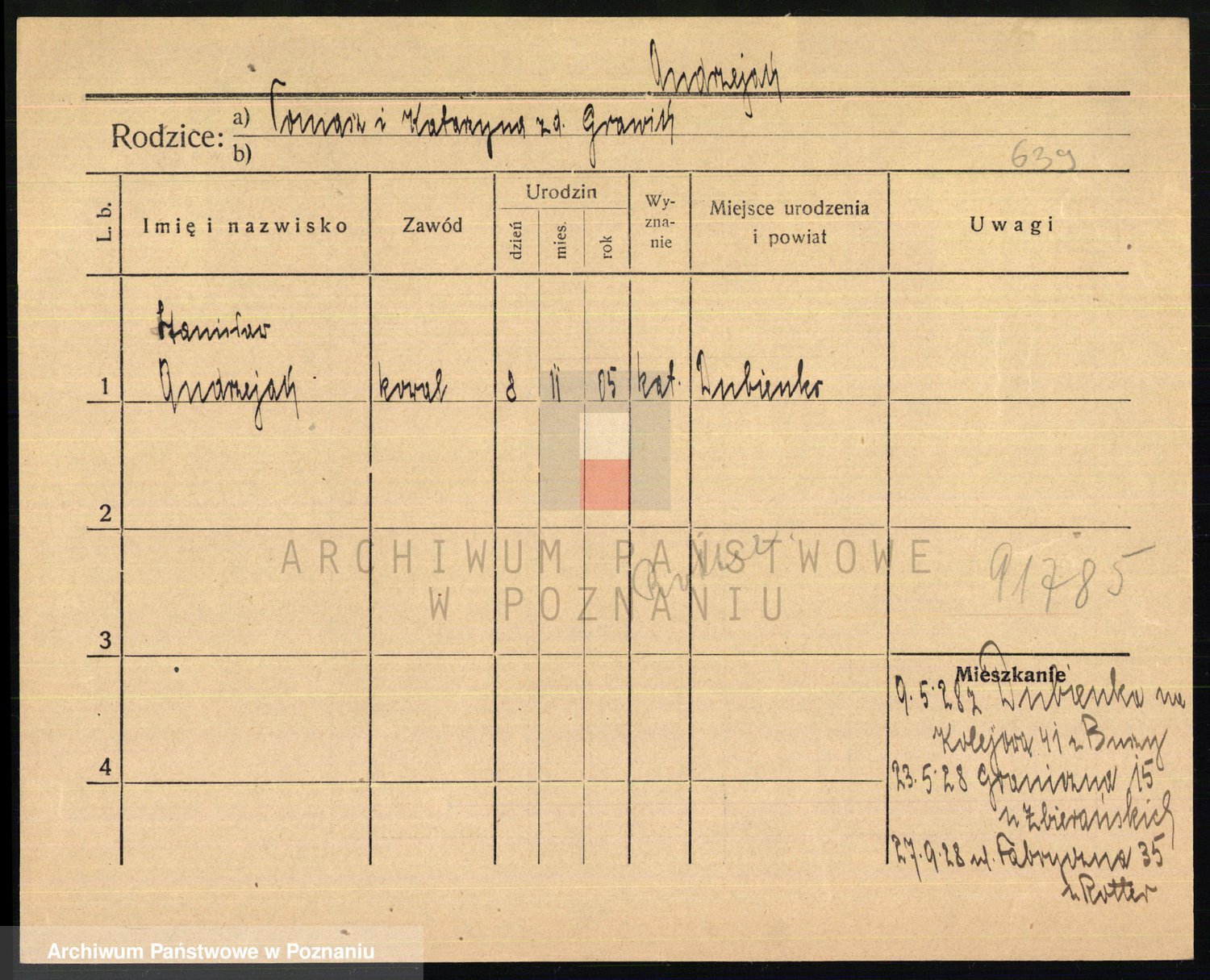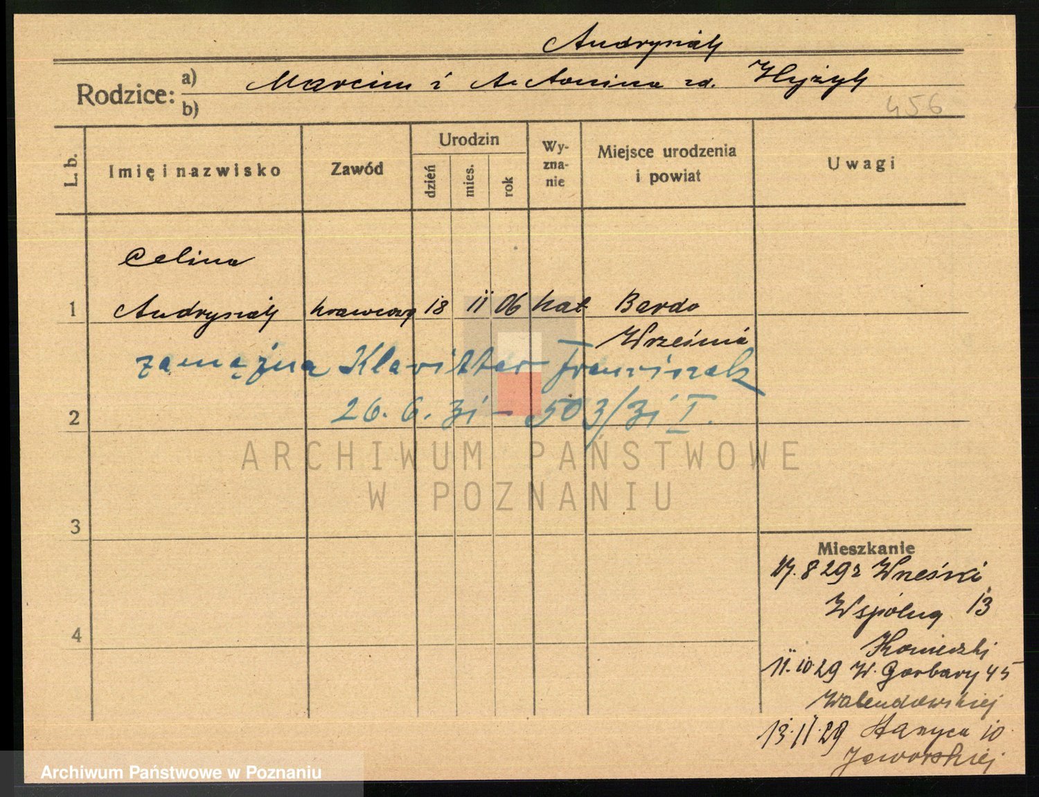 Podgląd karty osobowej dostępny jest po kliknięciu na nazwisko lub ikonkę karty. Można dokonywać powiększenia (ikony na górze) lub przechodzić między kolejnymi skanami (strzałki po bokach).