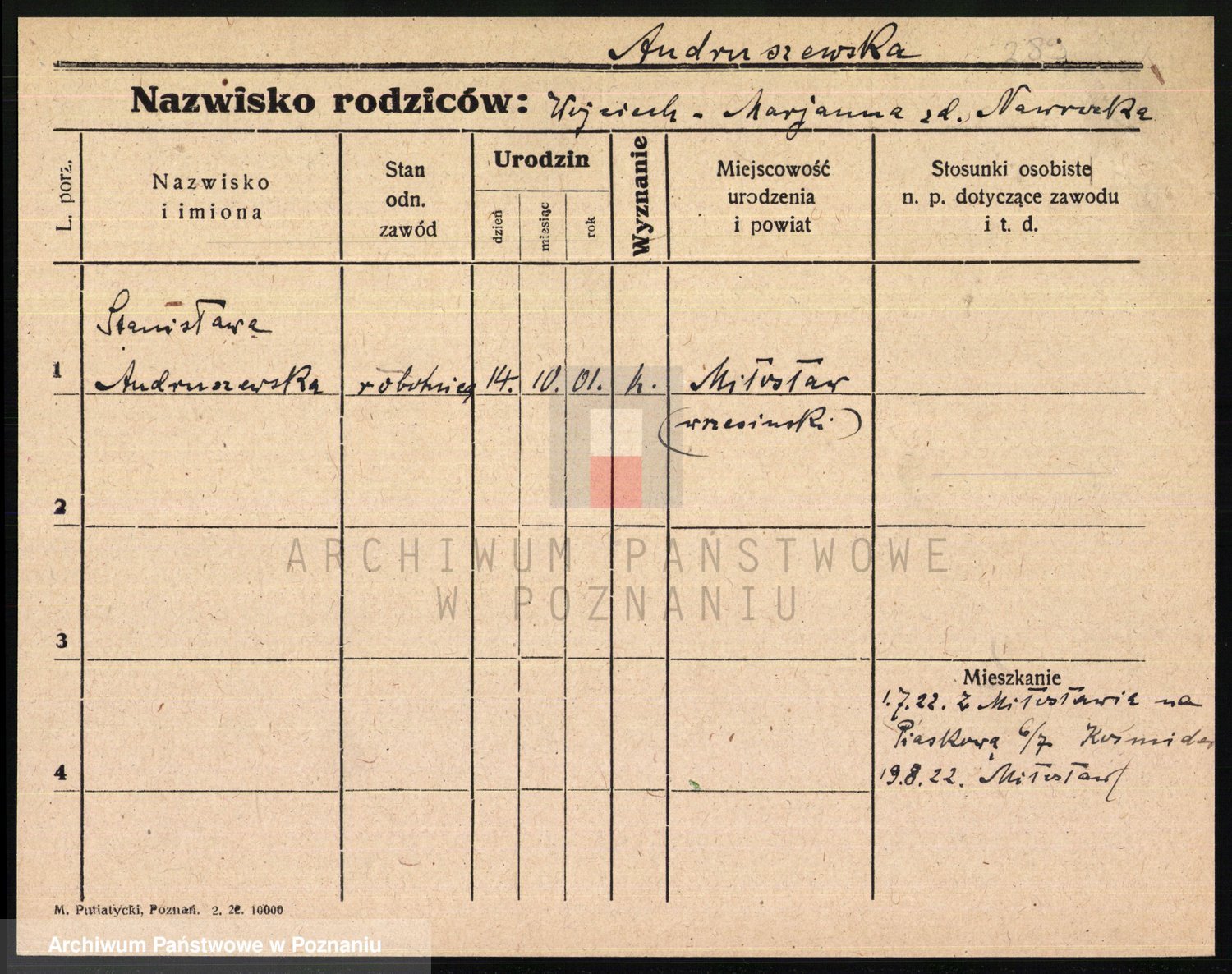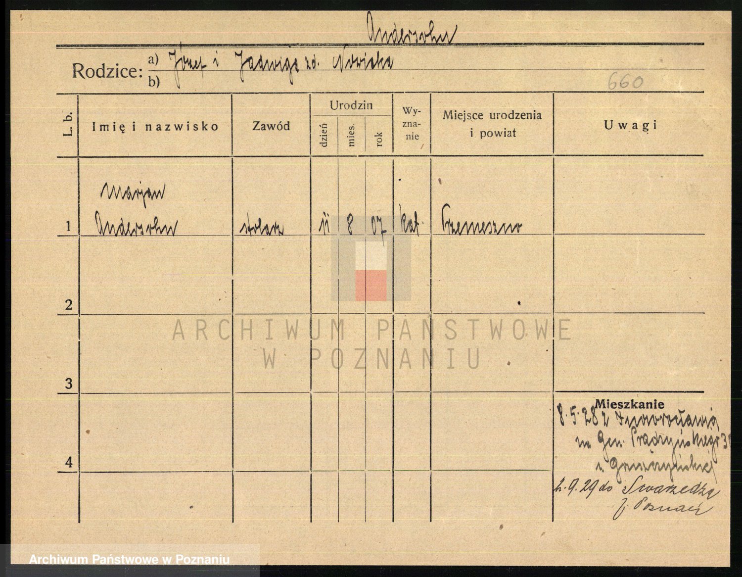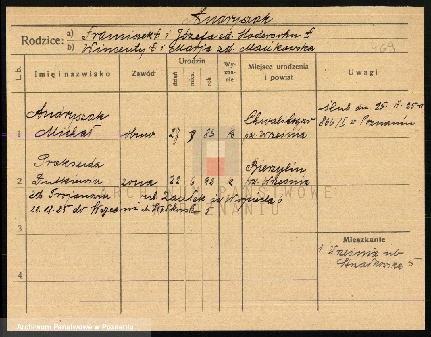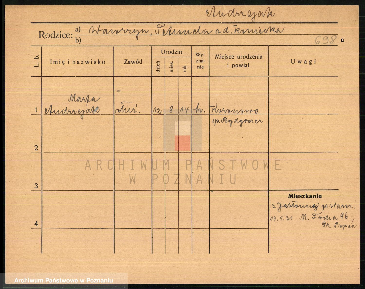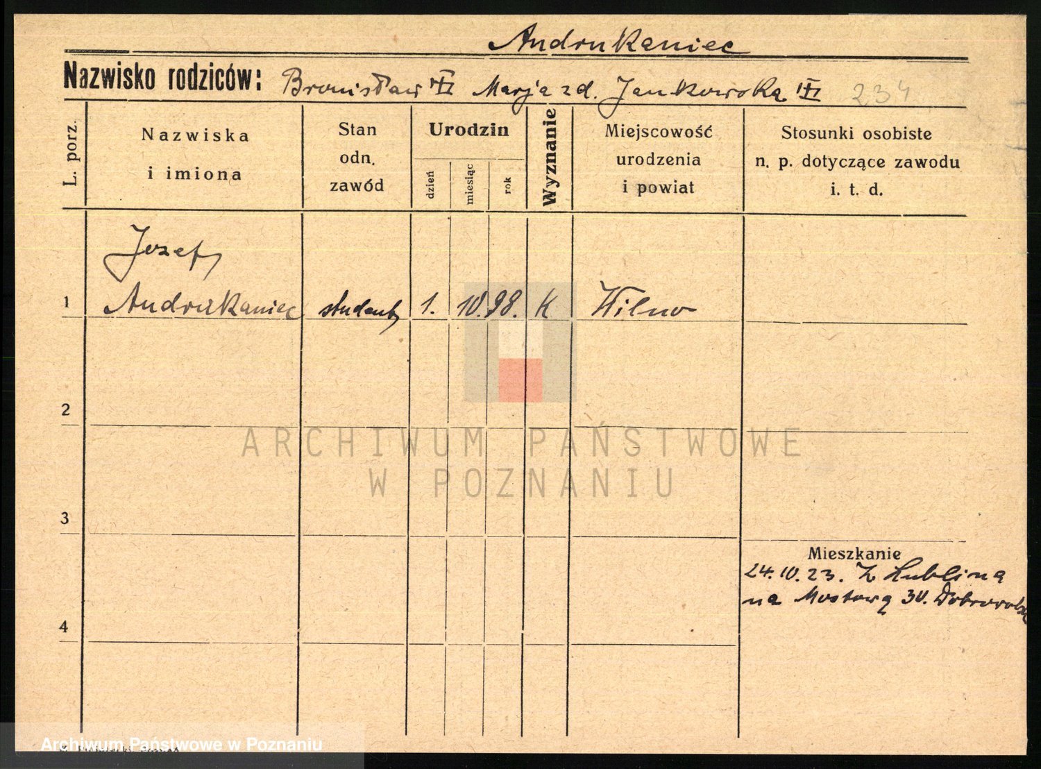 Podgląd karty osobowej dostępny jest po kliknięciu na nazwisko lub ikonkę karty. Można dokonywać powiększenia (ikony na górze) lub przechodzić między kolejnymi skanami (strzałki po bokach).