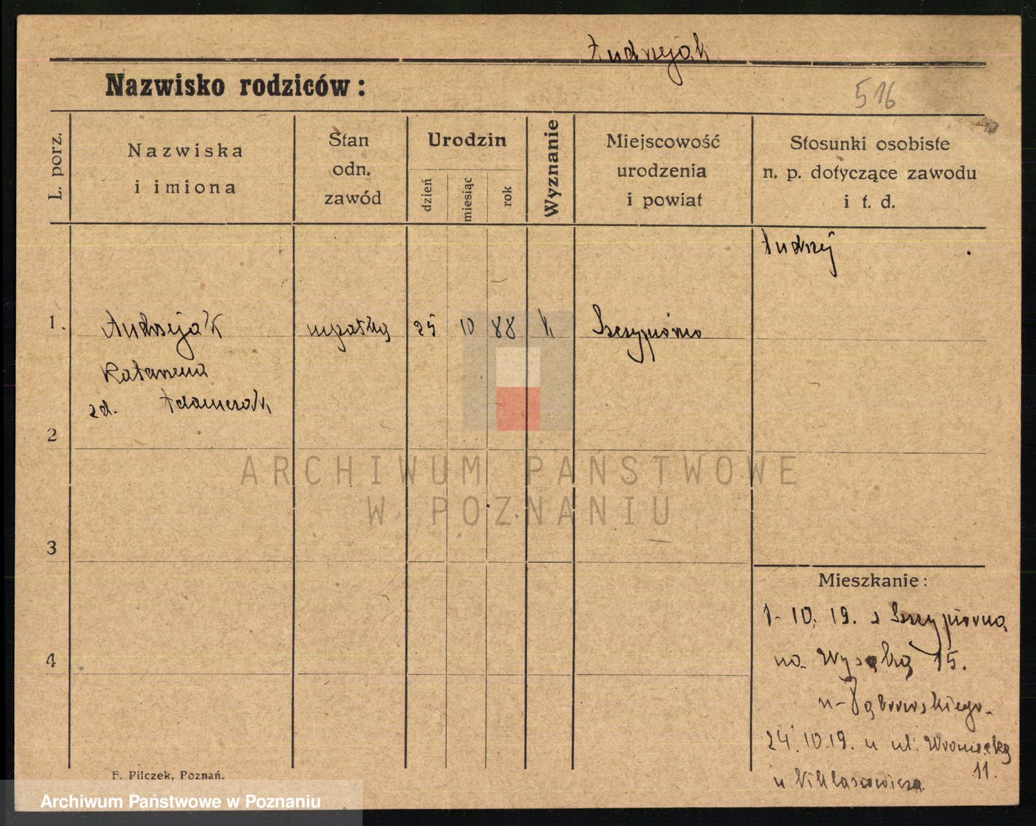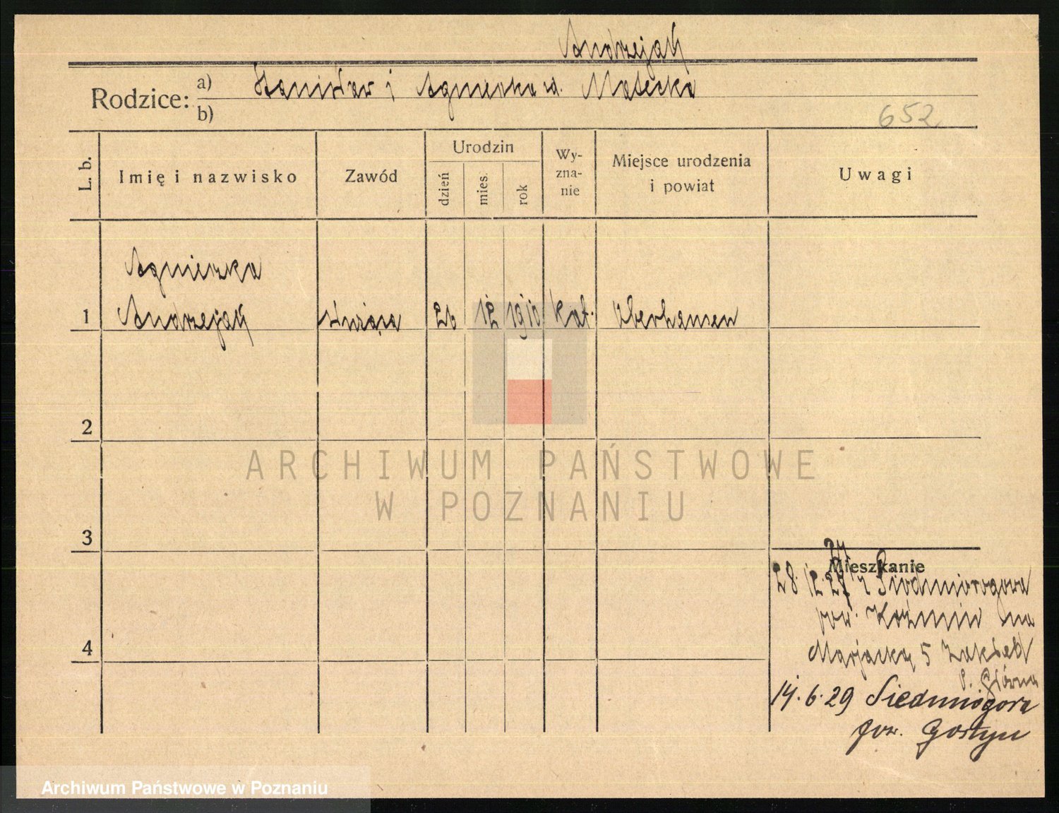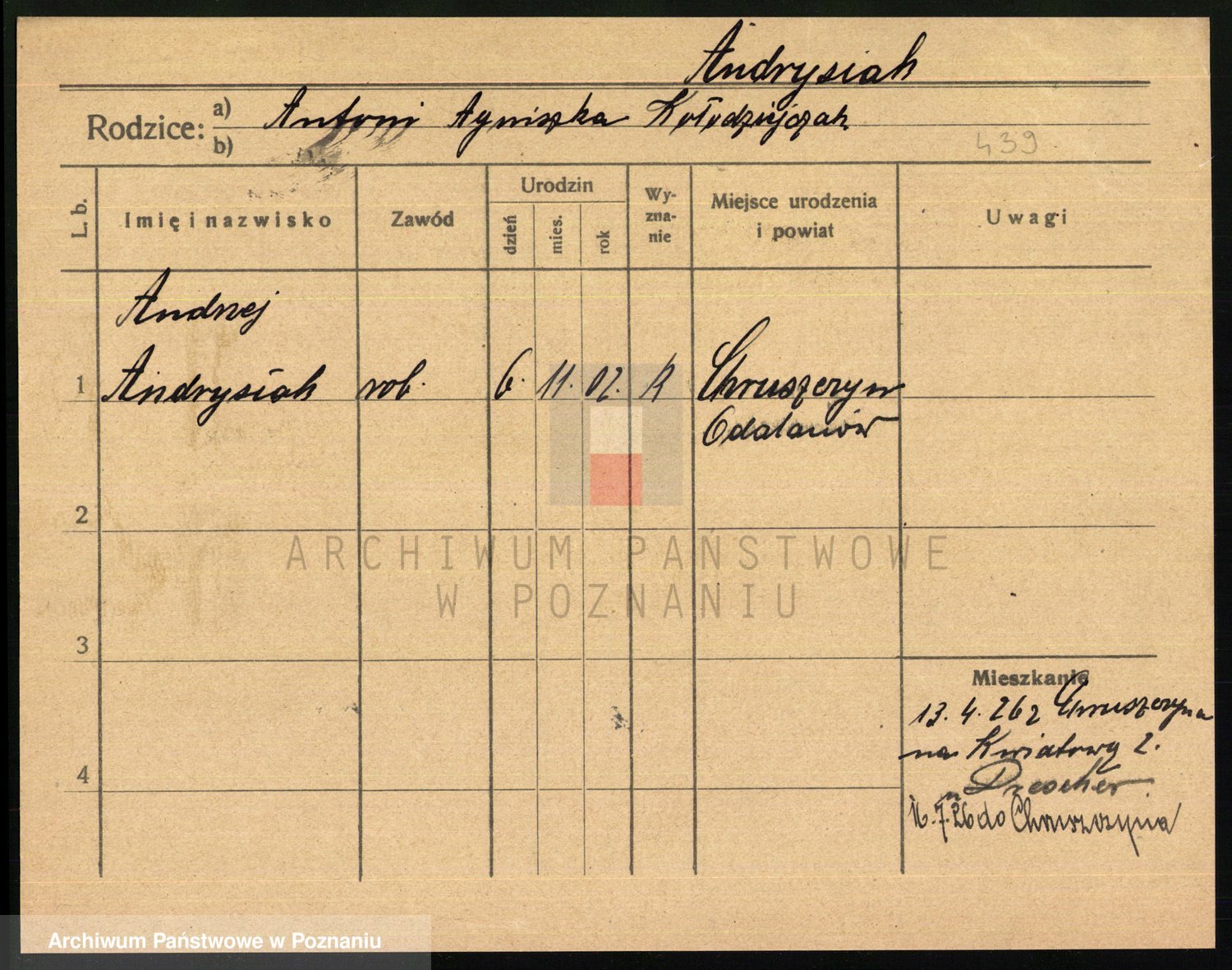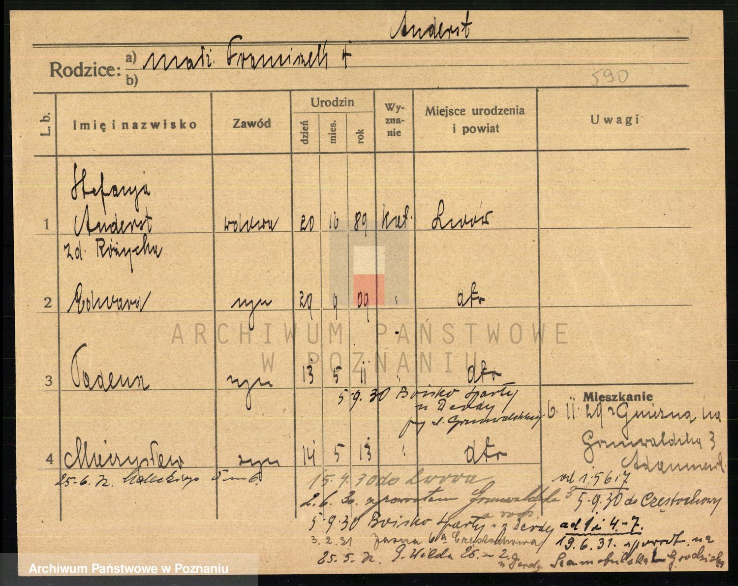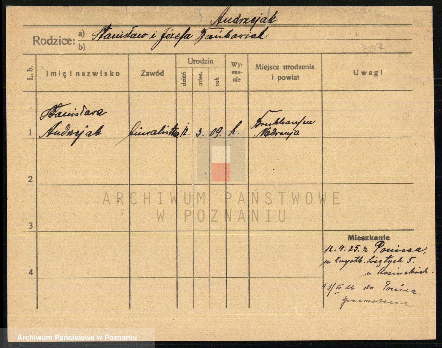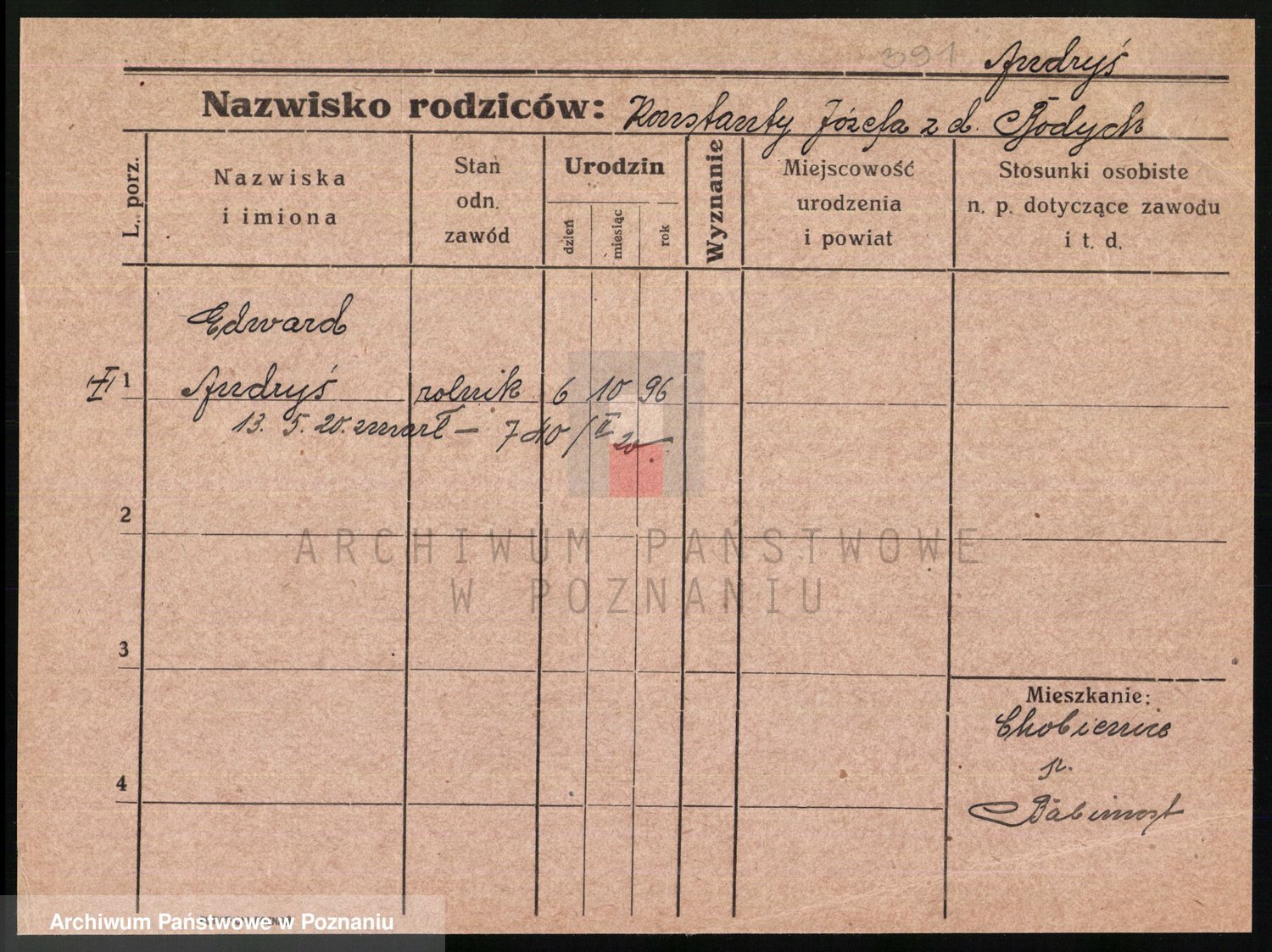 Podgląd karty osobowej dostępny jest po kliknięciu na nazwisko lub ikonkę karty. Można dokonywać powiększenia (ikony na górze) lub przechodzić między kolejnymi skanami (strzałki po bokach).