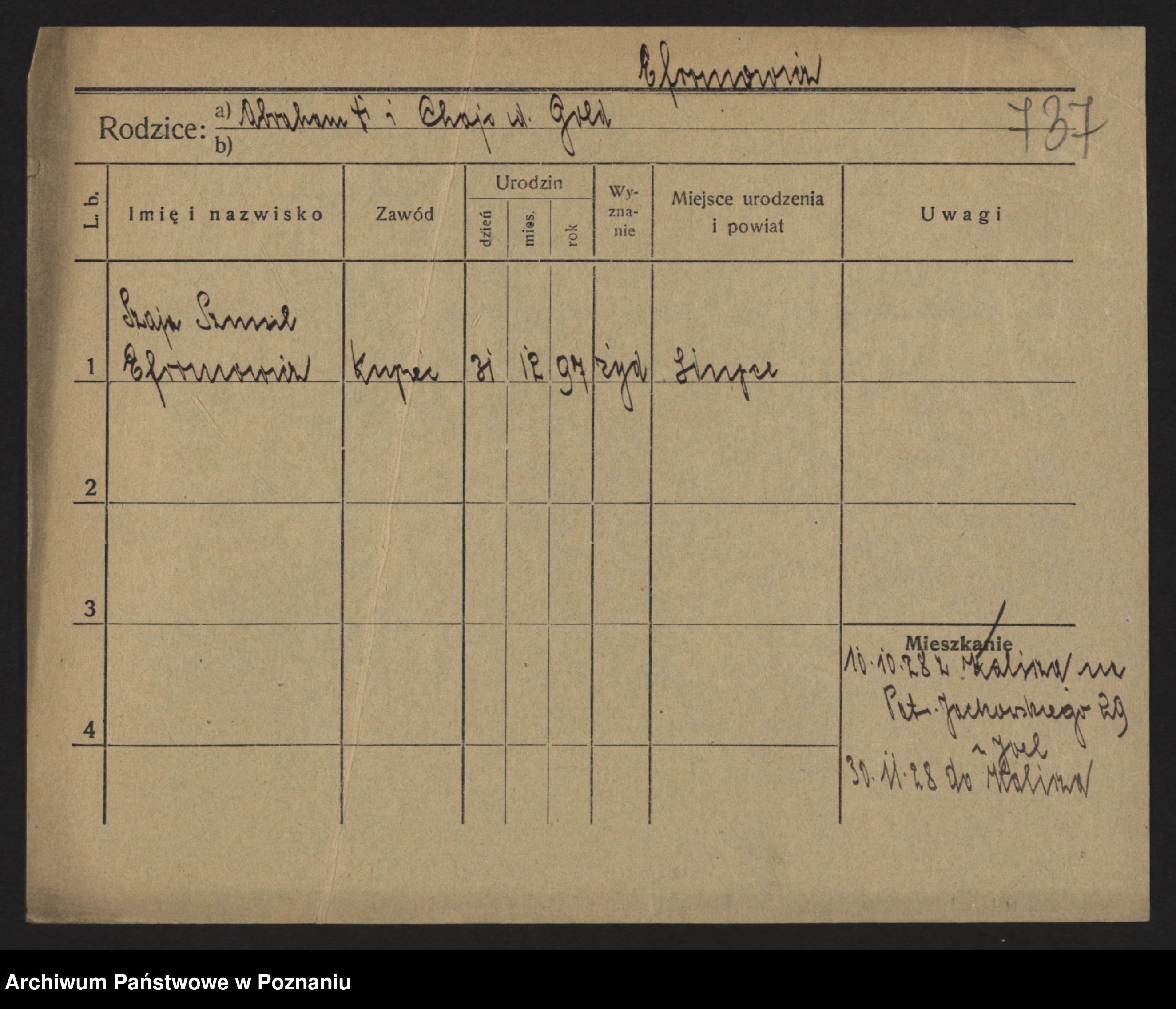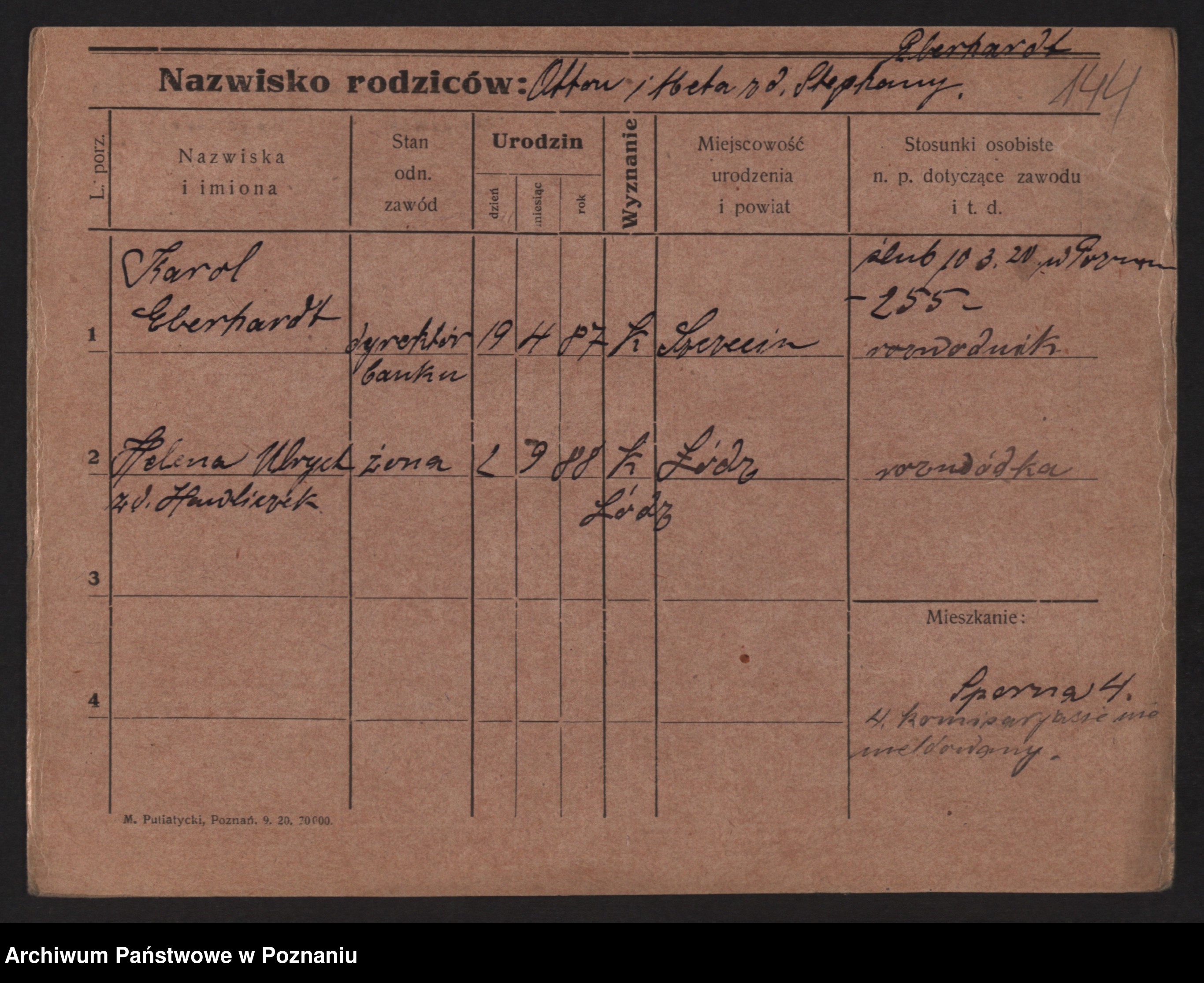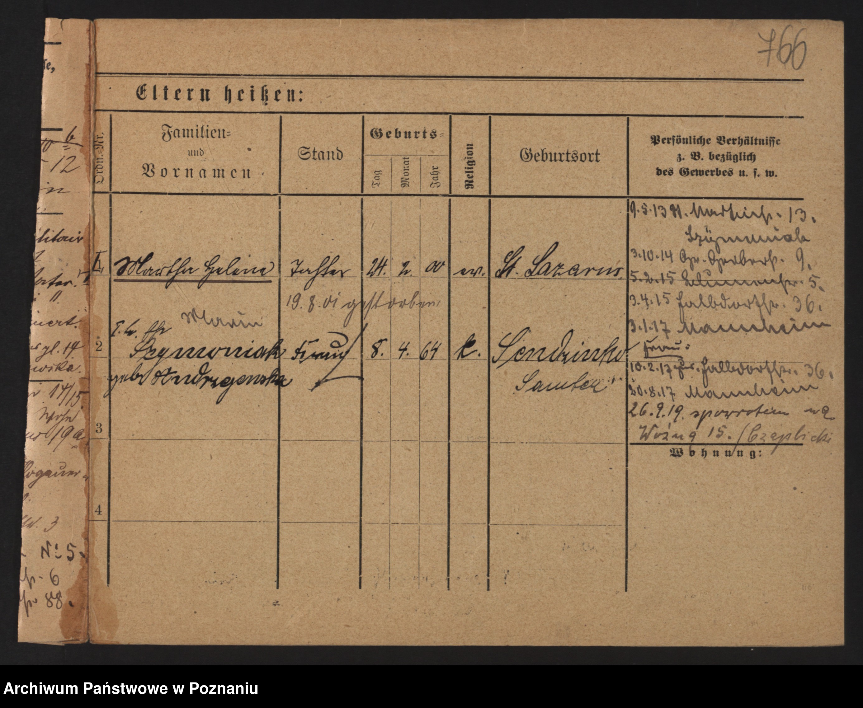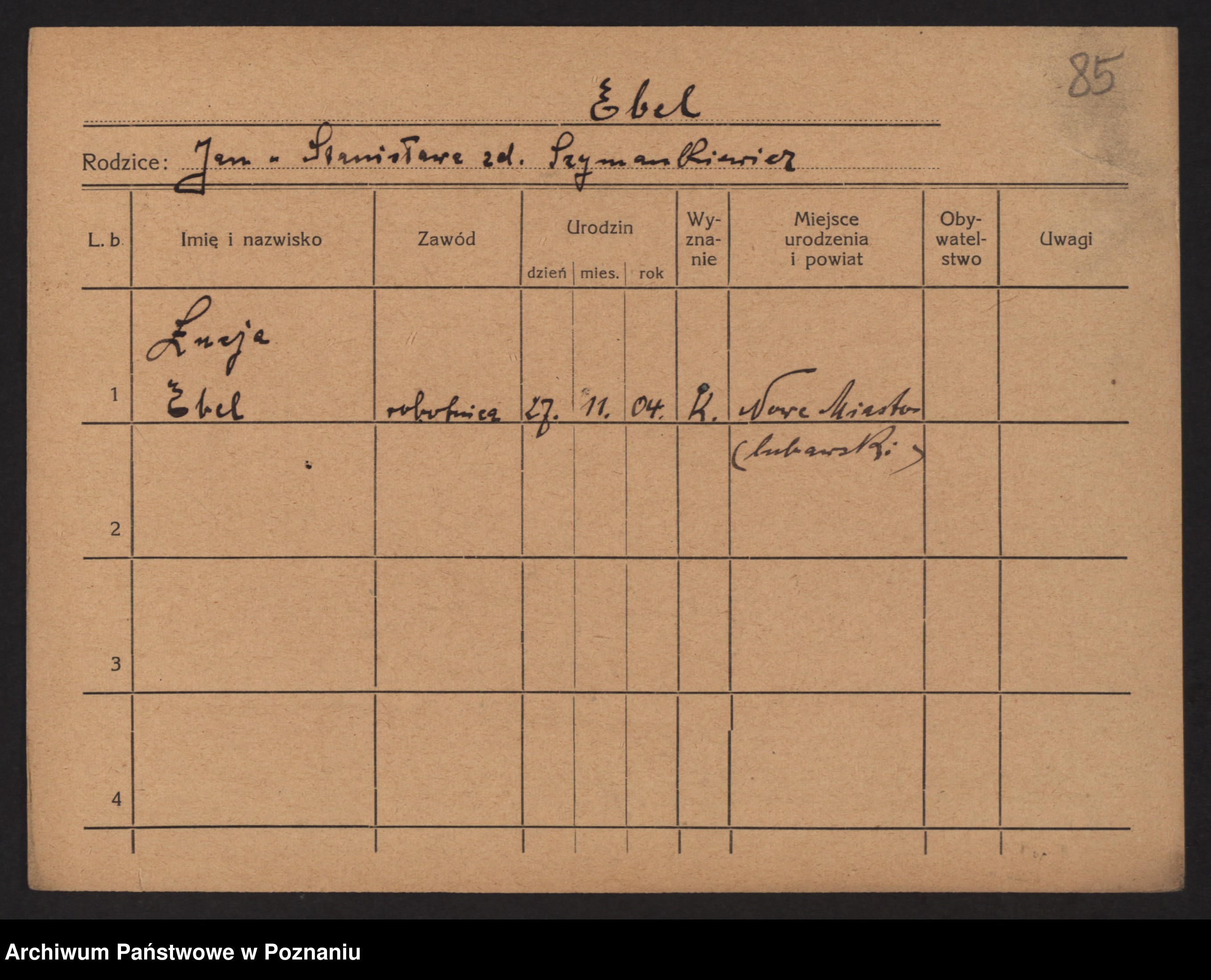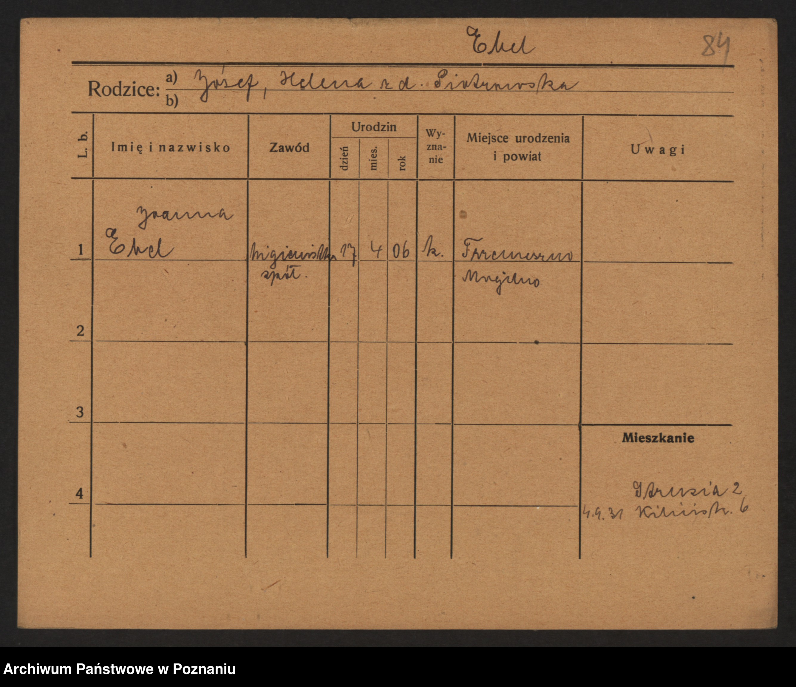 Podgląd karty osobowej dostępny jest po kliknięciu na nazwisko lub ikonkę karty. Można dokonywać powiększenia (ikony na górze) lub przechodzić między kolejnymi skanami (strzałki po bokach).