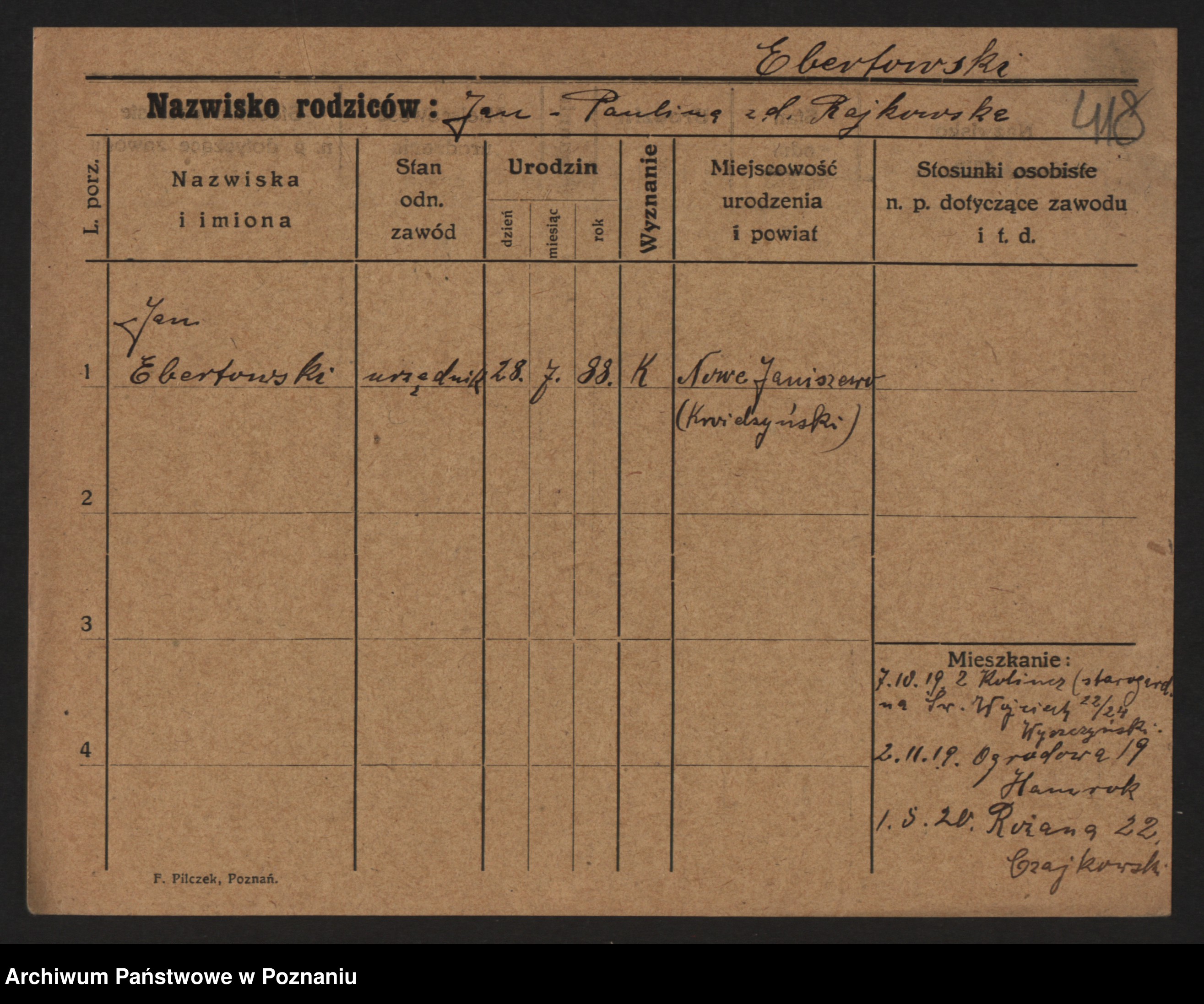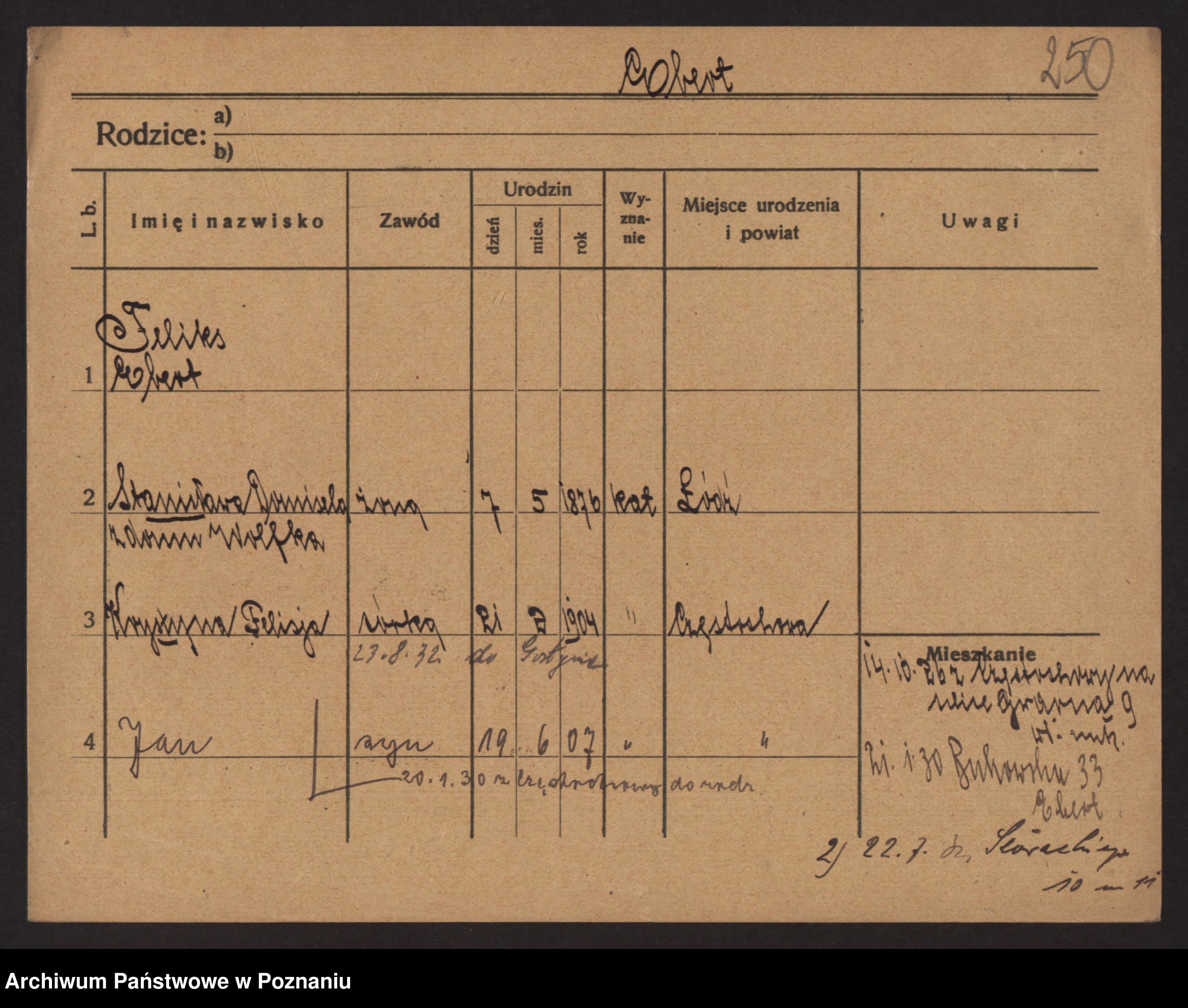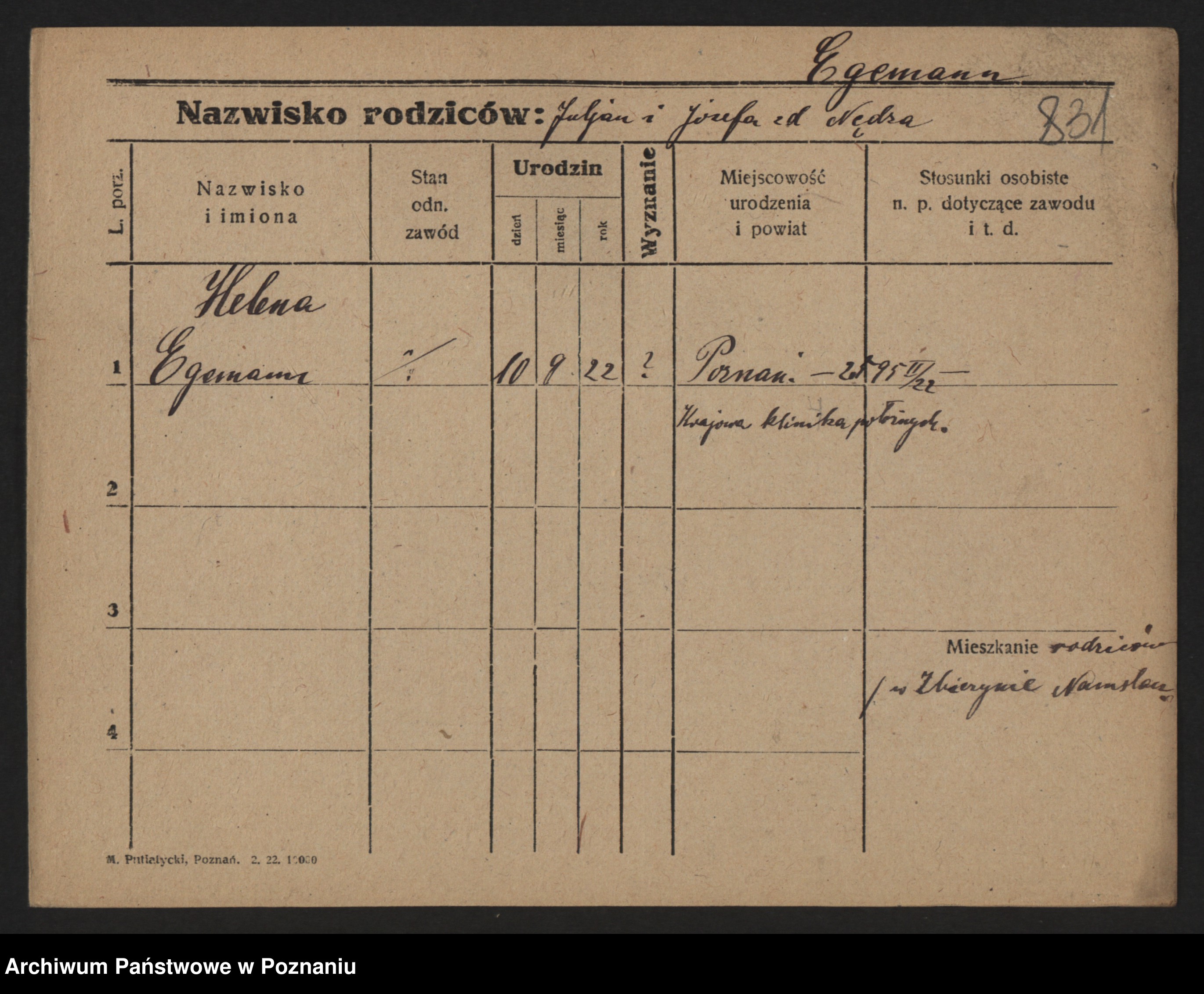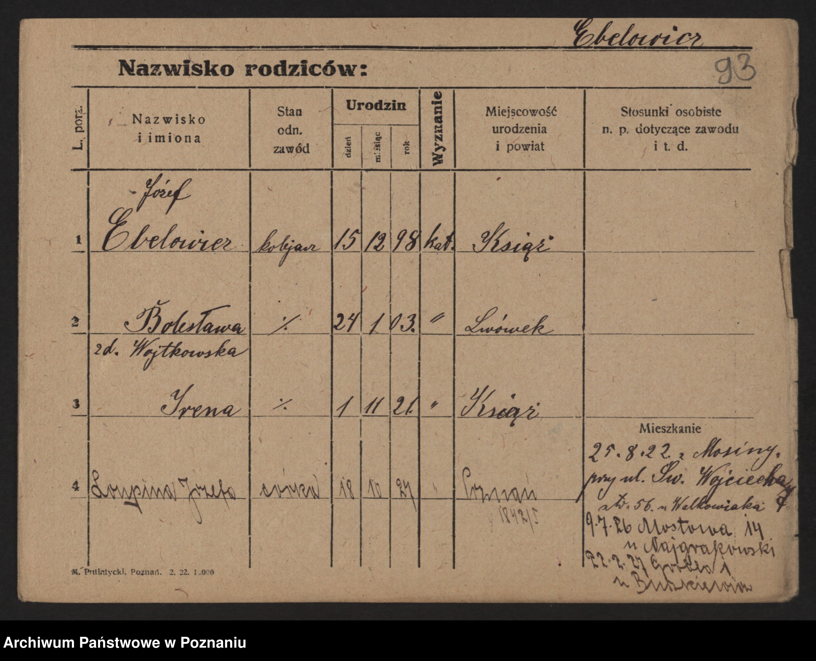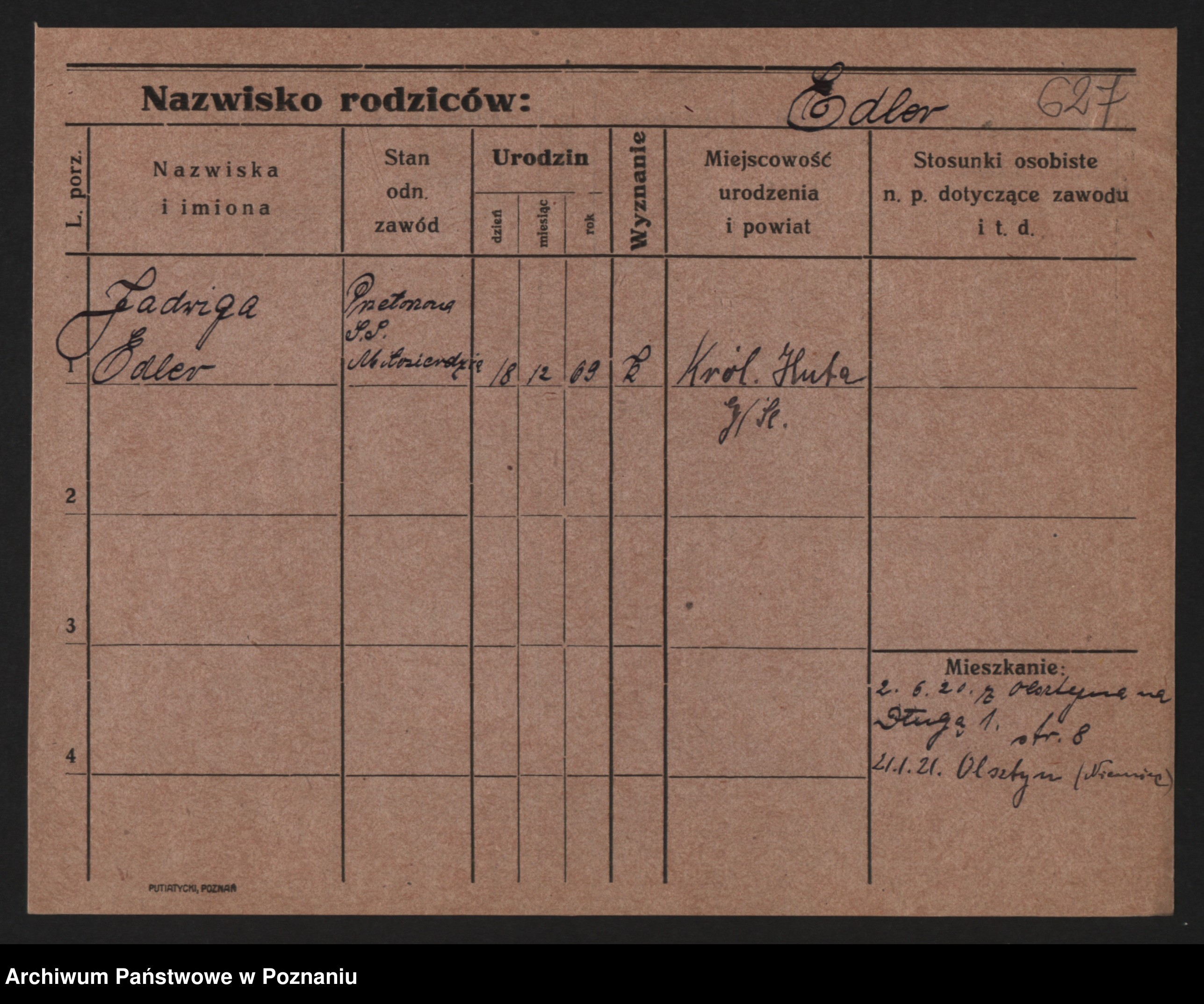 Podgląd karty osobowej dostępny jest po kliknięciu na nazwisko lub ikonkę karty. Można dokonywać powiększenia (ikony na górze) lub przechodzić między kolejnymi skanami (strzałki po bokach).