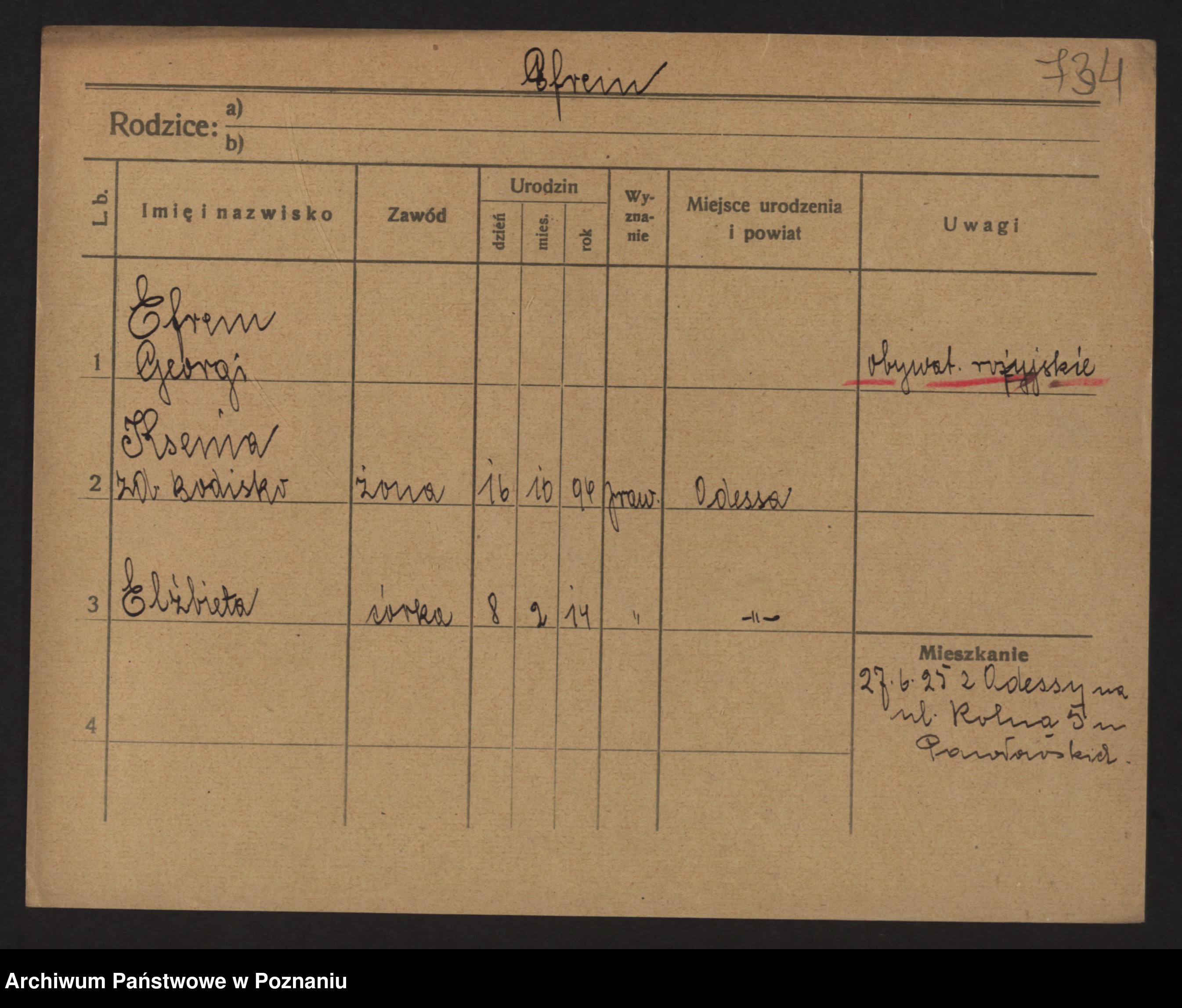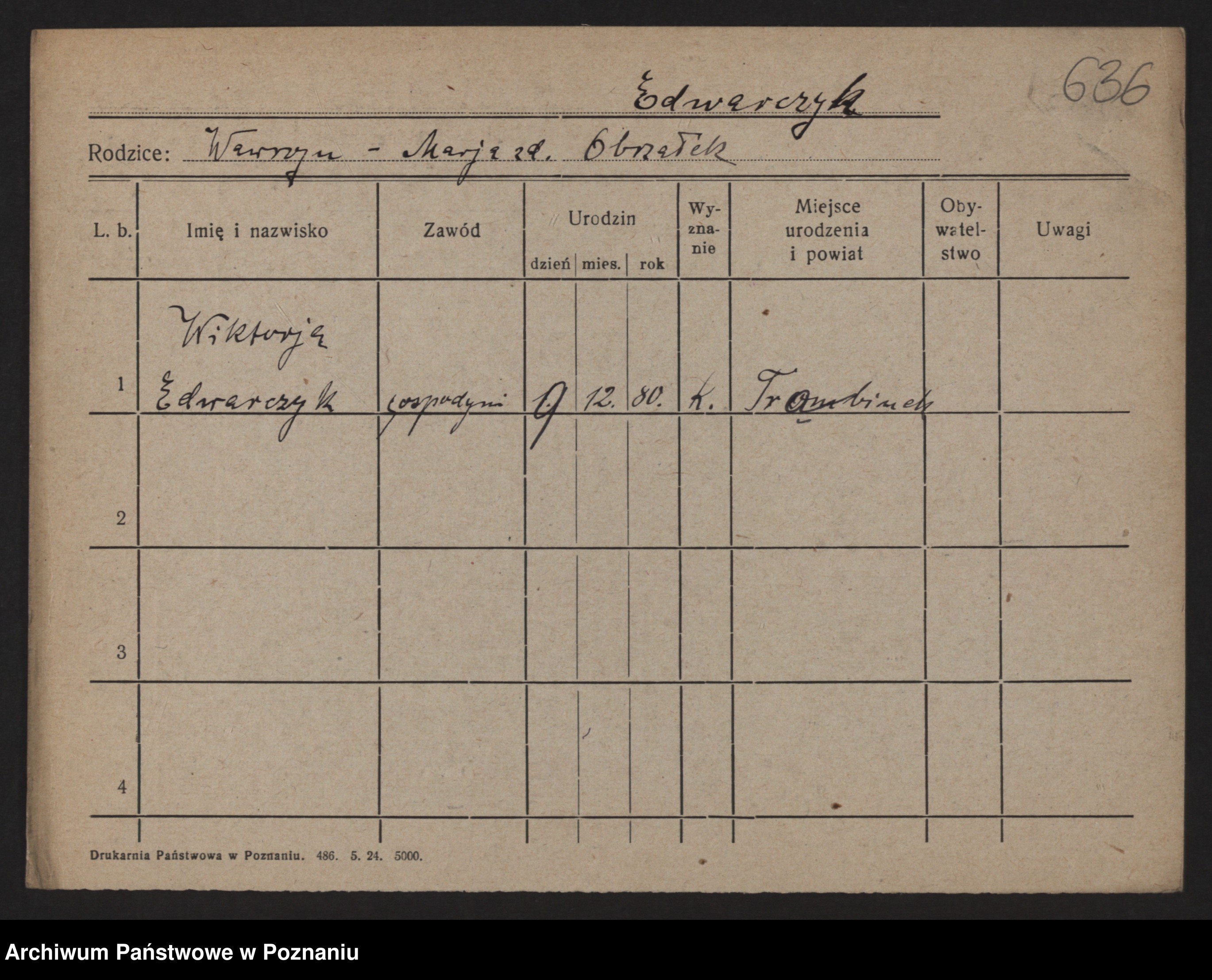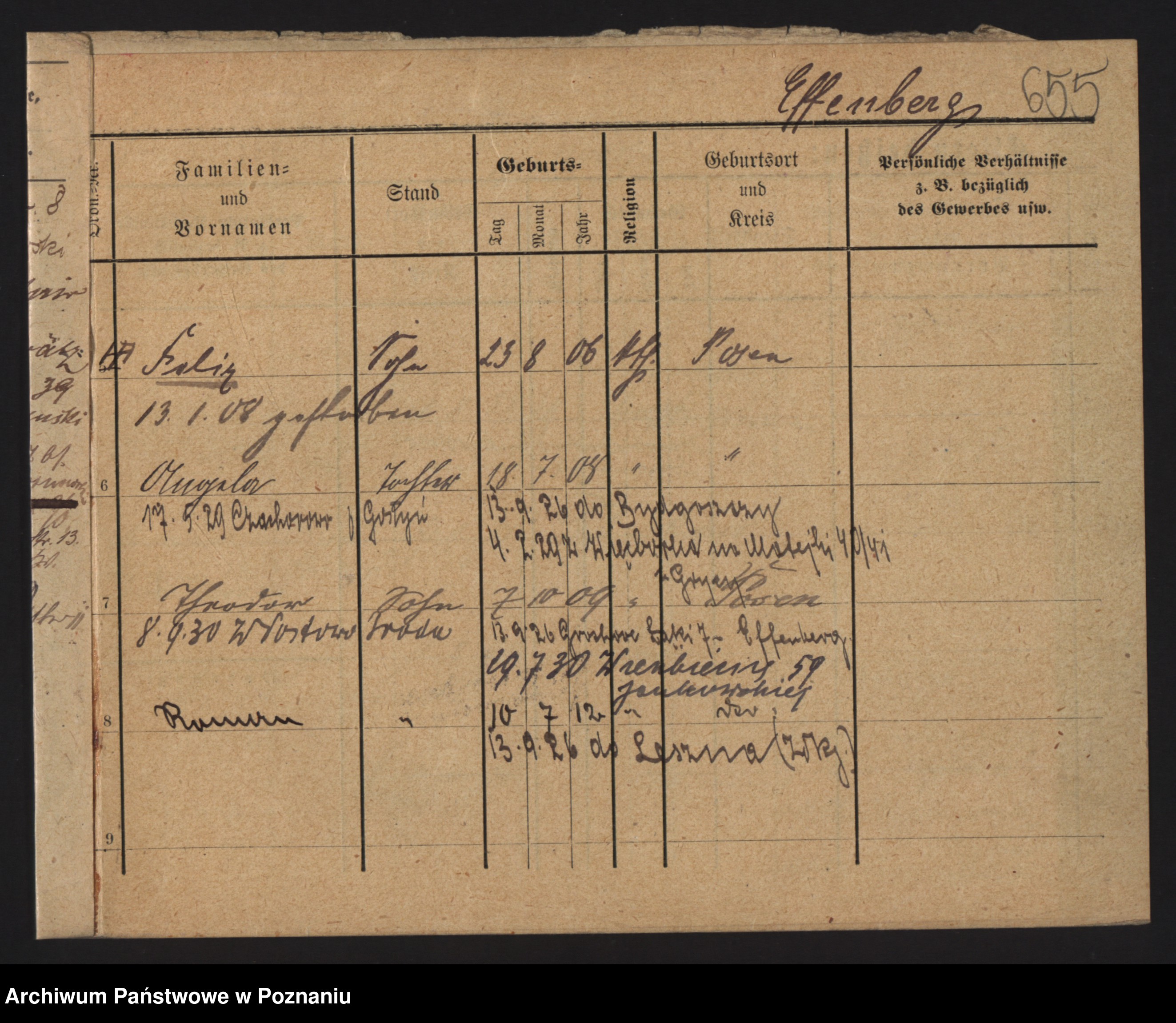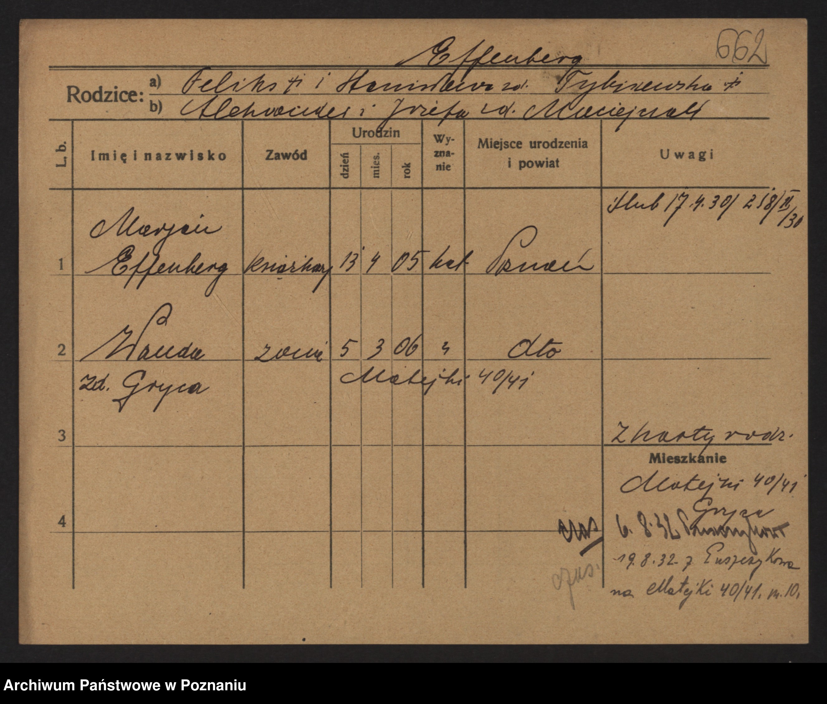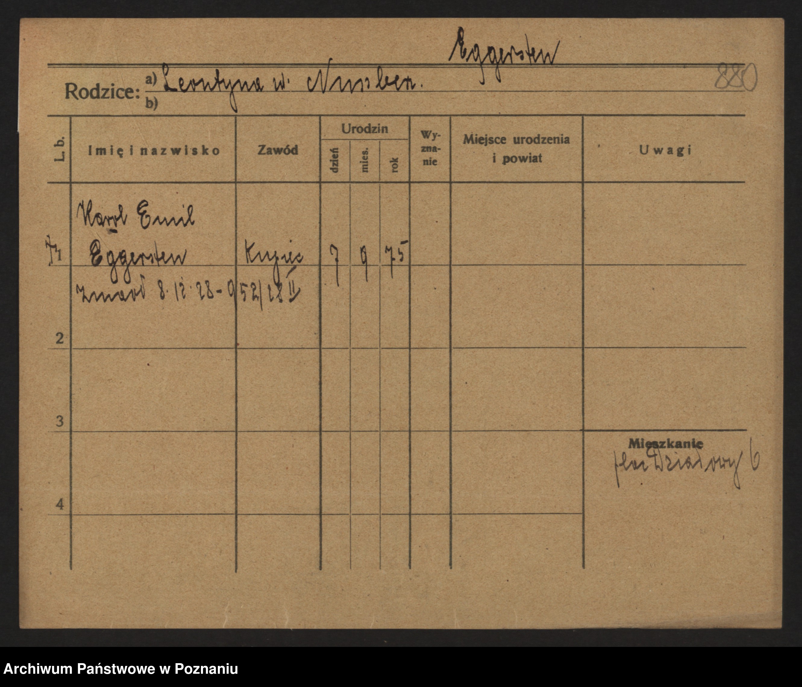 Podgląd karty osobowej dostępny jest po kliknięciu na nazwisko lub ikonkę karty. Można dokonywać powiększenia (ikony na górze) lub przechodzić między kolejnymi skanami (strzałki po bokach).
