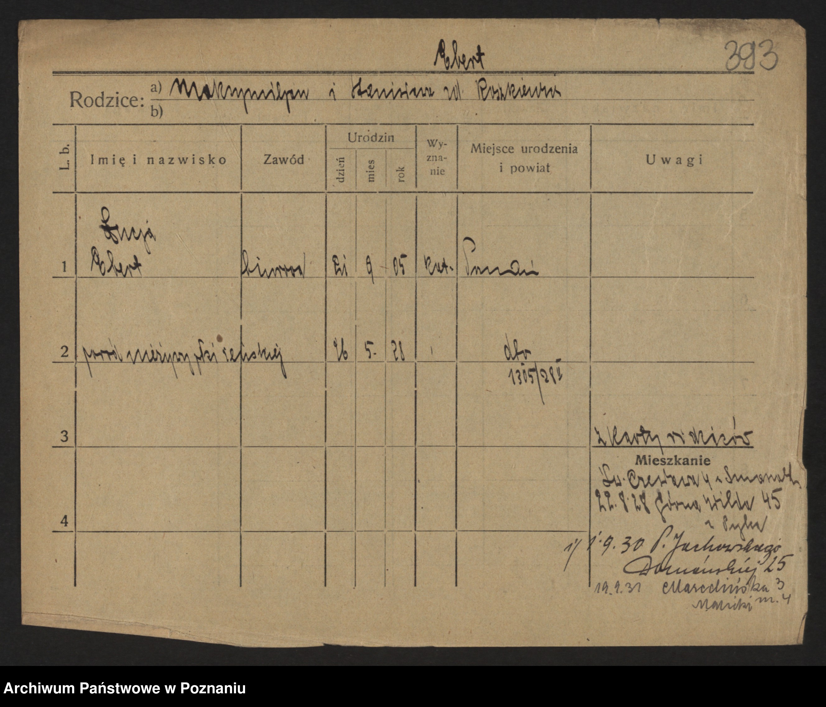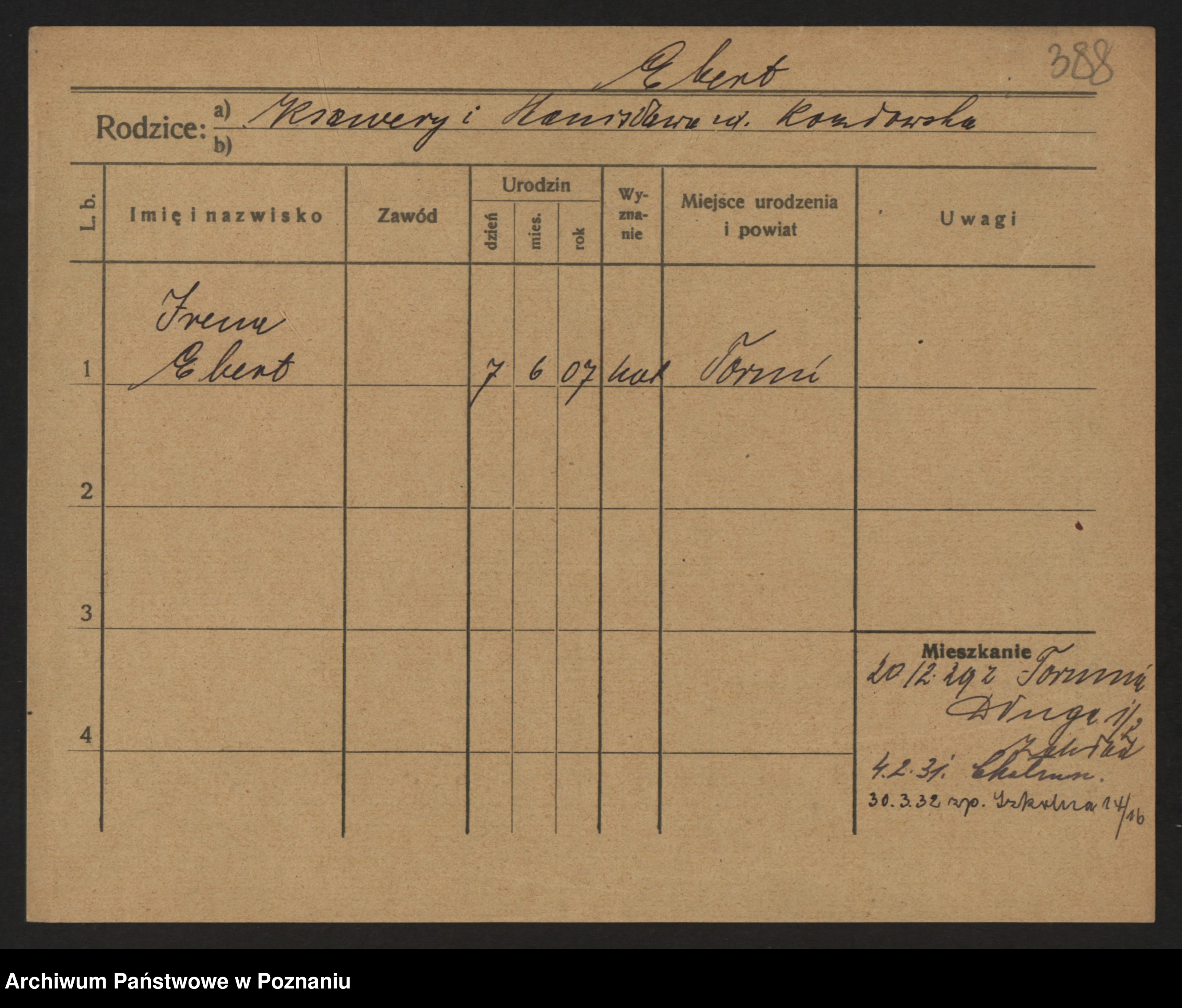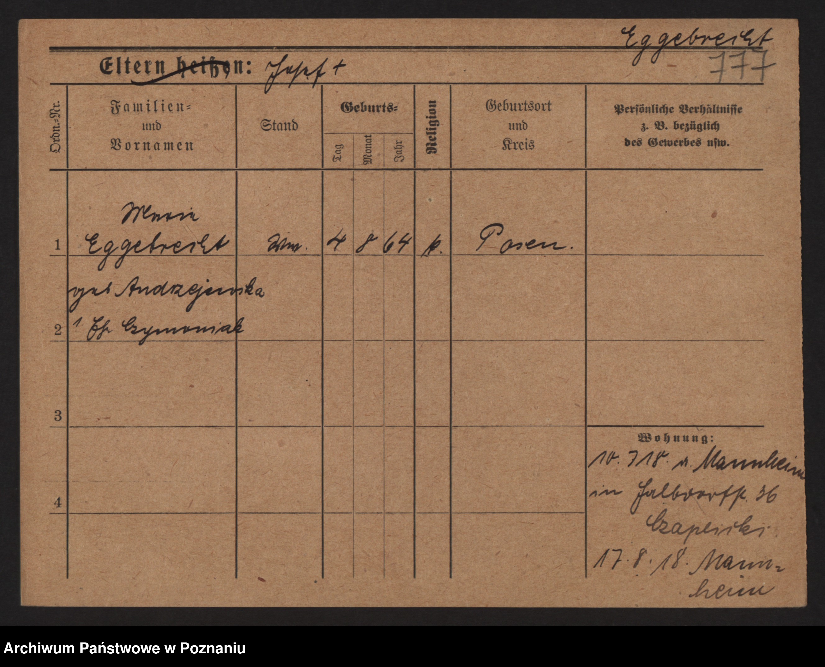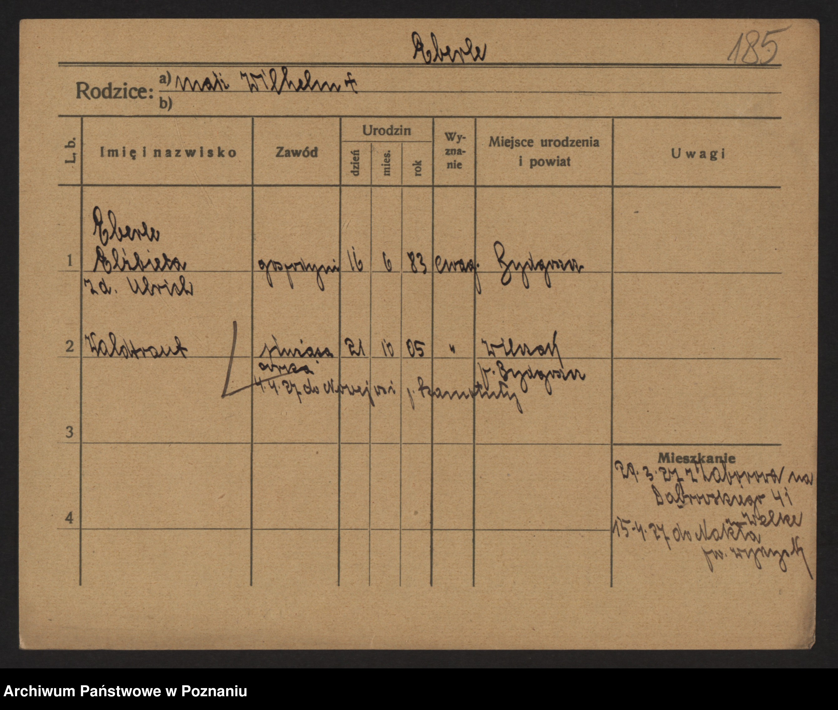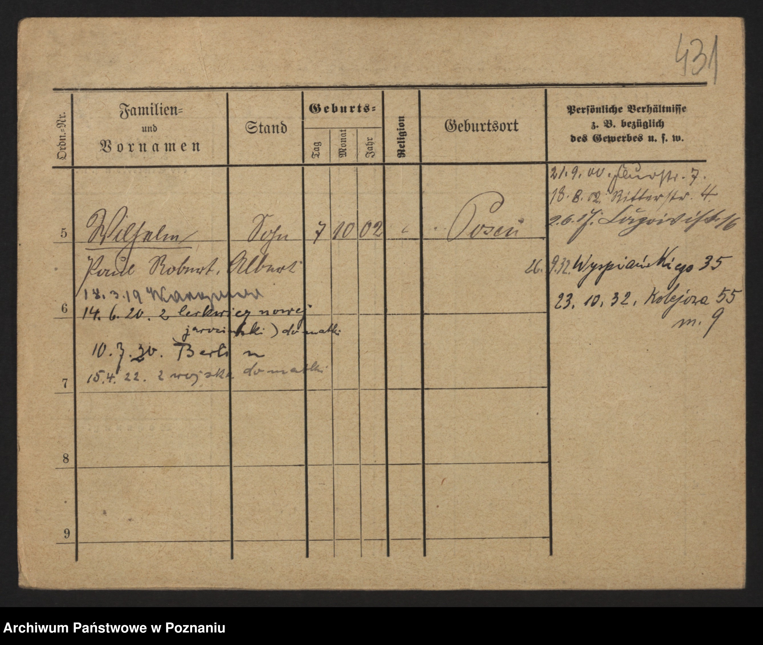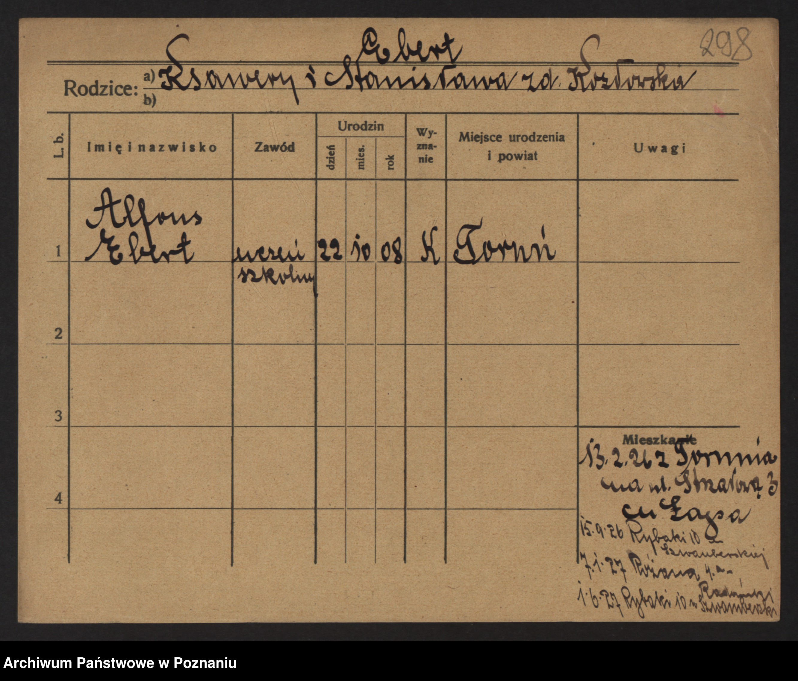 Podgląd karty osobowej dostępny jest po kliknięciu na nazwisko lub ikonkę karty. Można dokonywać powiększenia (ikony na górze) lub przechodzić między kolejnymi skanami (strzałki po bokach).