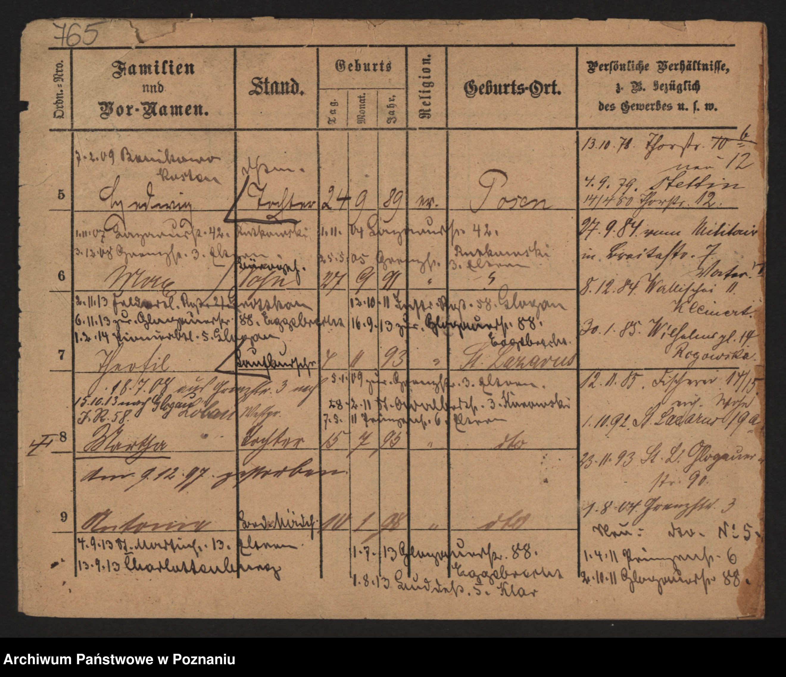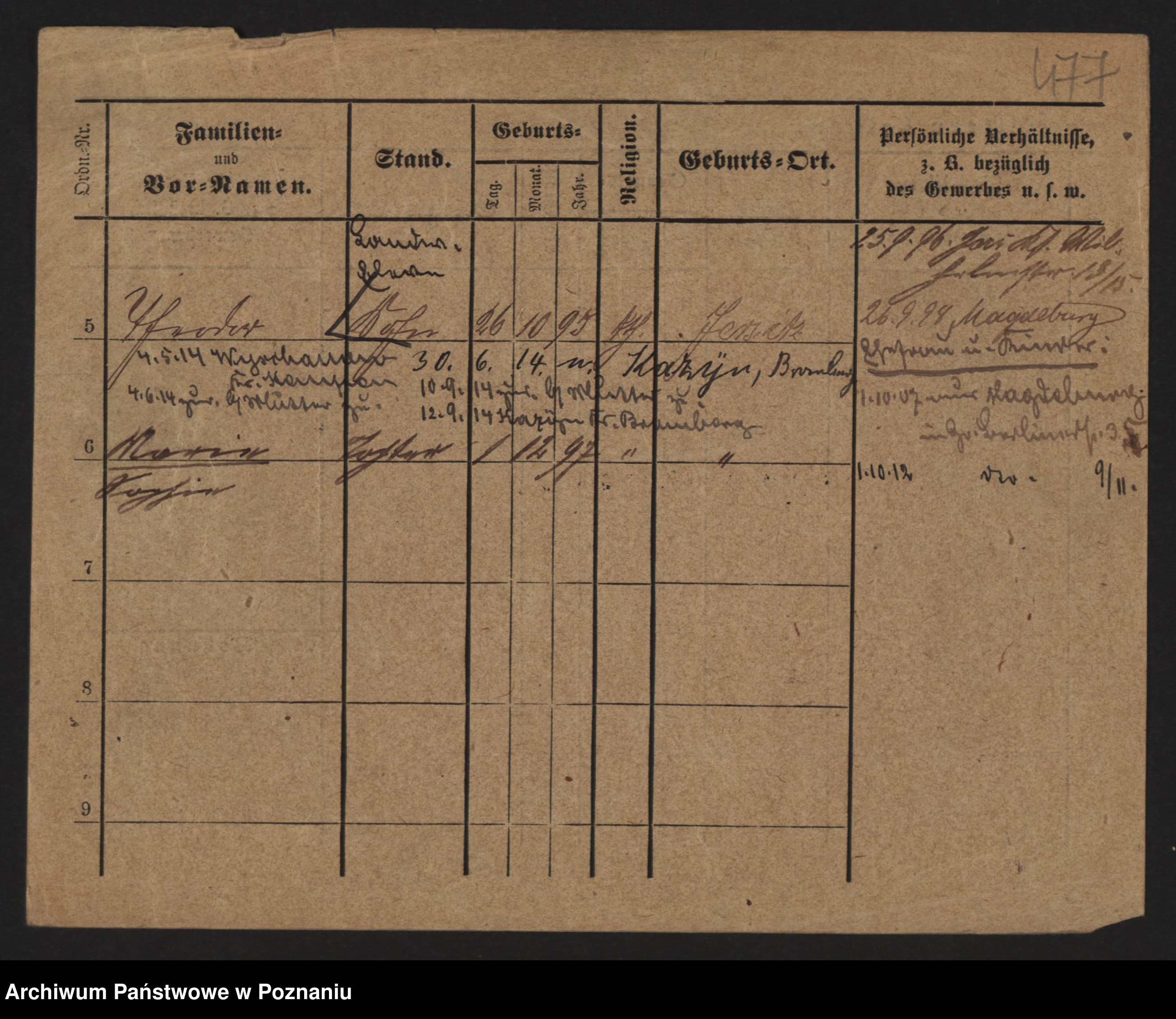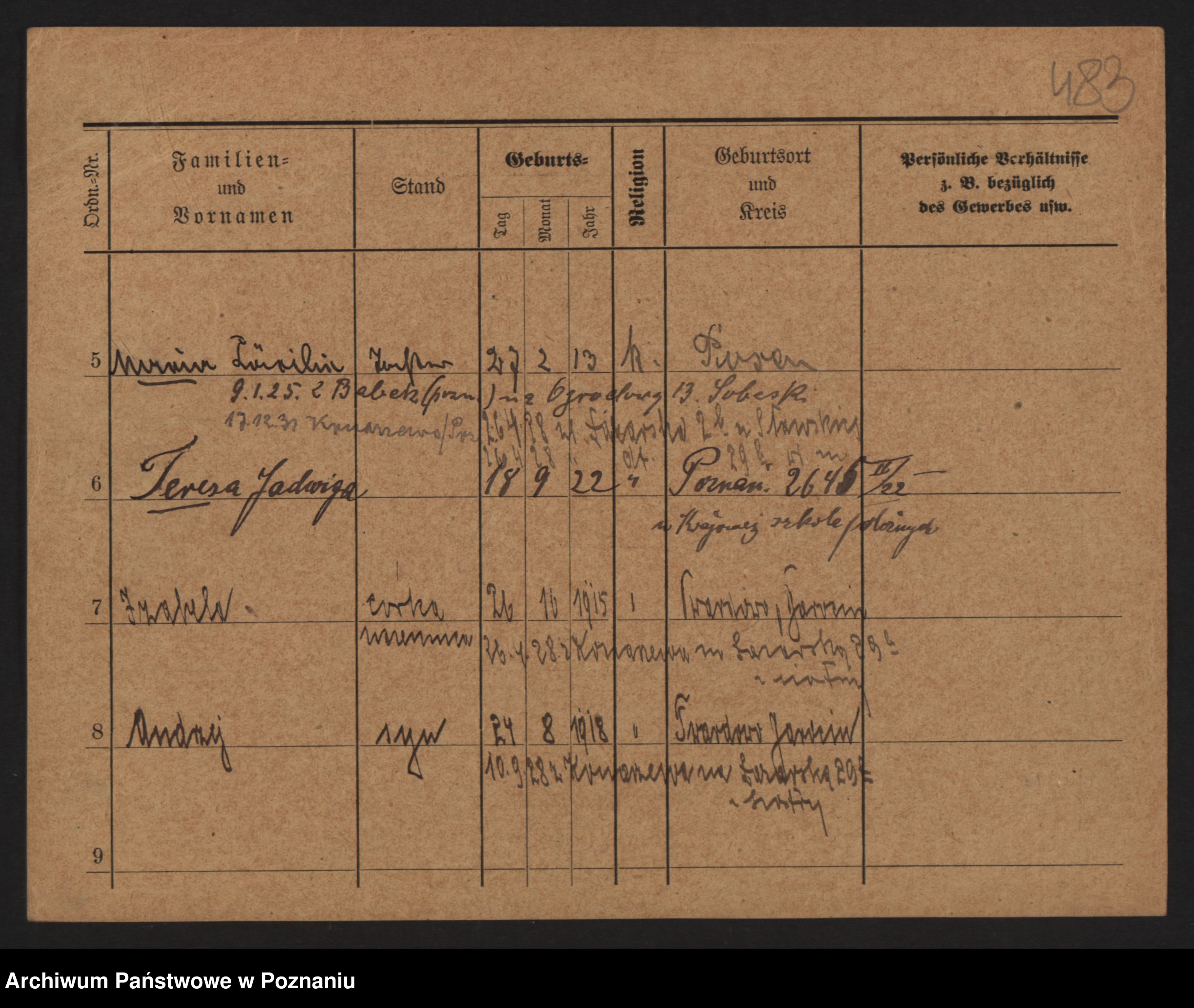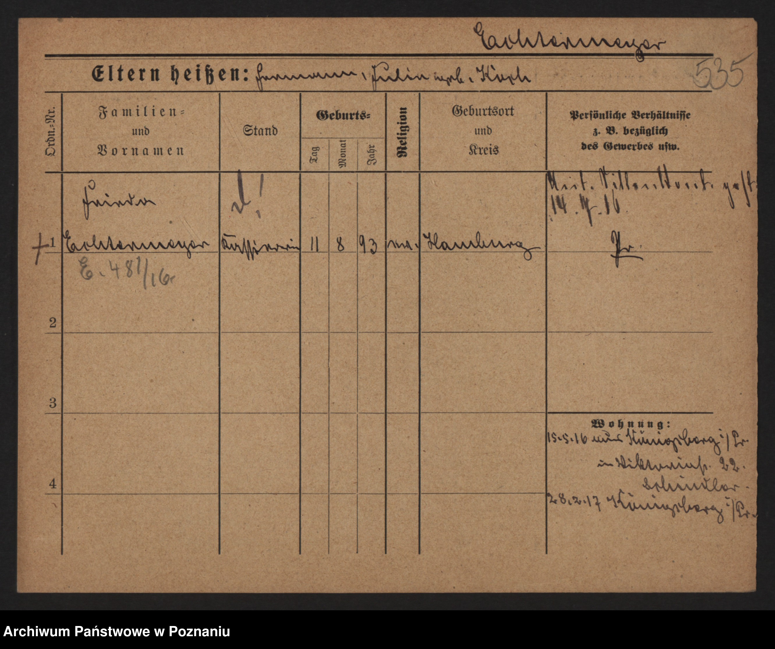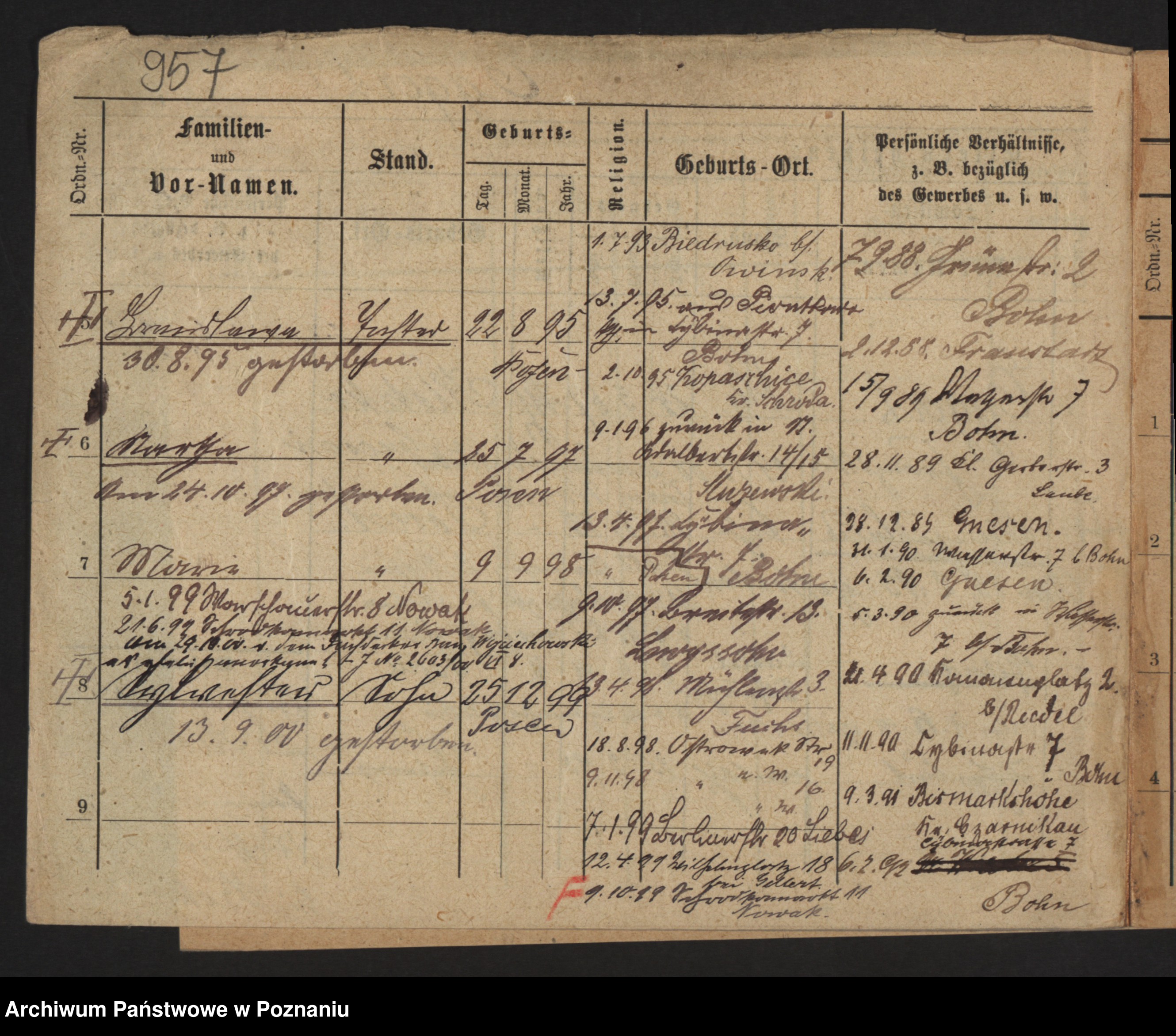 Podgląd karty osobowej dostępny jest po kliknięciu na nazwisko lub ikonkę karty. Można dokonywać powiększenia (ikony na górze) lub przechodzić między kolejnymi skanami (strzałki po bokach).