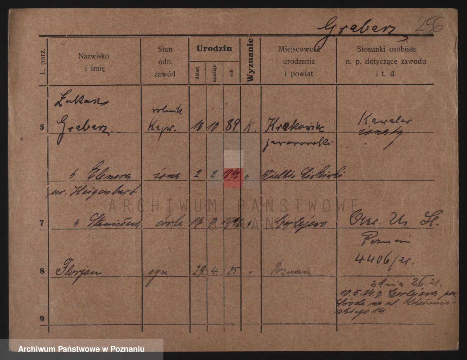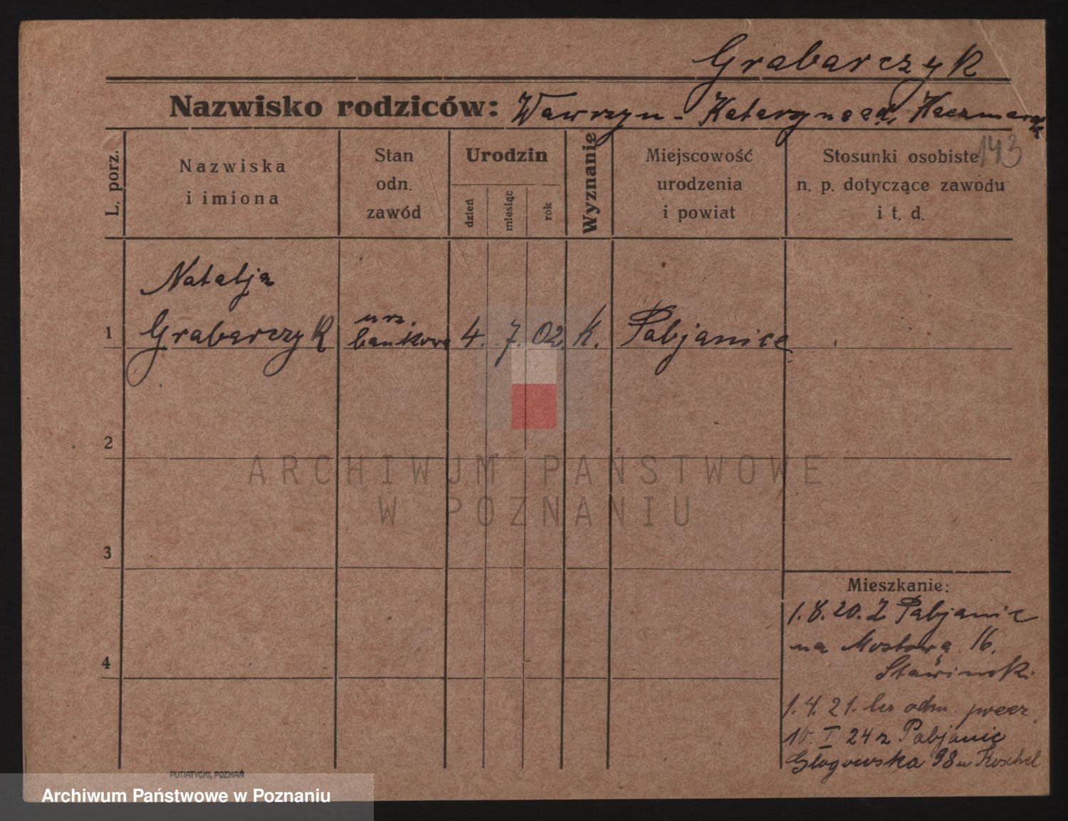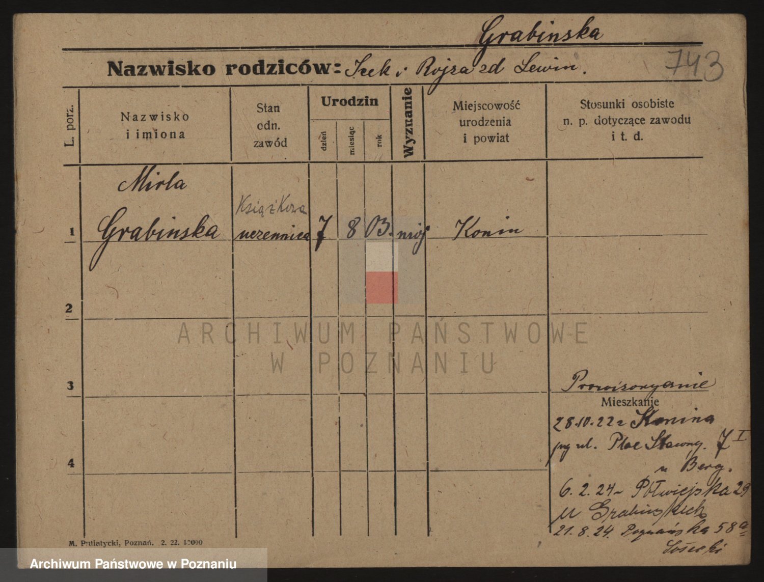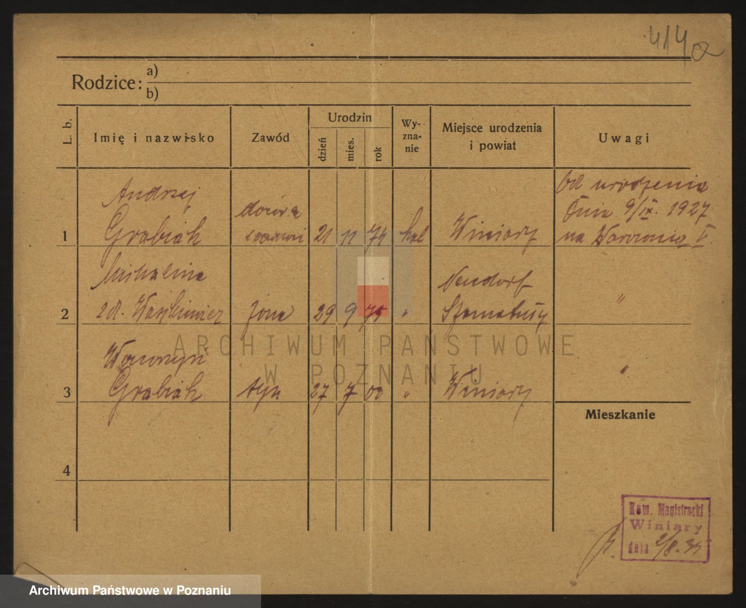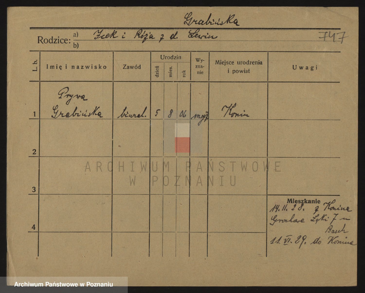 Podgląd karty osobowej dostępny jest po kliknięciu na nazwisko lub ikonkę karty. Można dokonywać powiększenia (ikony na górze) lub przechodzić między kolejnymi skanami (strzałki po bokach).