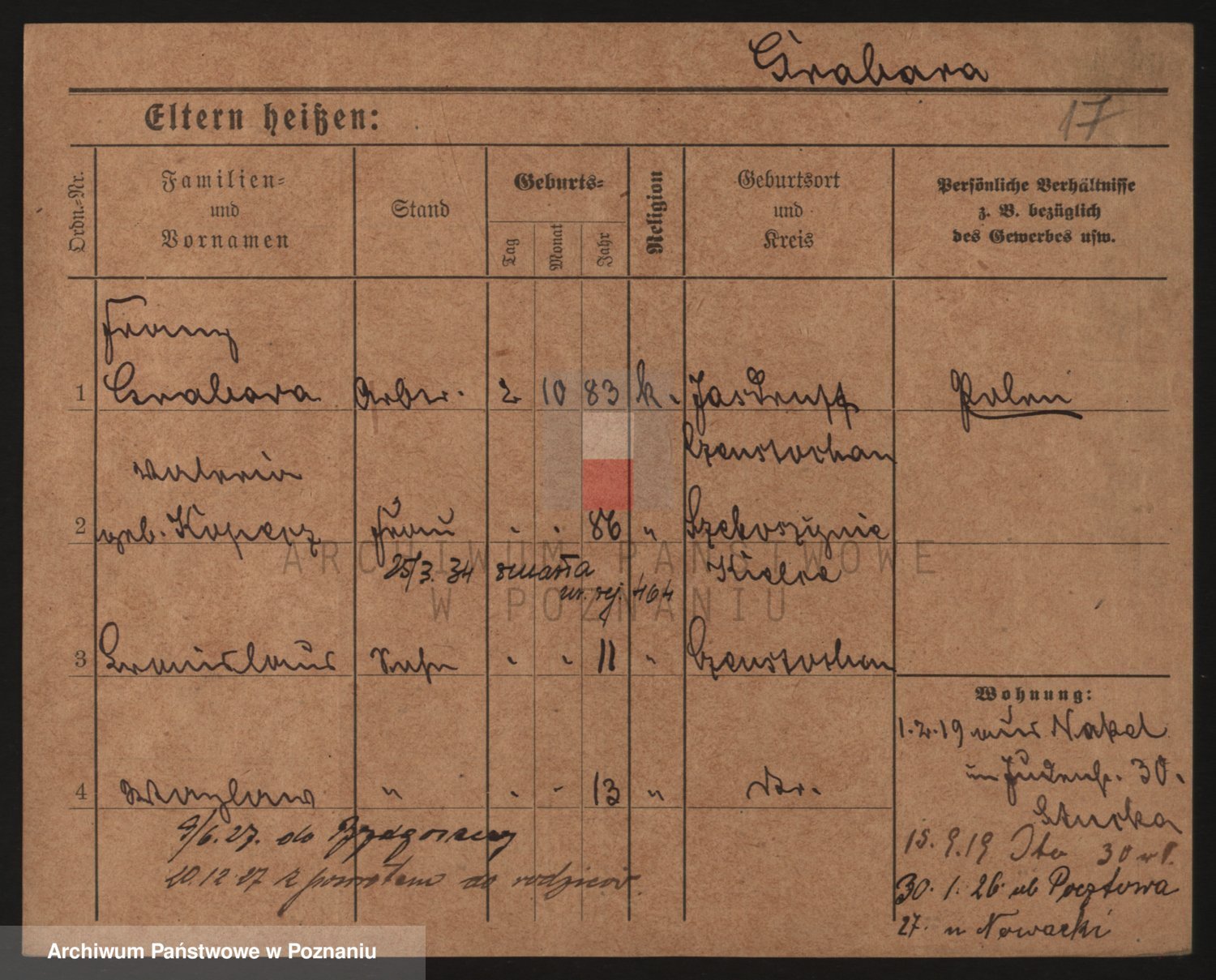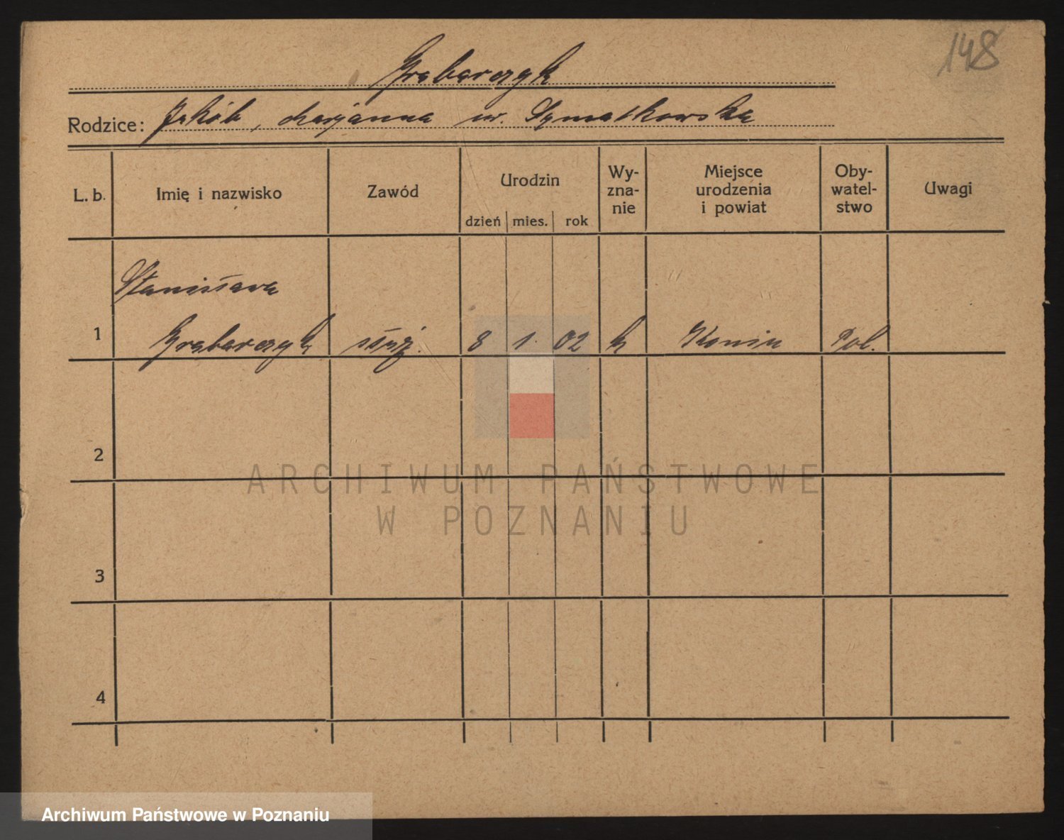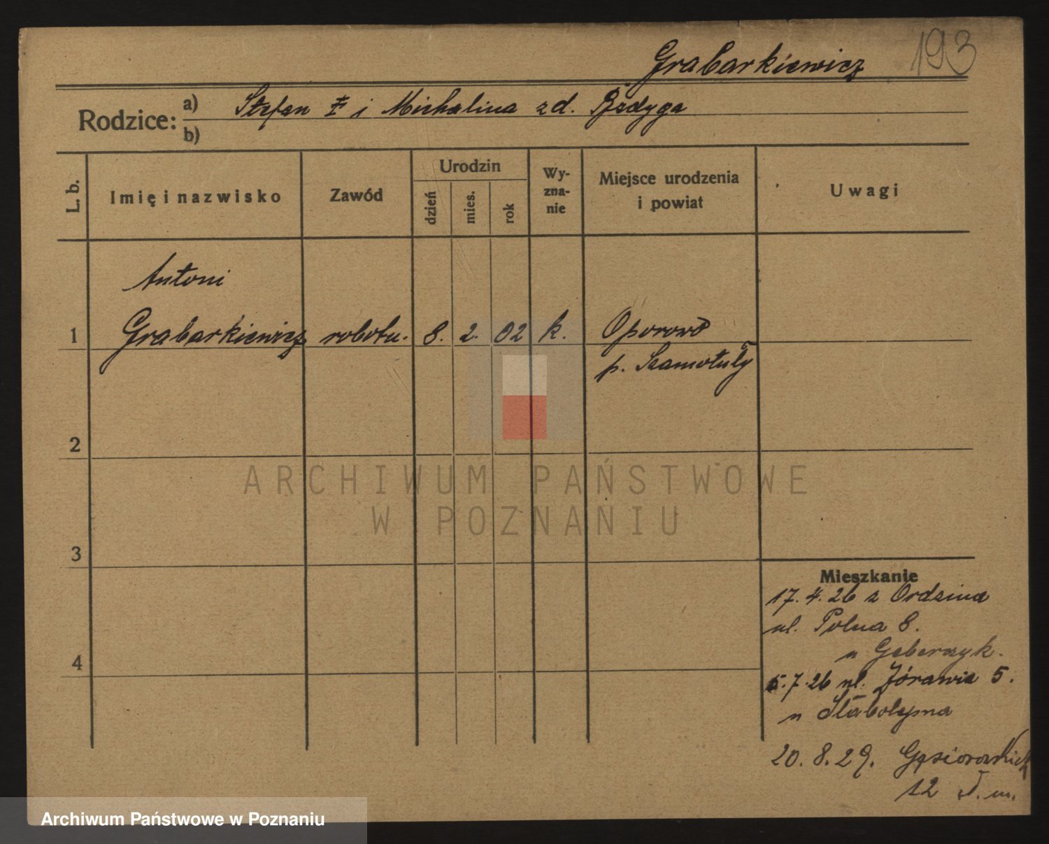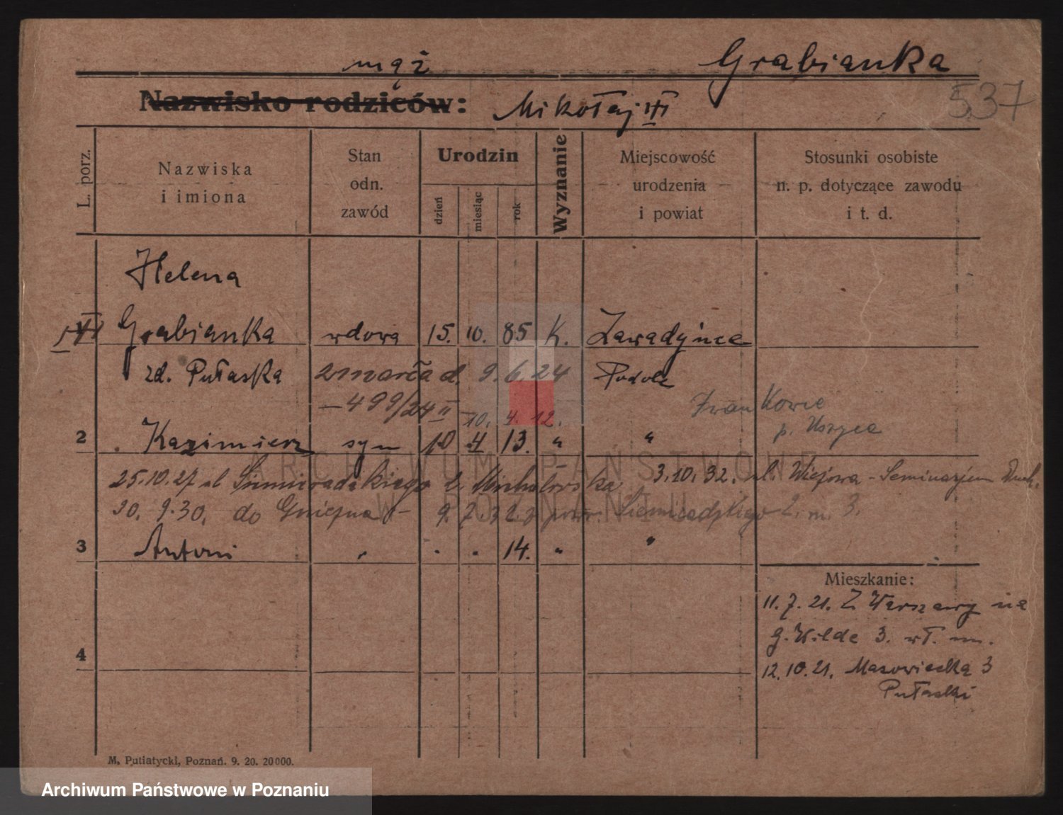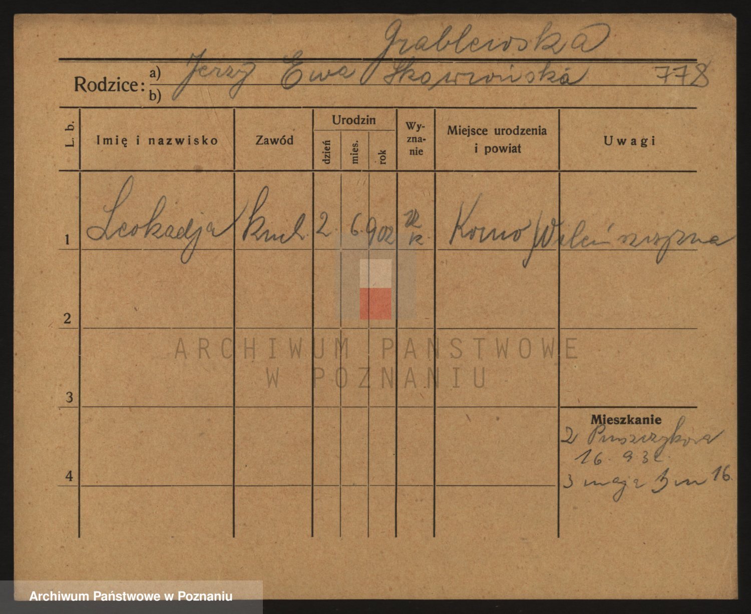 Podgląd karty osobowej dostępny jest po kliknięciu na nazwisko lub ikonkę karty. Można dokonywać powiększenia (ikony na górze) lub przechodzić między kolejnymi skanami (strzałki po bokach).