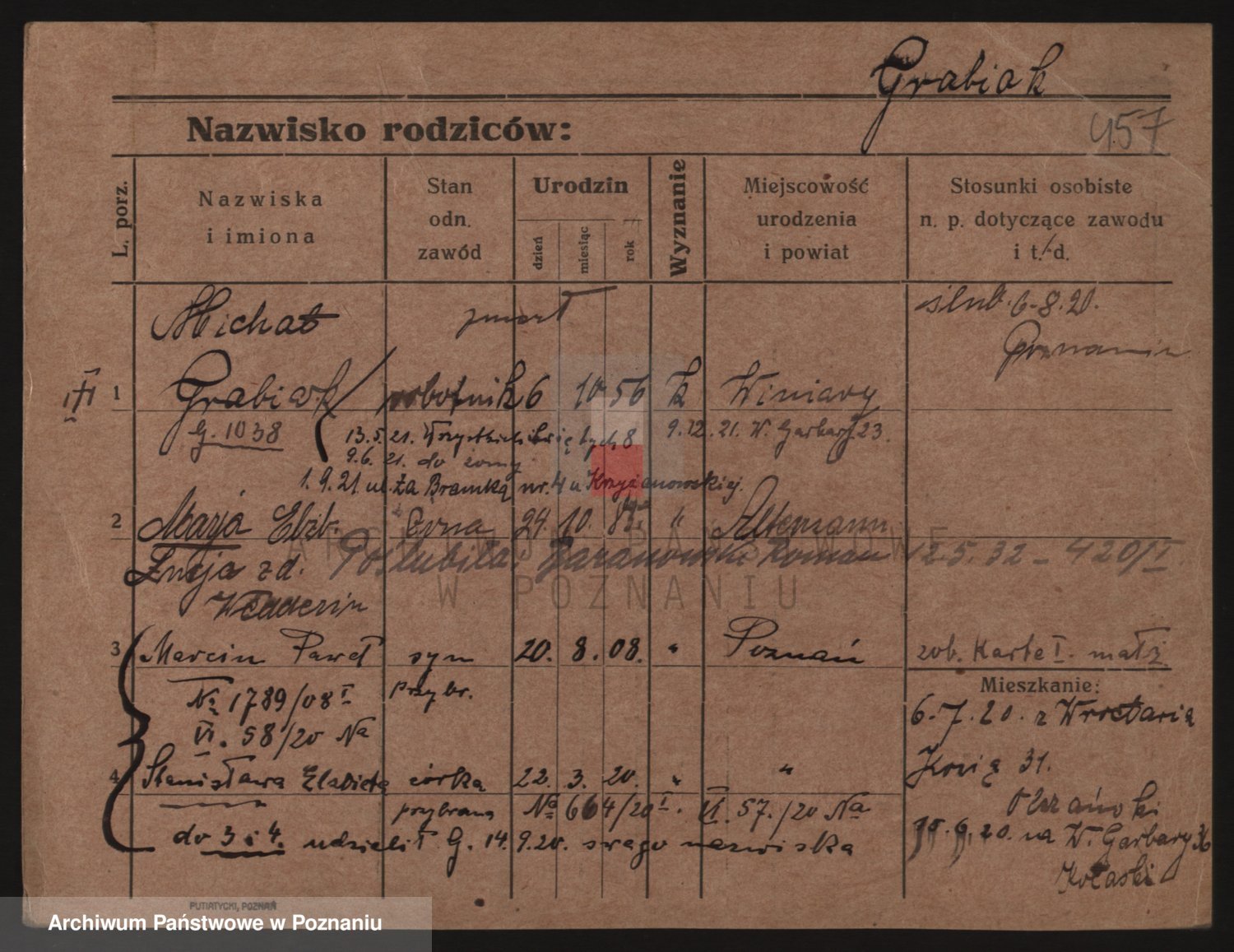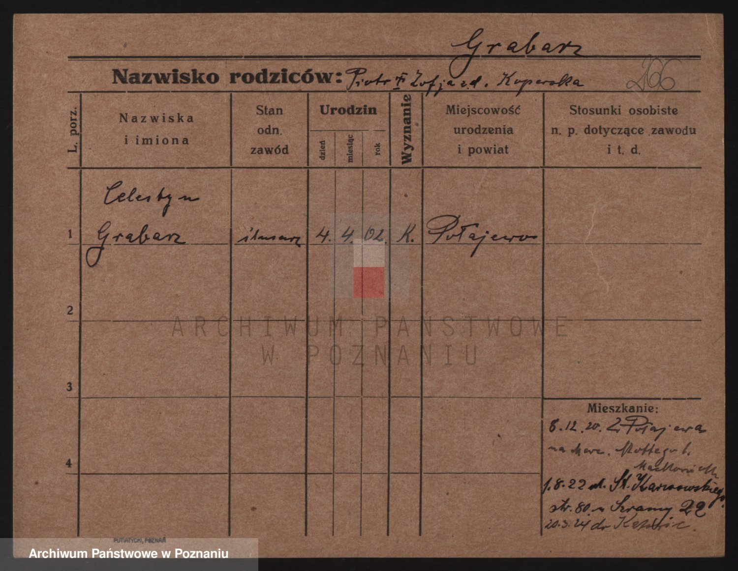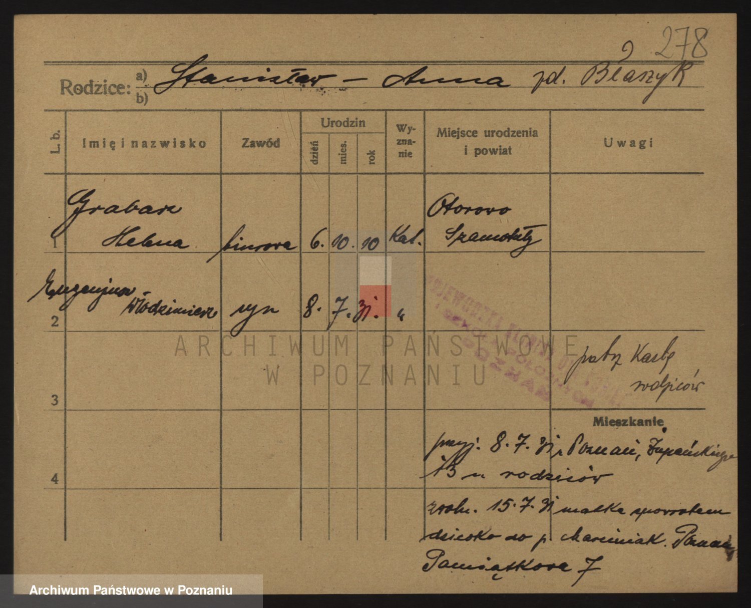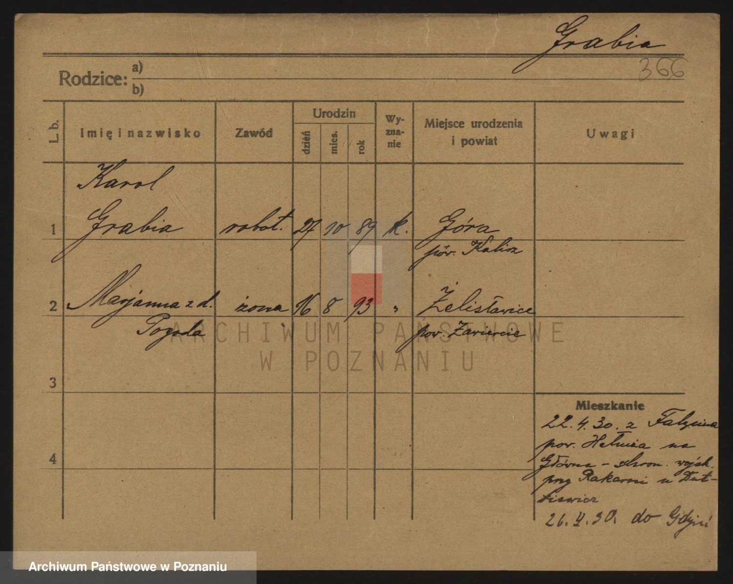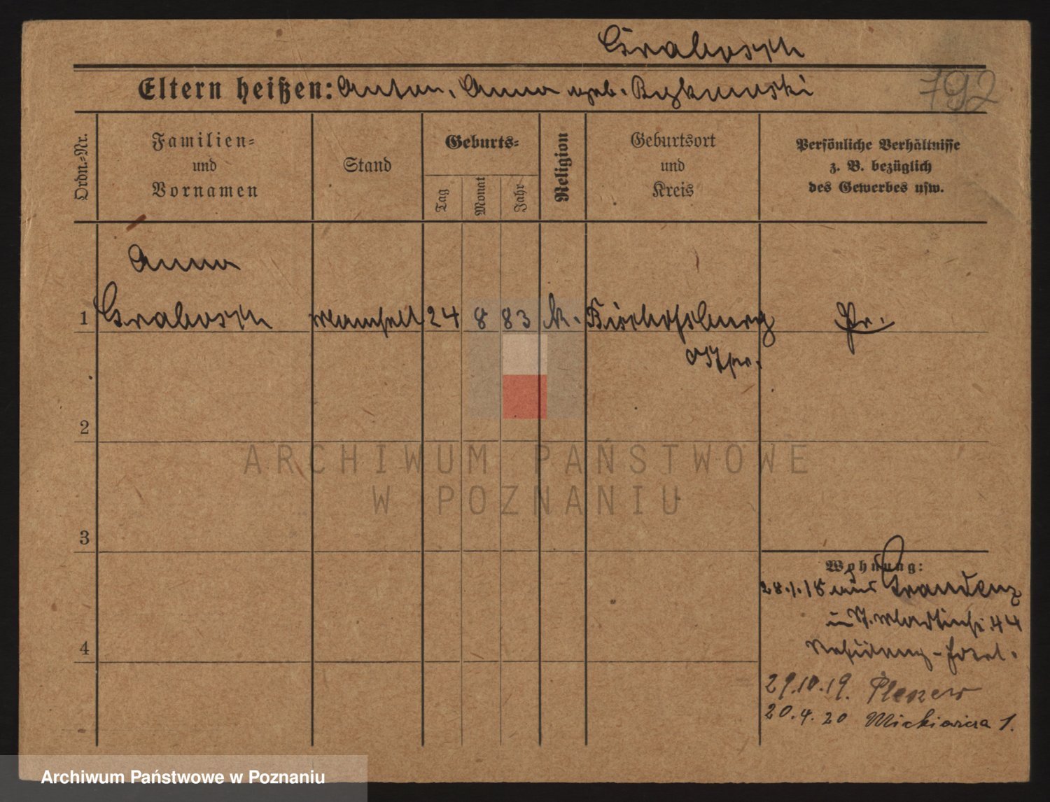 Podgląd karty osobowej dostępny jest po kliknięciu na nazwisko lub ikonkę karty. Można dokonywać powiększenia (ikony na górze) lub przechodzić między kolejnymi skanami (strzałki po bokach).
