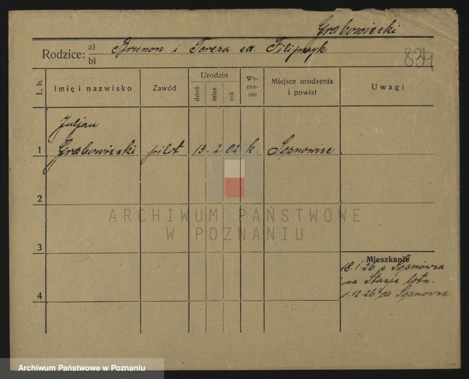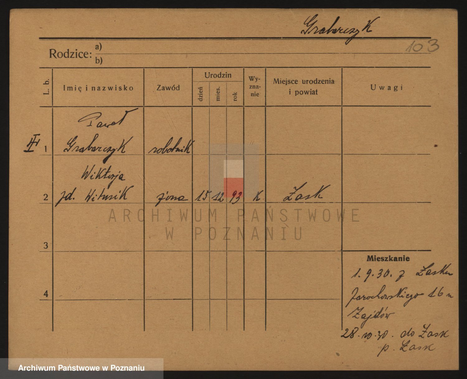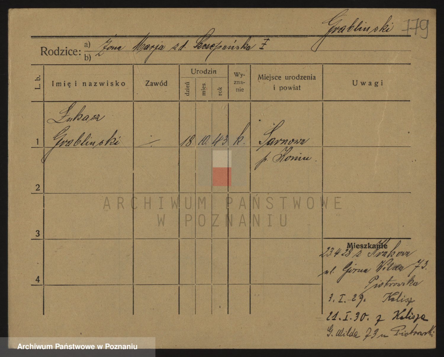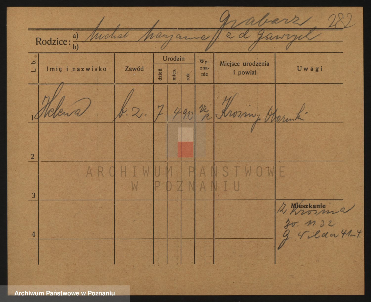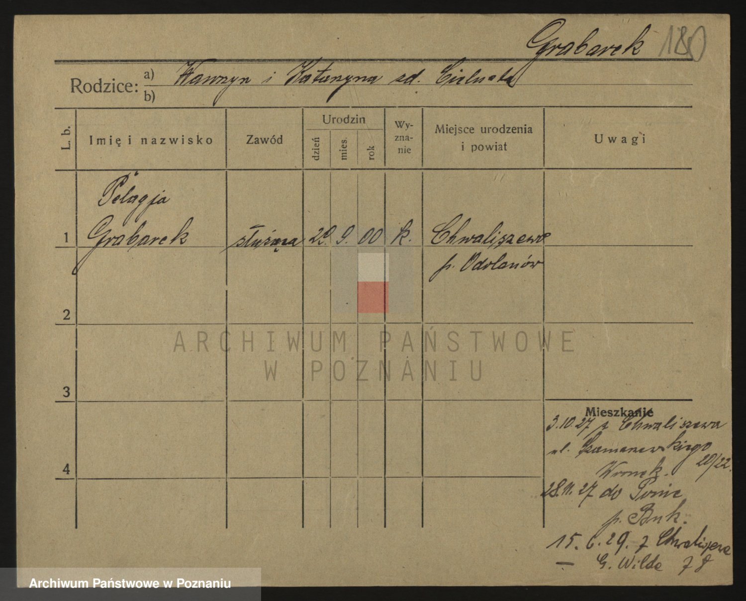 Podgląd karty osobowej dostępny jest po kliknięciu na nazwisko lub ikonkę karty. Można dokonywać powiększenia (ikony na górze) lub przechodzić między kolejnymi skanami (strzałki po bokach).