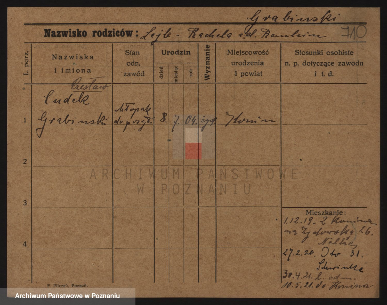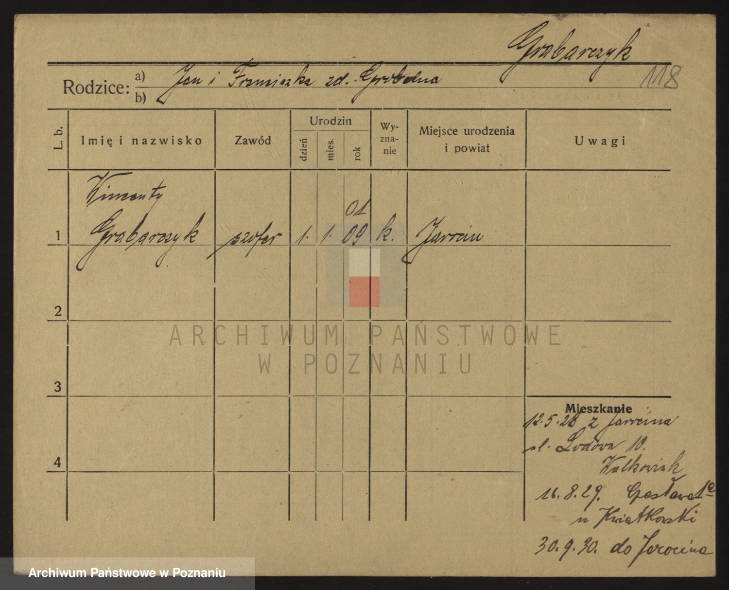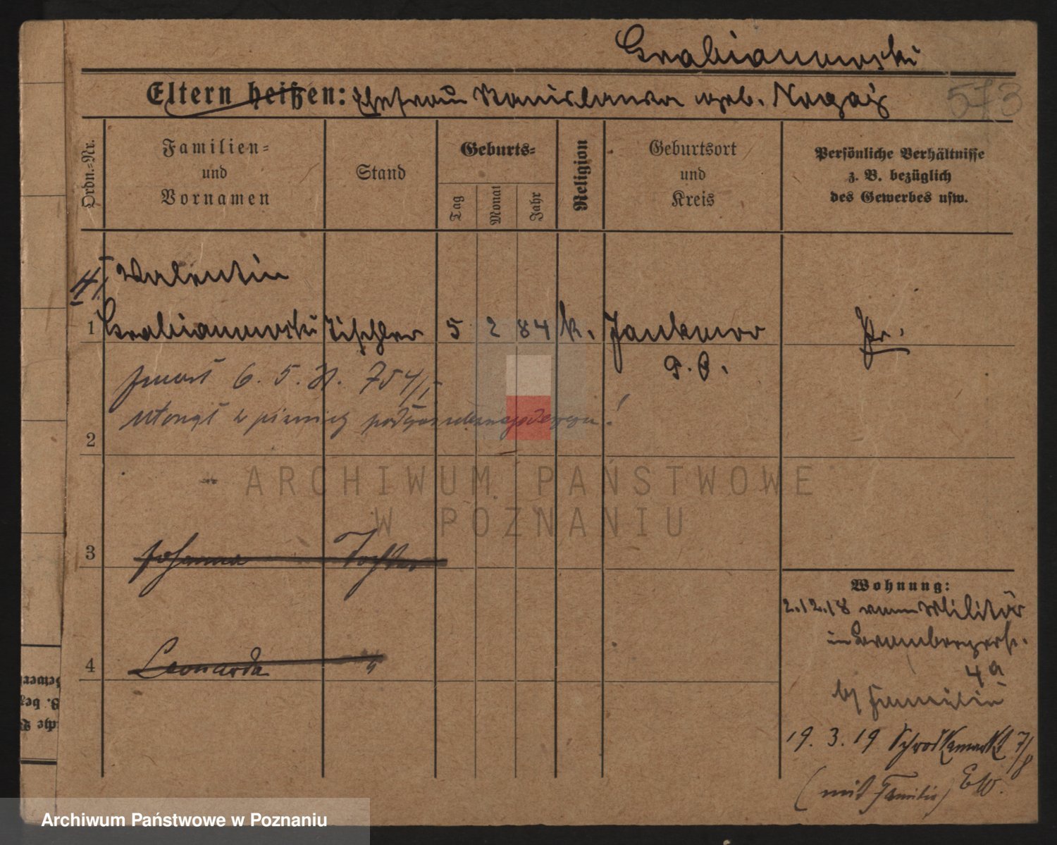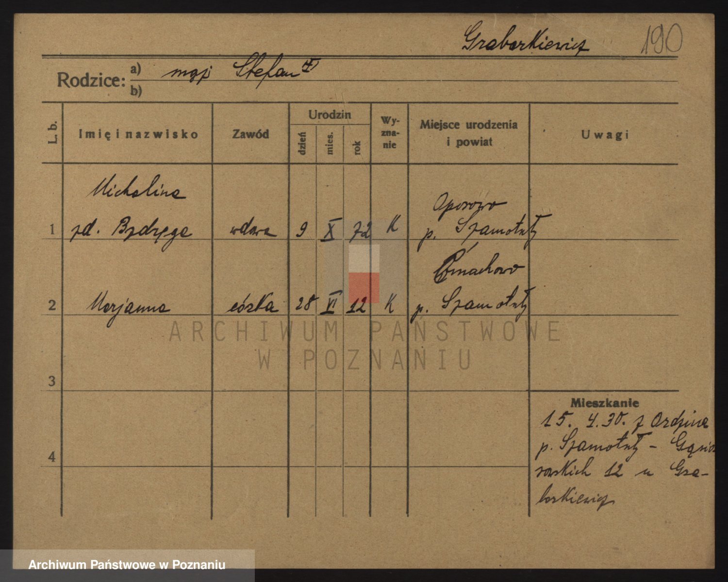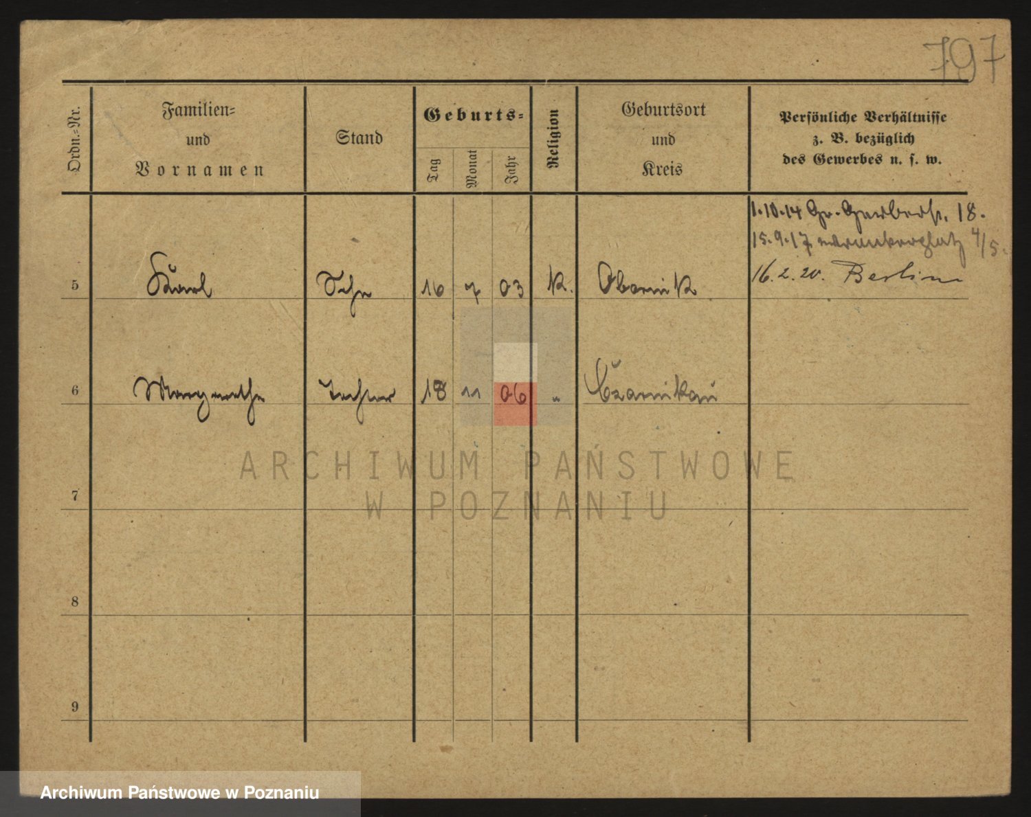 Podgląd karty osobowej dostępny jest po kliknięciu na nazwisko lub ikonkę karty. Można dokonywać powiększenia (ikony na górze) lub przechodzić między kolejnymi skanami (strzałki po bokach).
