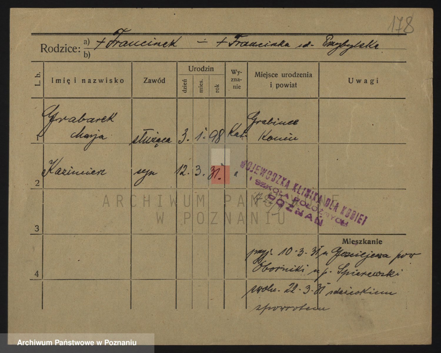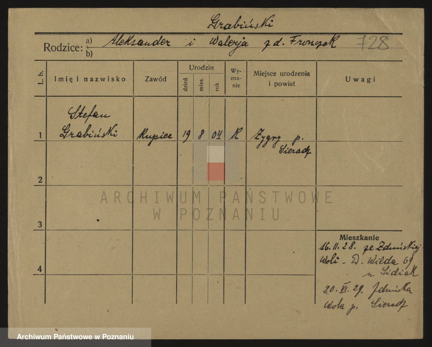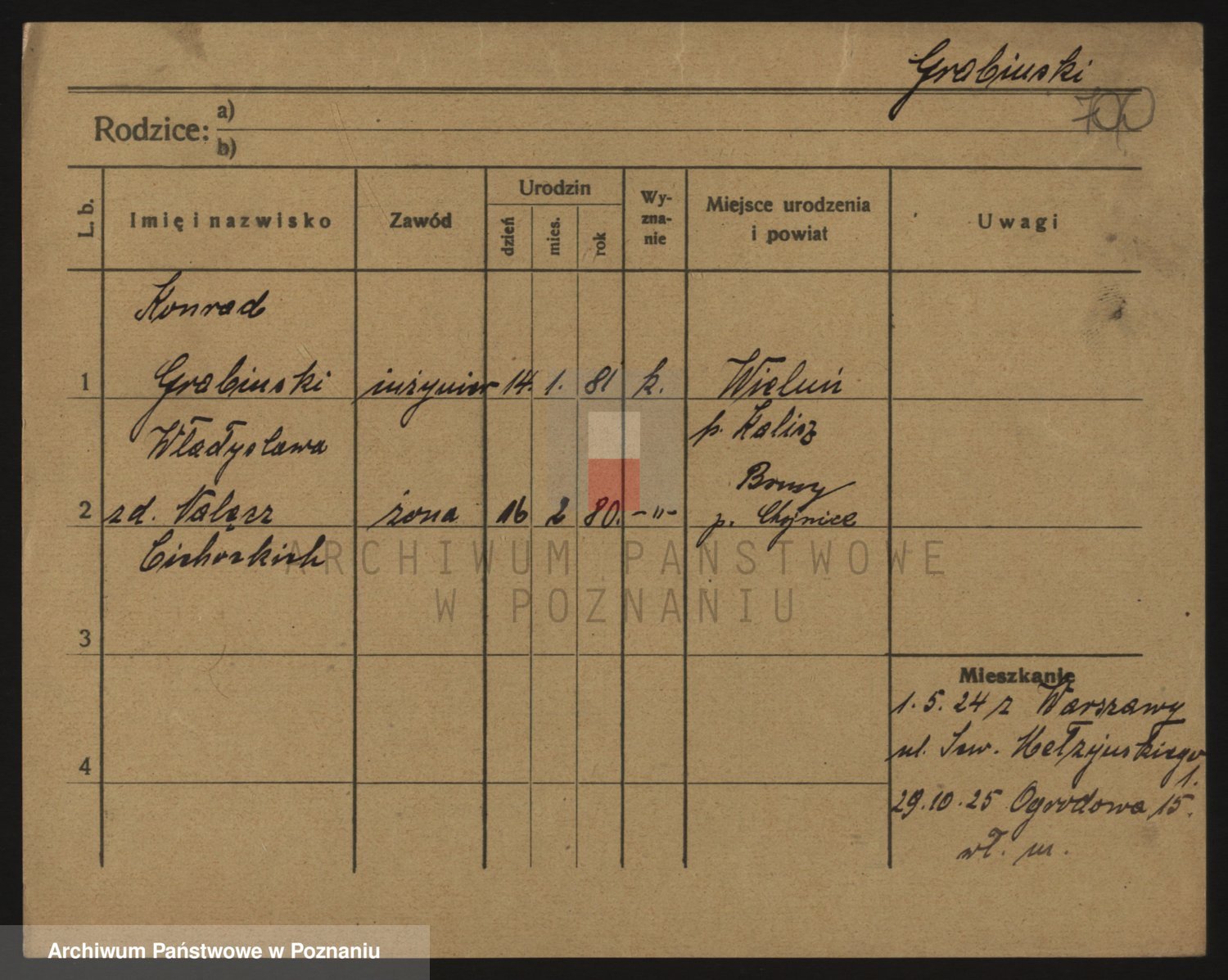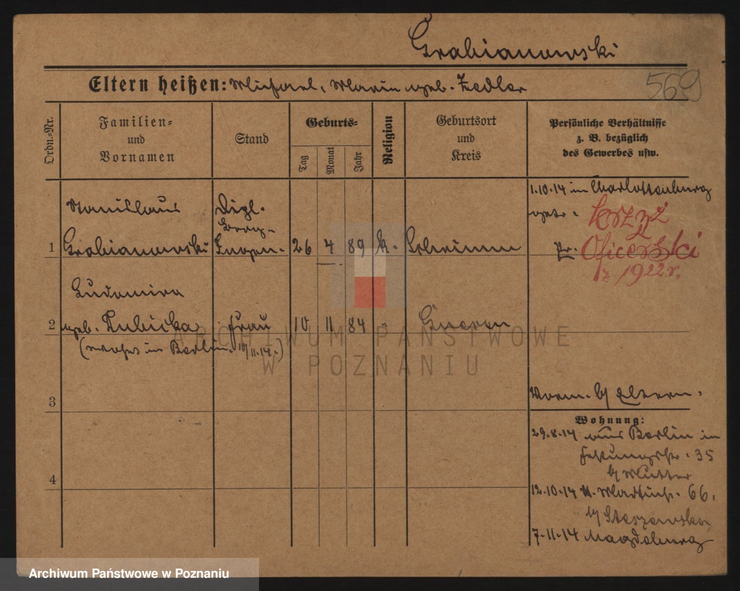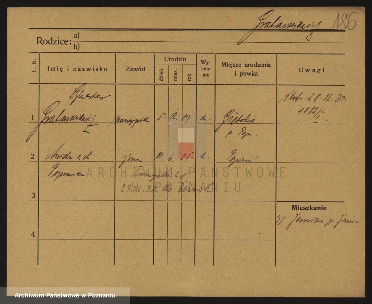 Podgląd karty osobowej dostępny jest po kliknięciu na nazwisko lub ikonkę karty. Można dokonywać powiększenia (ikony na górze) lub przechodzić między kolejnymi skanami (strzałki po bokach).
