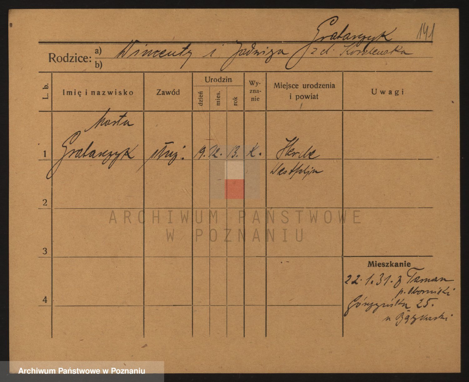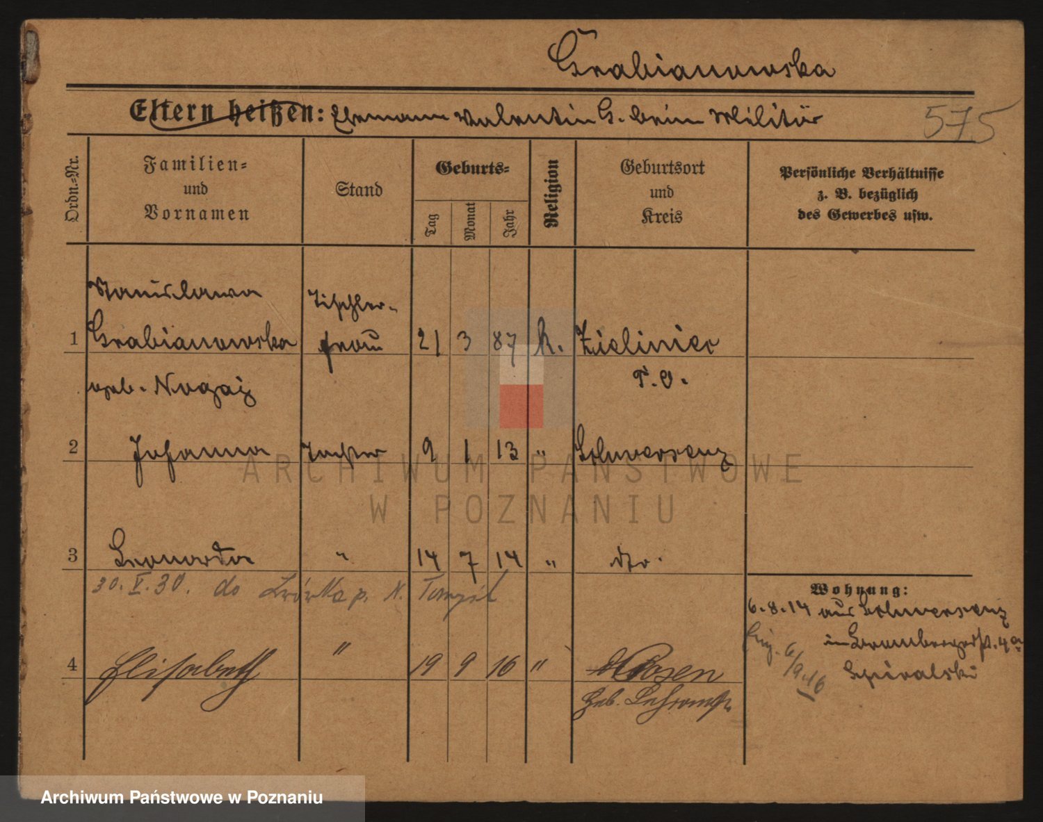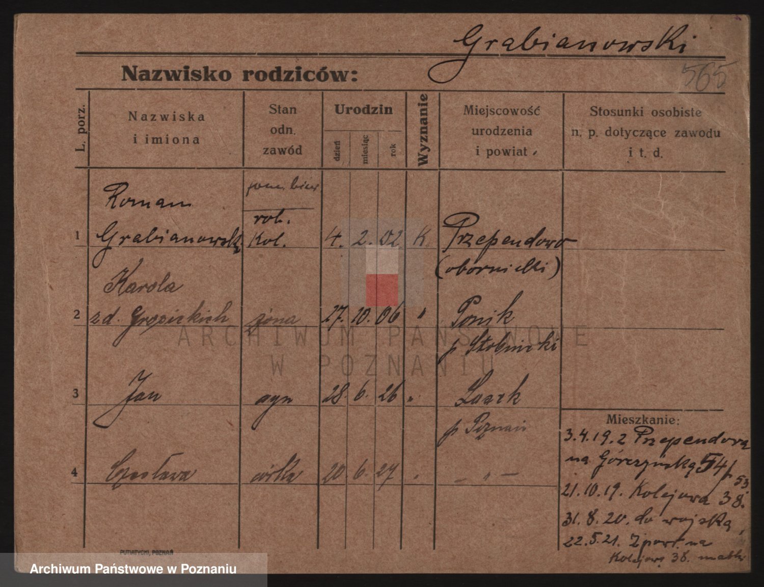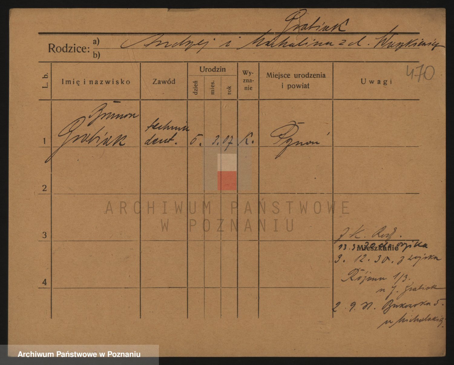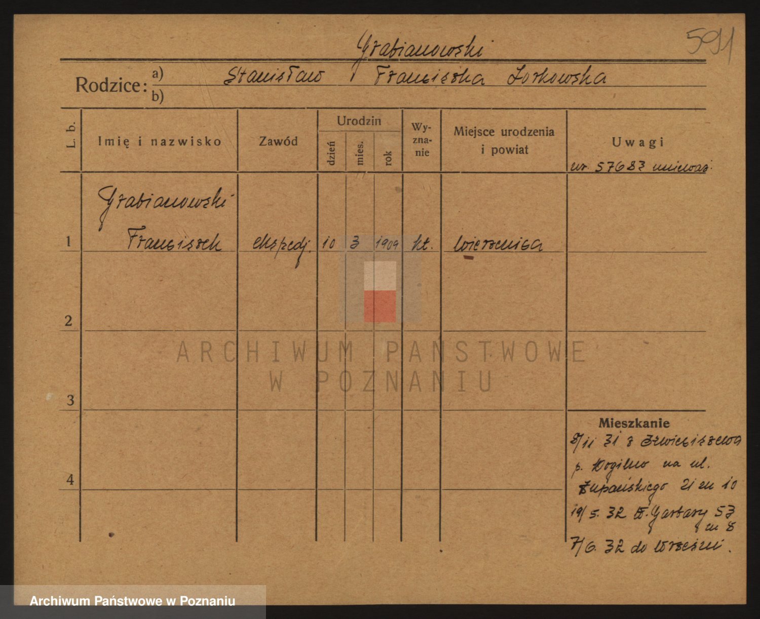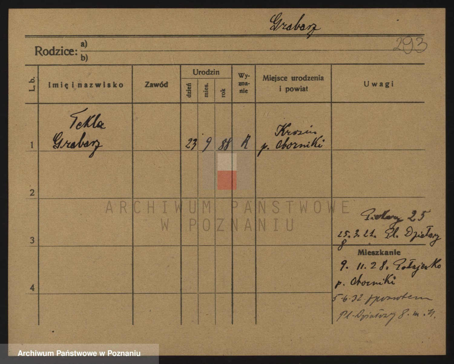 Podgląd karty osobowej dostępny jest po kliknięciu na nazwisko lub ikonkę karty. Można dokonywać powiększenia (ikony na górze) lub przechodzić między kolejnymi skanami (strzałki po bokach).