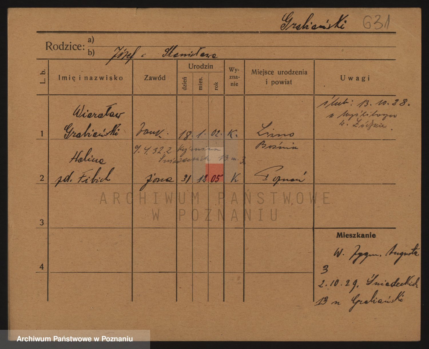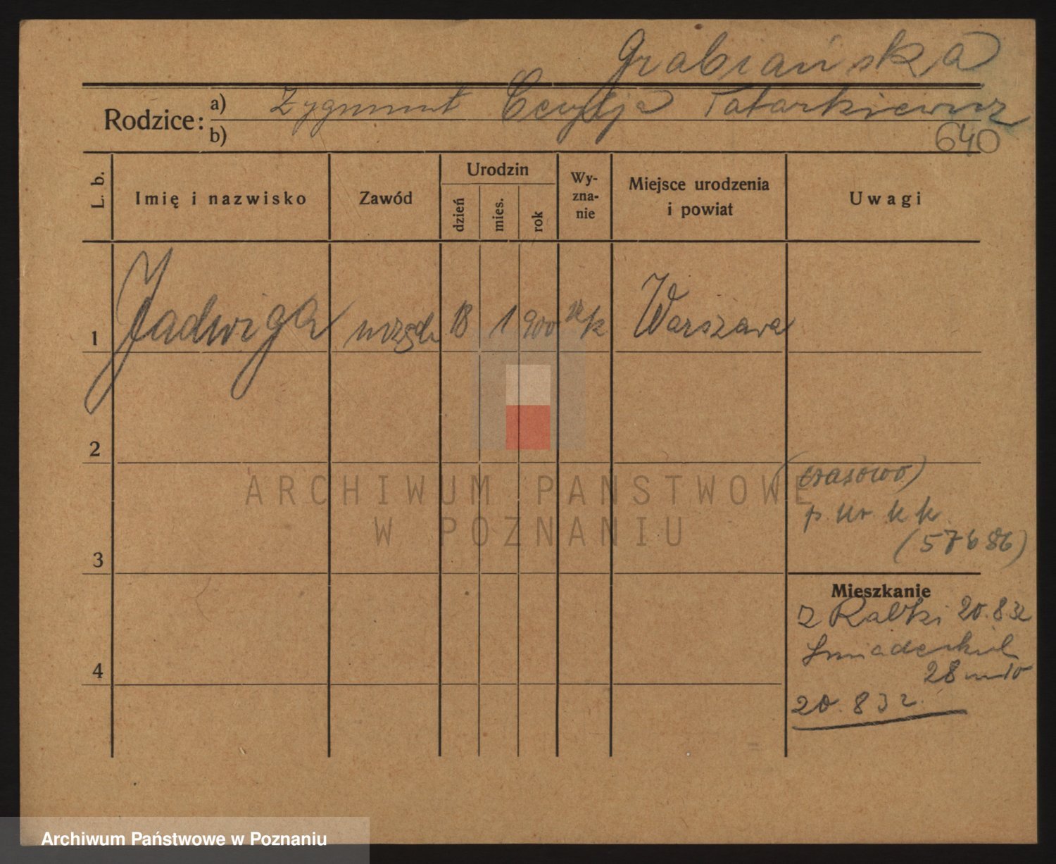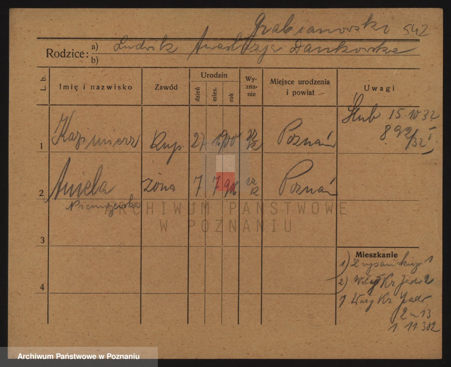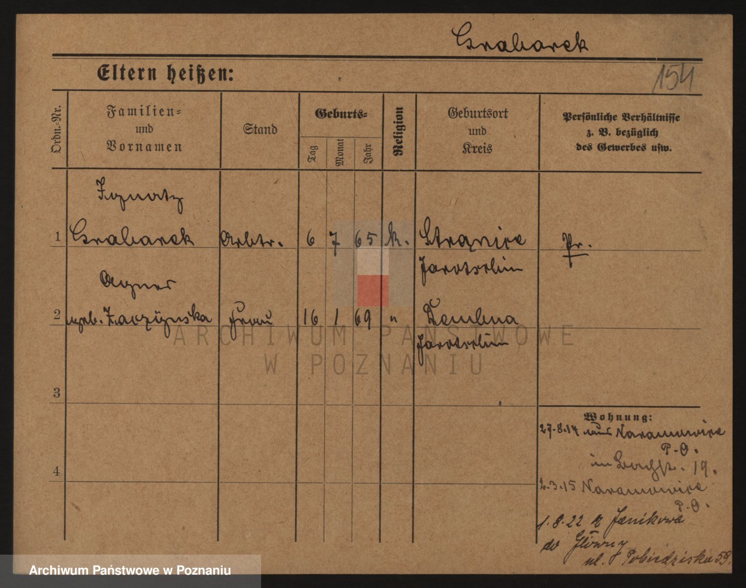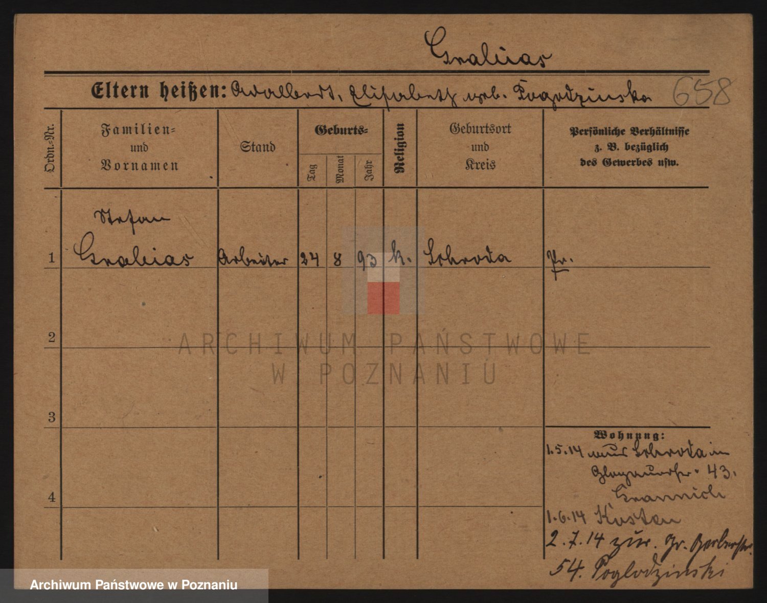 Podgląd karty osobowej dostępny jest po kliknięciu na nazwisko lub ikonkę karty. Można dokonywać powiększenia (ikony na górze) lub przechodzić między kolejnymi skanami (strzałki po bokach).