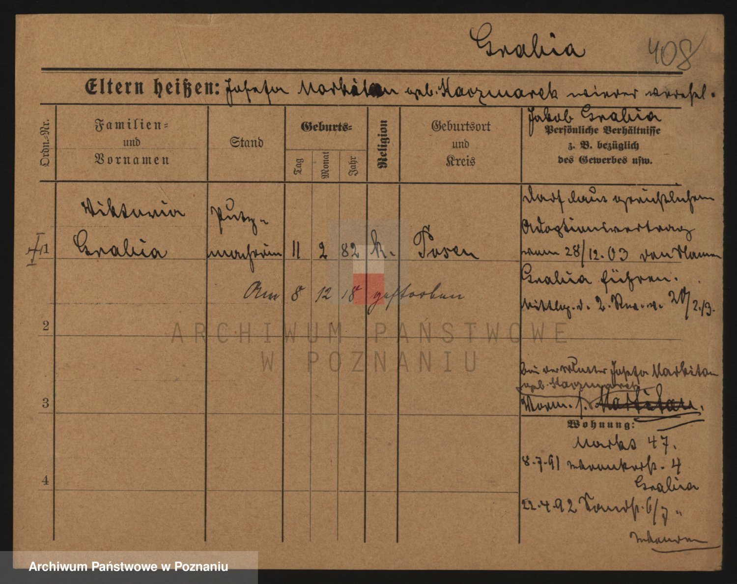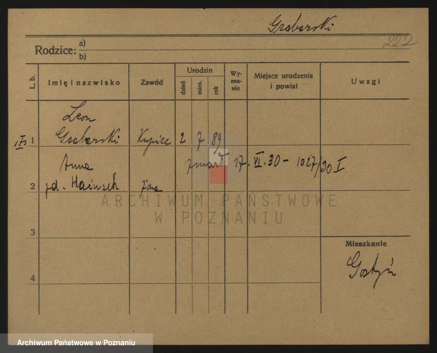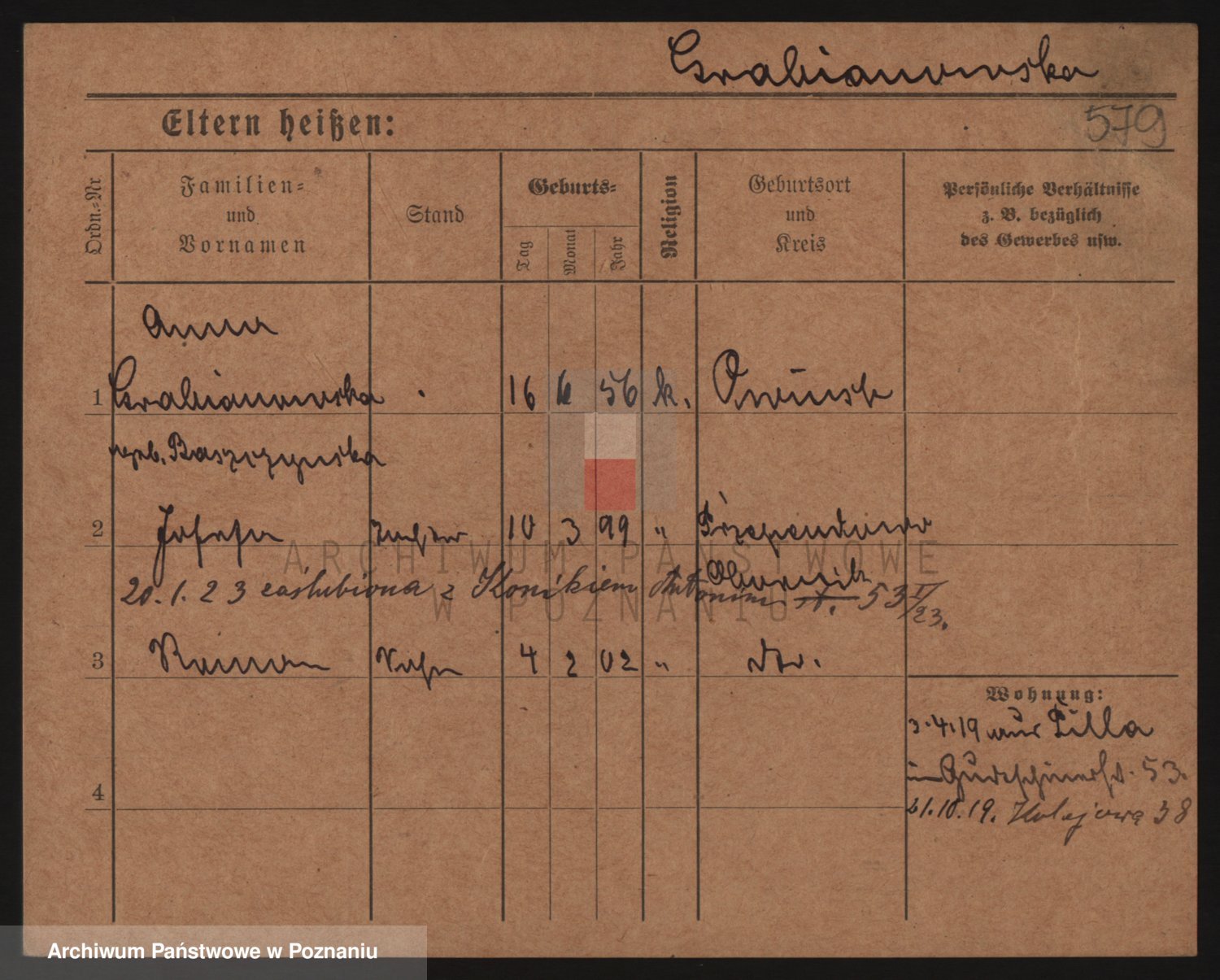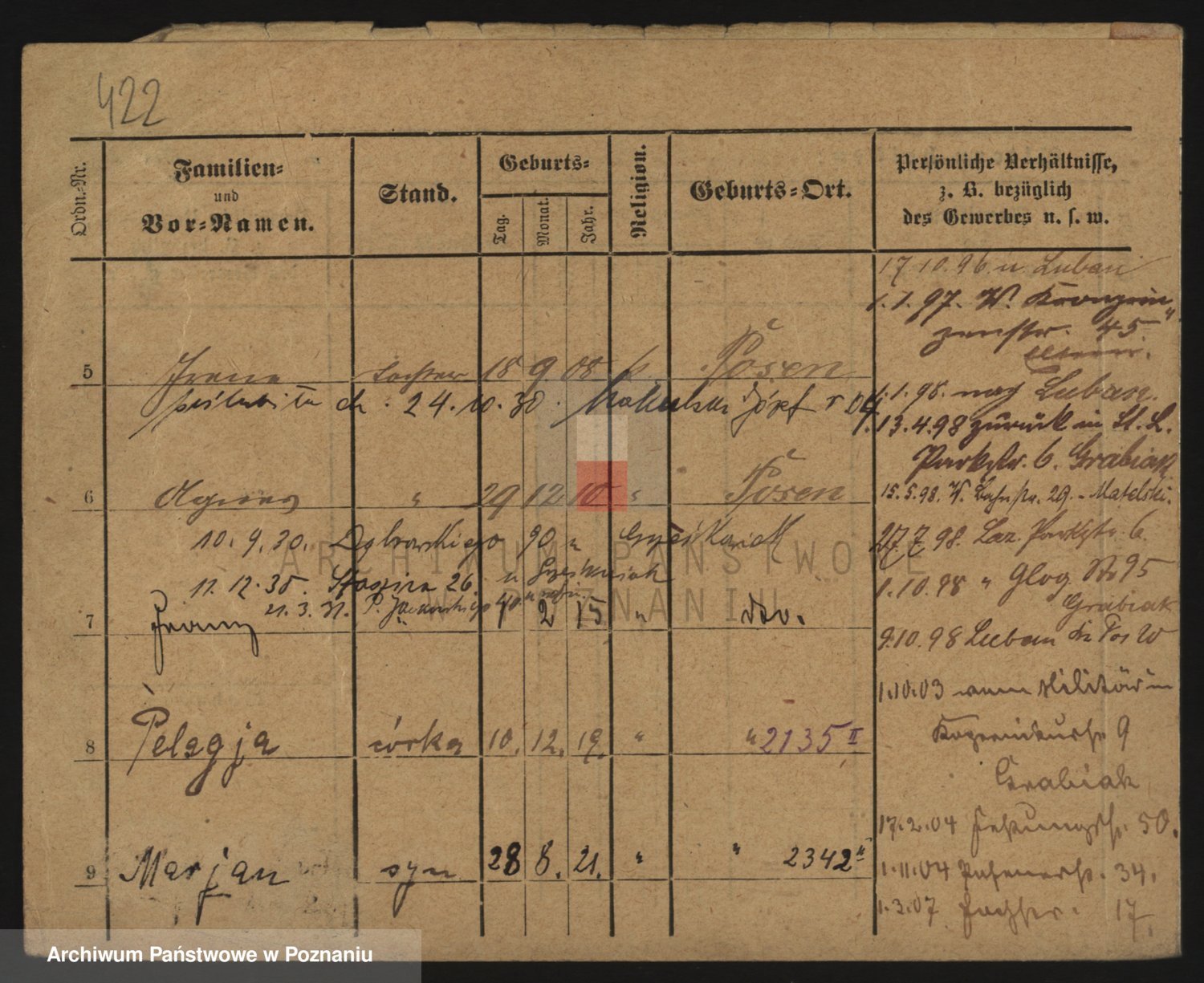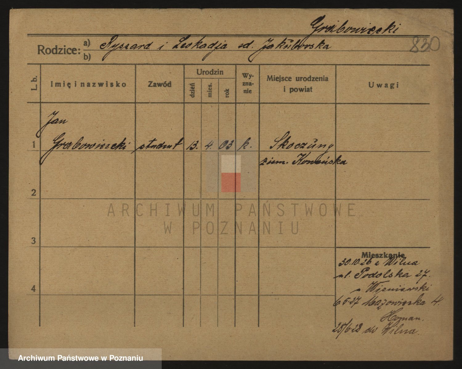 Podgląd karty osobowej dostępny jest po kliknięciu na nazwisko lub ikonkę karty. Można dokonywać powiększenia (ikony na górze) lub przechodzić między kolejnymi skanami (strzałki po bokach).