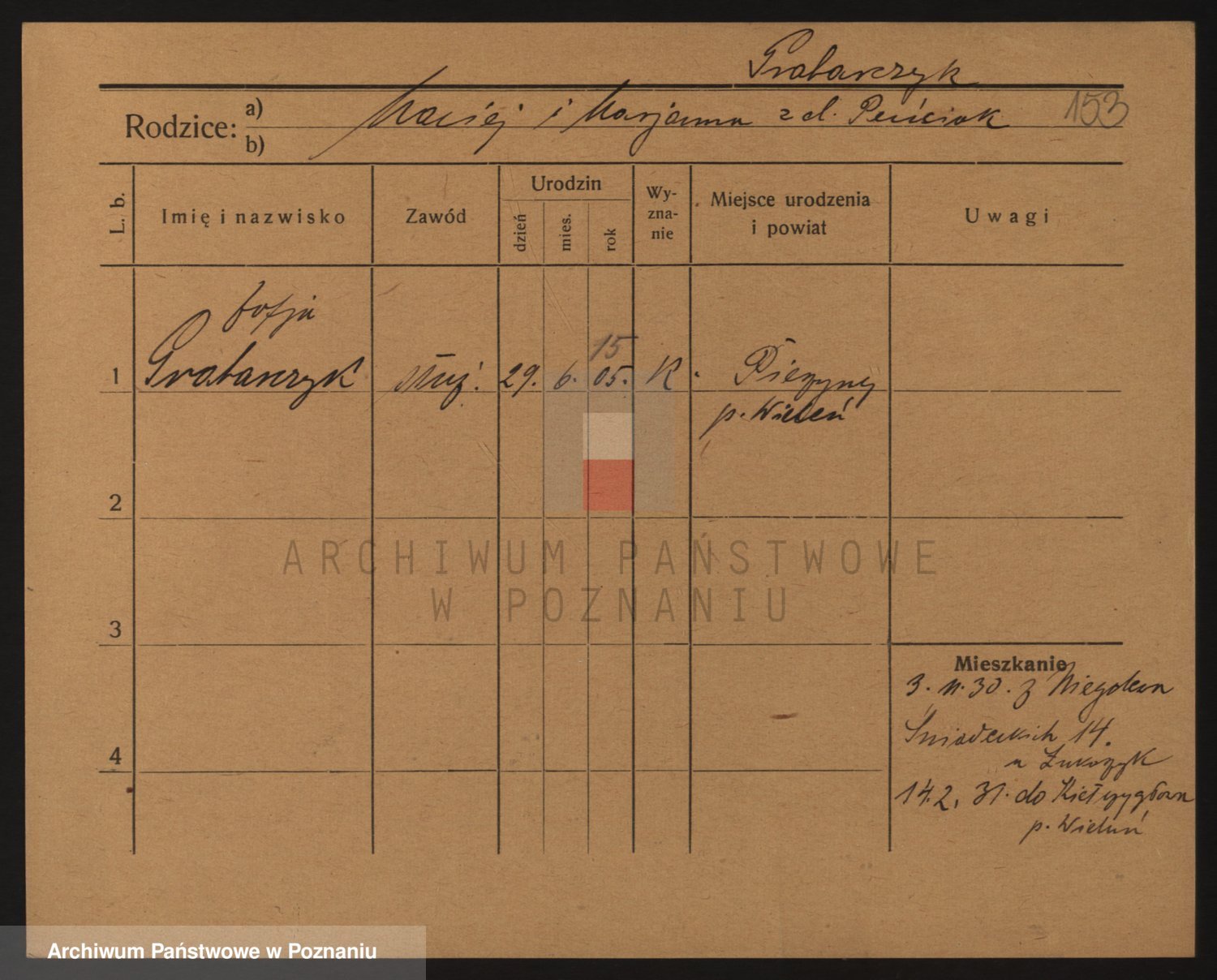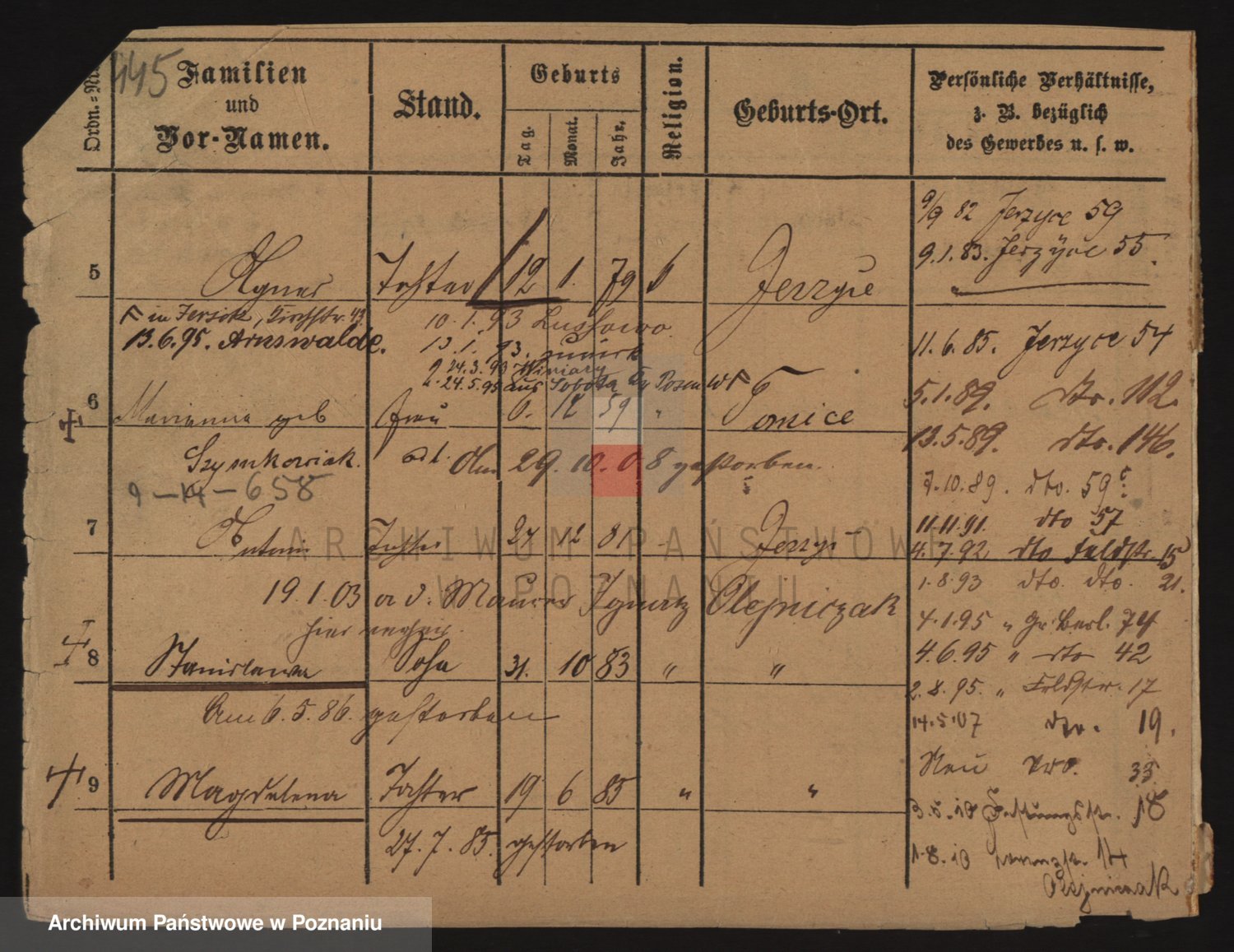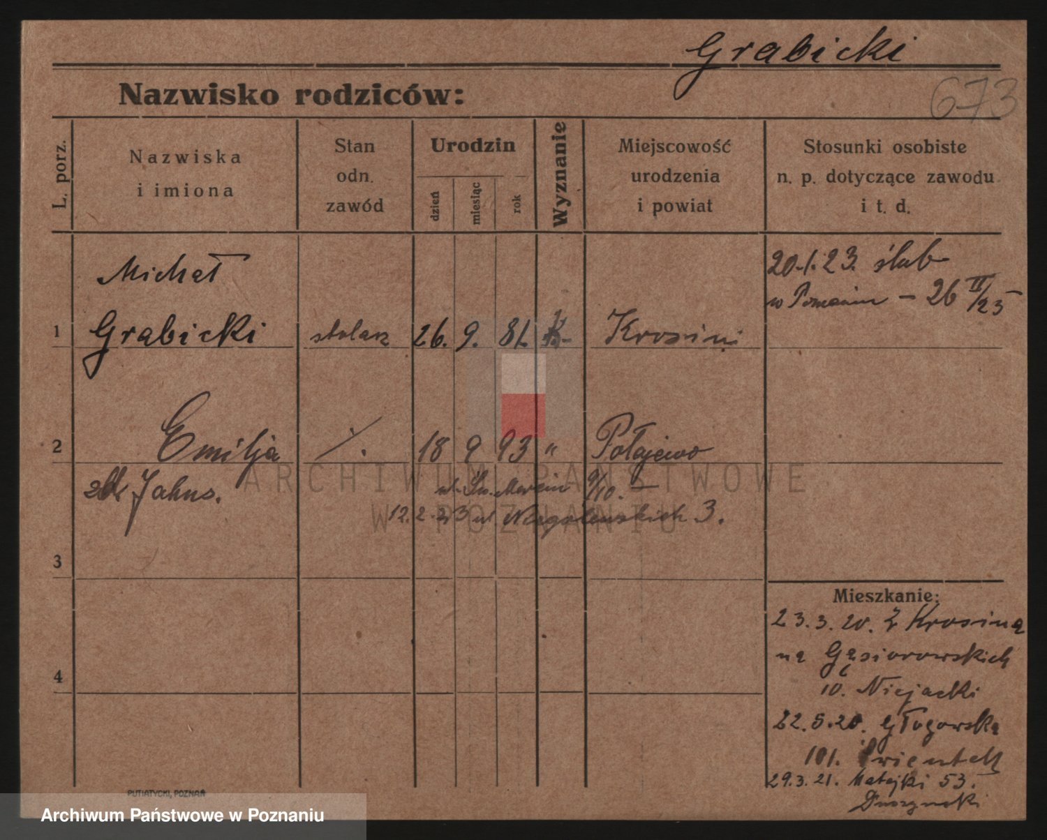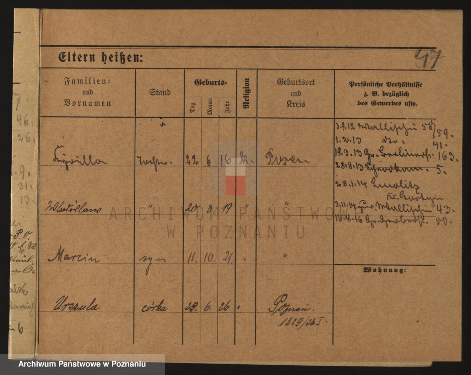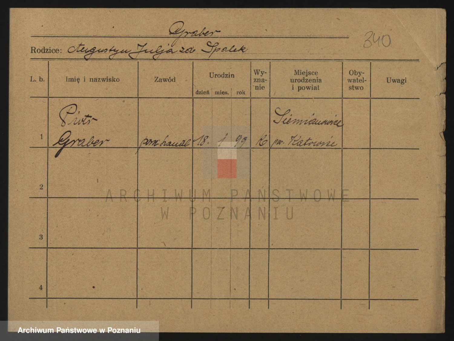 Podgląd karty osobowej dostępny jest po kliknięciu na nazwisko lub ikonkę karty. Można dokonywać powiększenia (ikony na górze) lub przechodzić między kolejnymi skanami (strzałki po bokach).