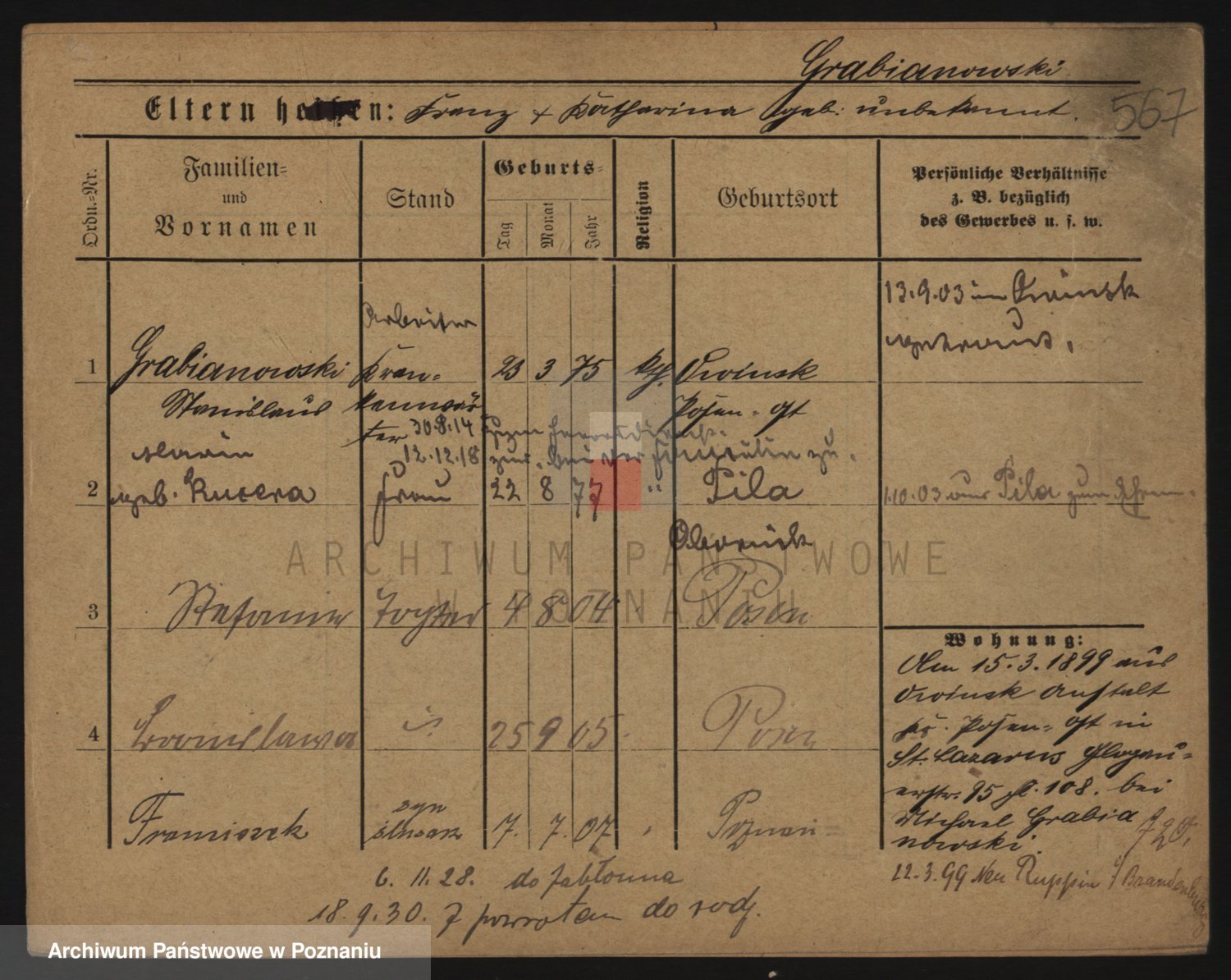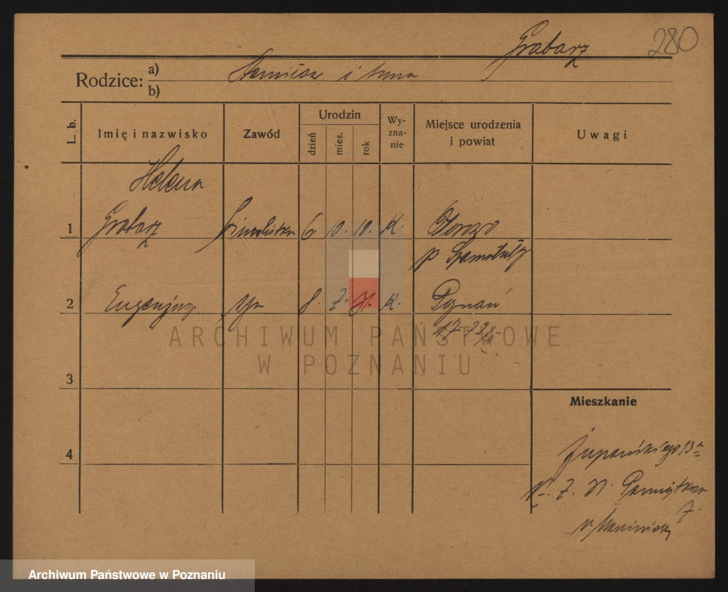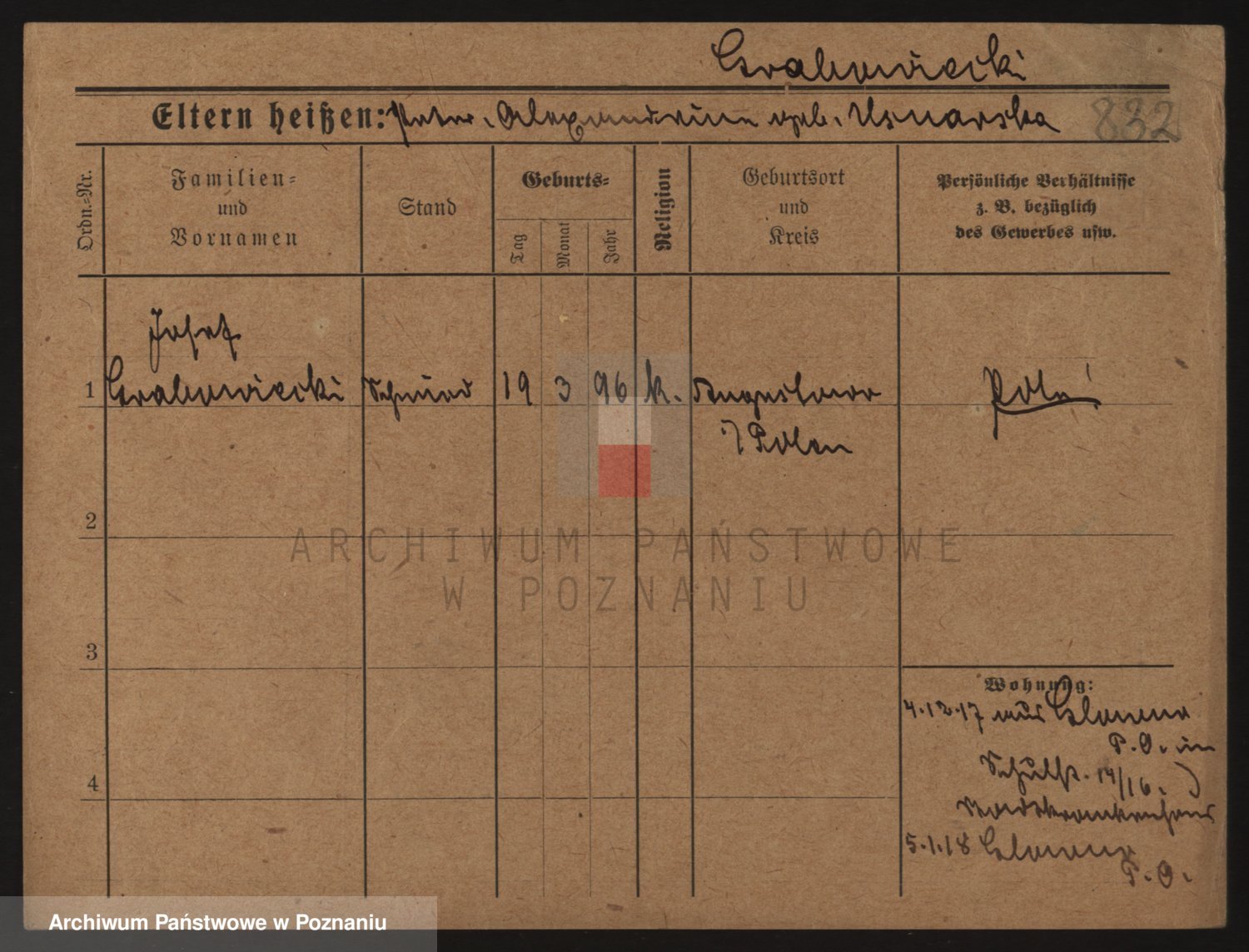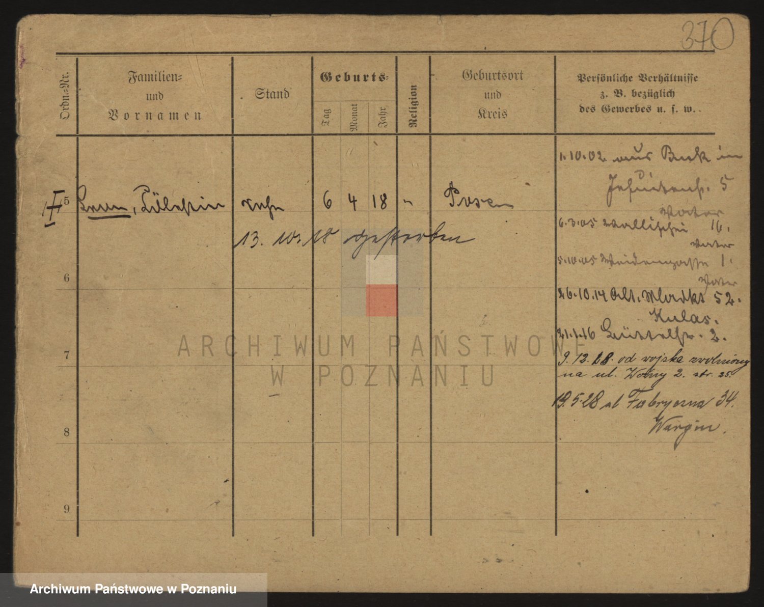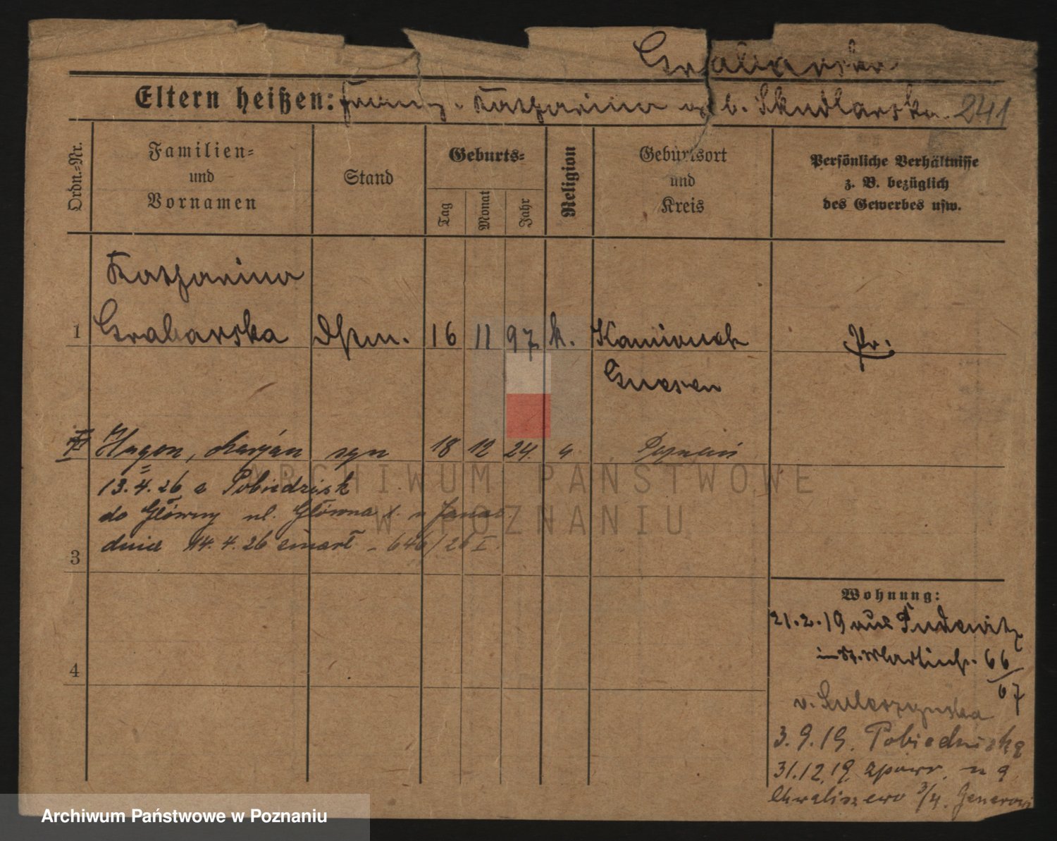 Podgląd karty osobowej dostępny jest po kliknięciu na nazwisko lub ikonkę karty. Można dokonywać powiększenia (ikony na górze) lub przechodzić między kolejnymi skanami (strzałki po bokach).