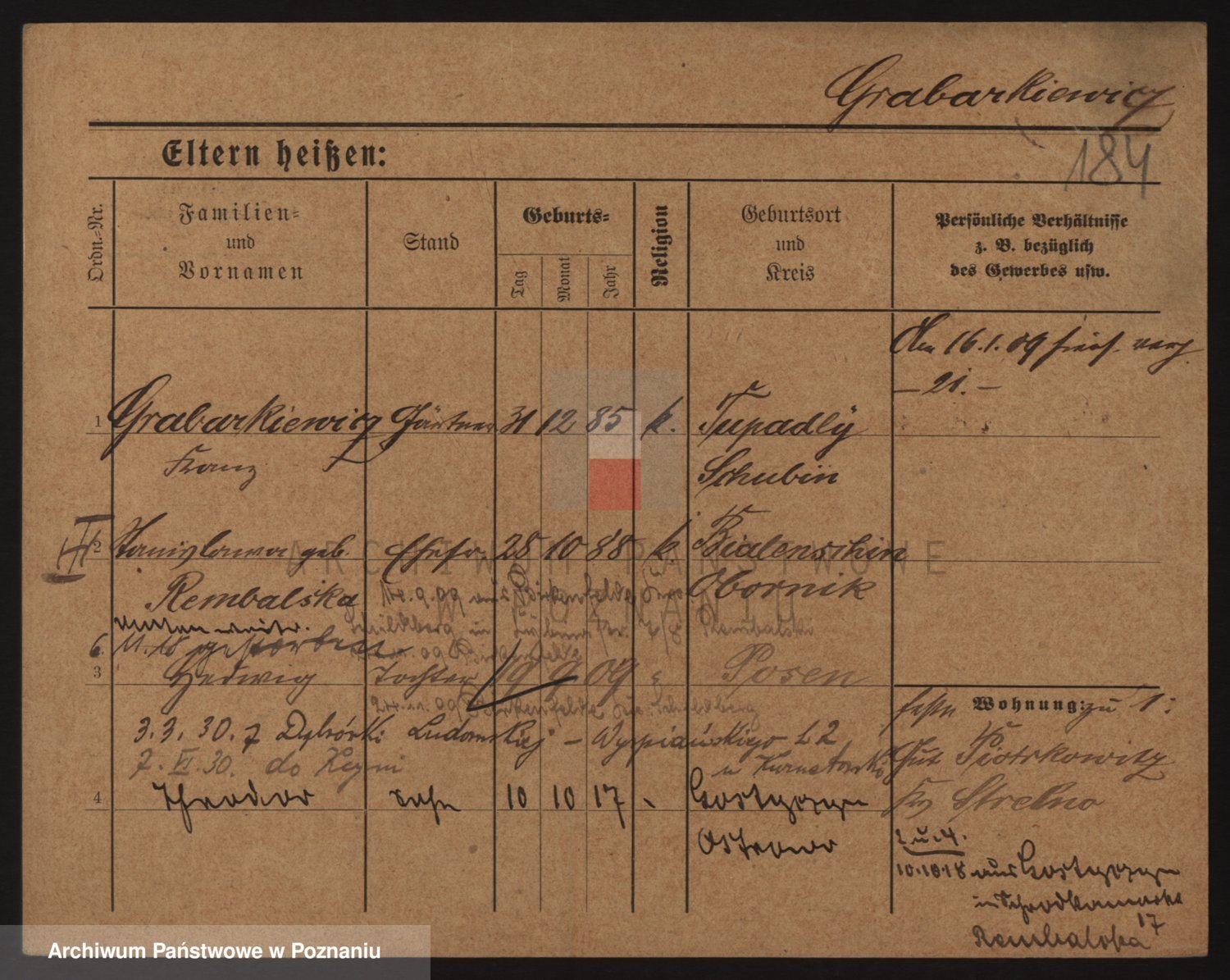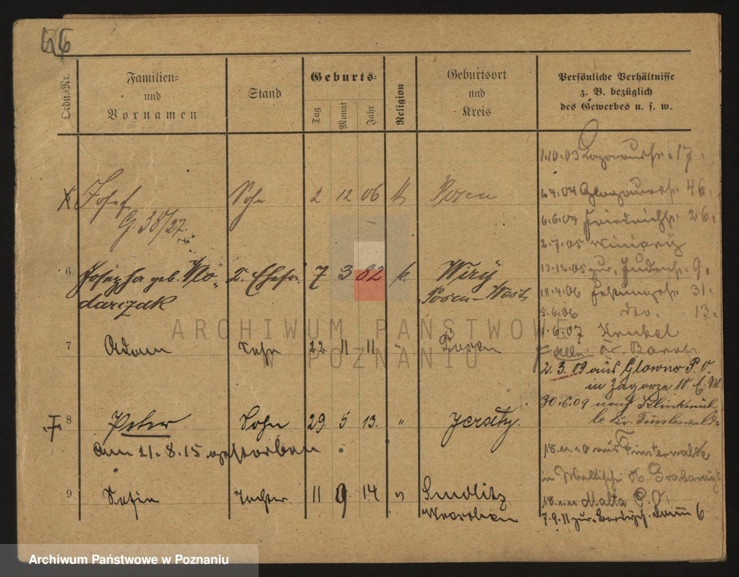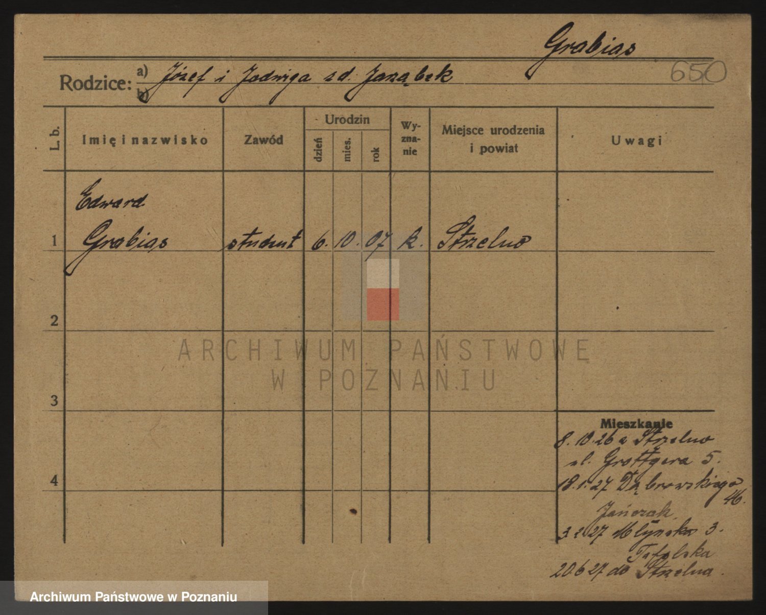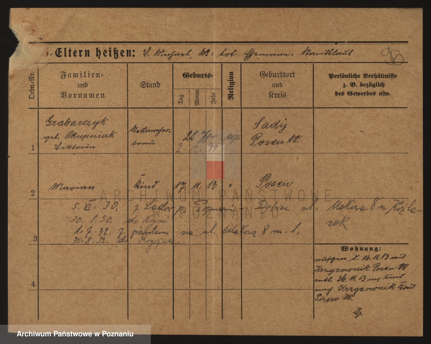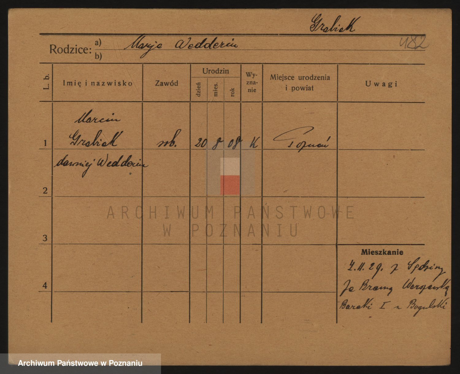 Podgląd karty osobowej dostępny jest po kliknięciu na nazwisko lub ikonkę karty. Można dokonywać powiększenia (ikony na górze) lub przechodzić między kolejnymi skanami (strzałki po bokach).