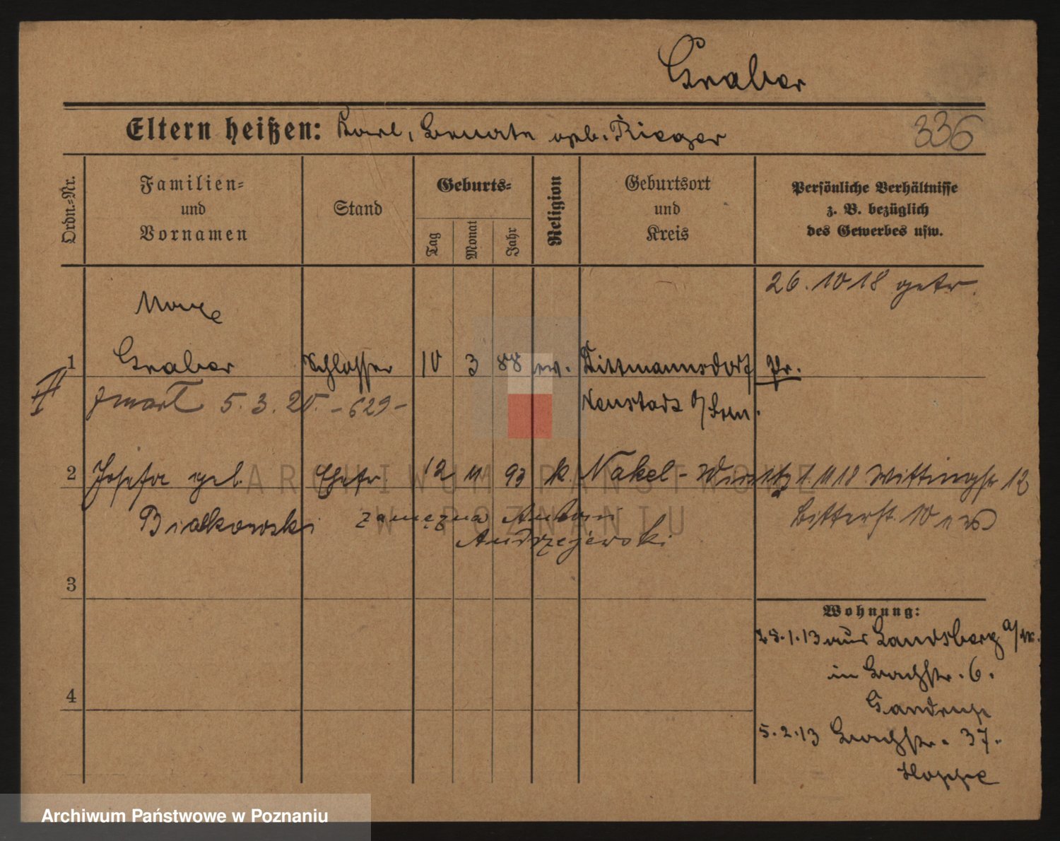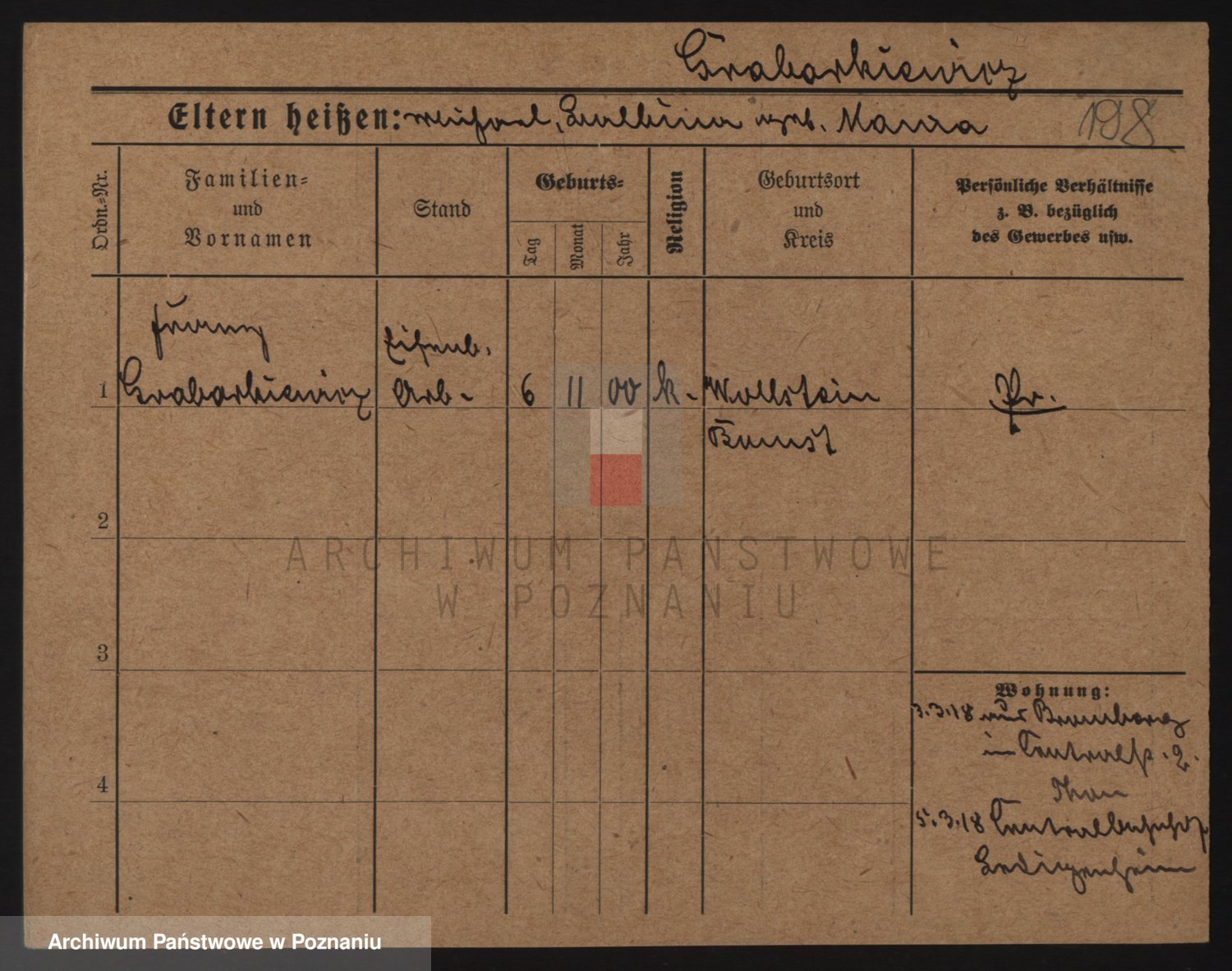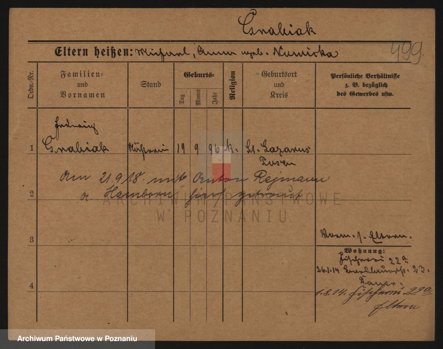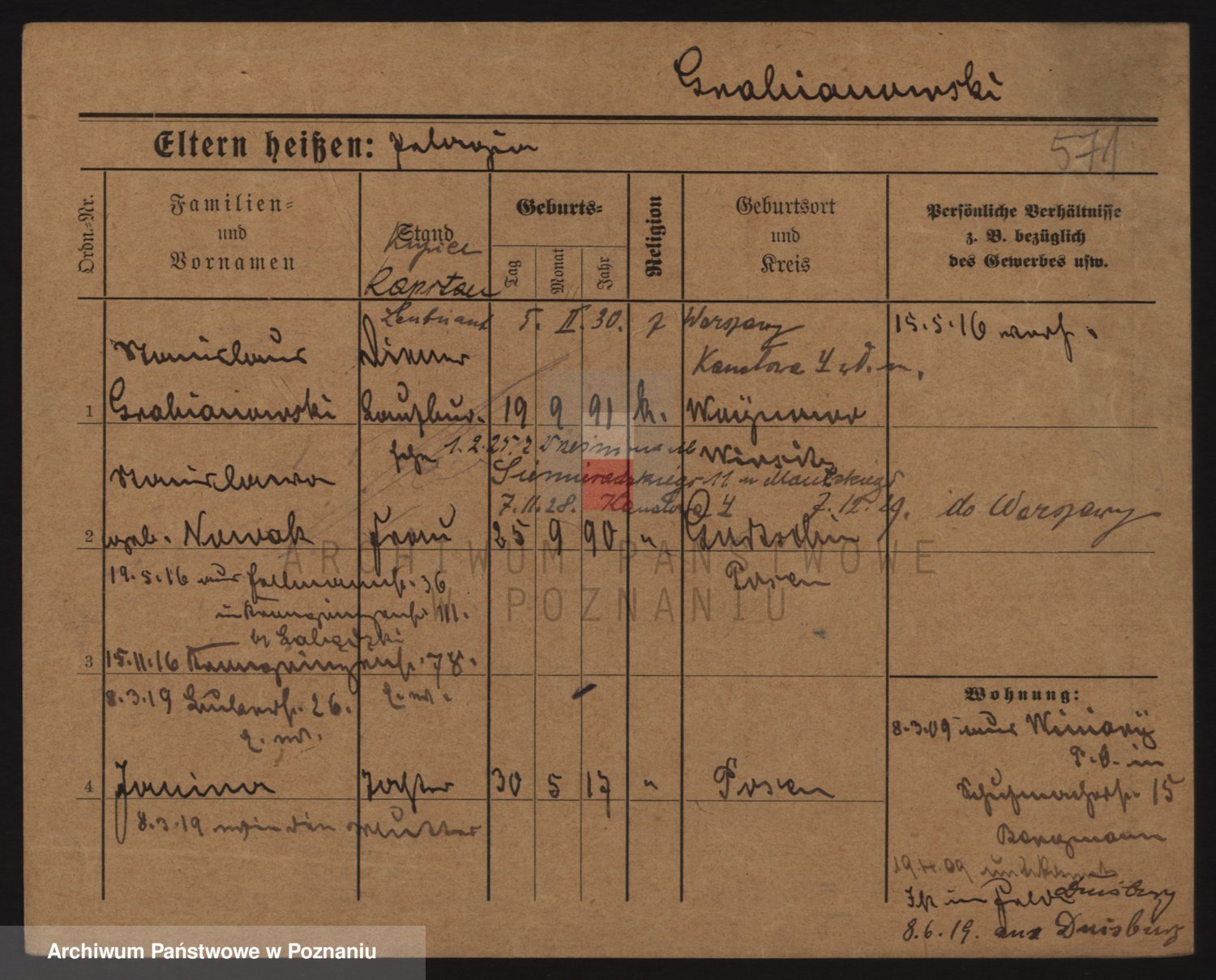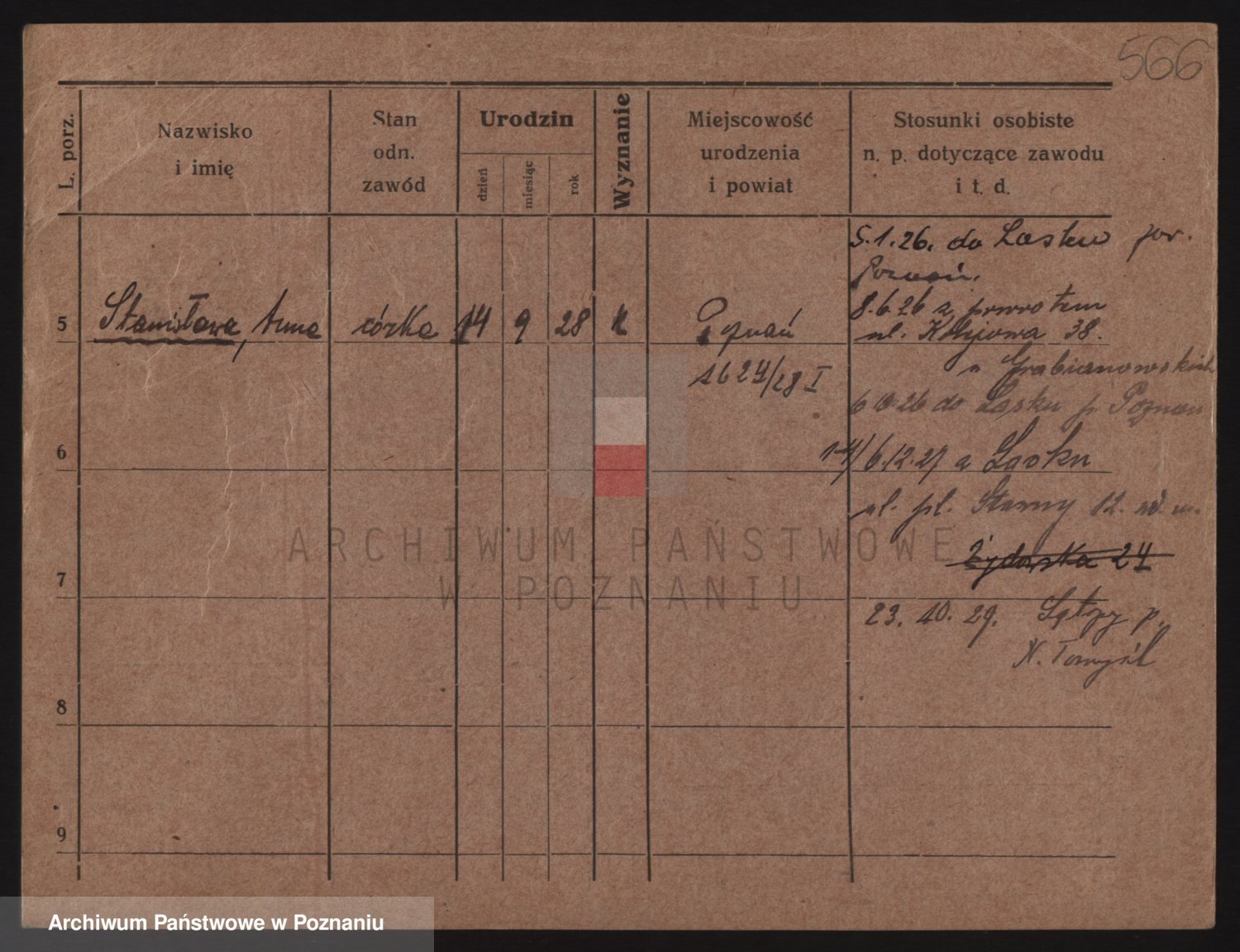 Podgląd karty osobowej dostępny jest po kliknięciu na nazwisko lub ikonkę karty. Można dokonywać powiększenia (ikony na górze) lub przechodzić między kolejnymi skanami (strzałki po bokach).