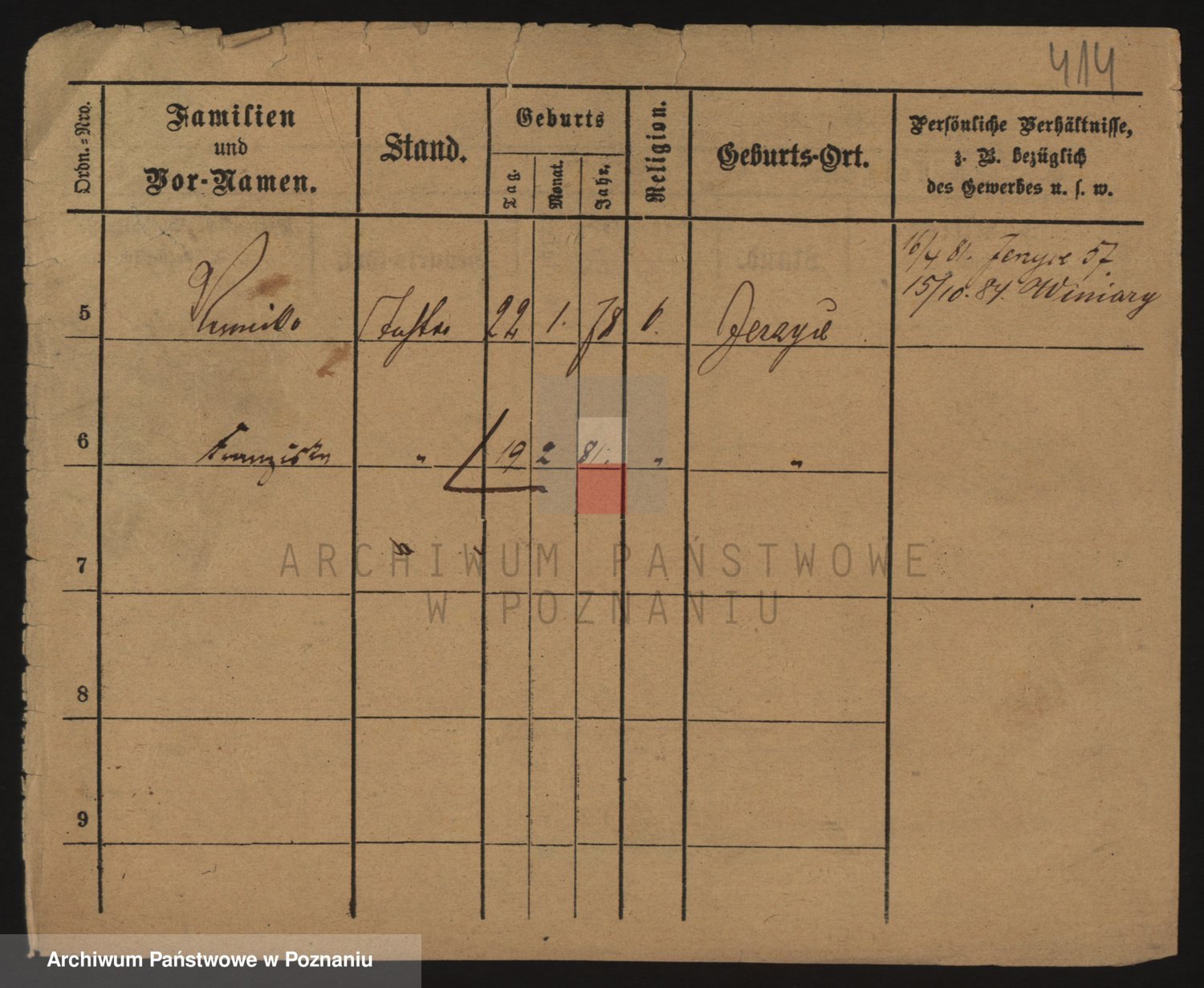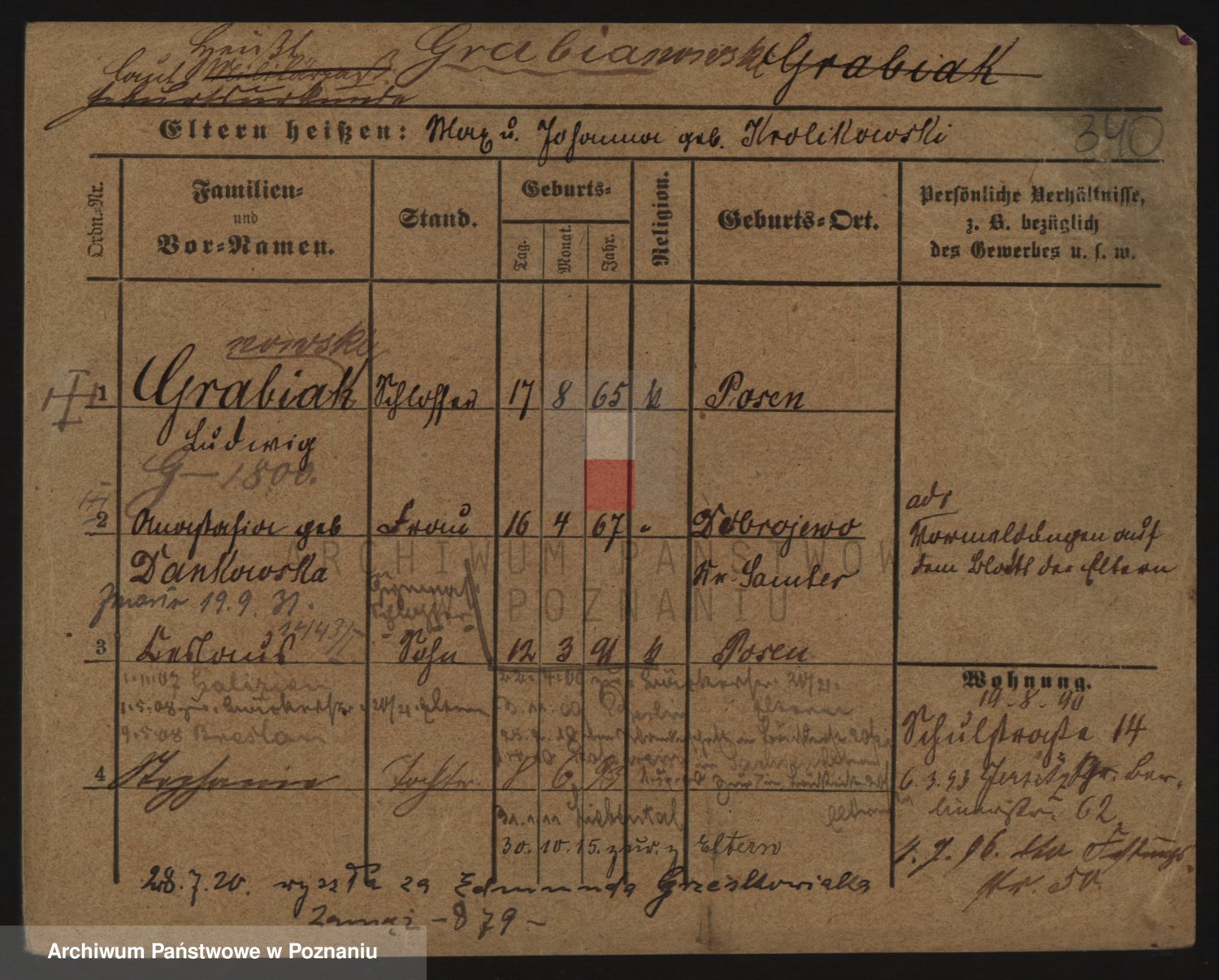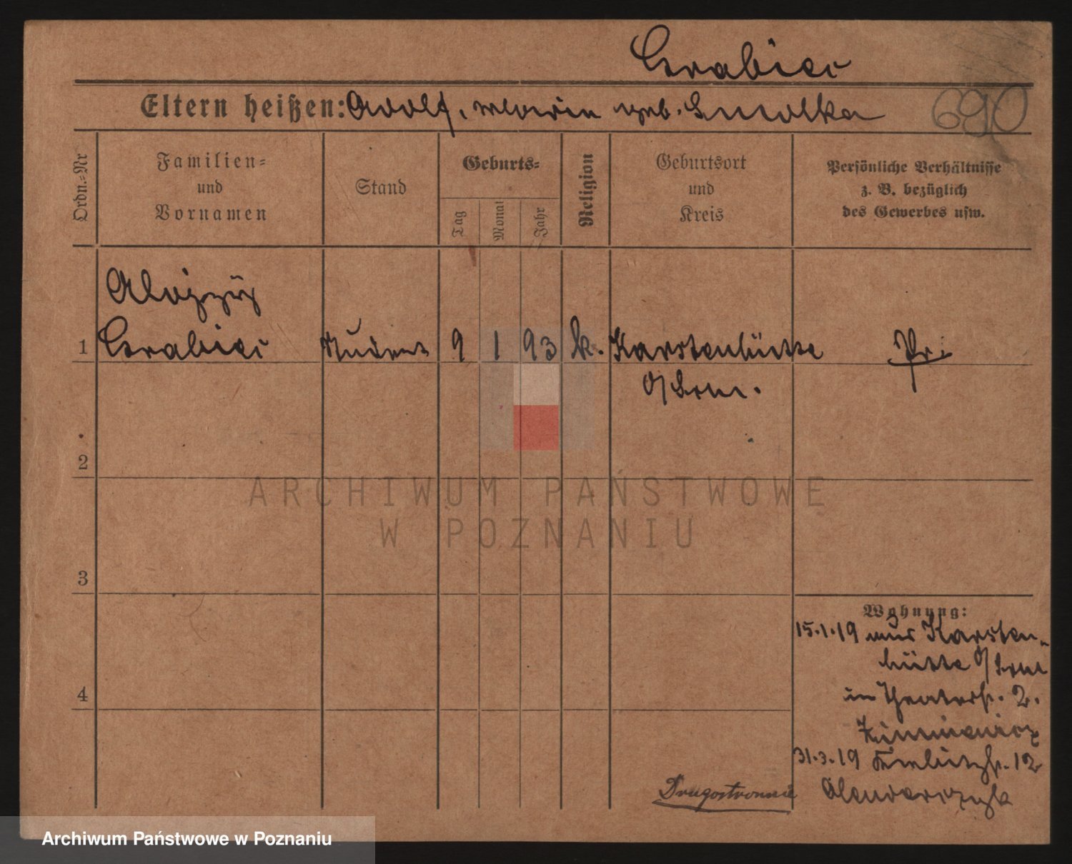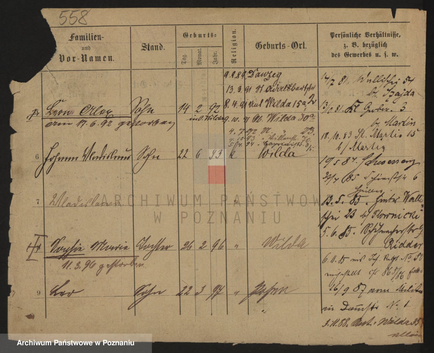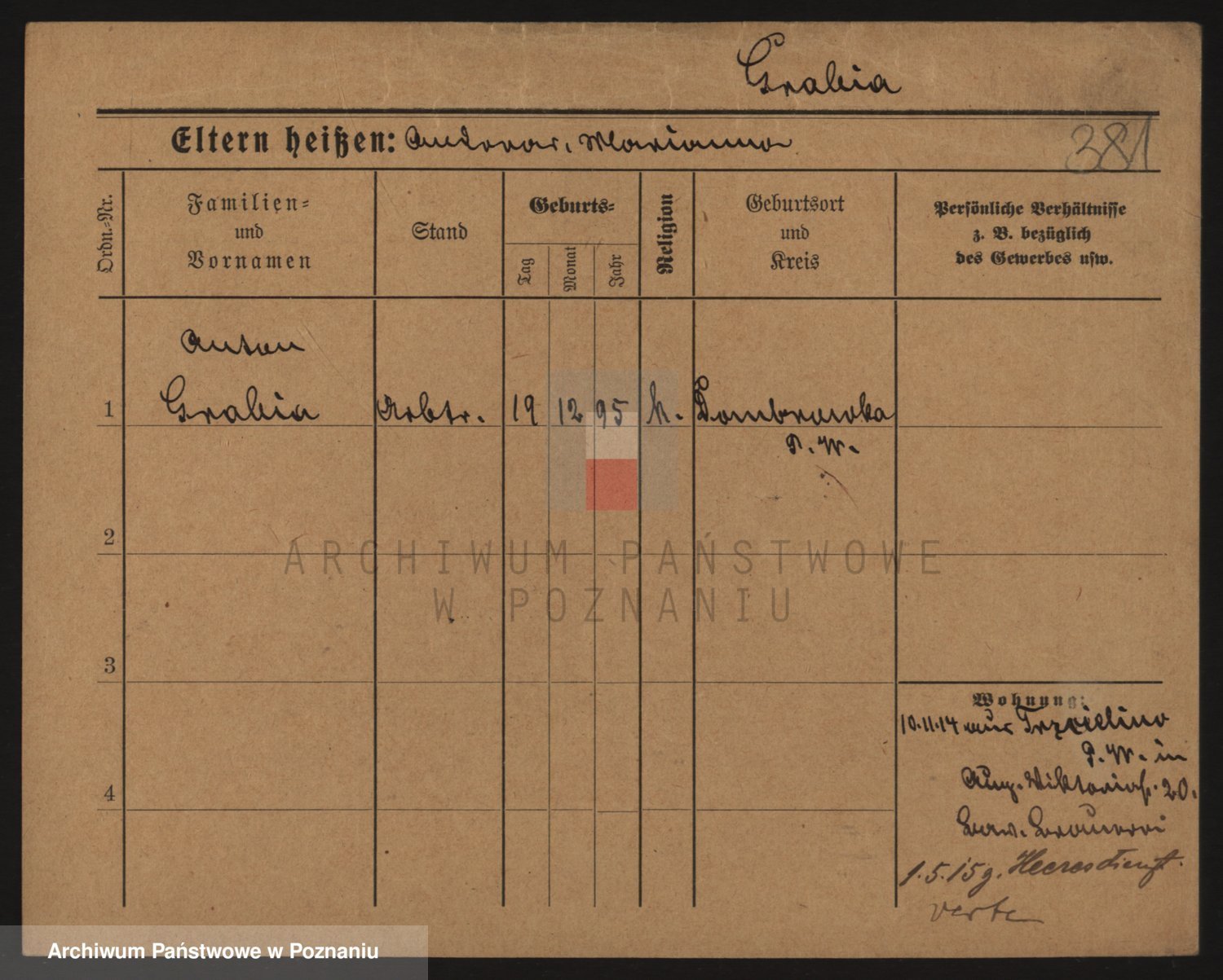 Podgląd karty osobowej dostępny jest po kliknięciu na nazwisko lub ikonkę karty. Można dokonywać powiększenia (ikony na górze) lub przechodzić między kolejnymi skanami (strzałki po bokach).
