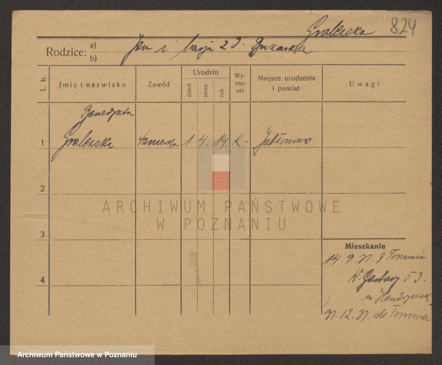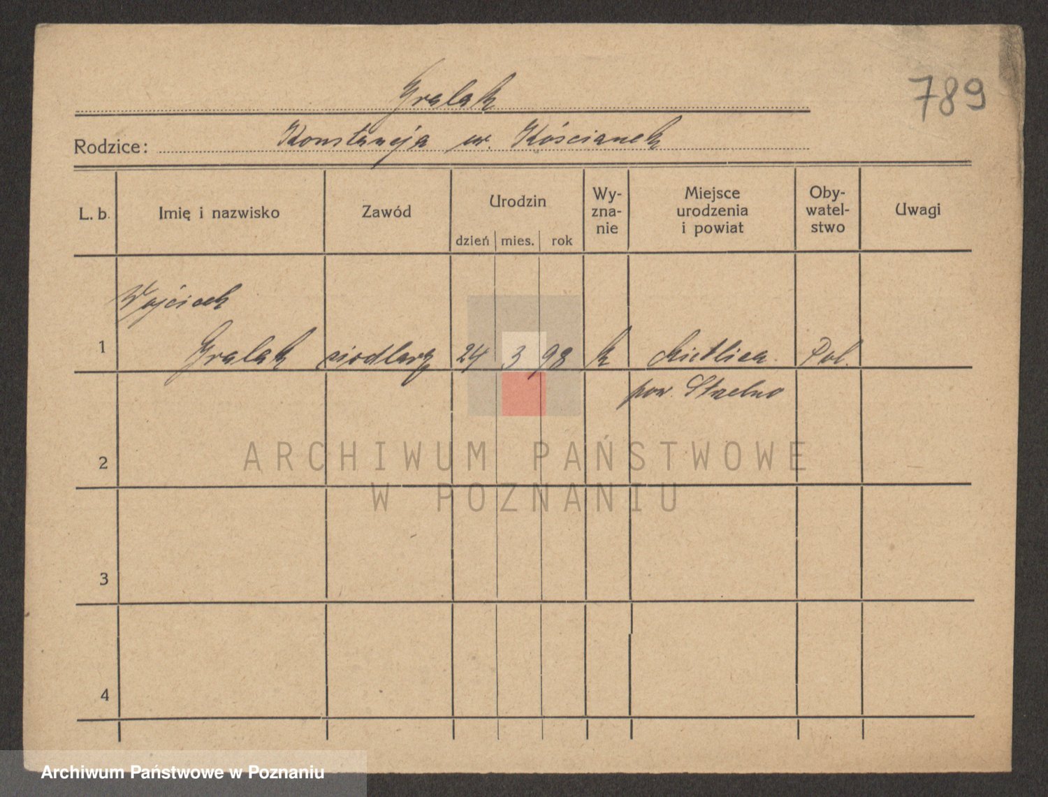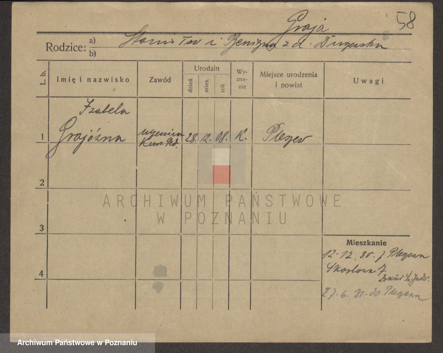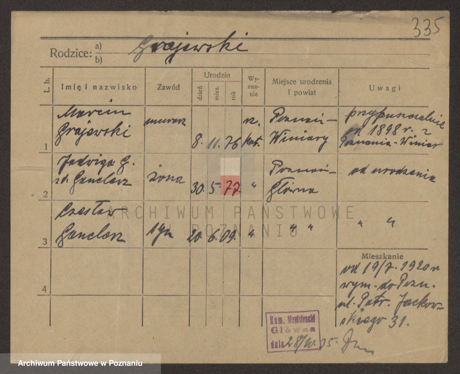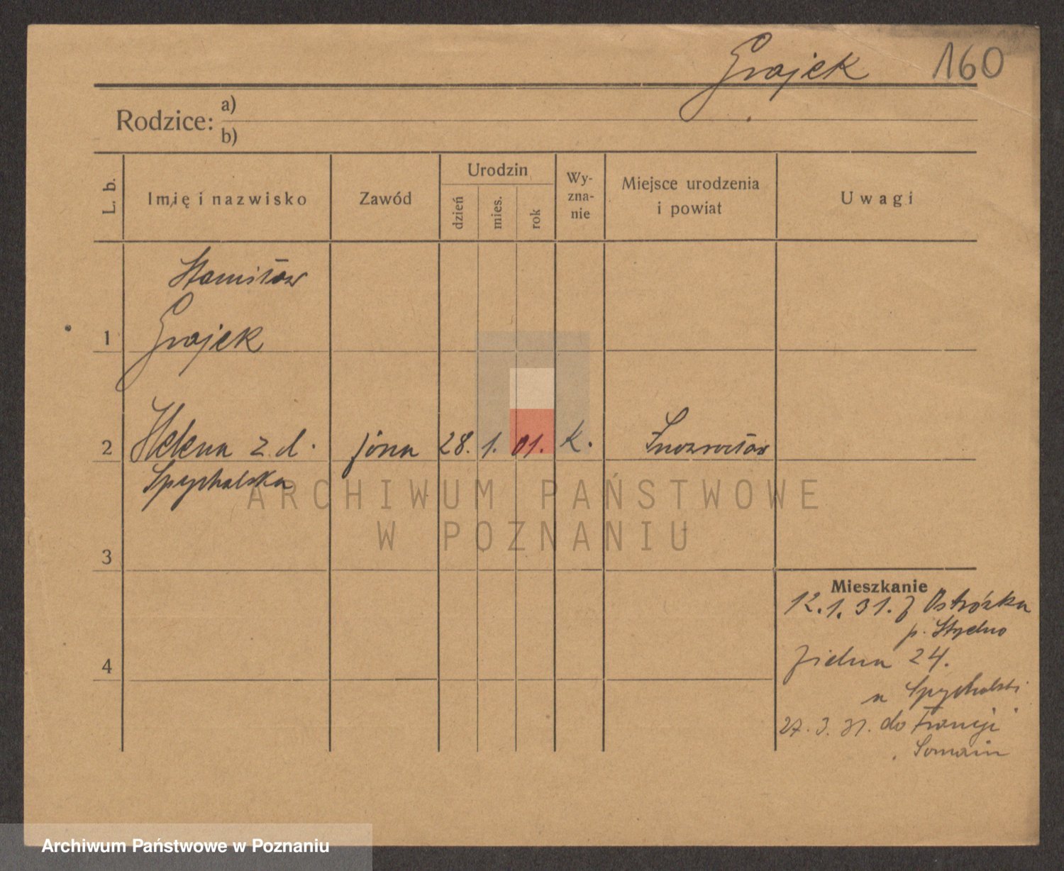 Podgląd karty osobowej dostępny jest po kliknięciu na nazwisko lub ikonkę karty. Można dokonywać powiększenia (ikony na górze) lub przechodzić między kolejnymi skanami (strzałki po bokach).