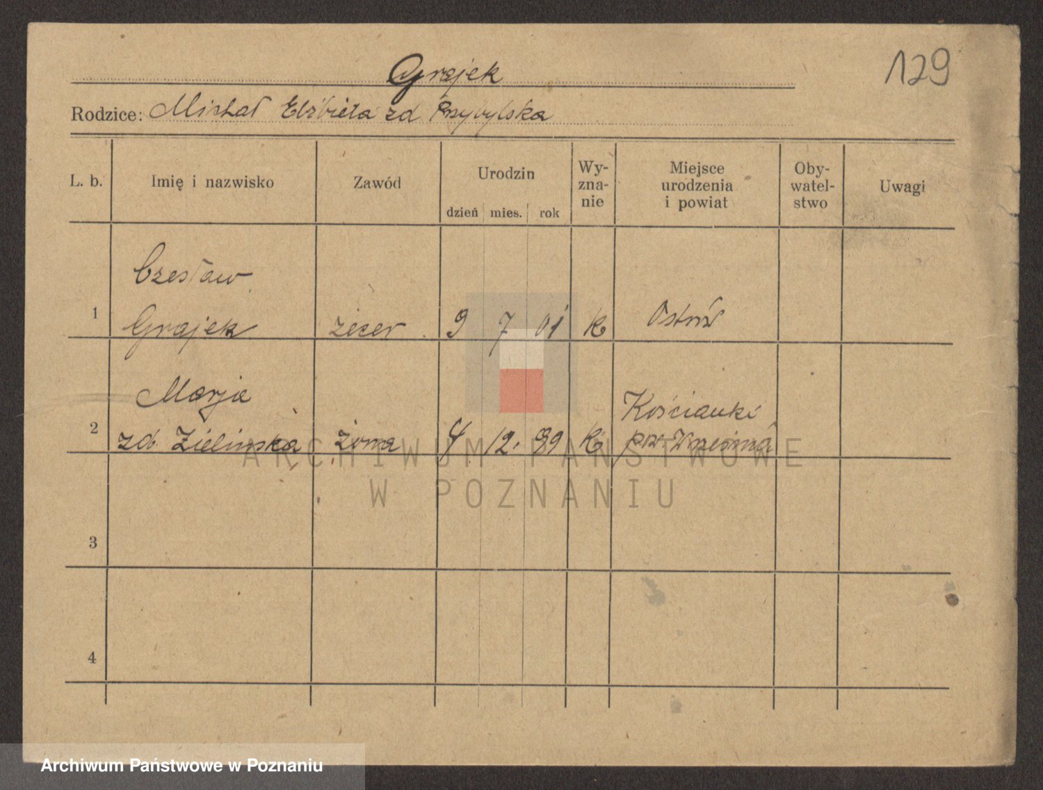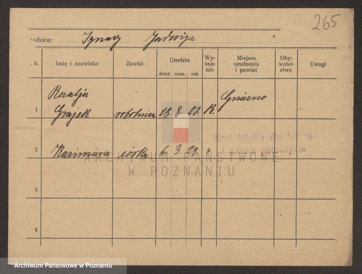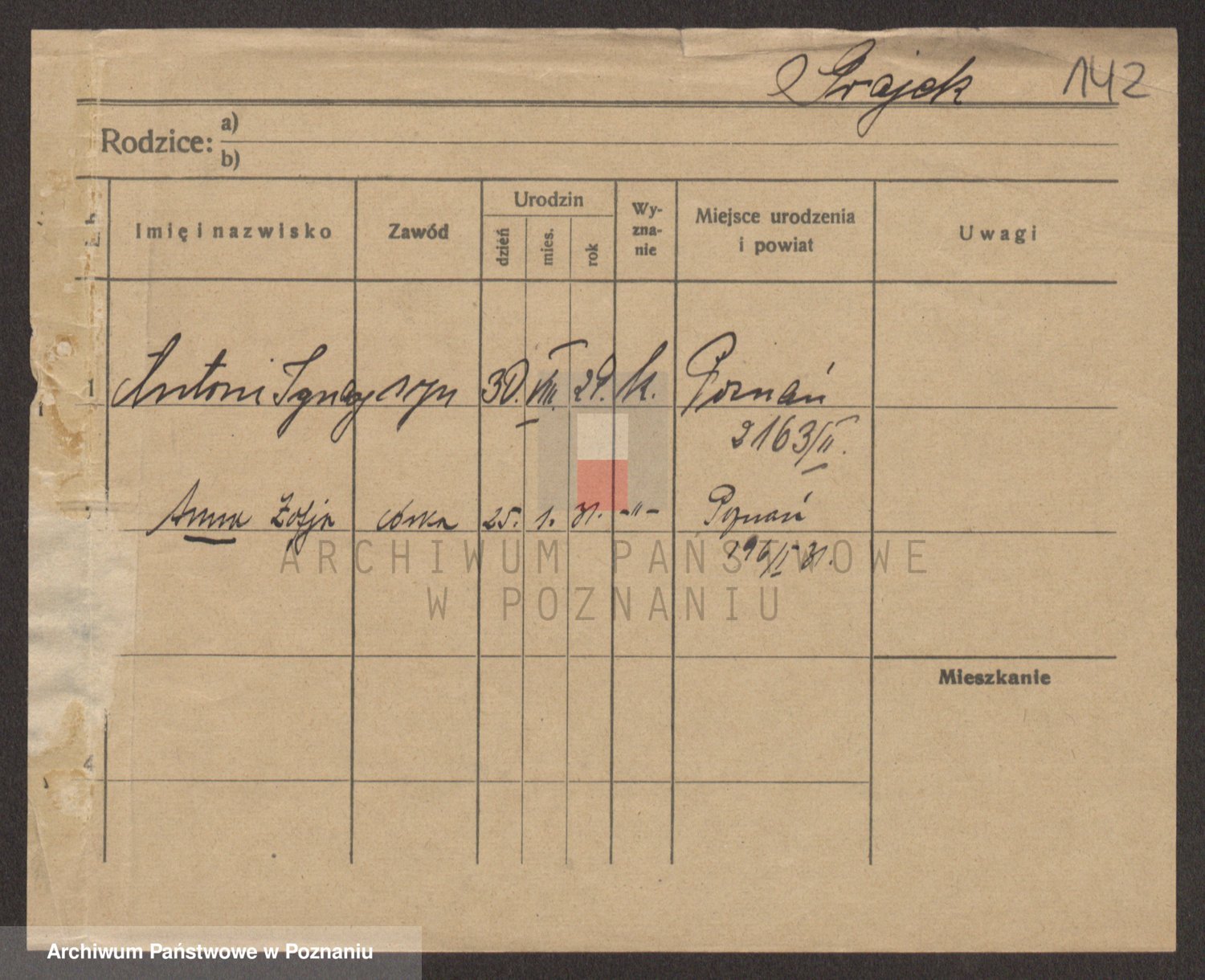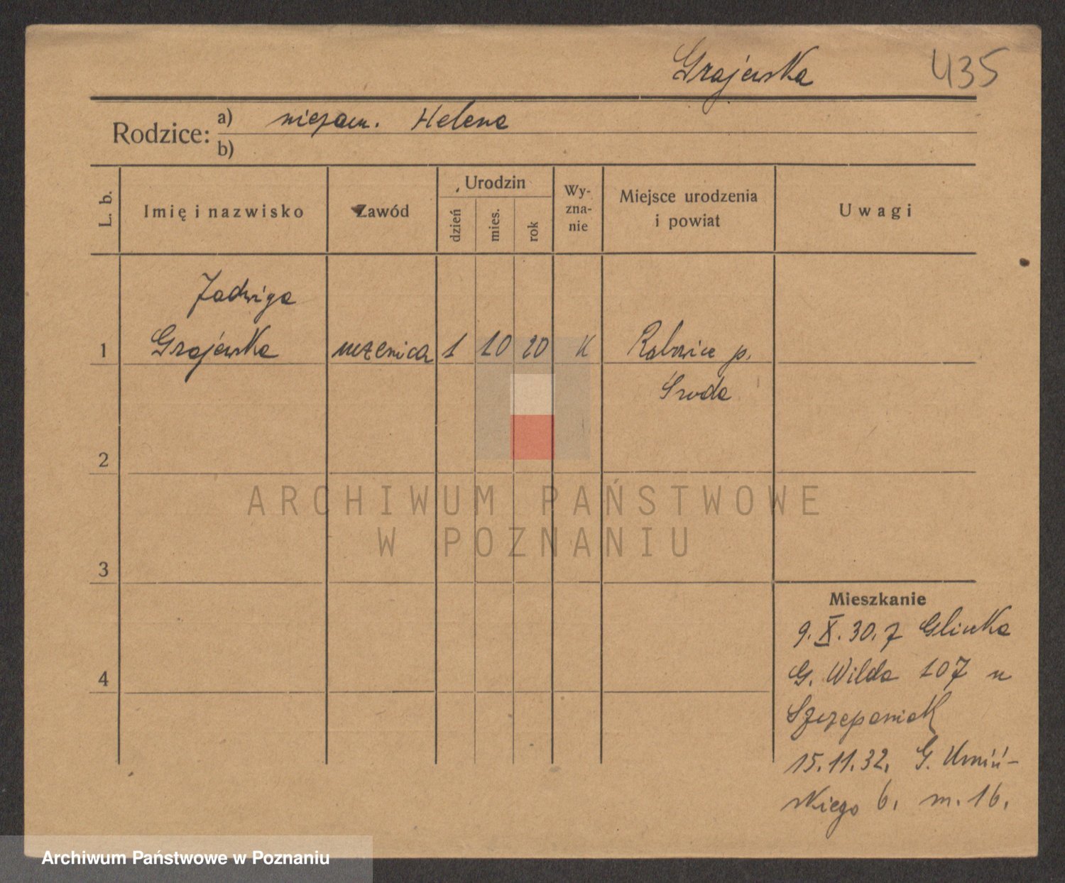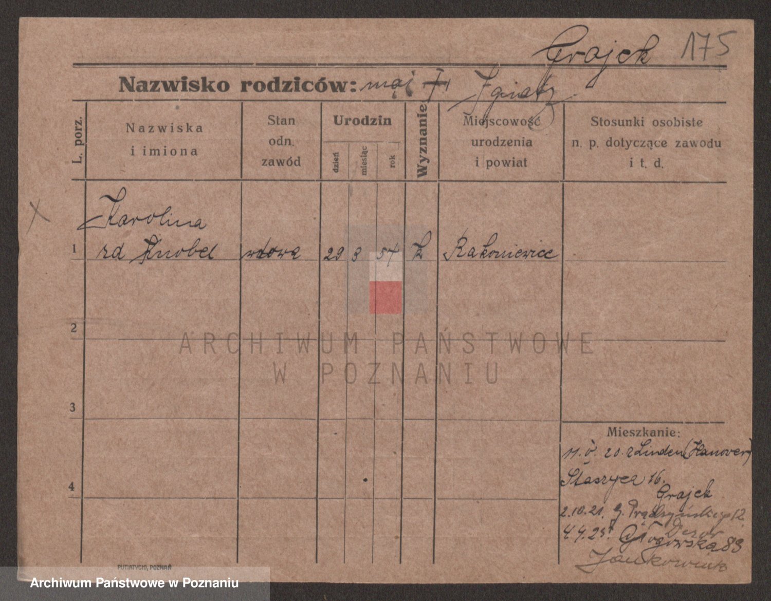 Podgląd karty osobowej dostępny jest po kliknięciu na nazwisko lub ikonkę karty. Można dokonywać powiększenia (ikony na górze) lub przechodzić między kolejnymi skanami (strzałki po bokach).