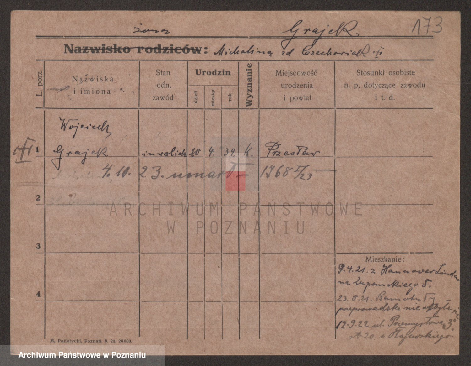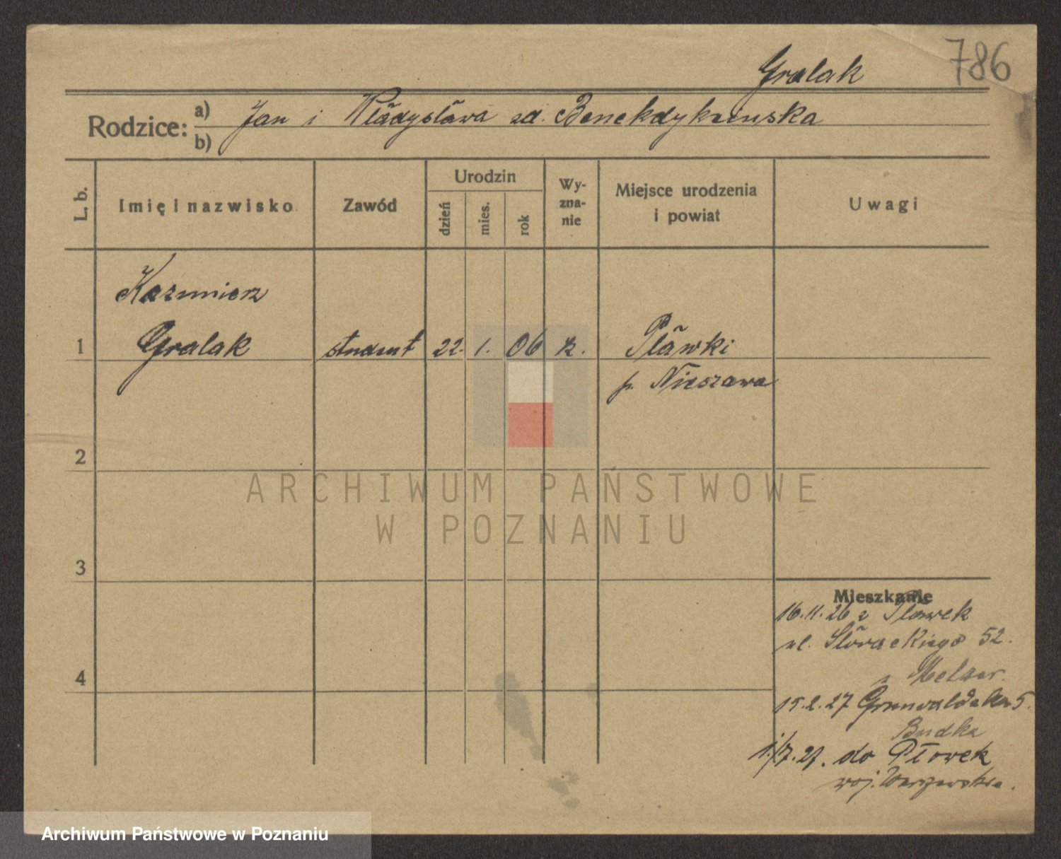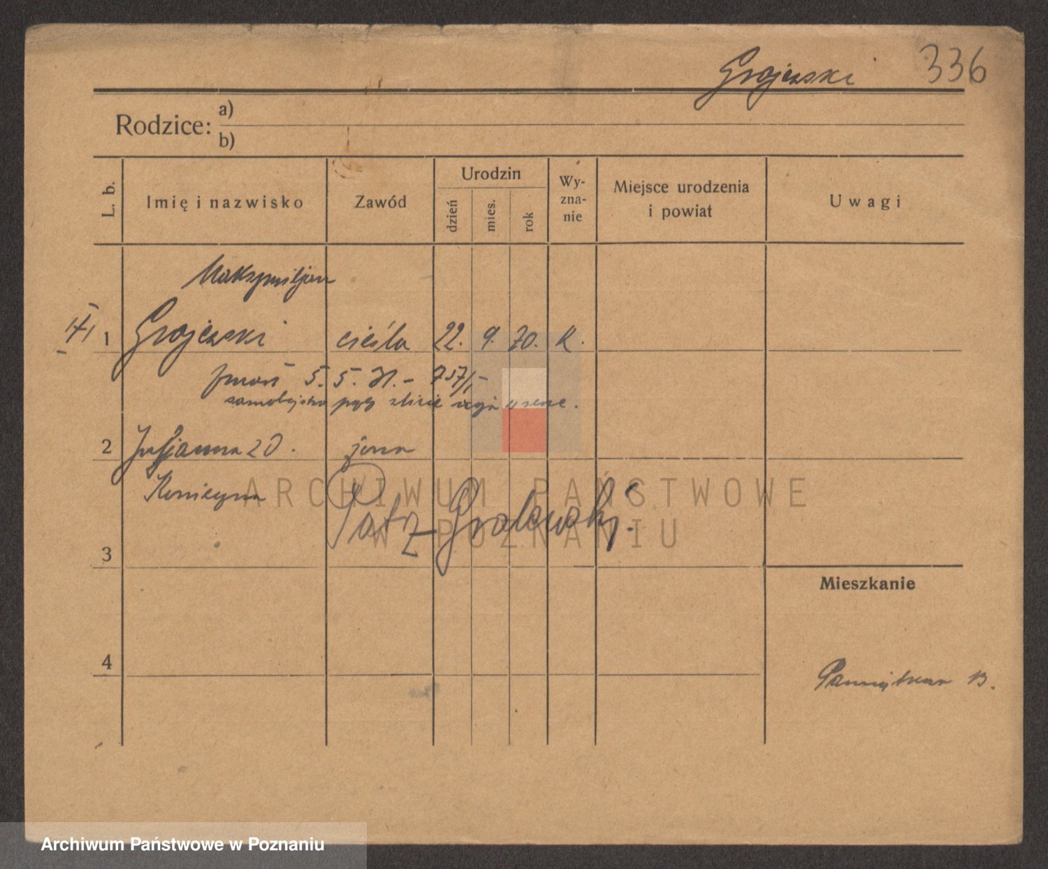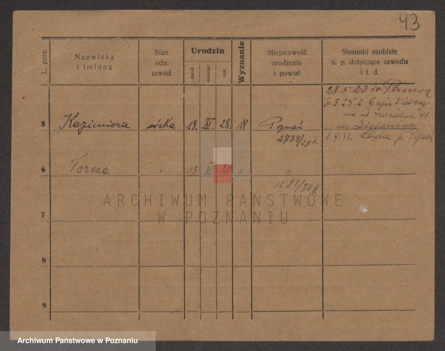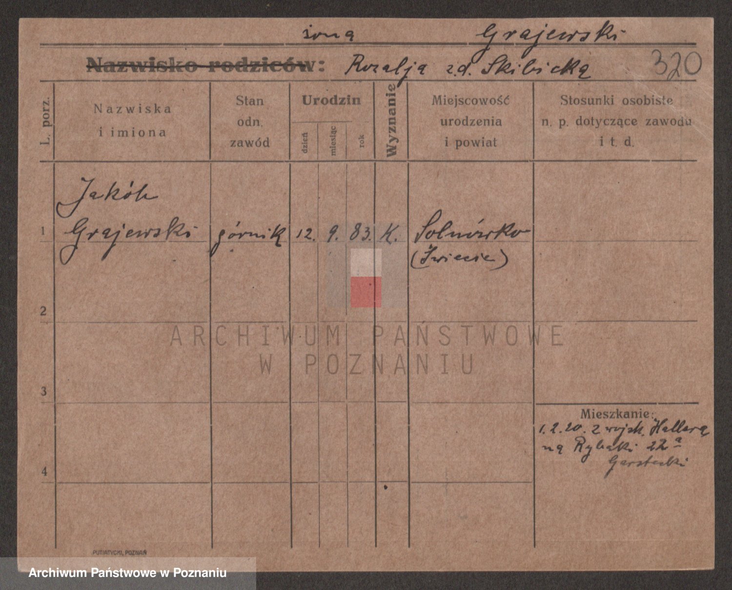 Podgląd karty osobowej dostępny jest po kliknięciu na nazwisko lub ikonkę karty. Można dokonywać powiększenia (ikony na górze) lub przechodzić między kolejnymi skanami (strzałki po bokach).