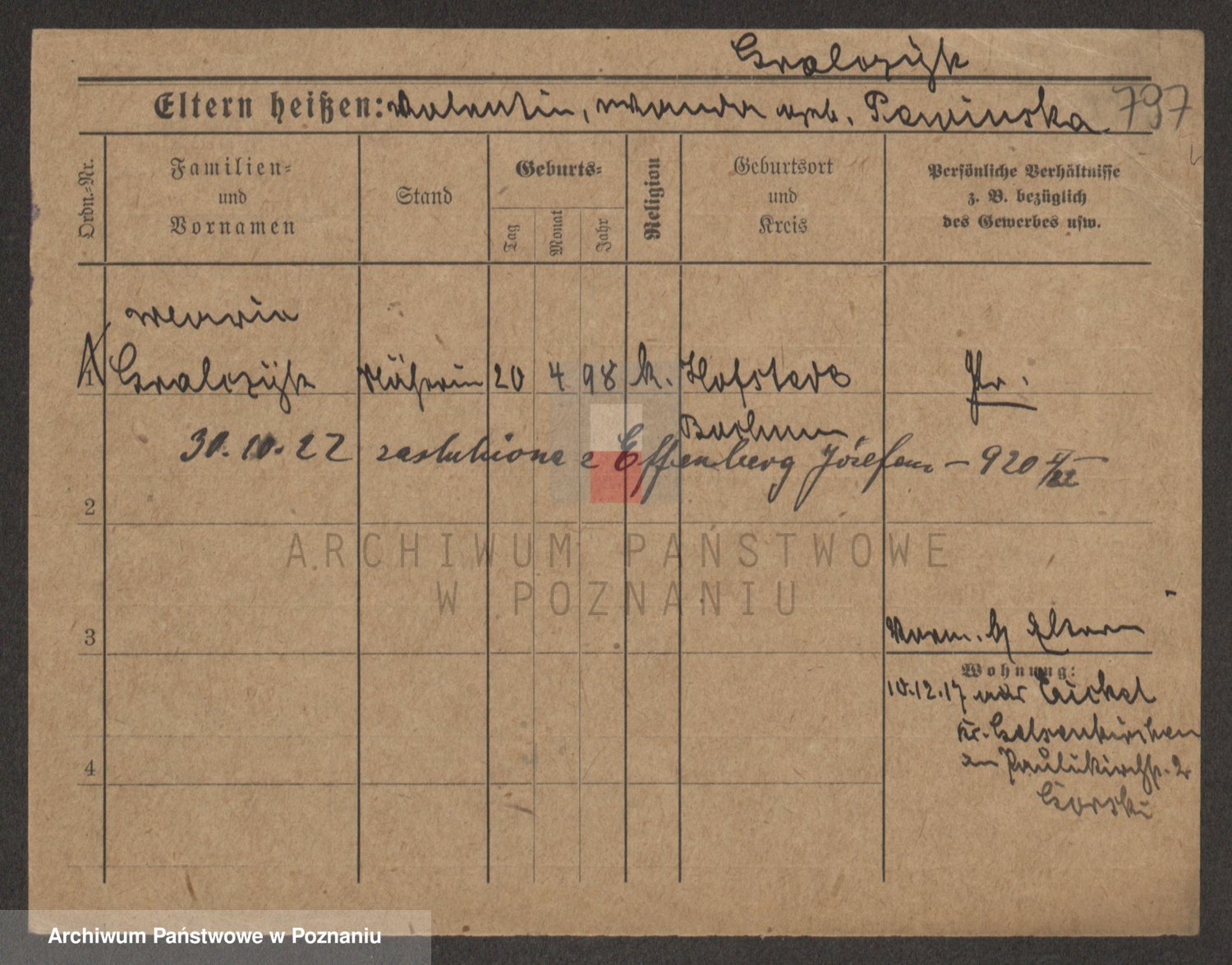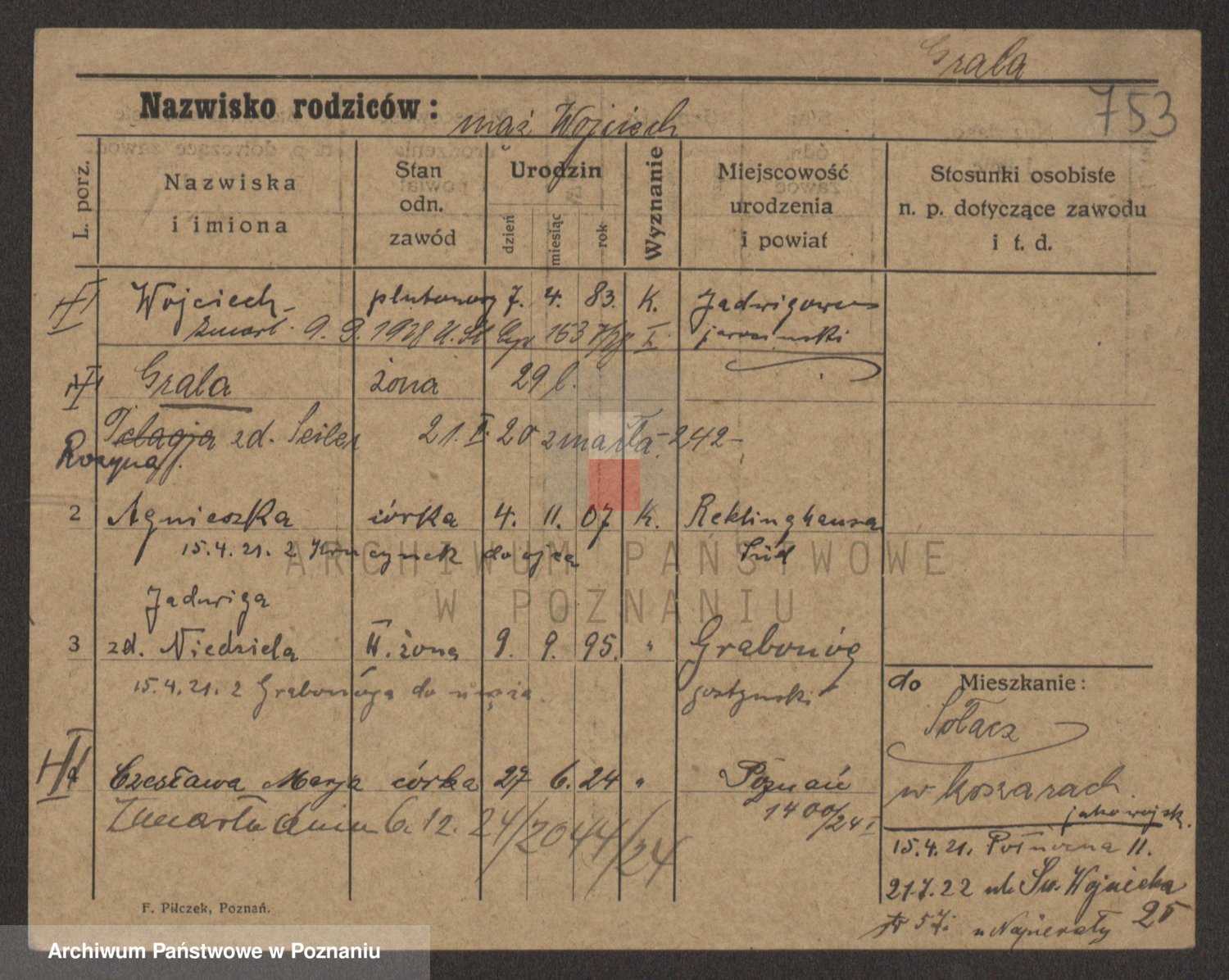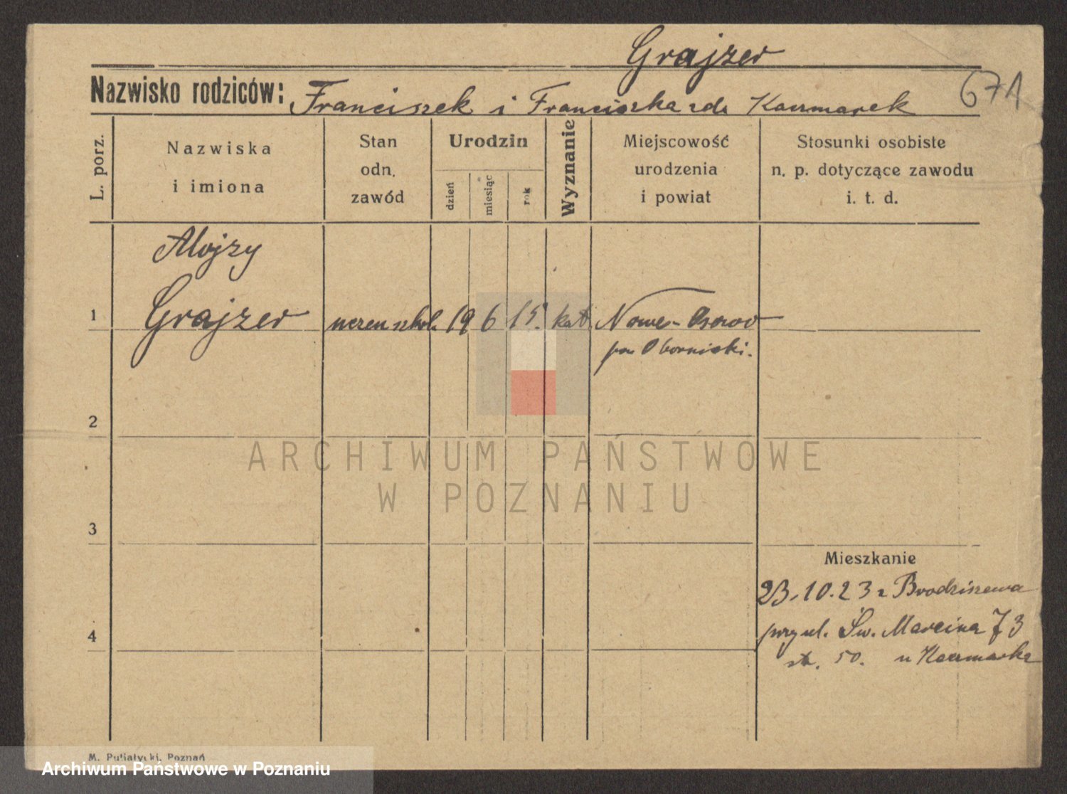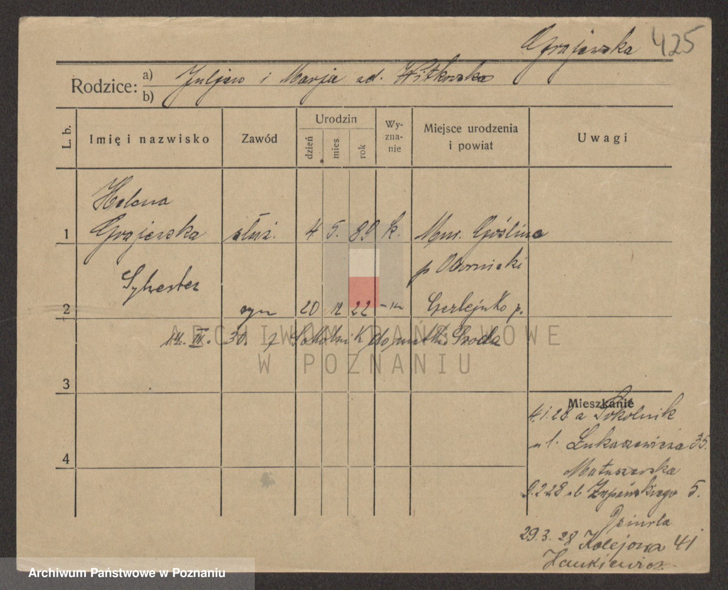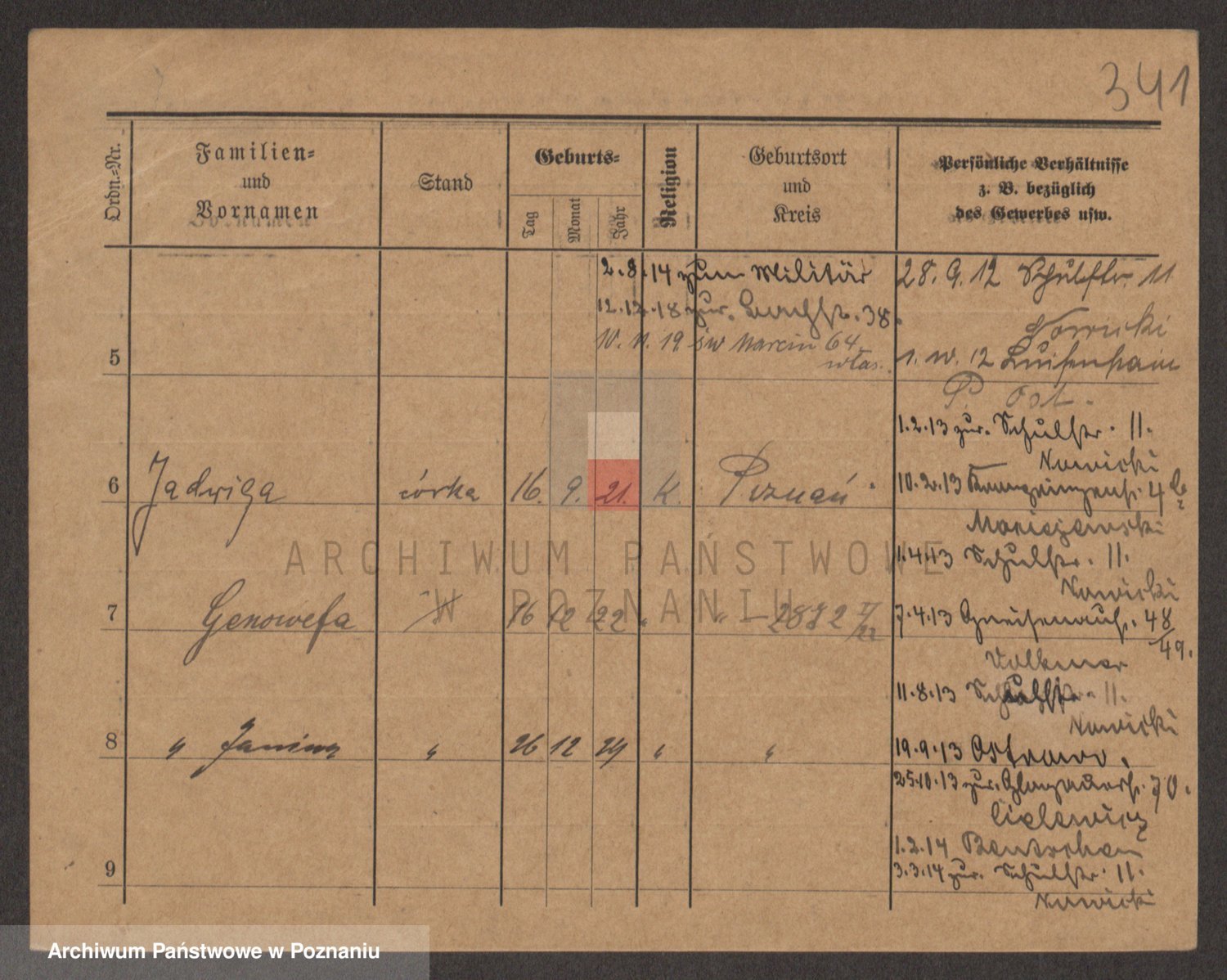 Podgląd karty osobowej dostępny jest po kliknięciu na nazwisko lub ikonkę karty. Można dokonywać powiększenia (ikony na górze) lub przechodzić między kolejnymi skanami (strzałki po bokach).
