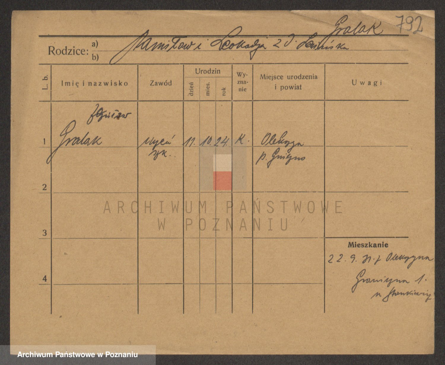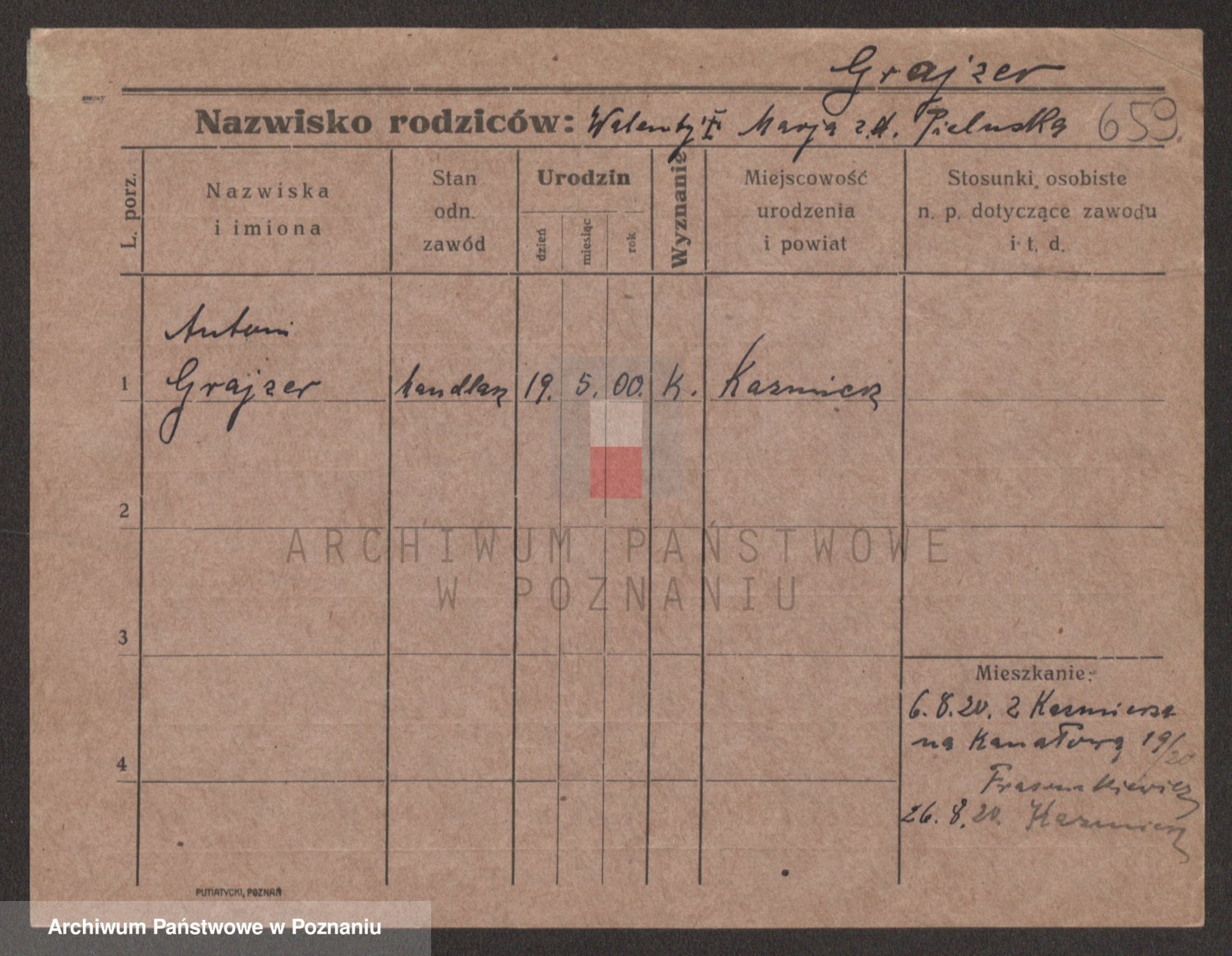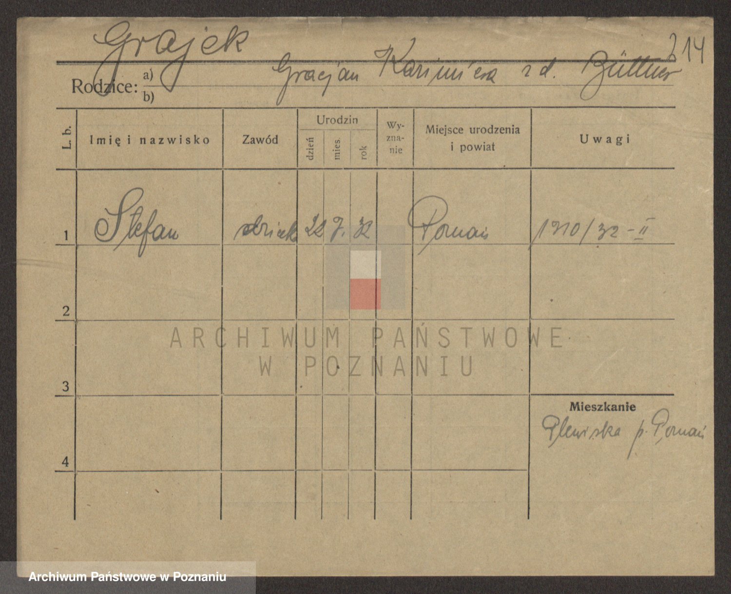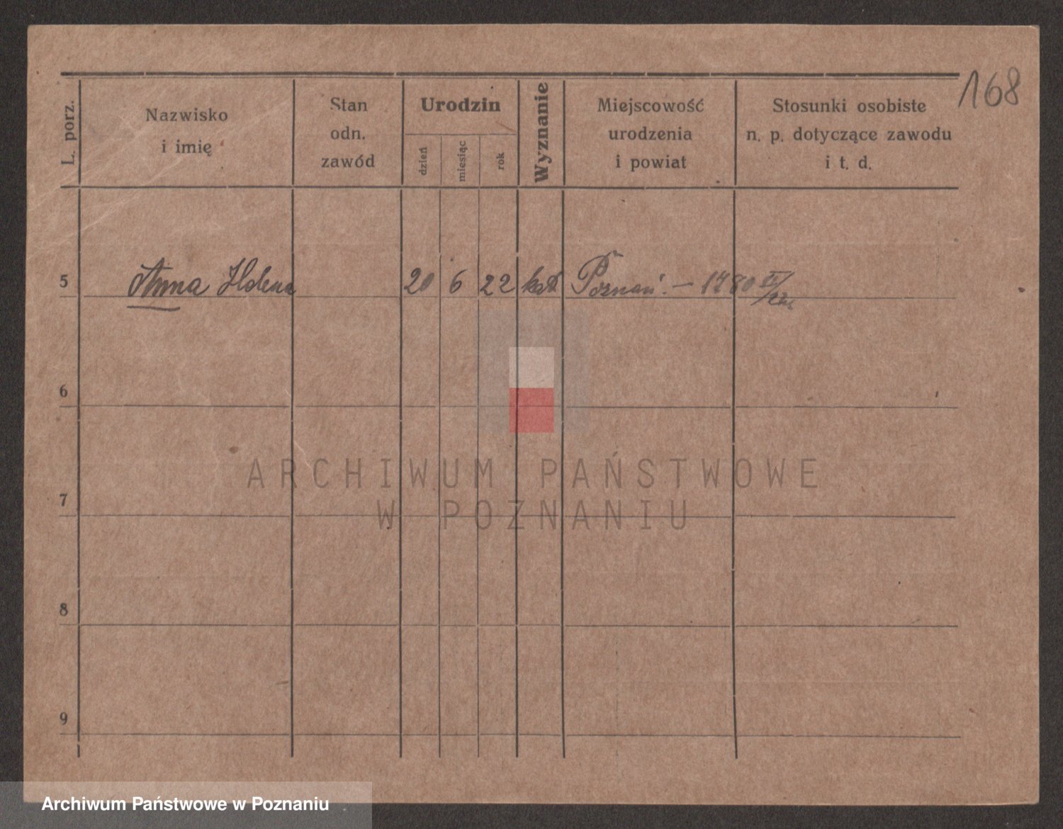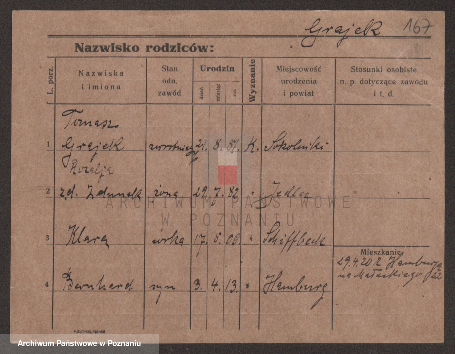 Podgląd karty osobowej dostępny jest po kliknięciu na nazwisko lub ikonkę karty. Można dokonywać powiększenia (ikony na górze) lub przechodzić między kolejnymi skanami (strzałki po bokach).