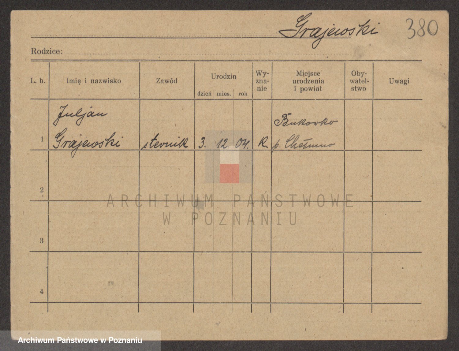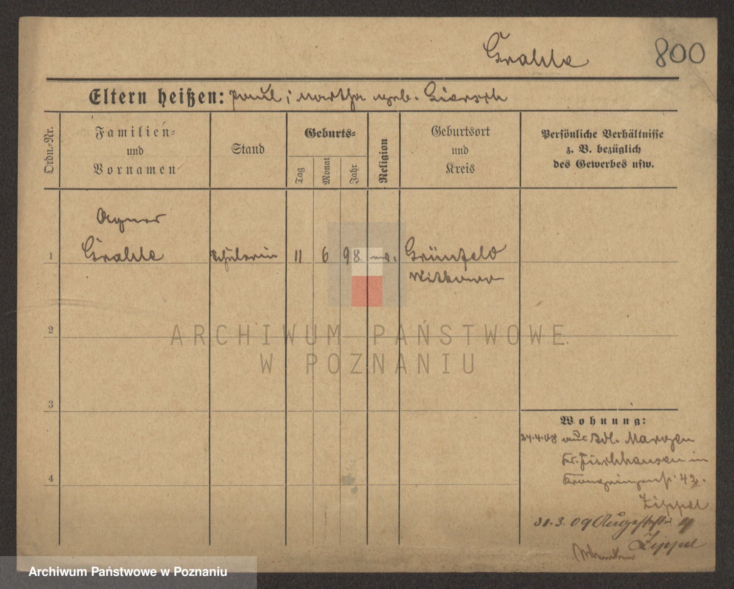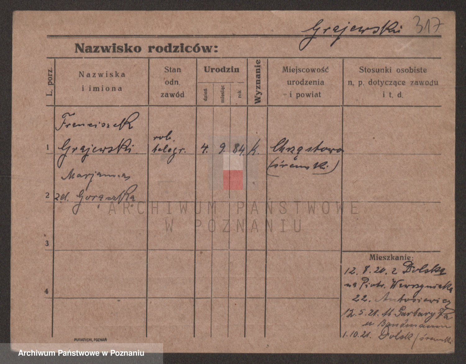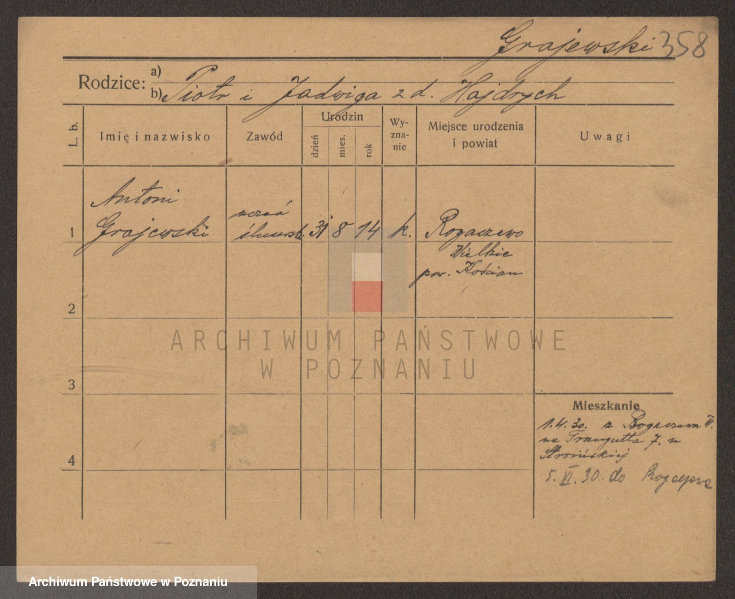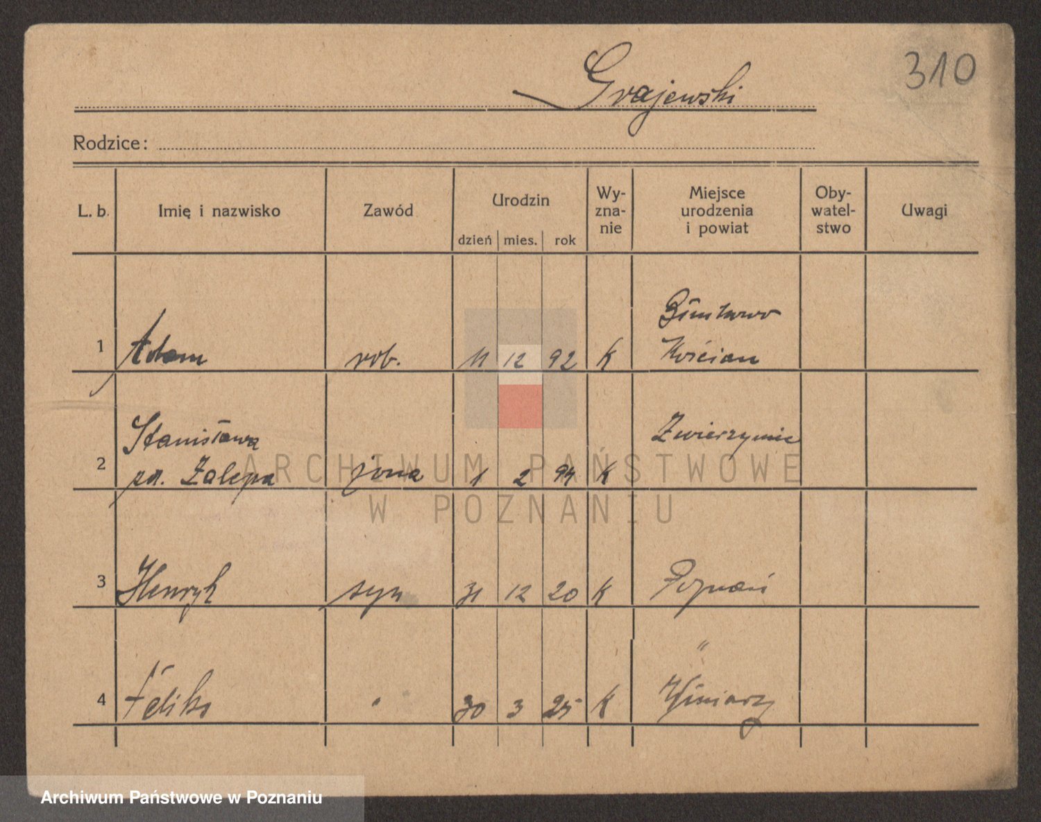 Podgląd karty osobowej dostępny jest po kliknięciu na nazwisko lub ikonkę karty. Można dokonywać powiększenia (ikony na górze) lub przechodzić między kolejnymi skanami (strzałki po bokach).