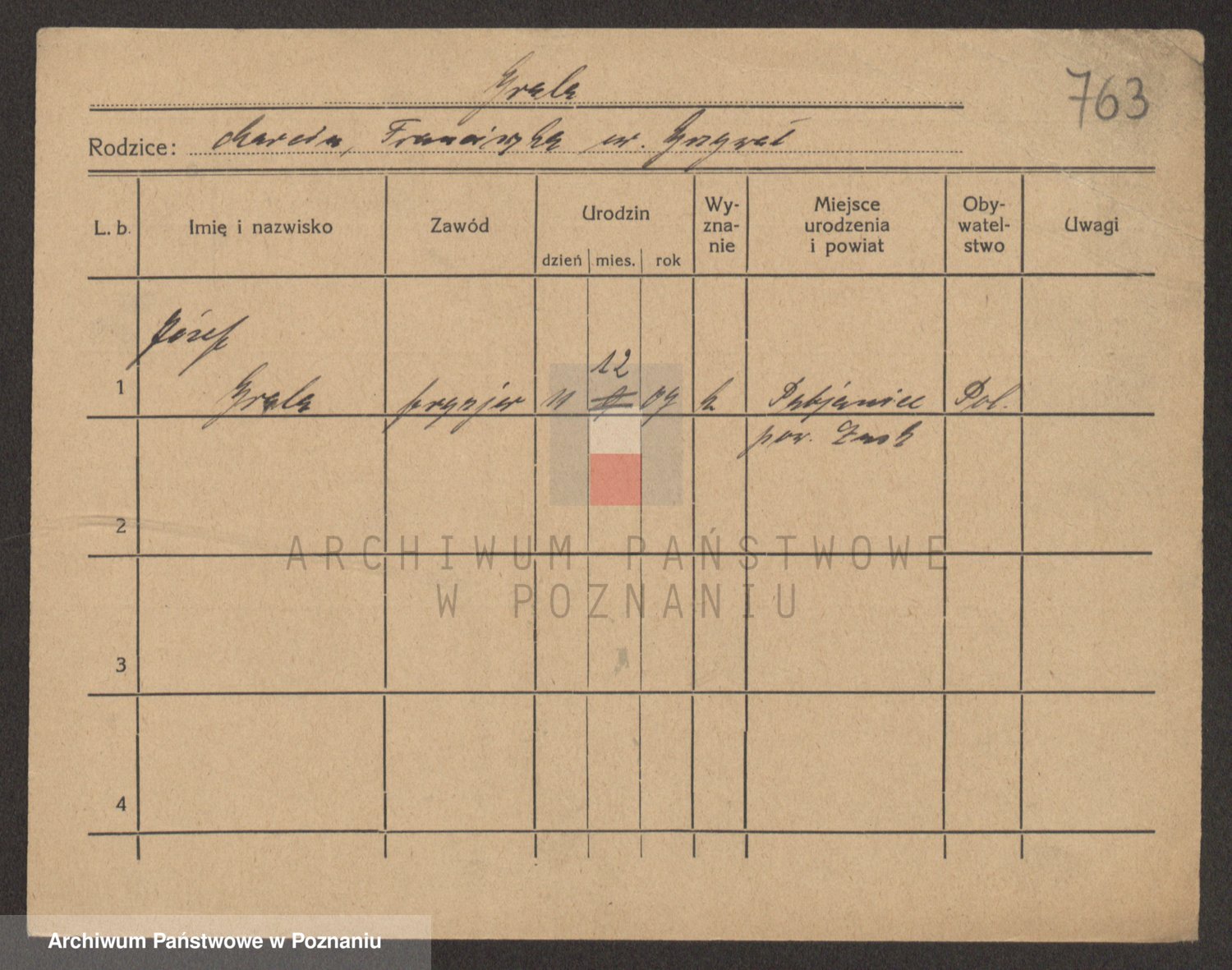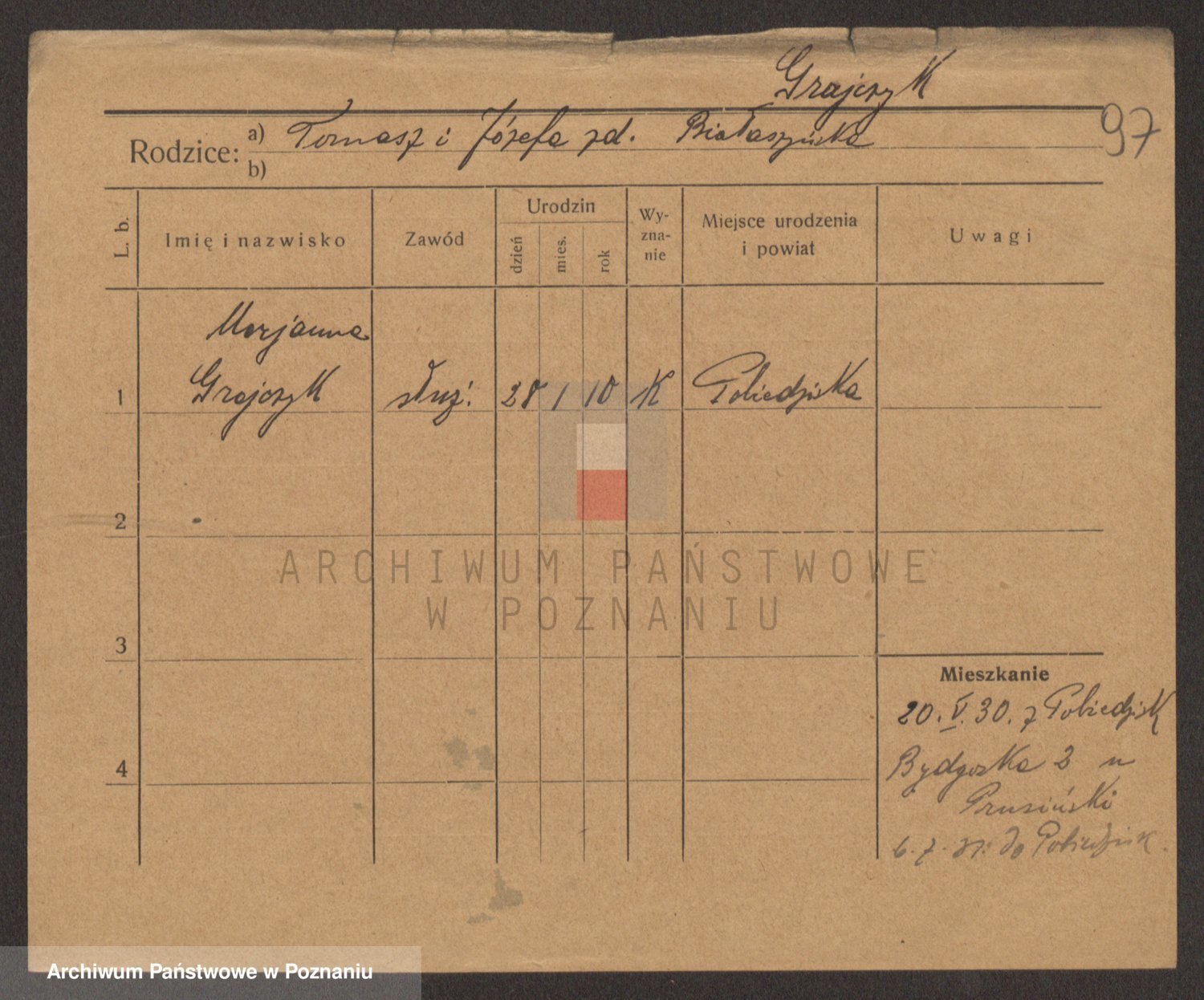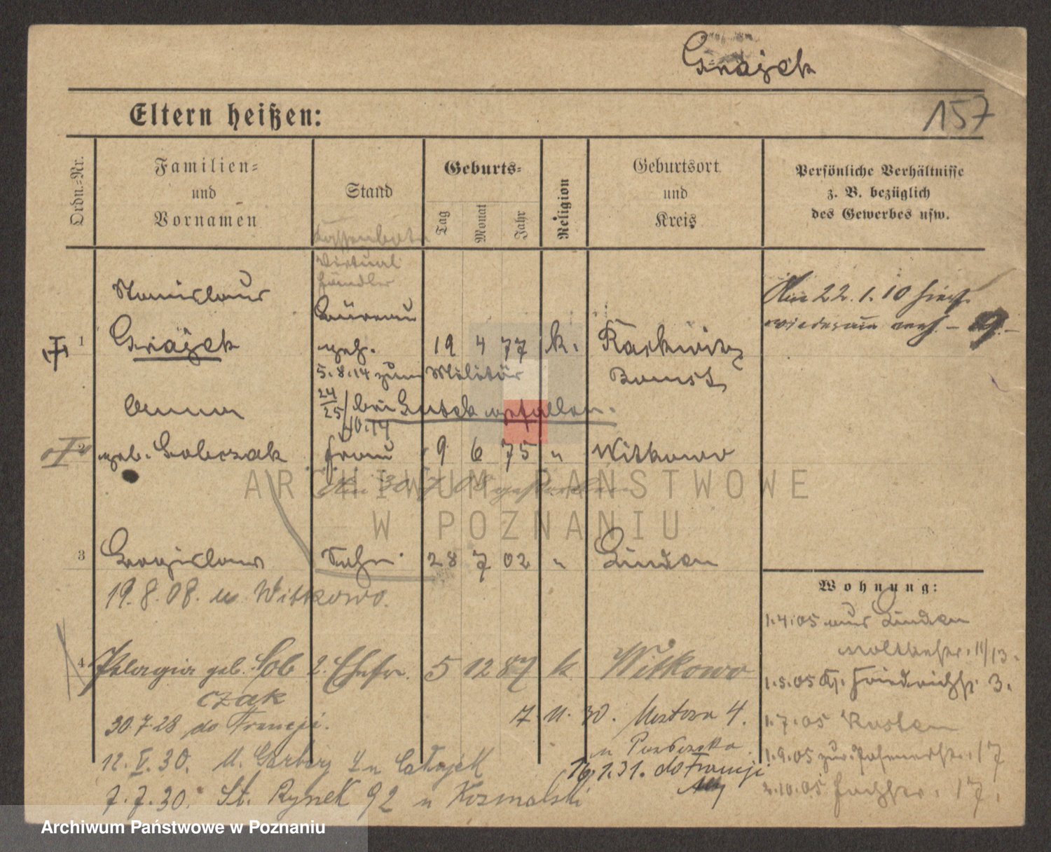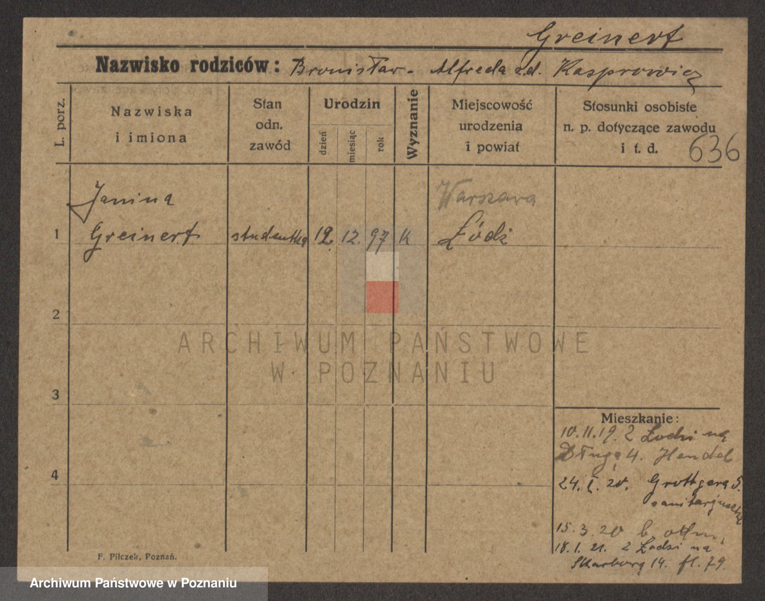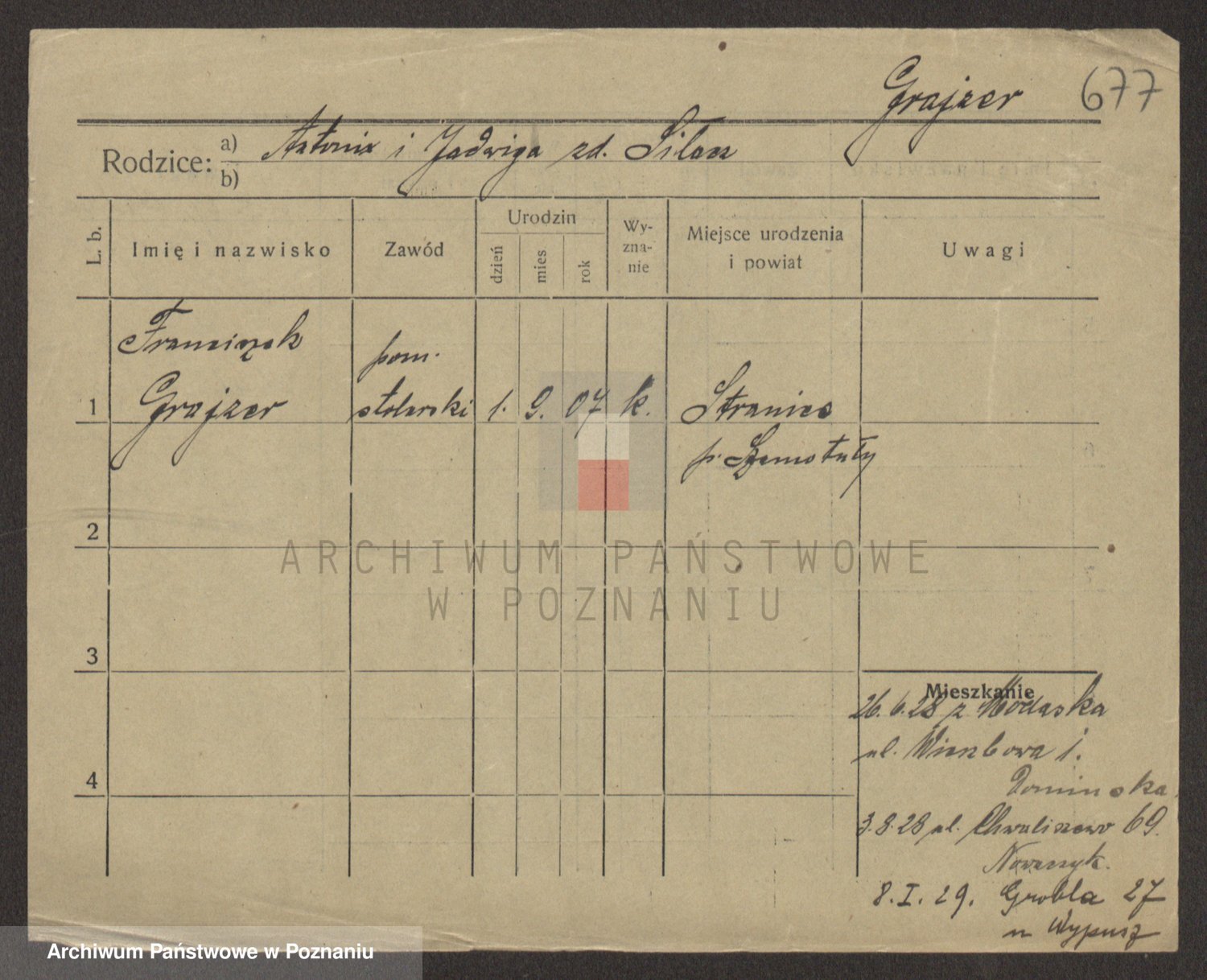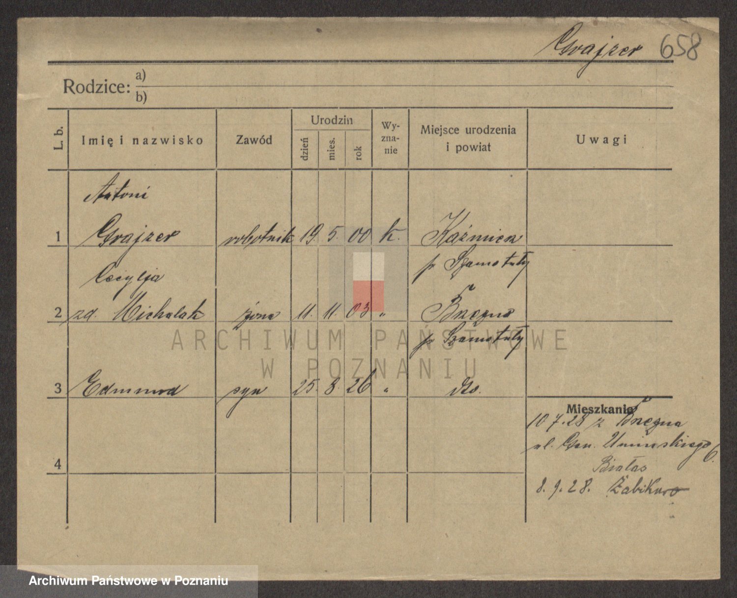 Podgląd karty osobowej dostępny jest po kliknięciu na nazwisko lub ikonkę karty. Można dokonywać powiększenia (ikony na górze) lub przechodzić między kolejnymi skanami (strzałki po bokach).