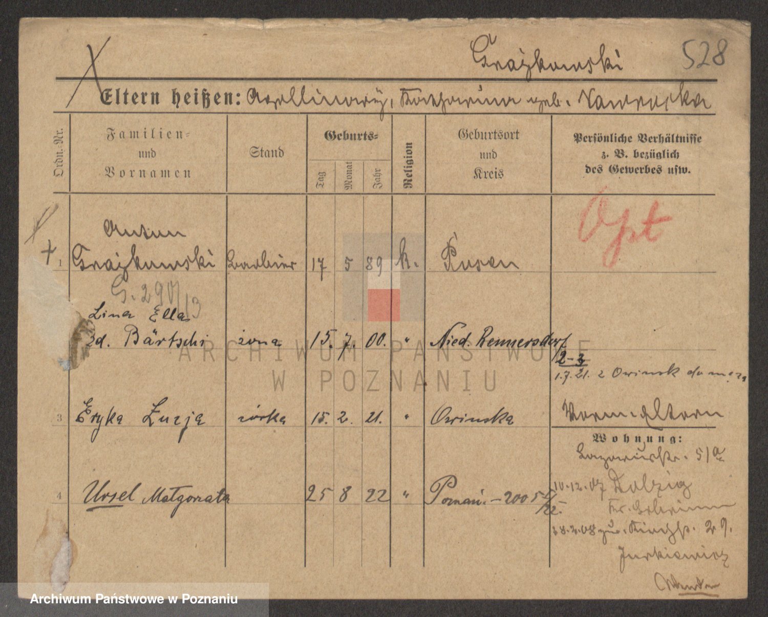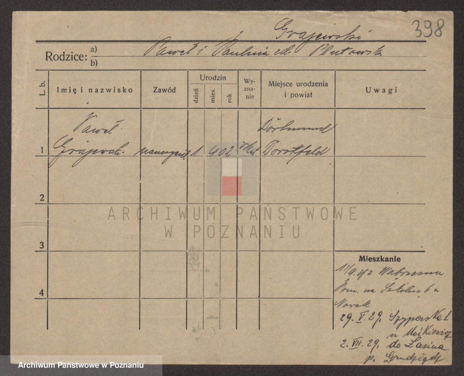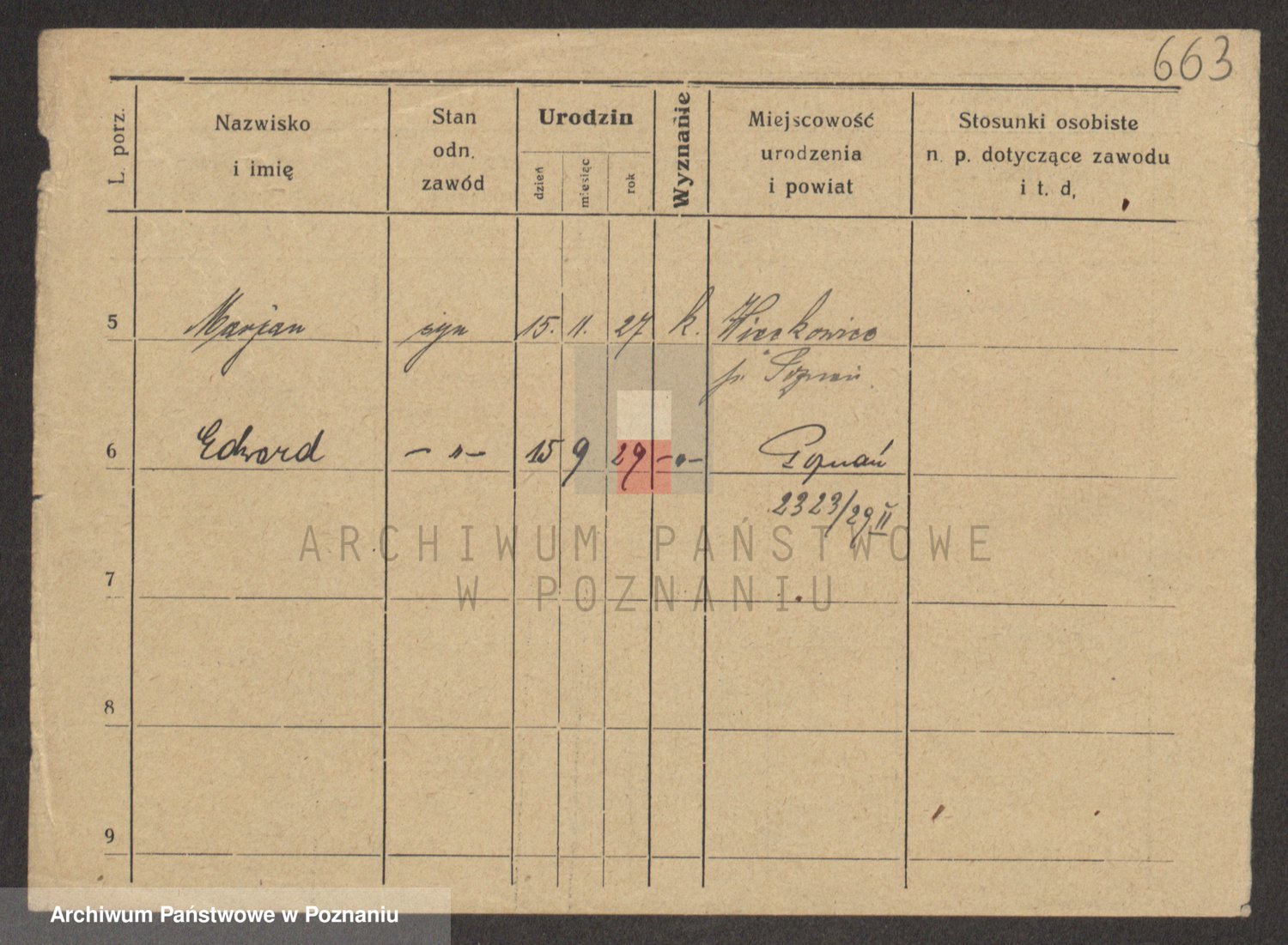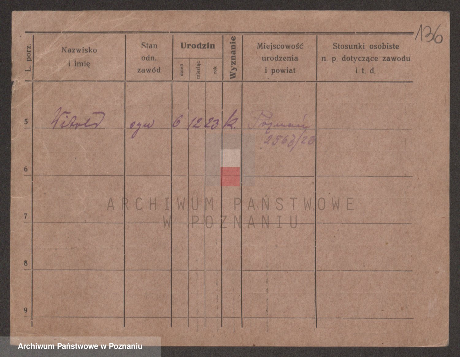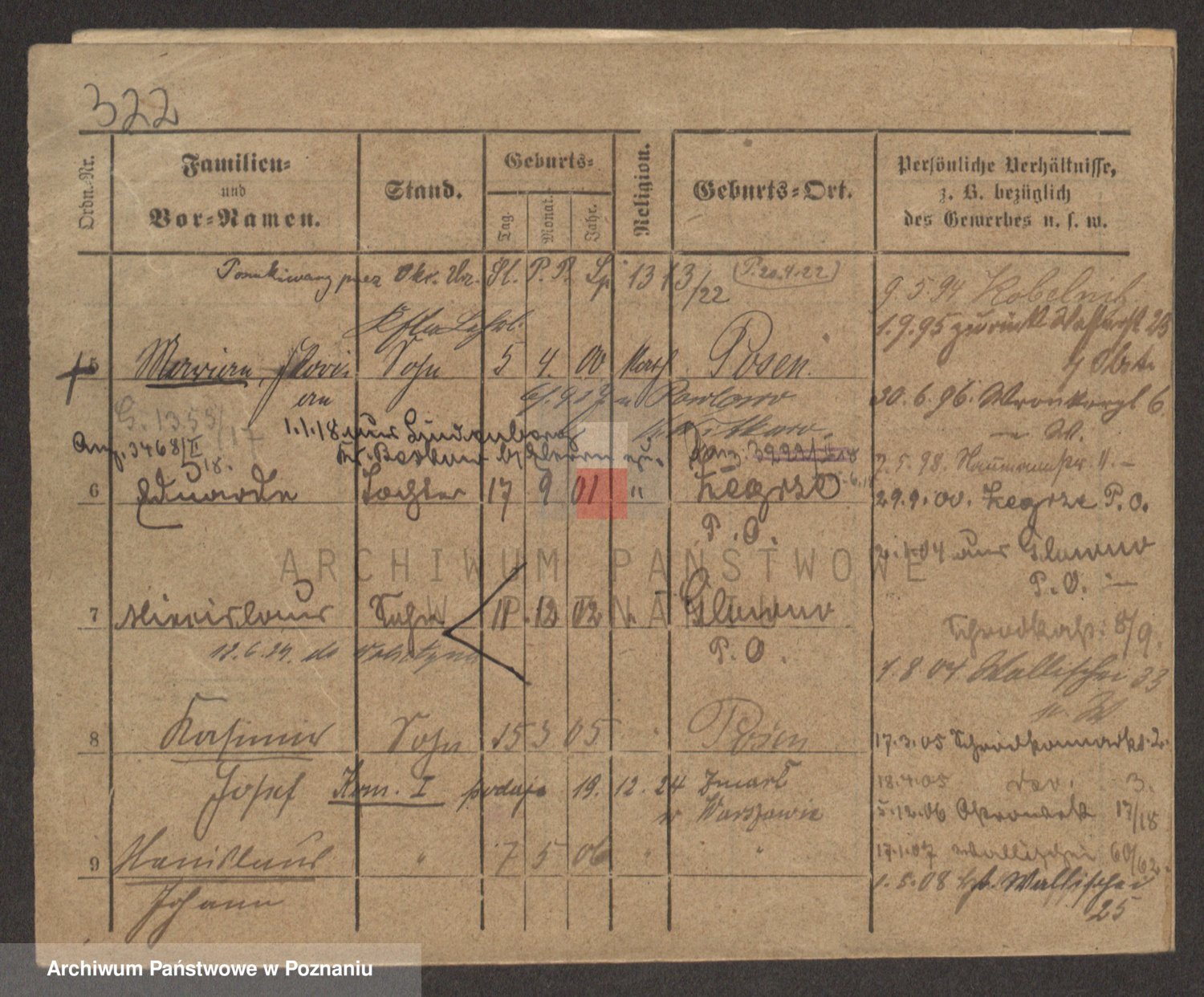Podgląd karty osobowej dostępny jest po kliknięciu na nazwisko lub ikonkę karty. Można dokonywać powiększenia (ikony na górze) lub przechodzić między kolejnymi skanami (strzałki po bokach).