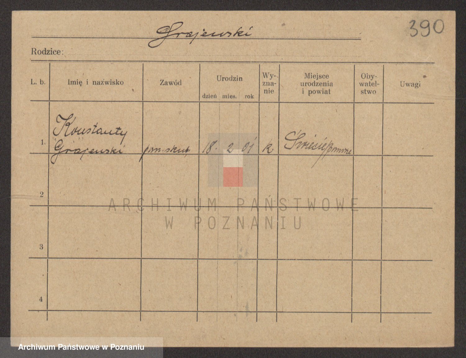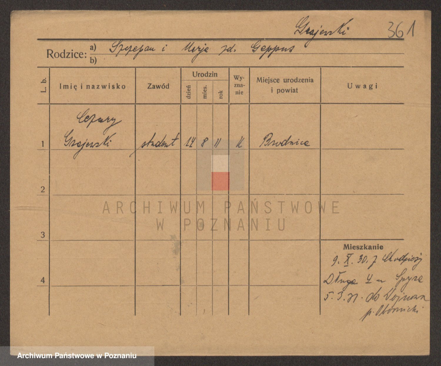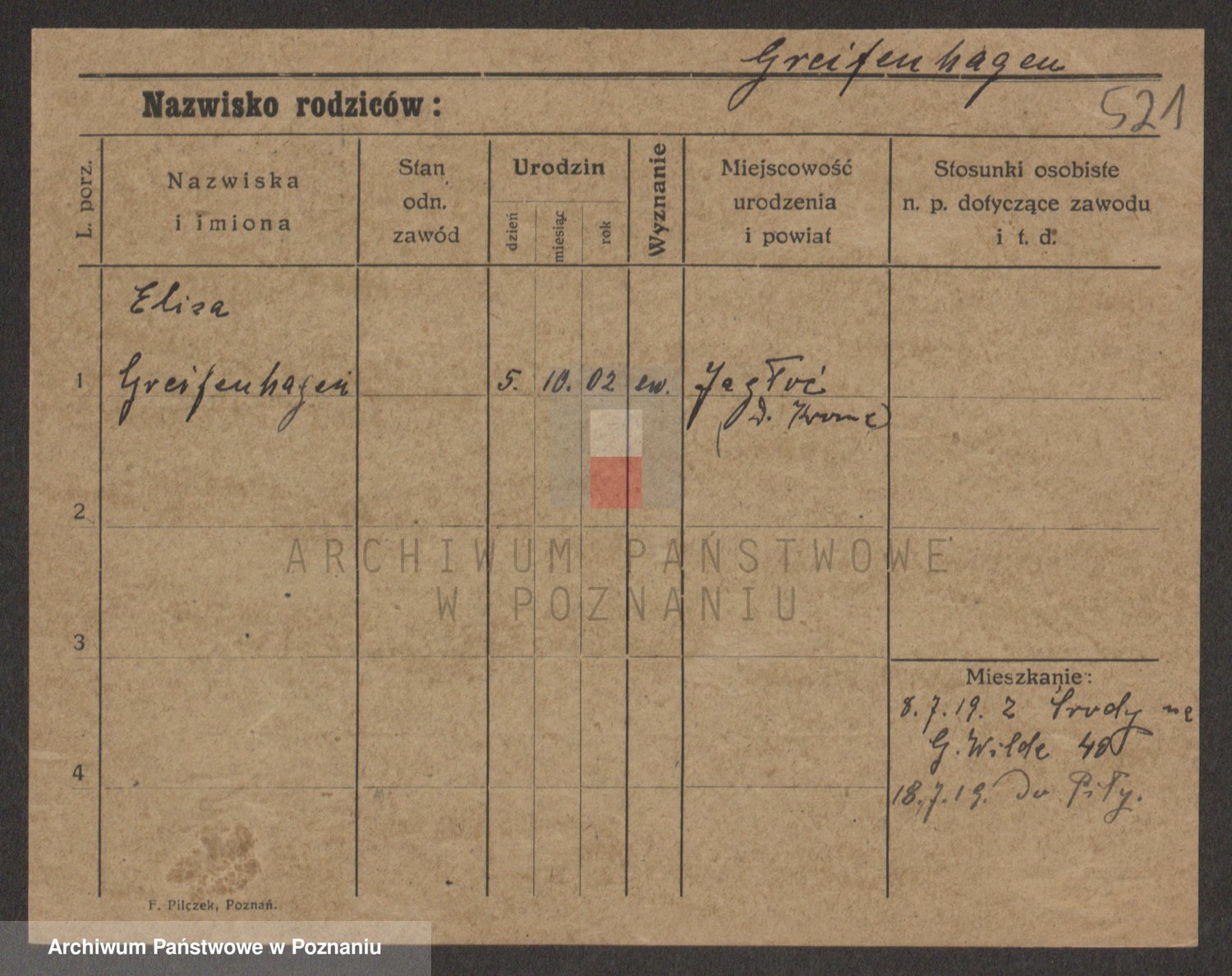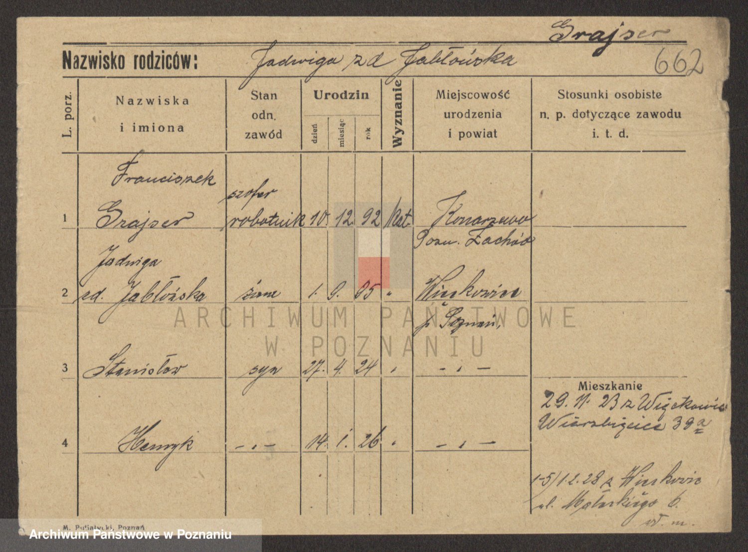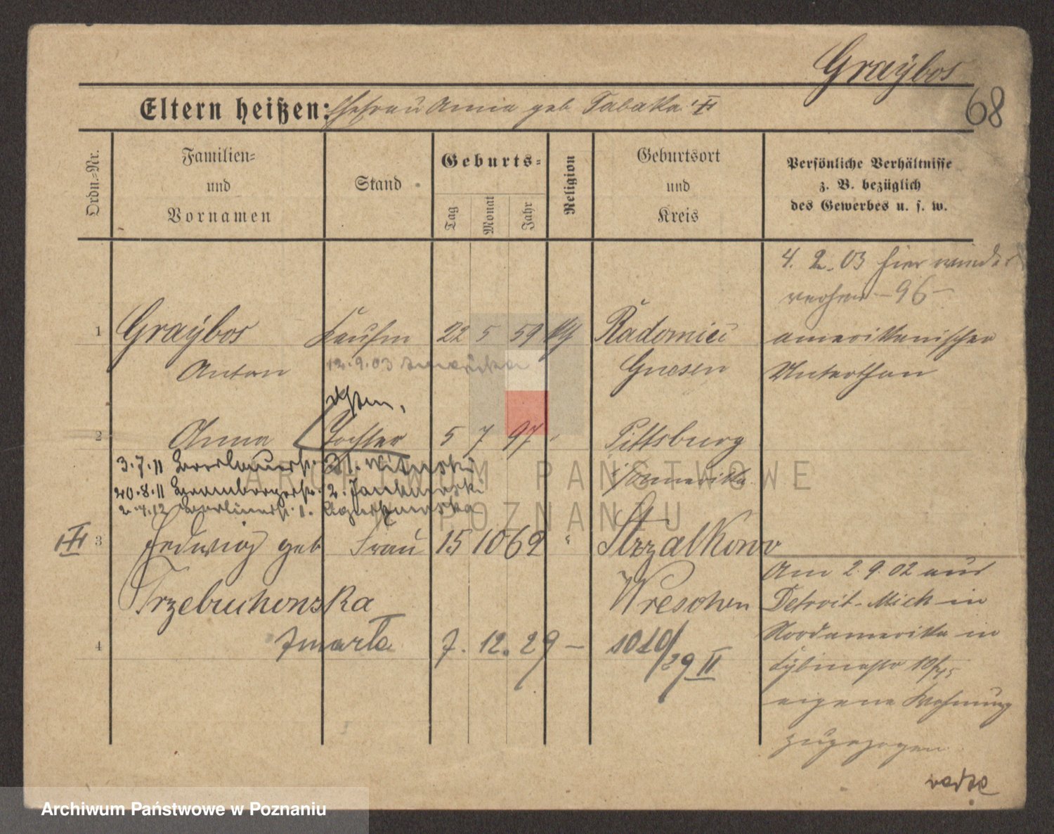 Podgląd karty osobowej dostępny jest po kliknięciu na nazwisko lub ikonkę karty. Można dokonywać powiększenia (ikony na górze) lub przechodzić między kolejnymi skanami (strzałki po bokach).
