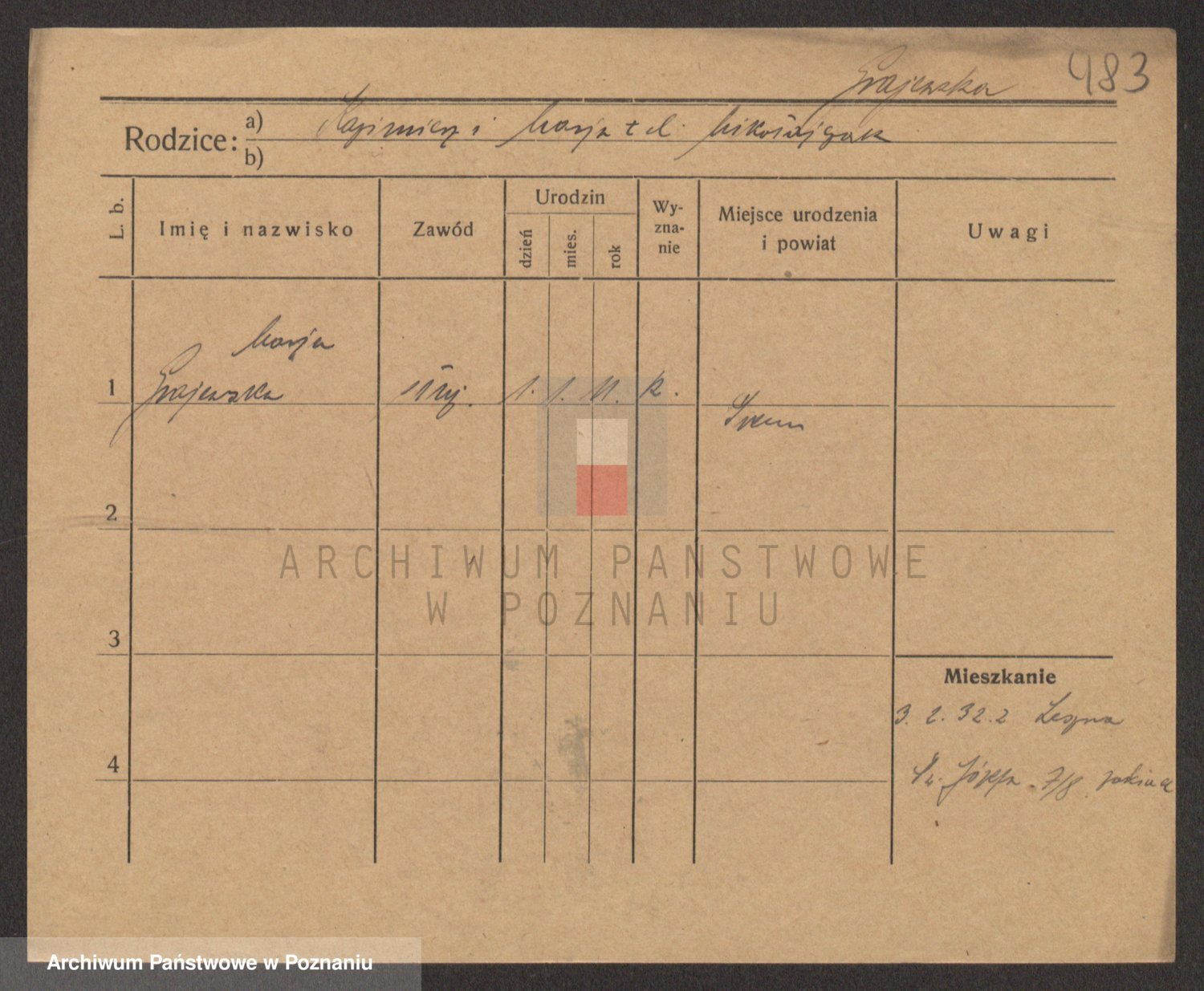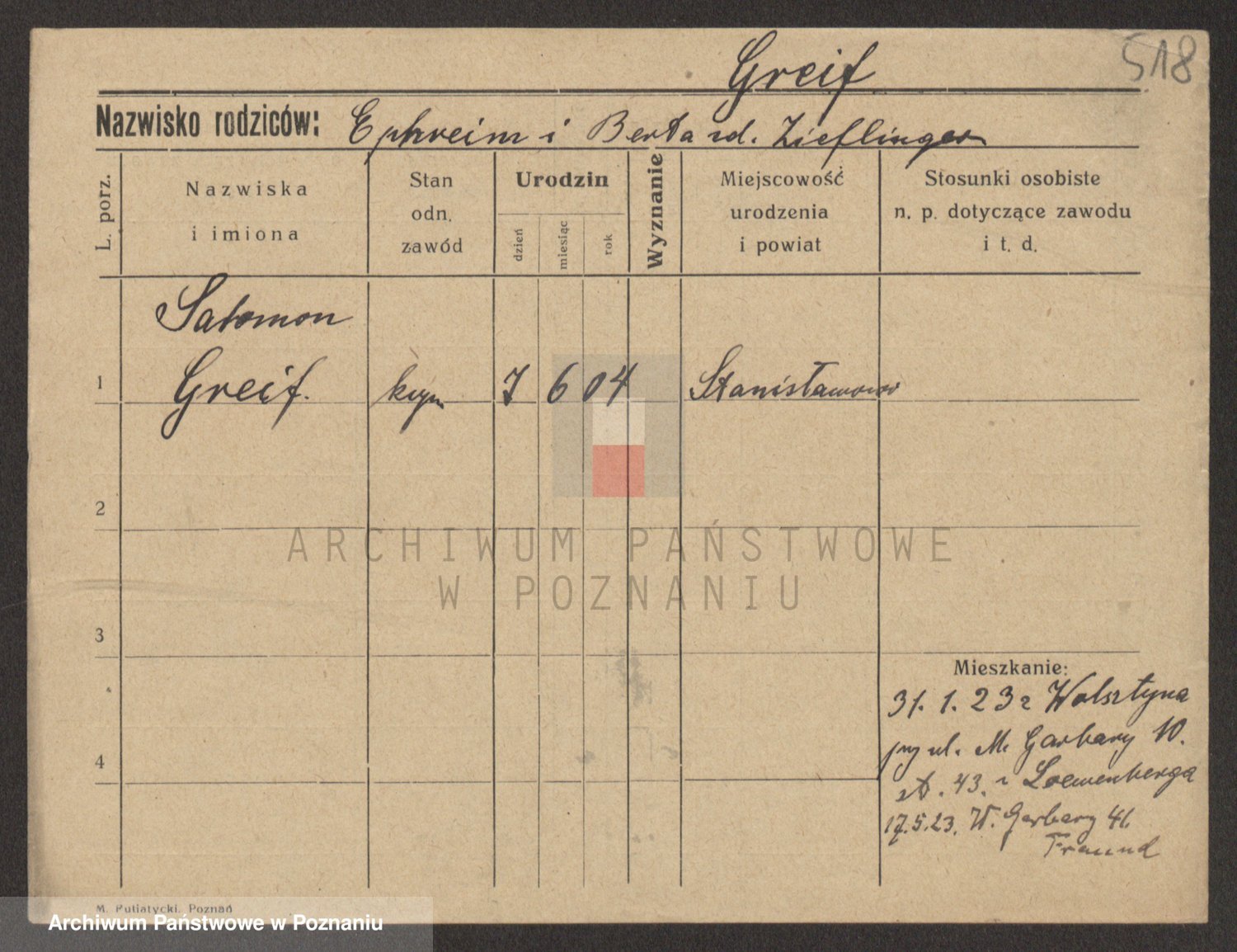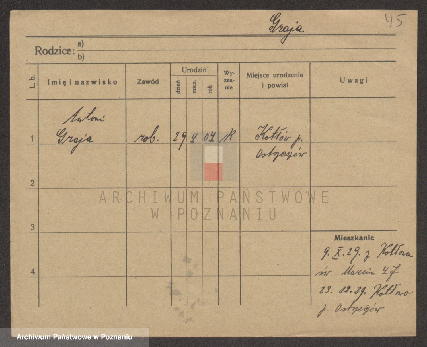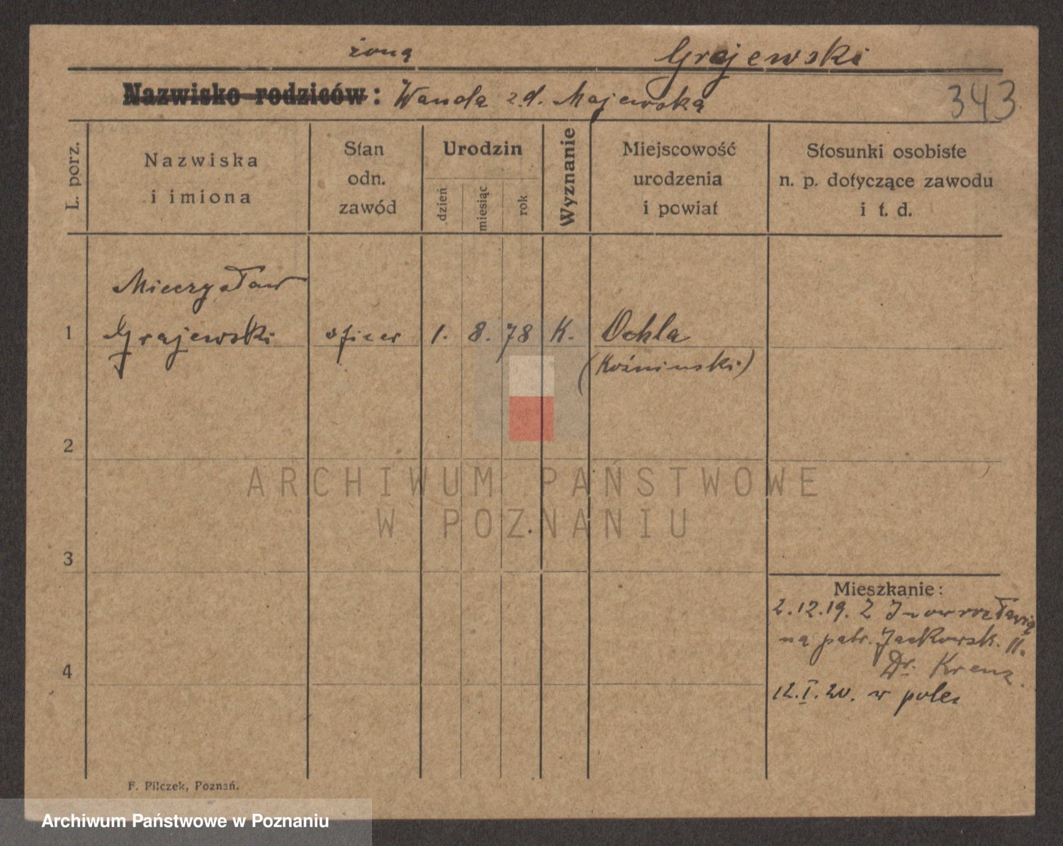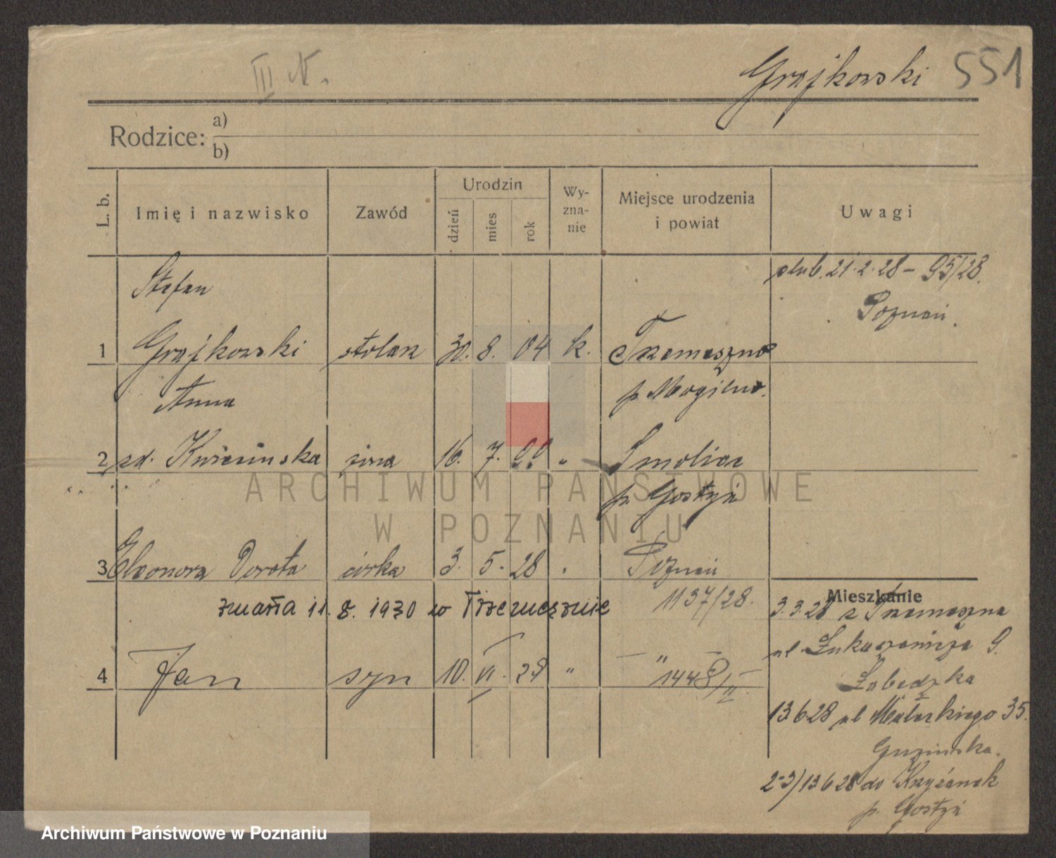 Podgląd karty osobowej dostępny jest po kliknięciu na nazwisko lub ikonkę karty. Można dokonywać powiększenia (ikony na górze) lub przechodzić między kolejnymi skanami (strzałki po bokach).