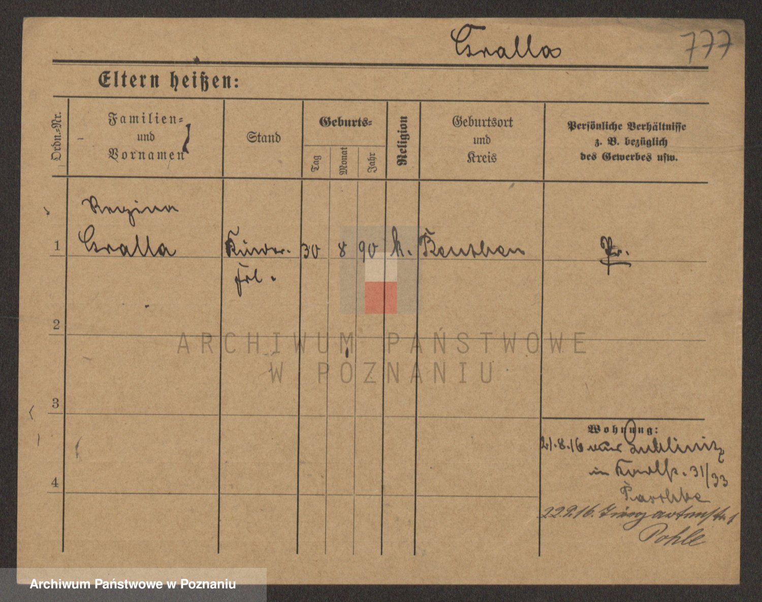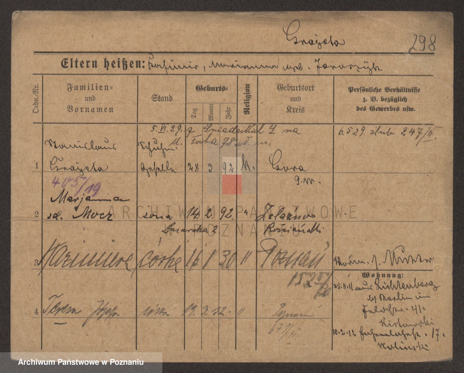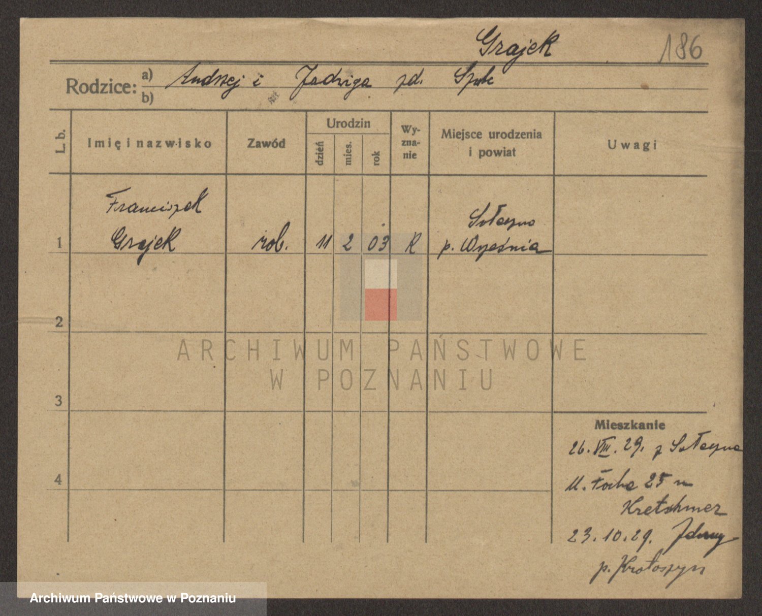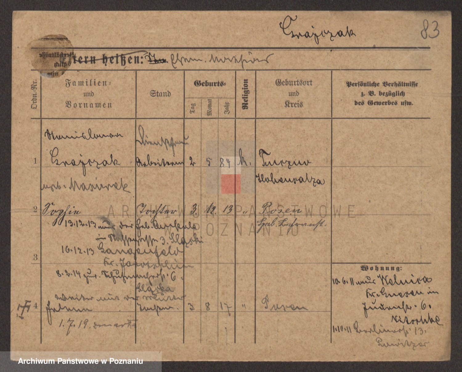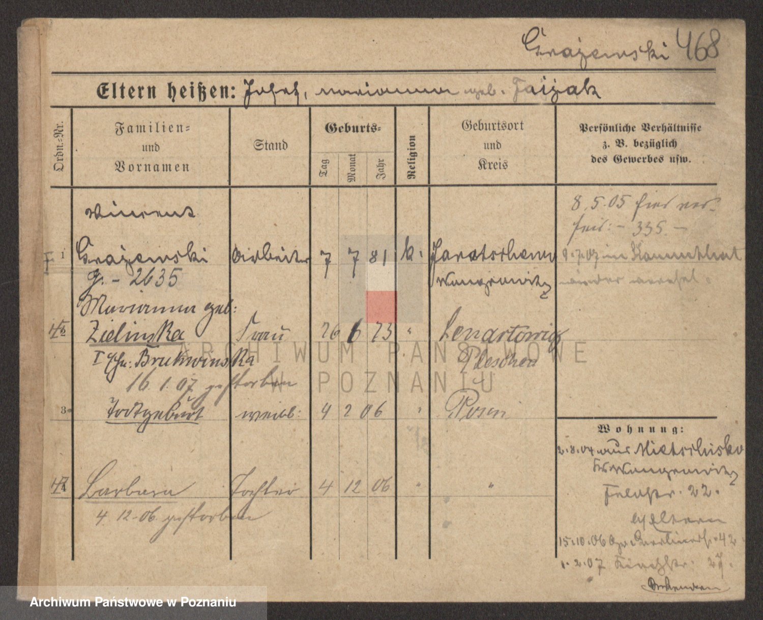 Podgląd karty osobowej dostępny jest po kliknięciu na nazwisko lub ikonkę karty. Można dokonywać powiększenia (ikony na górze) lub przechodzić między kolejnymi skanami (strzałki po bokach).