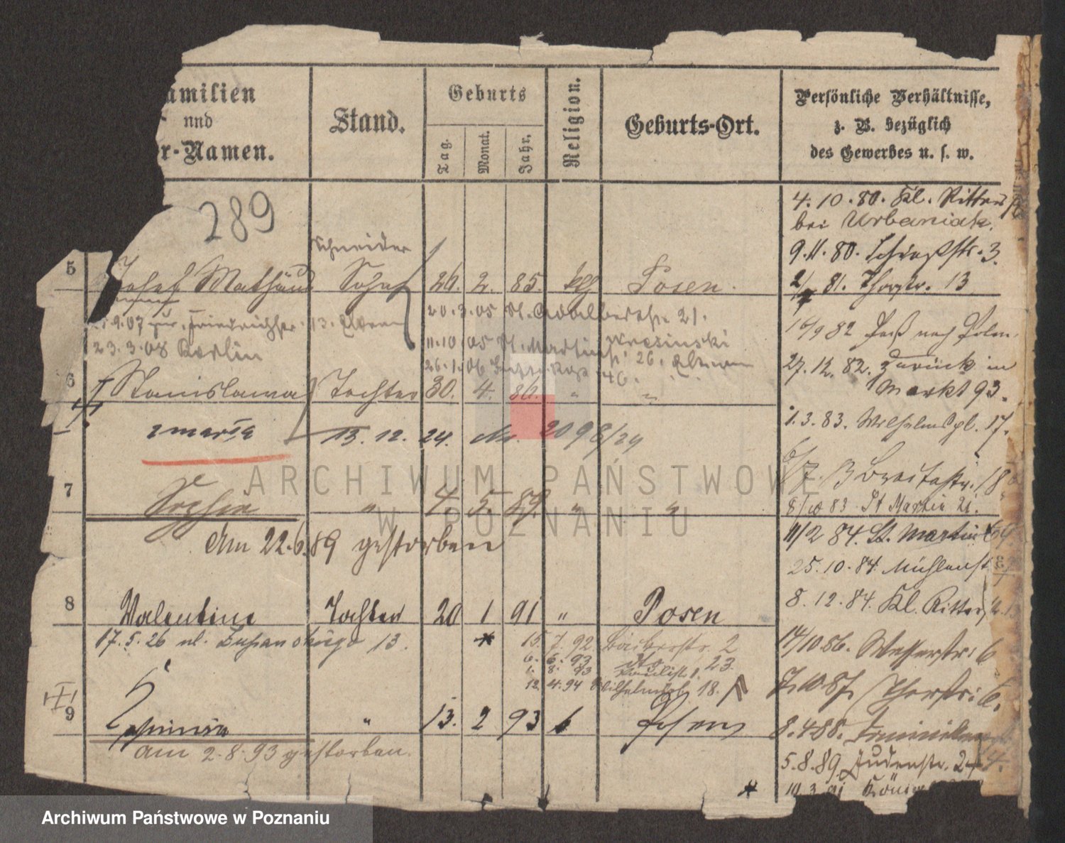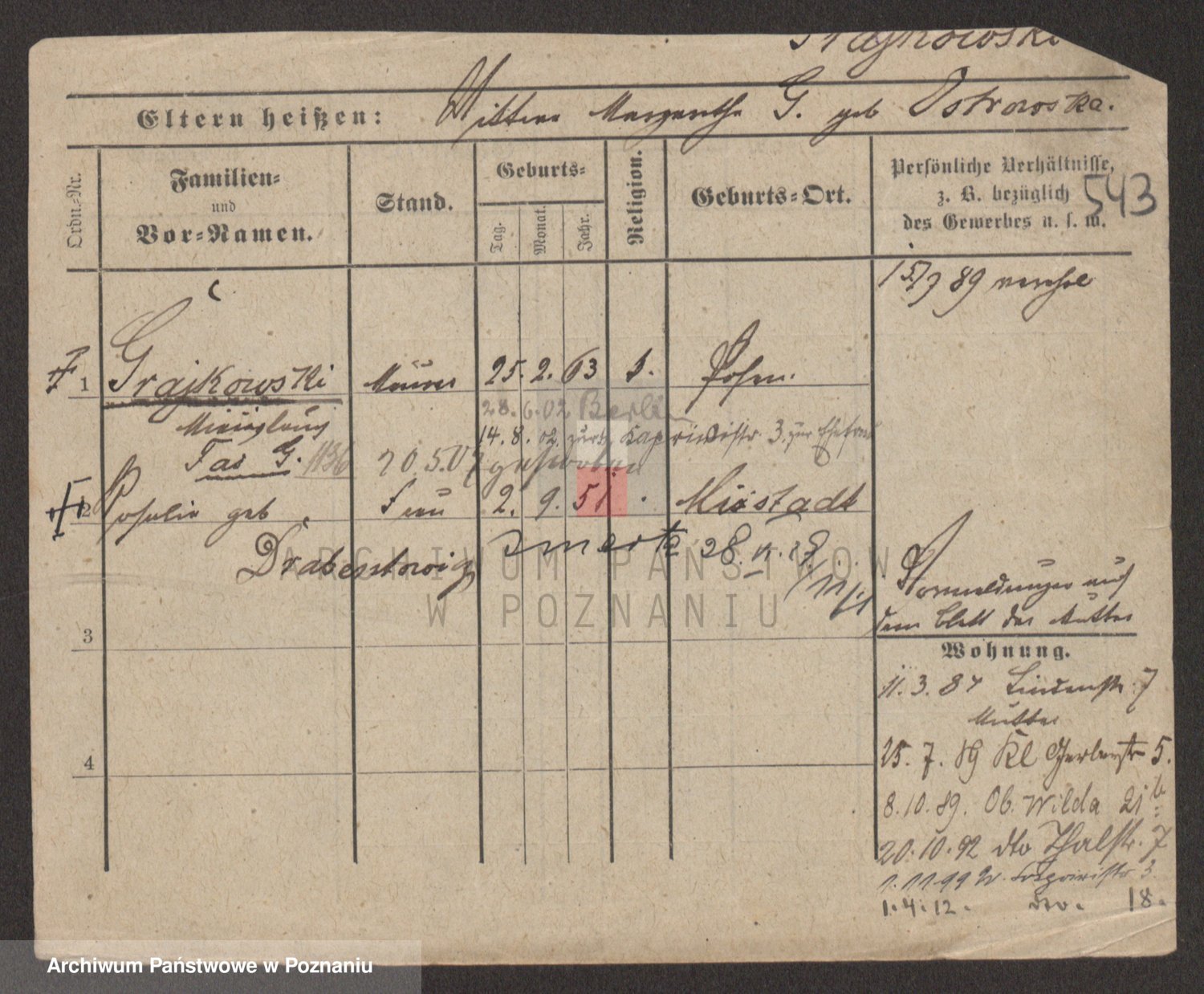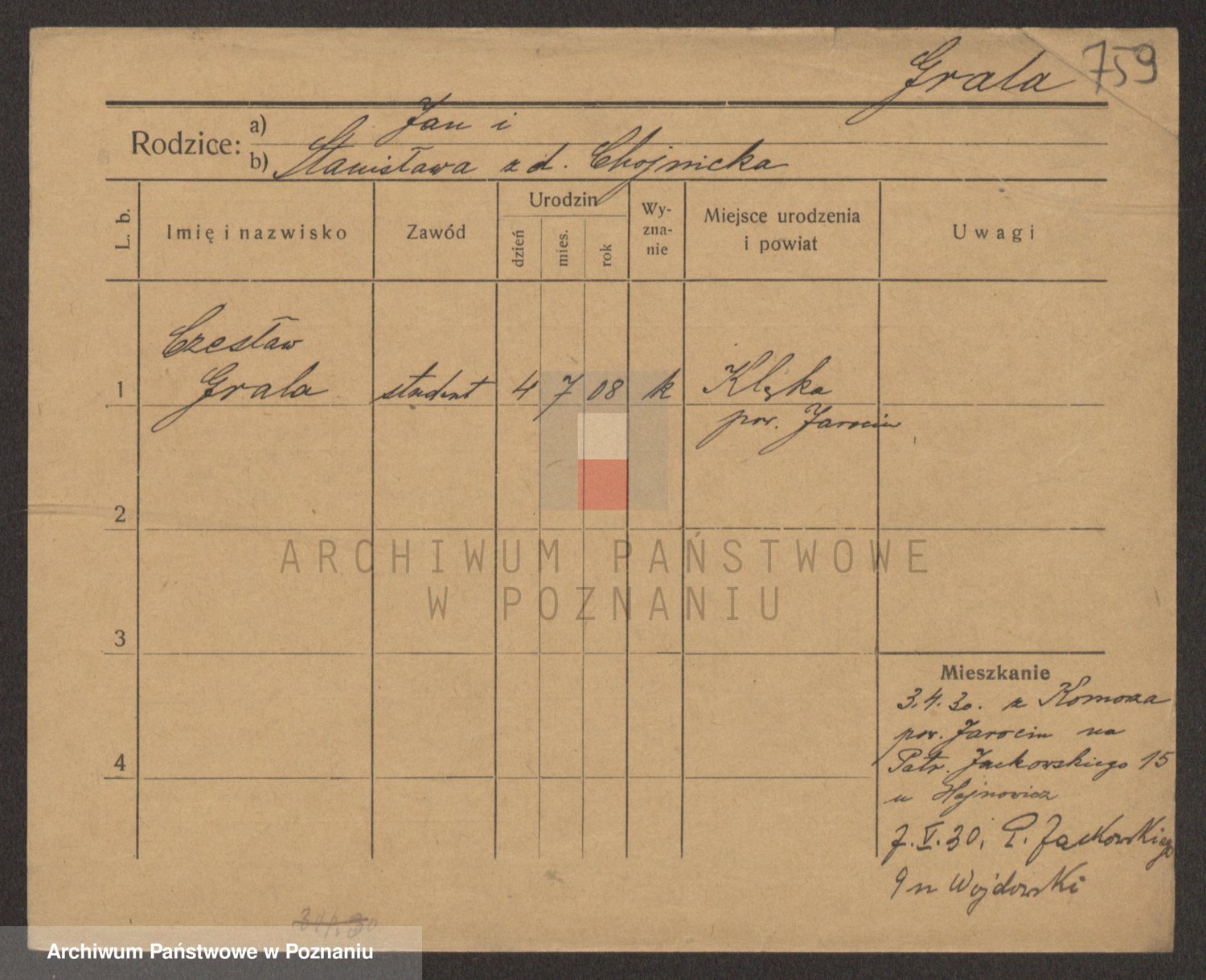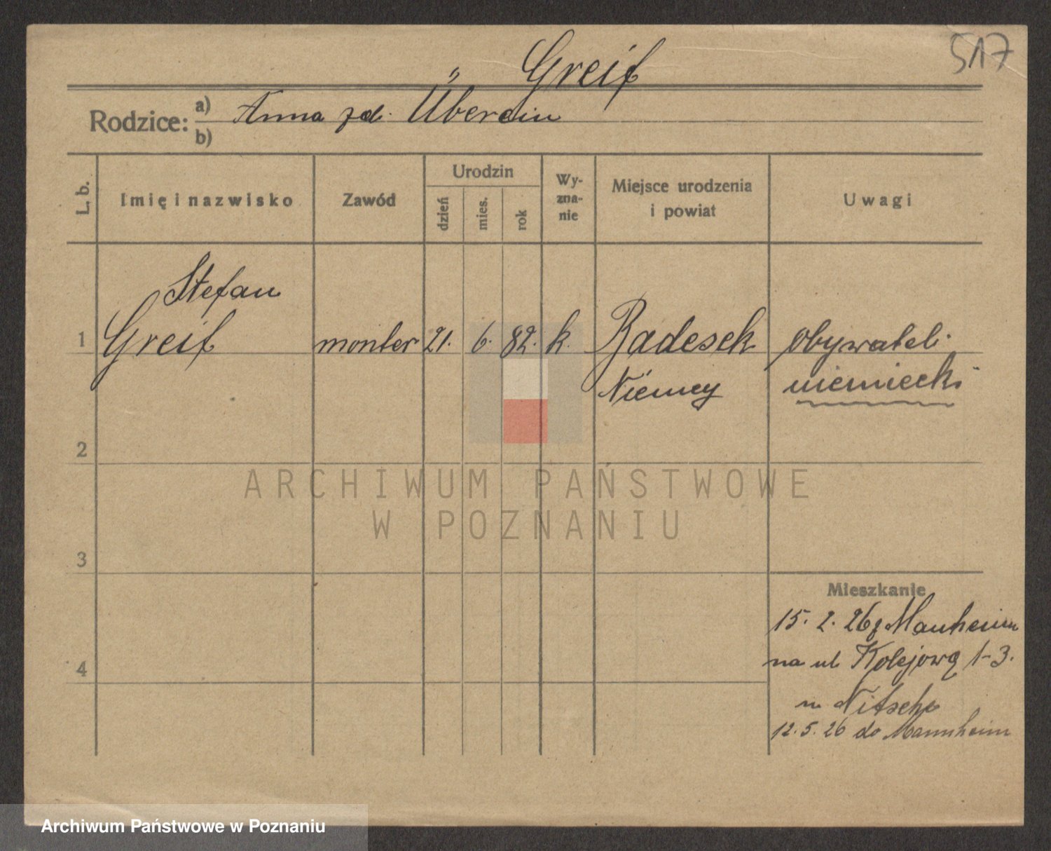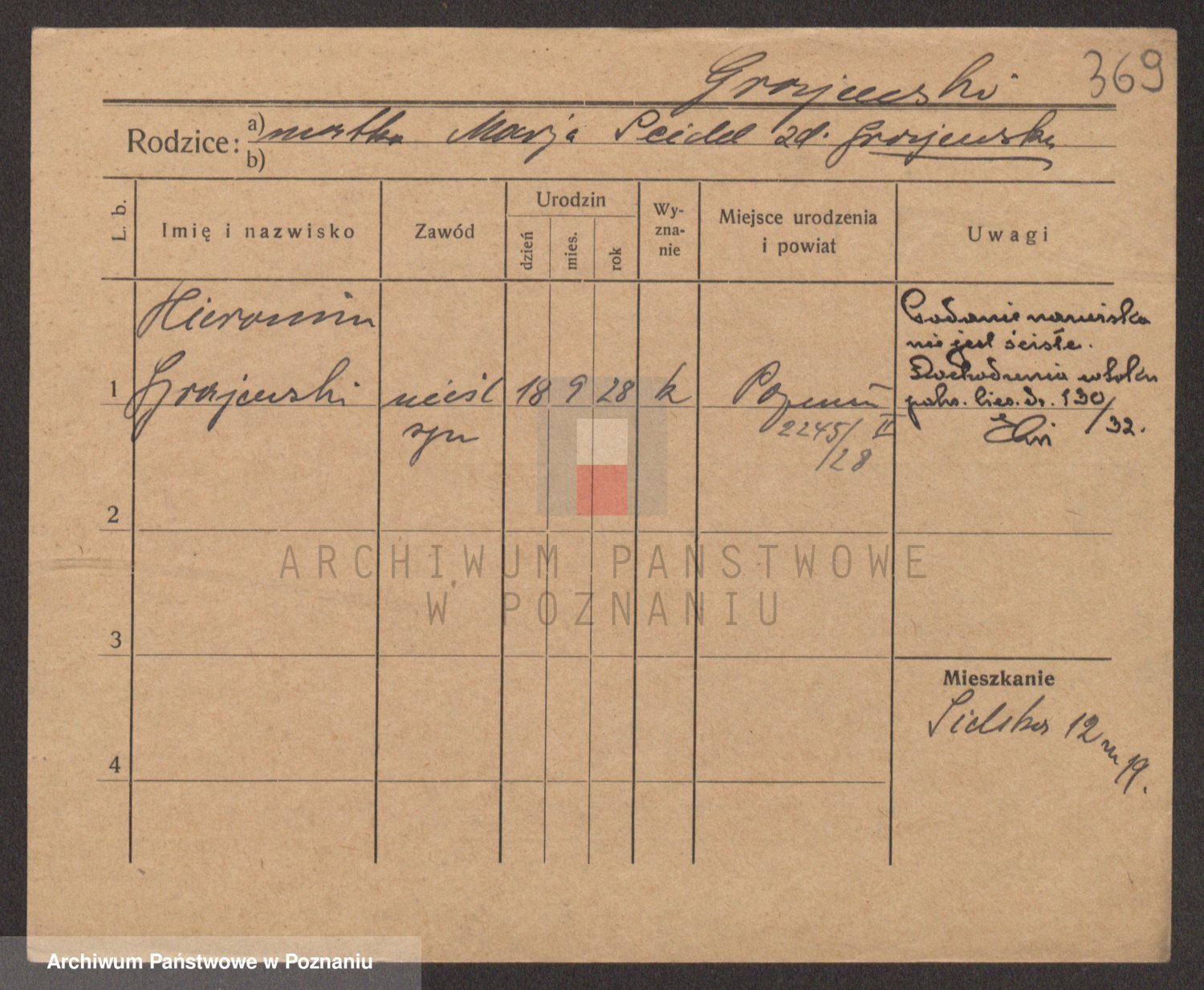 Podgląd karty osobowej dostępny jest po kliknięciu na nazwisko lub ikonkę karty. Można dokonywać powiększenia (ikony na górze) lub przechodzić między kolejnymi skanami (strzałki po bokach).