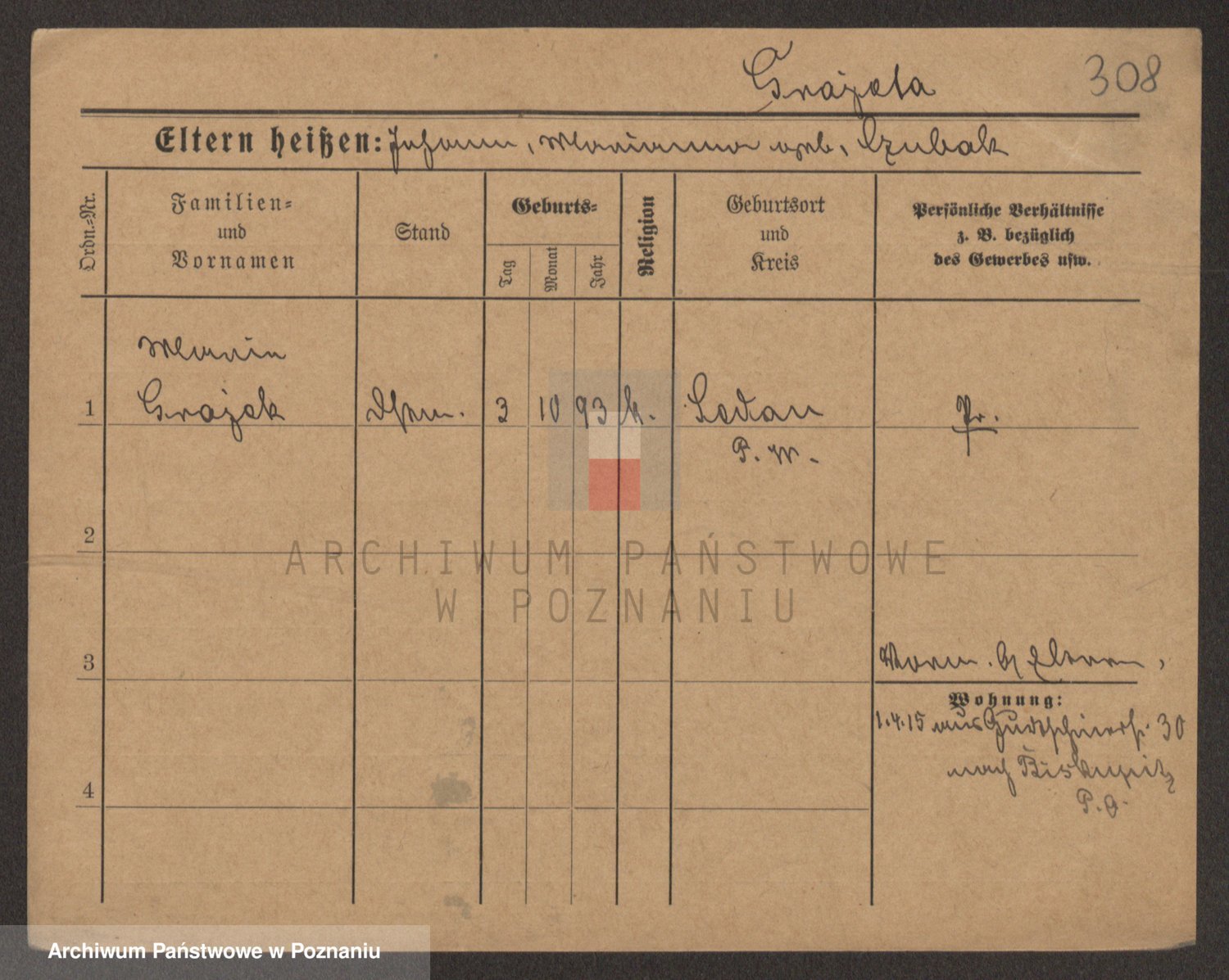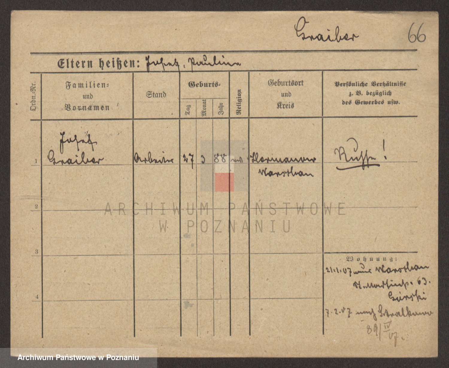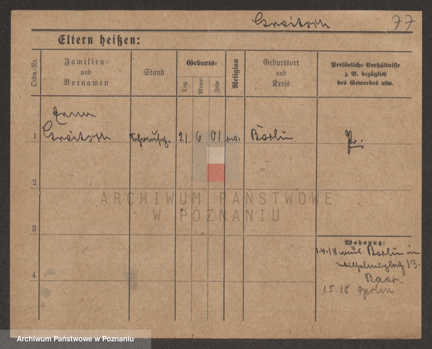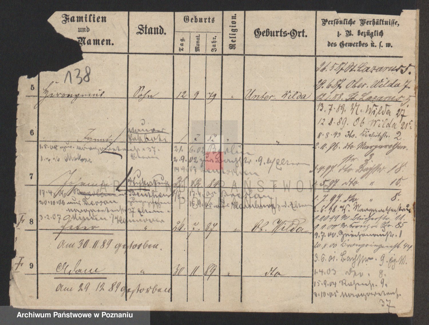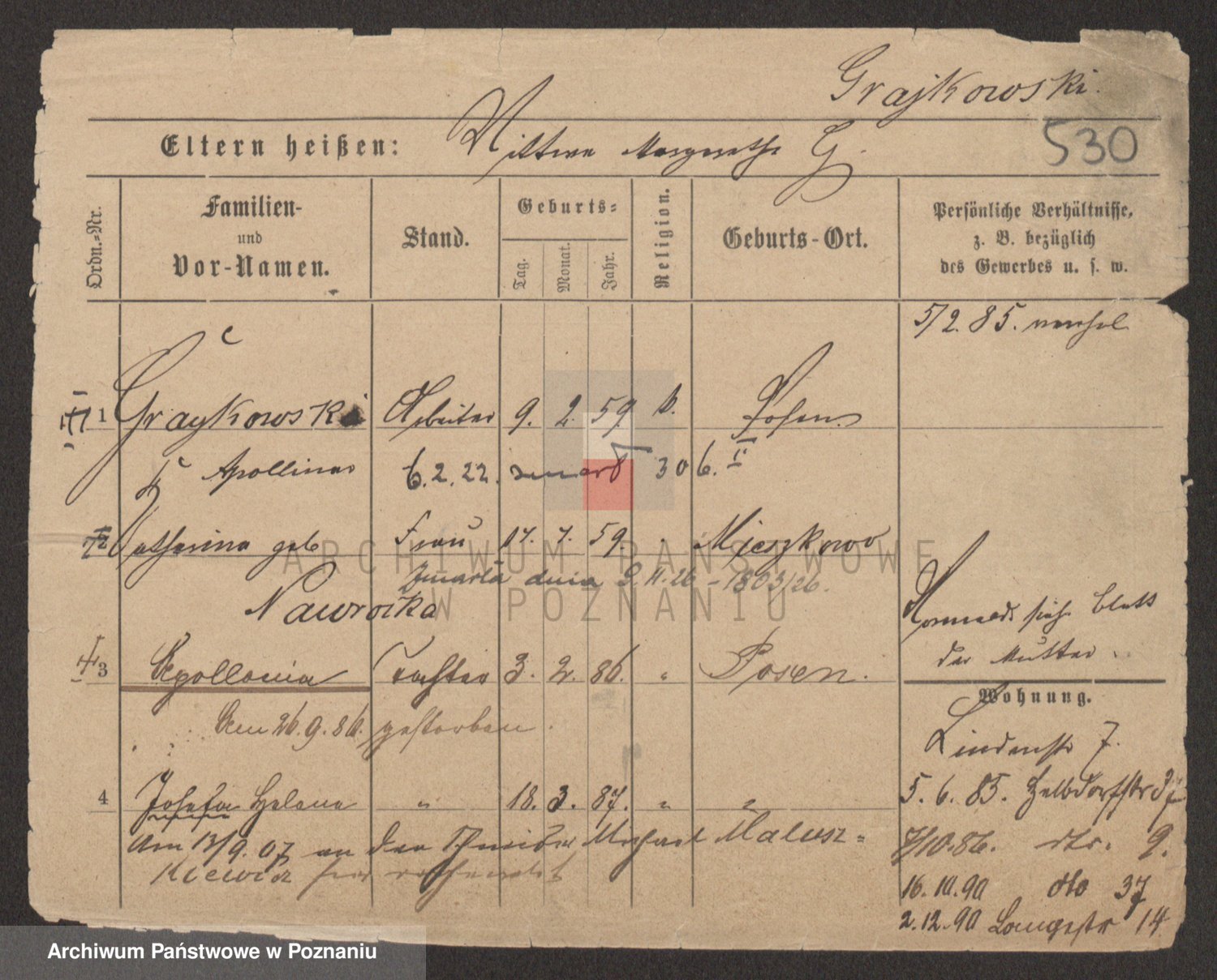 Podgląd karty osobowej dostępny jest po kliknięciu na nazwisko lub ikonkę karty. Można dokonywać powiększenia (ikony na górze) lub przechodzić między kolejnymi skanami (strzałki po bokach).