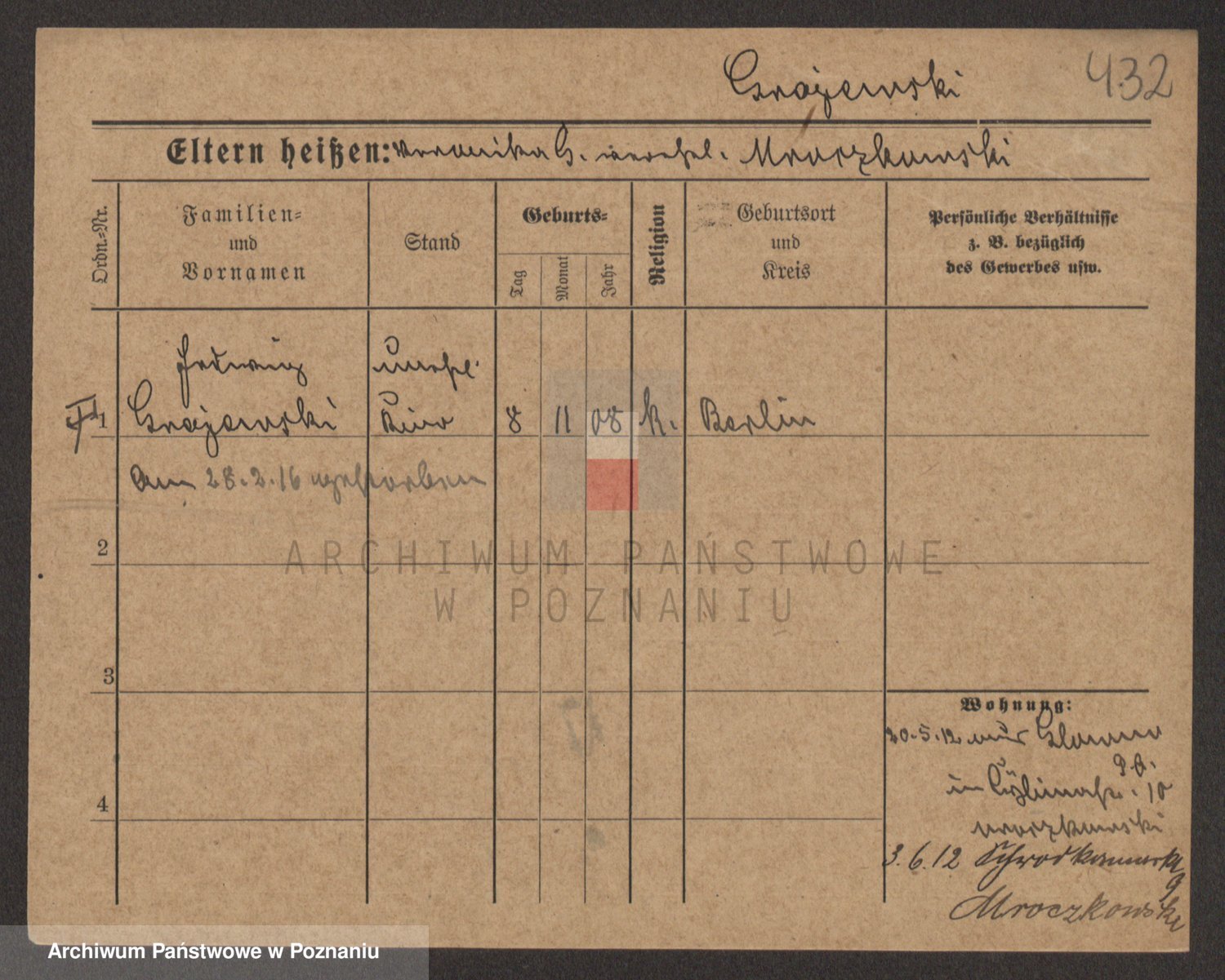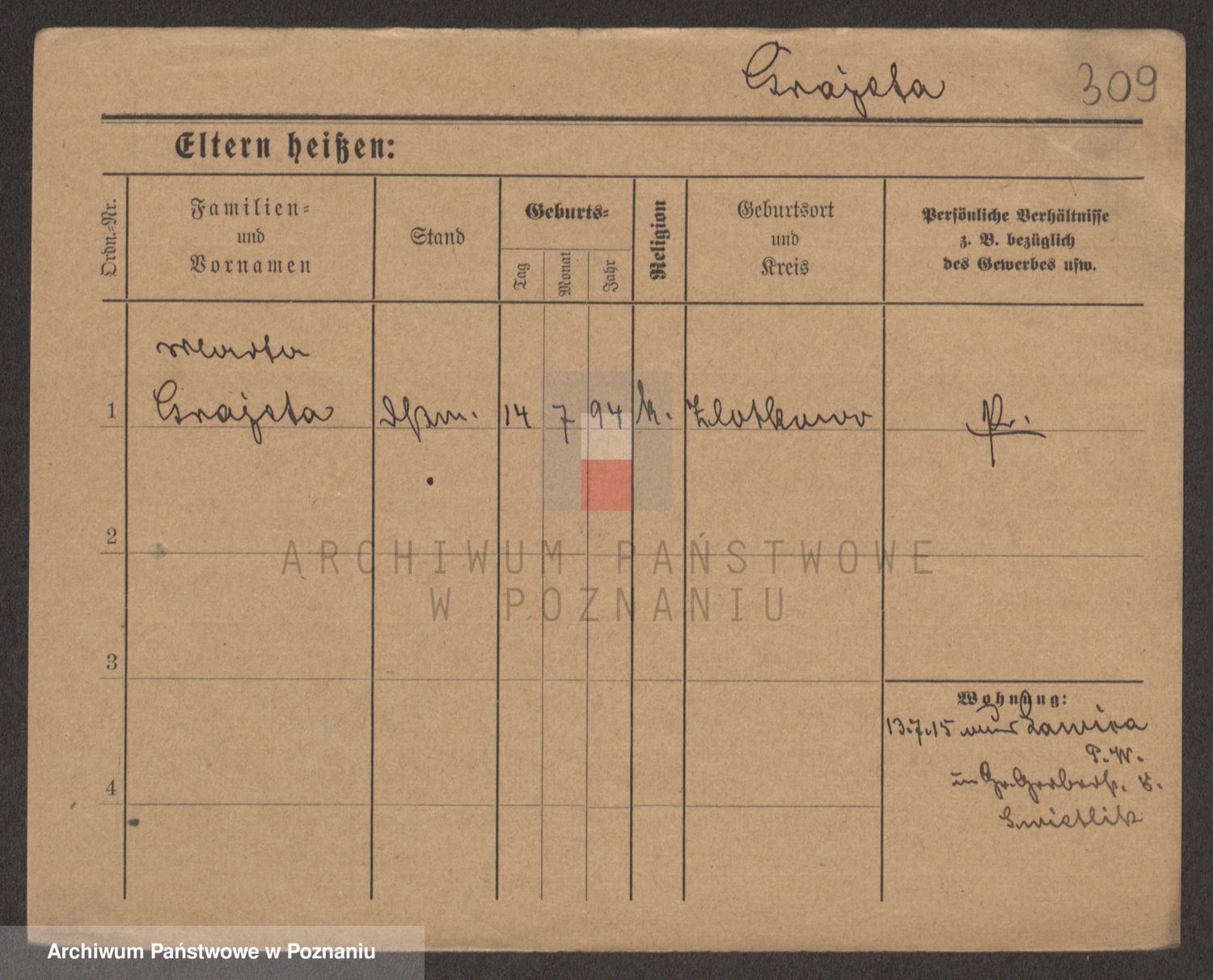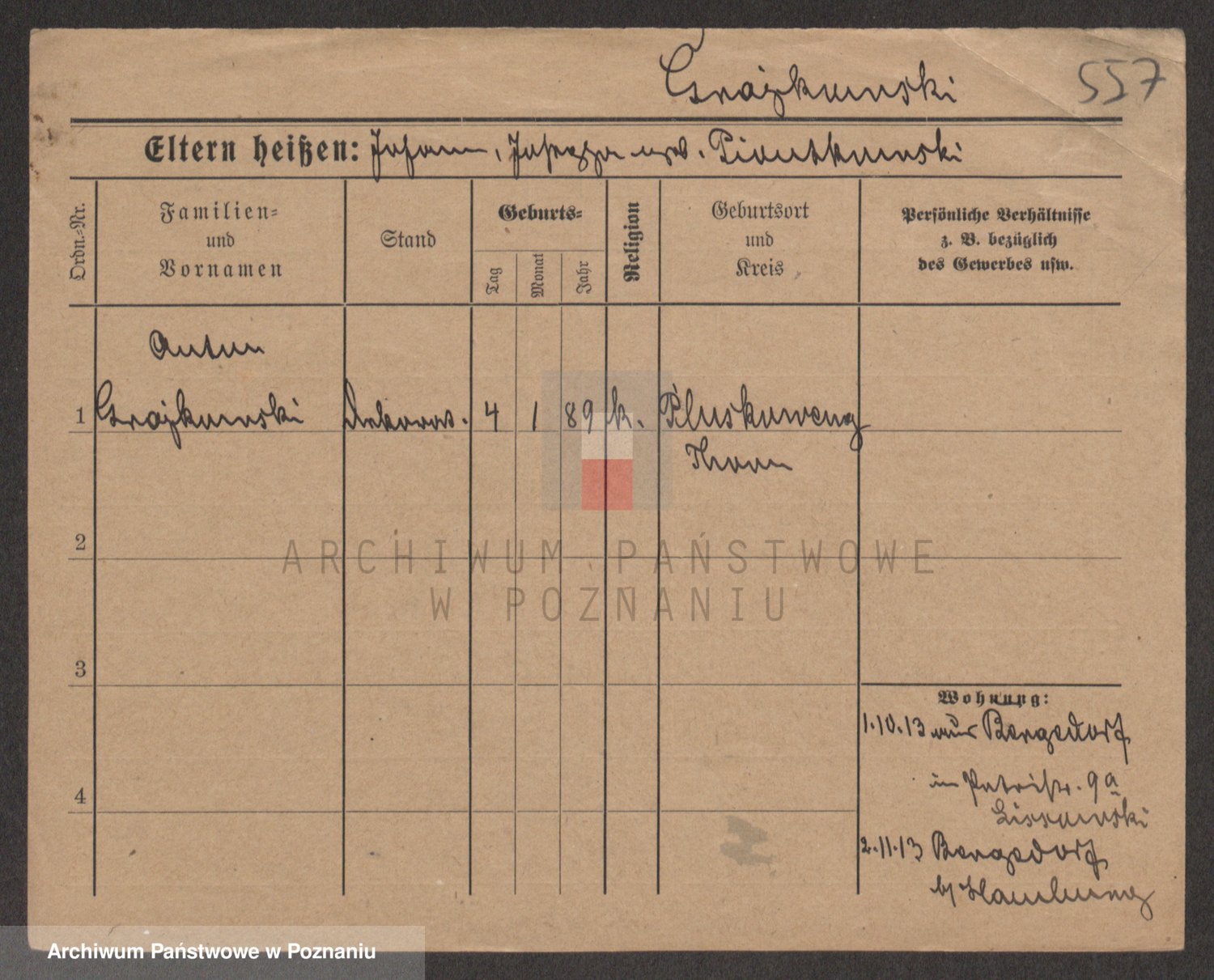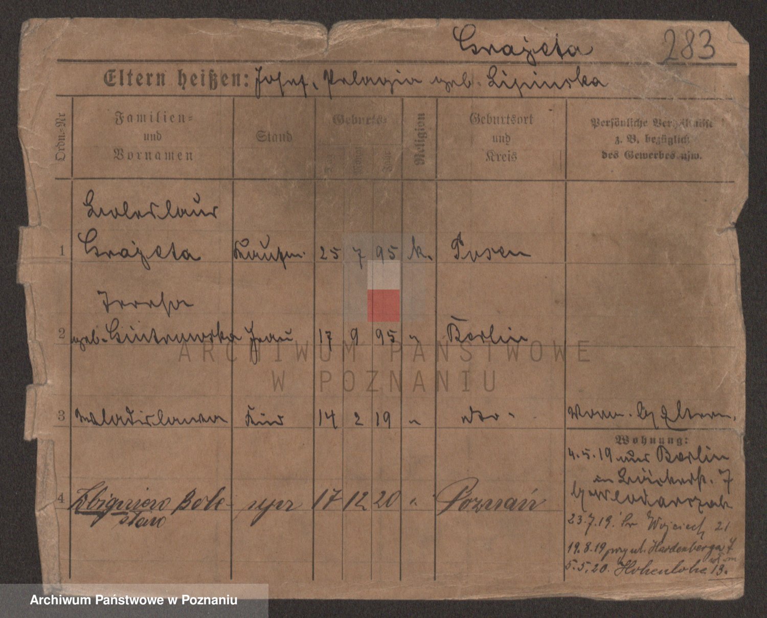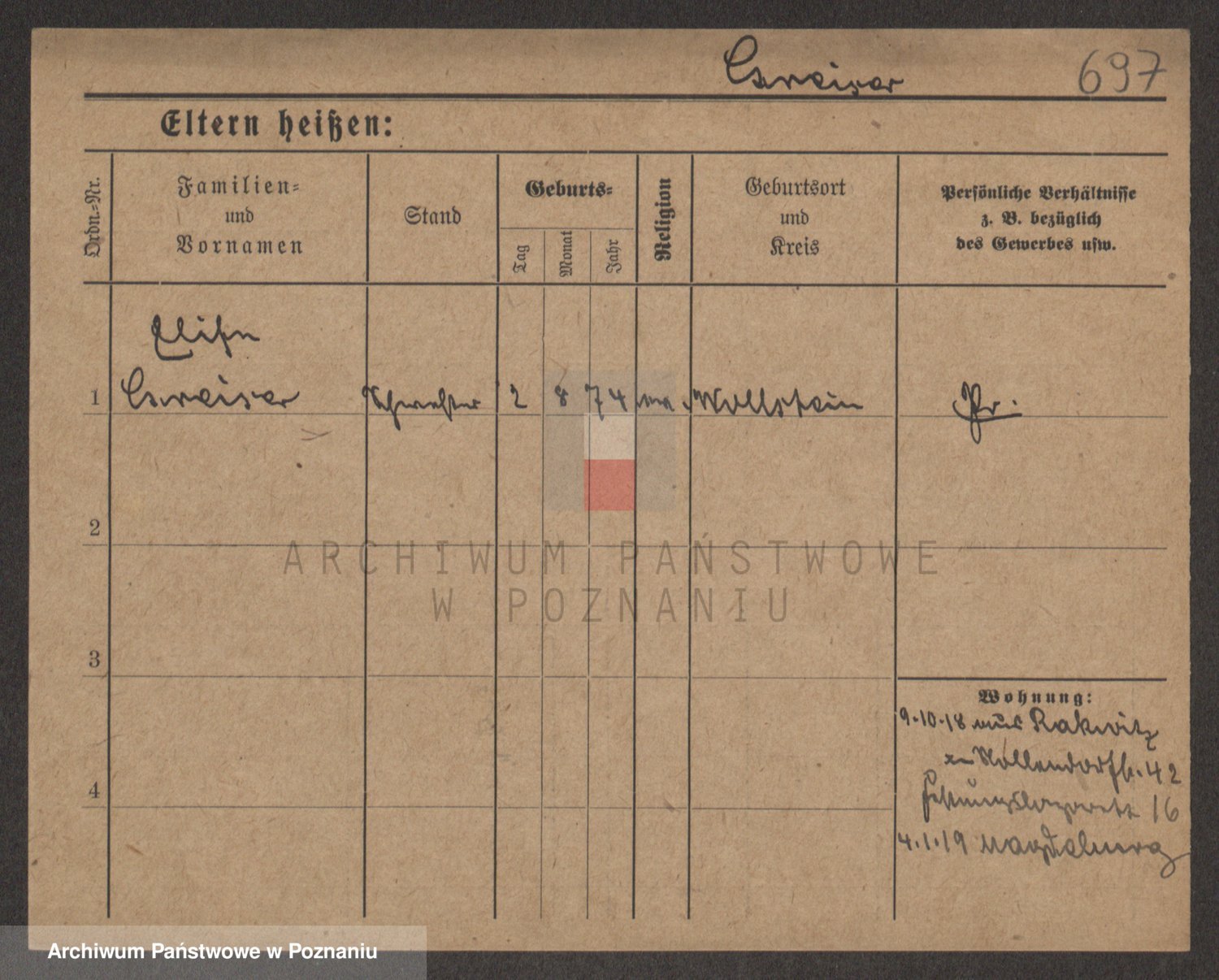 Podgląd karty osobowej dostępny jest po kliknięciu na nazwisko lub ikonkę karty. Można dokonywać powiększenia (ikony na górze) lub przechodzić między kolejnymi skanami (strzałki po bokach).
