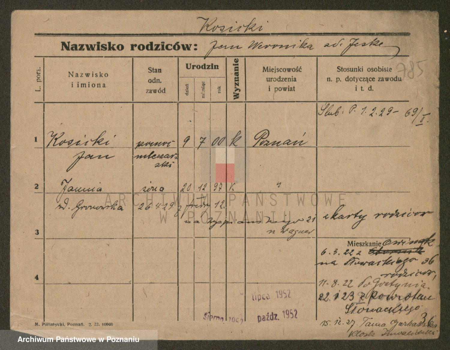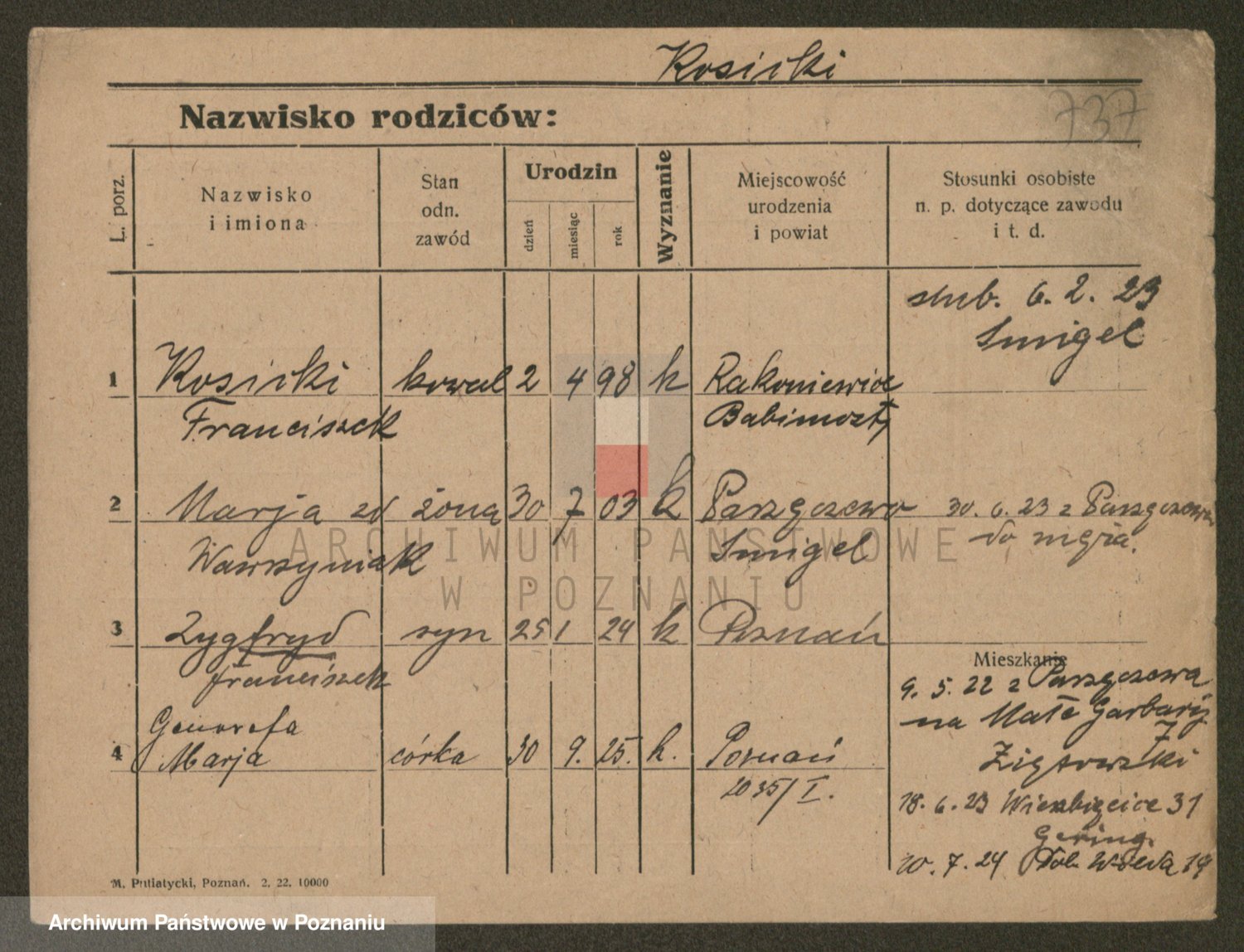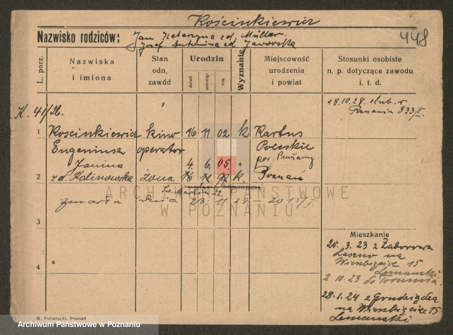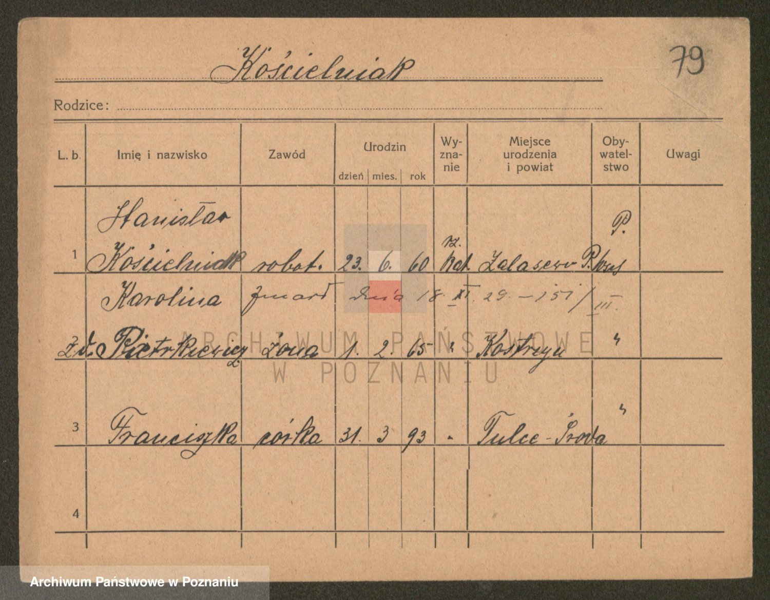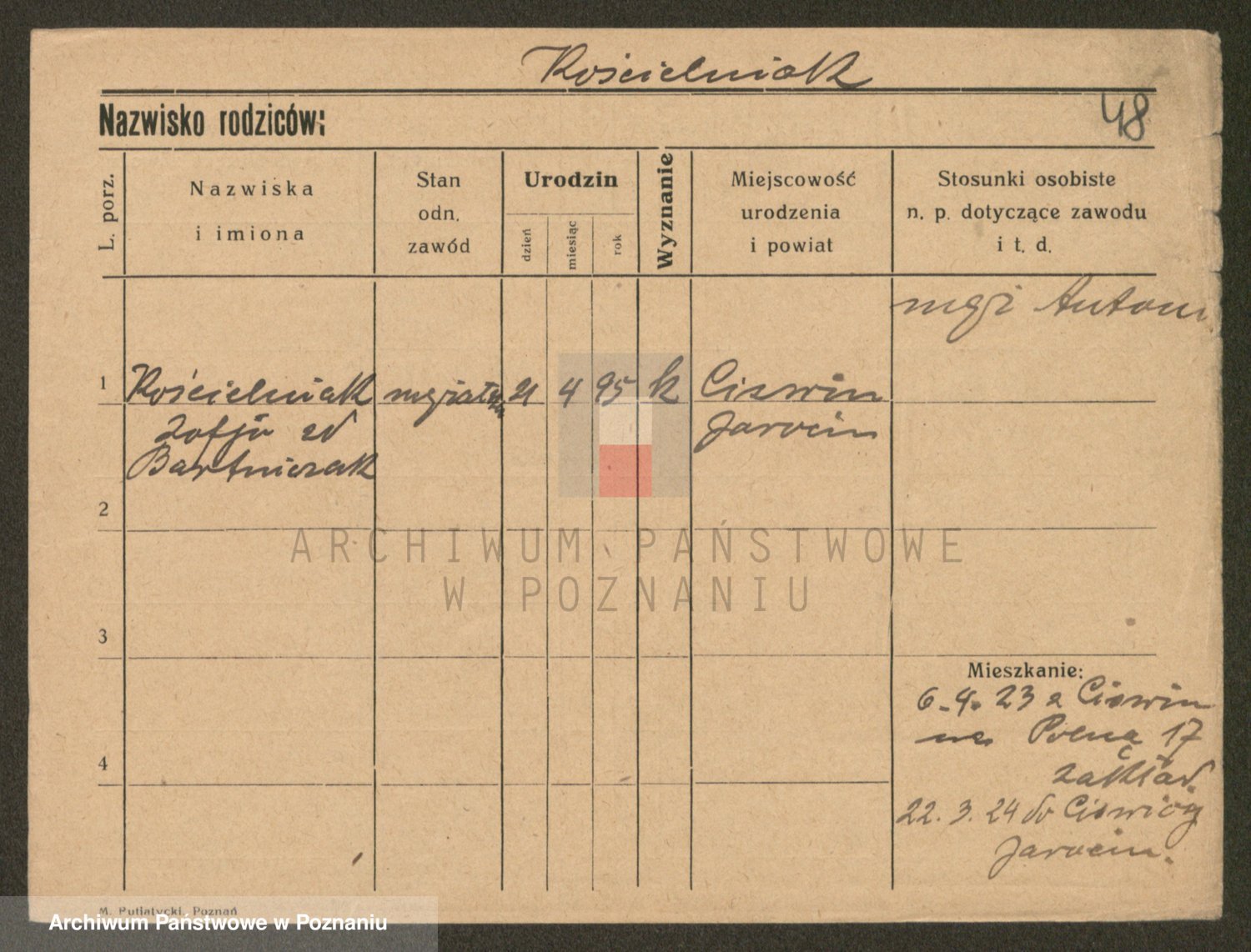 Podgląd karty osobowej dostępny jest po kliknięciu na nazwisko lub ikonkę karty. Można dokonywać powiększenia (ikony na górze) lub przechodzić między kolejnymi skanami (strzałki po bokach).