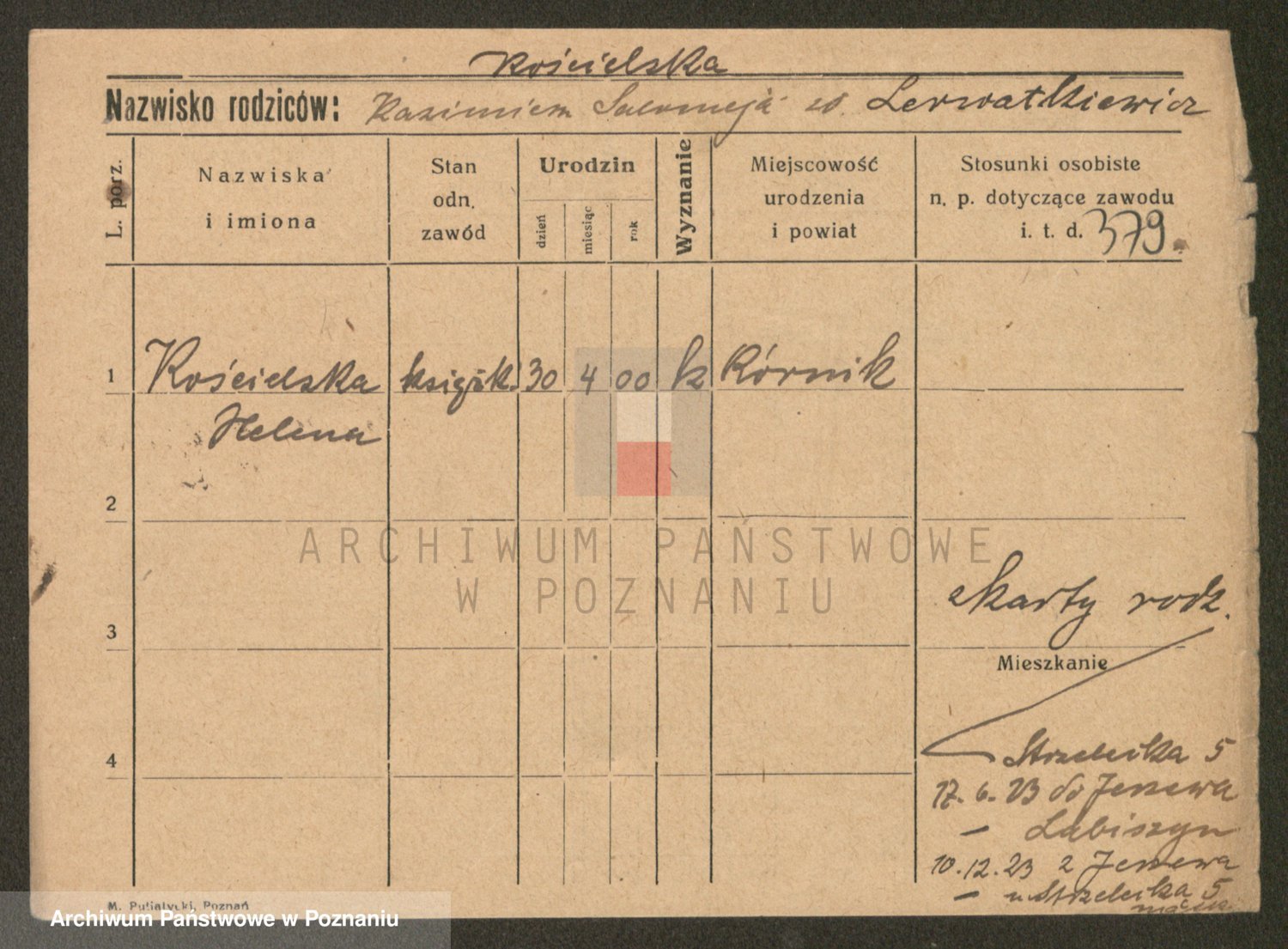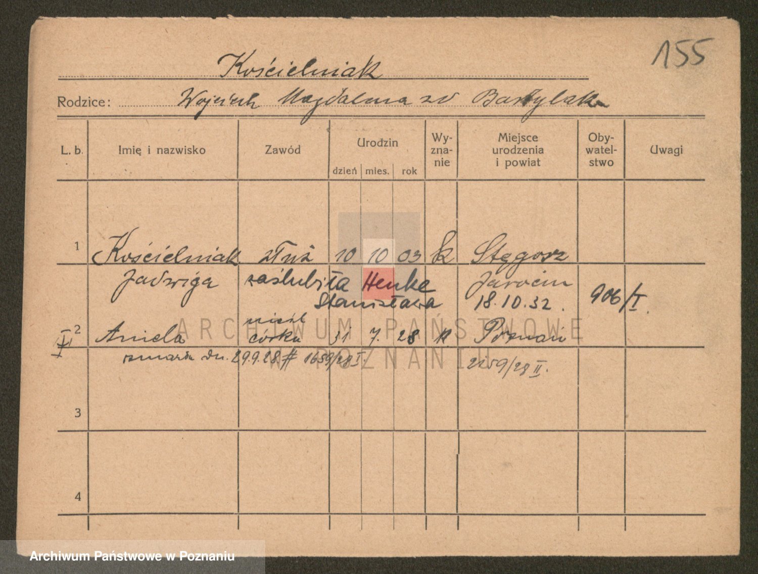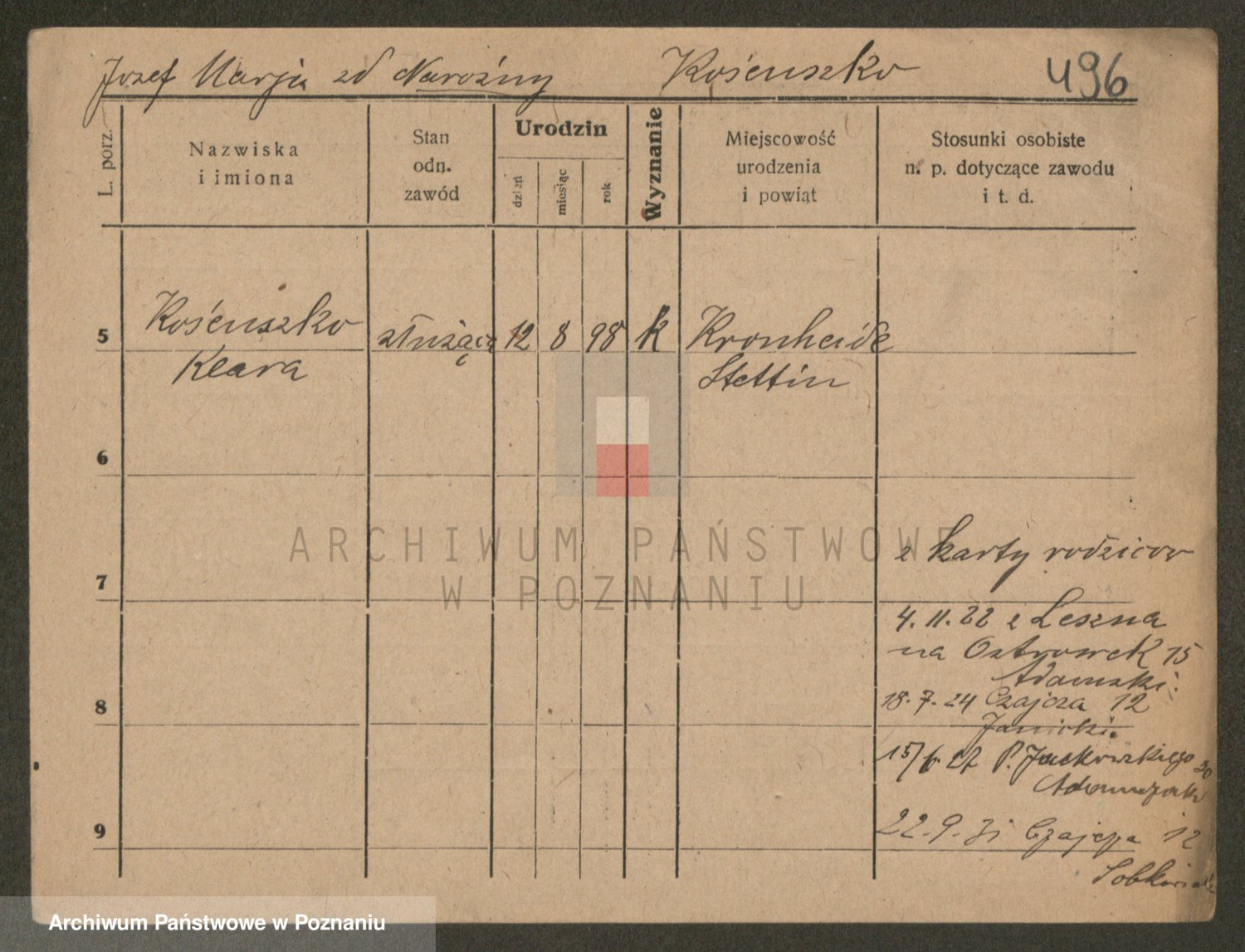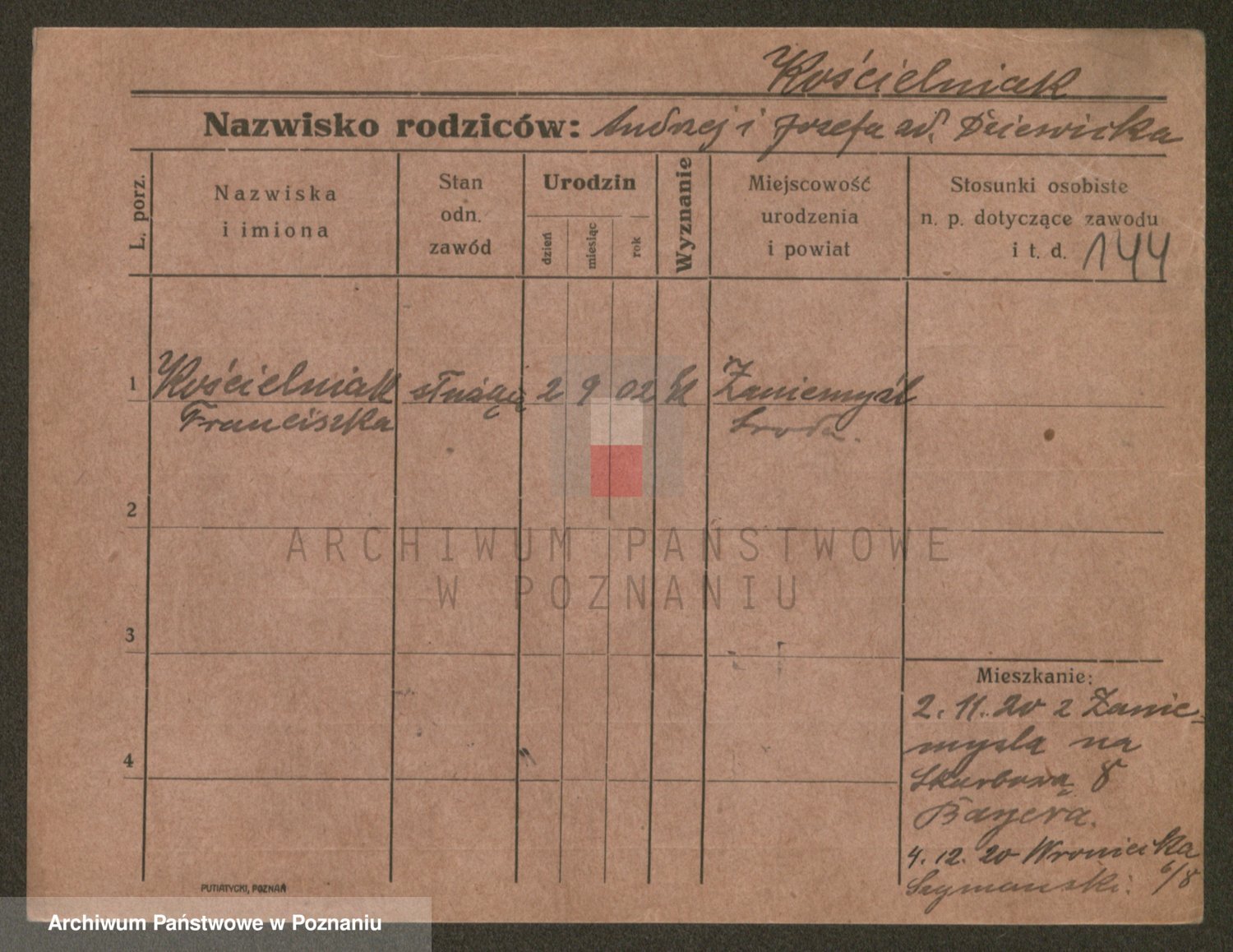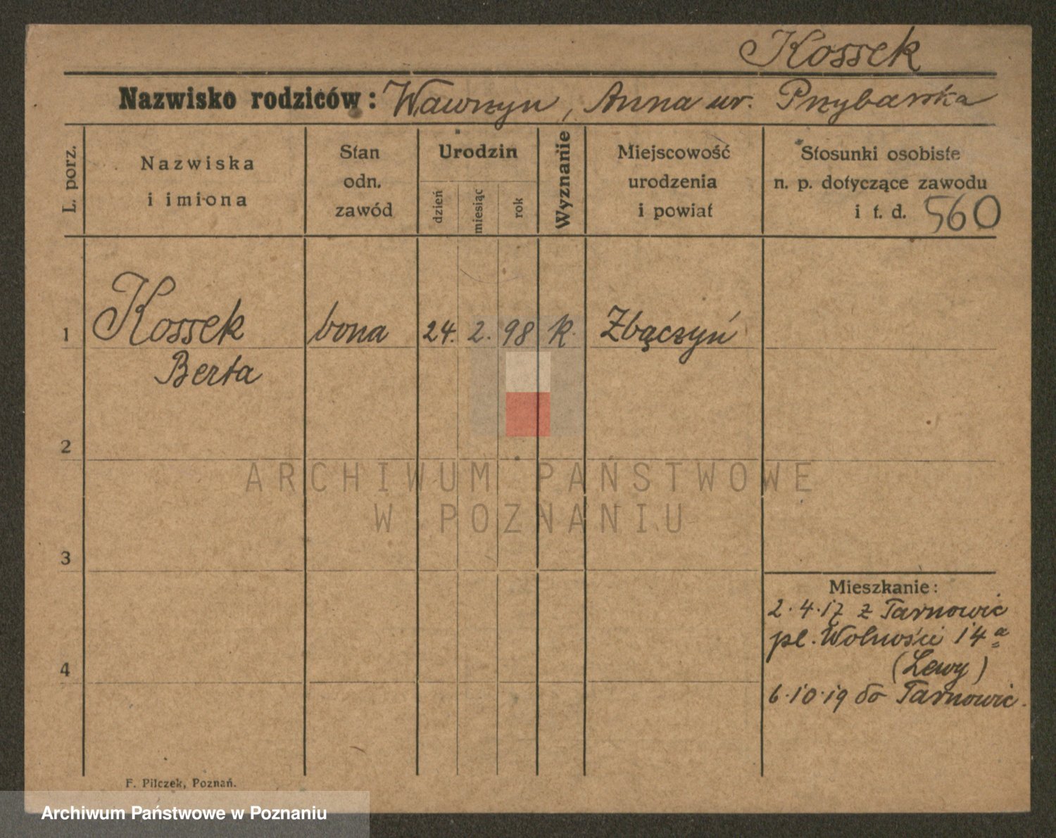 Podgląd karty osobowej dostępny jest po kliknięciu na nazwisko lub ikonkę karty. Można dokonywać powiększenia (ikony na górze) lub przechodzić między kolejnymi skanami (strzałki po bokach).