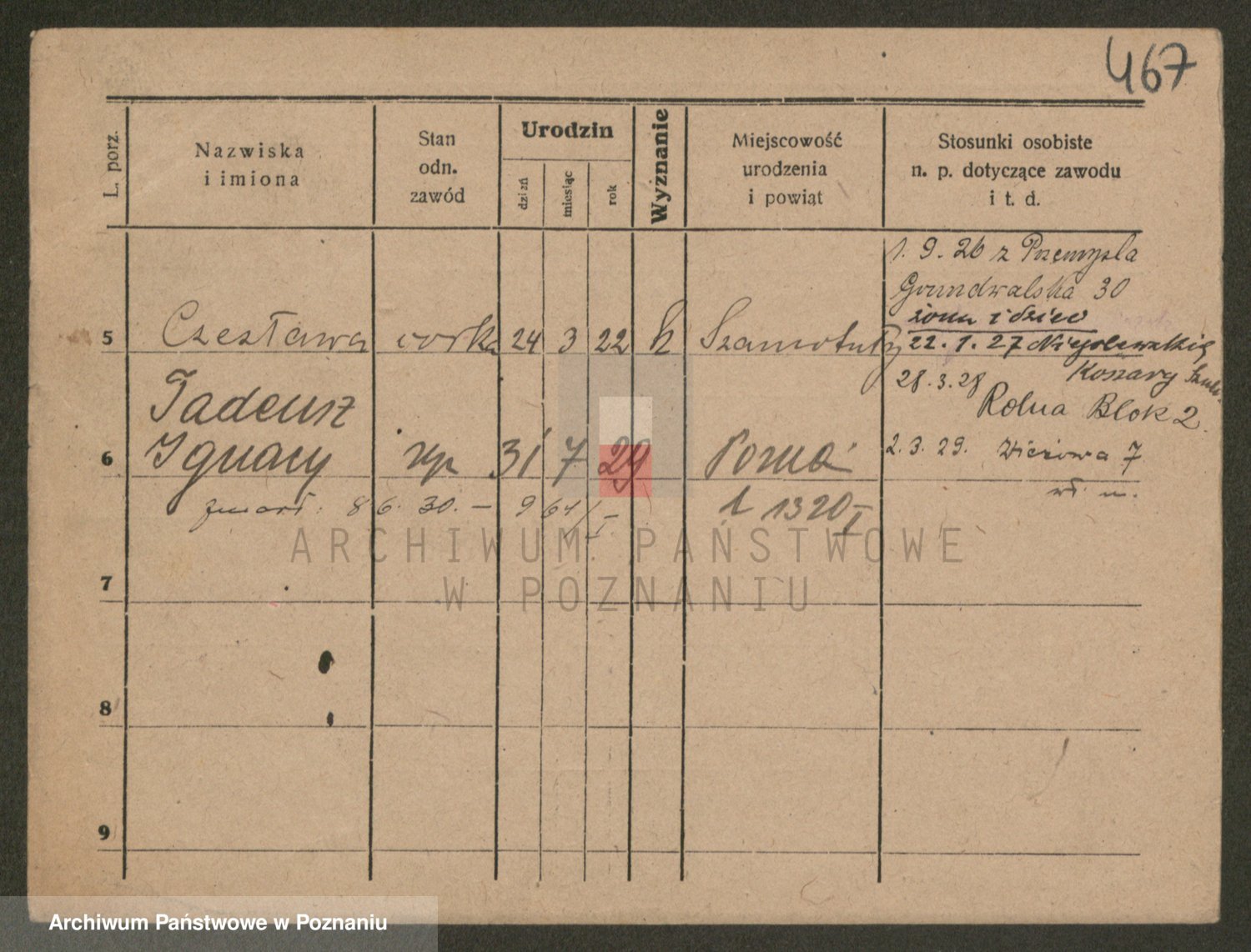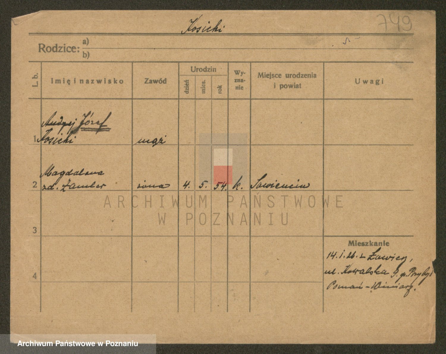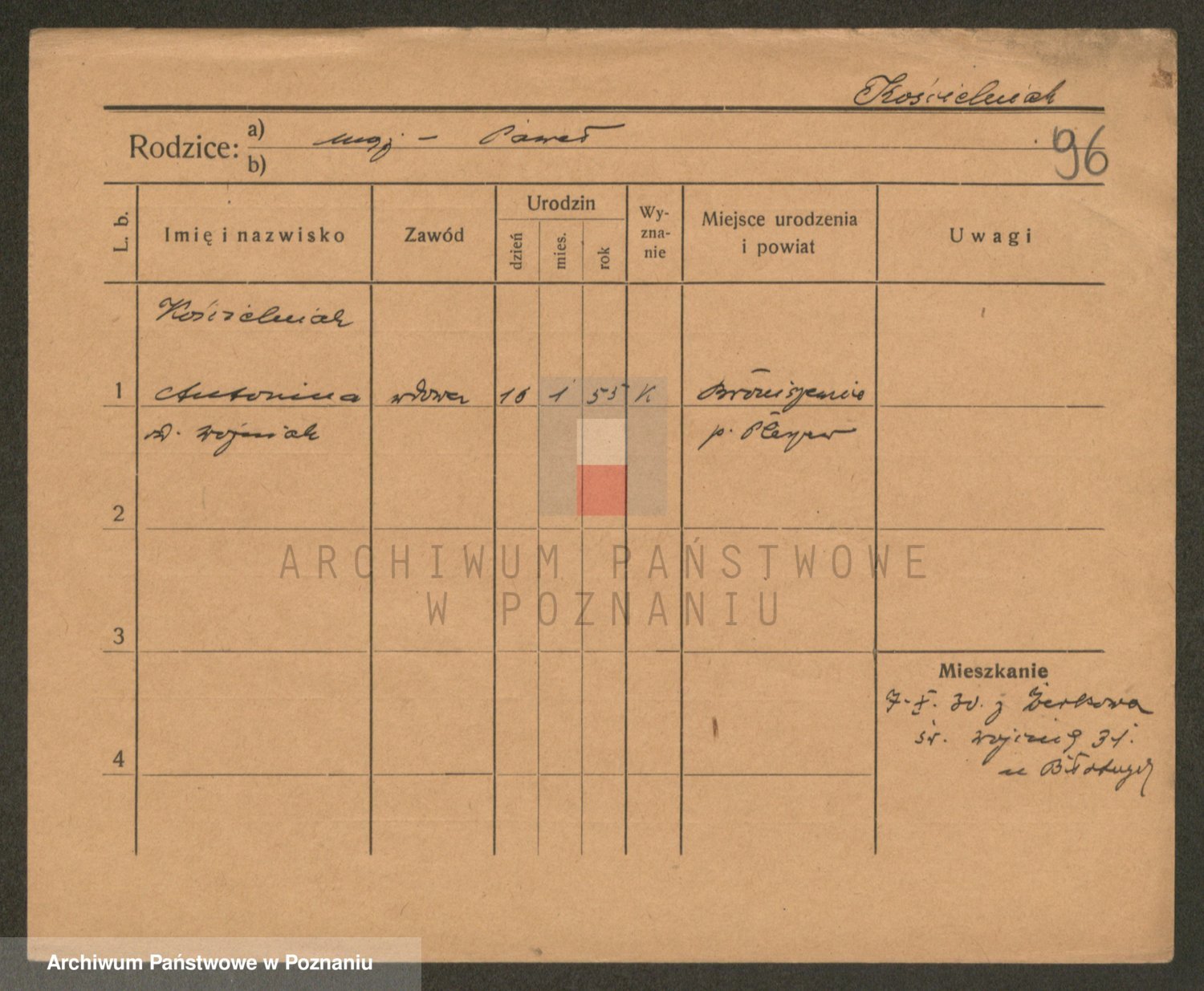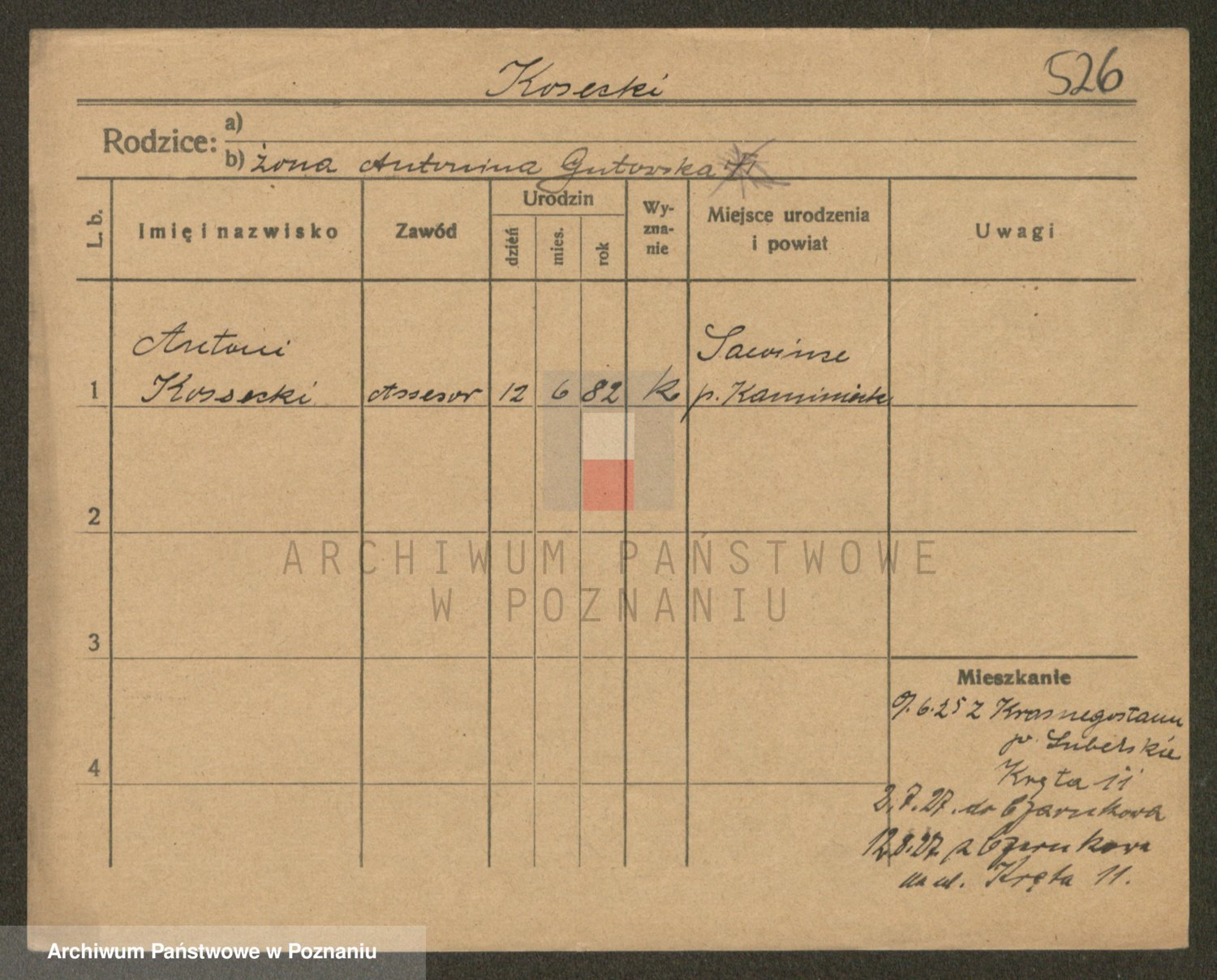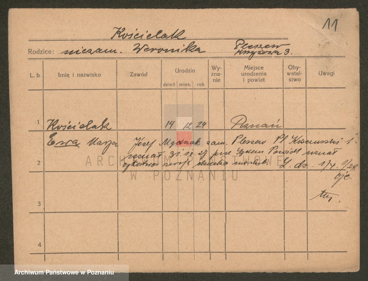 Podgląd karty osobowej dostępny jest po kliknięciu na nazwisko lub ikonkę karty. Można dokonywać powiększenia (ikony na górze) lub przechodzić między kolejnymi skanami (strzałki po bokach).